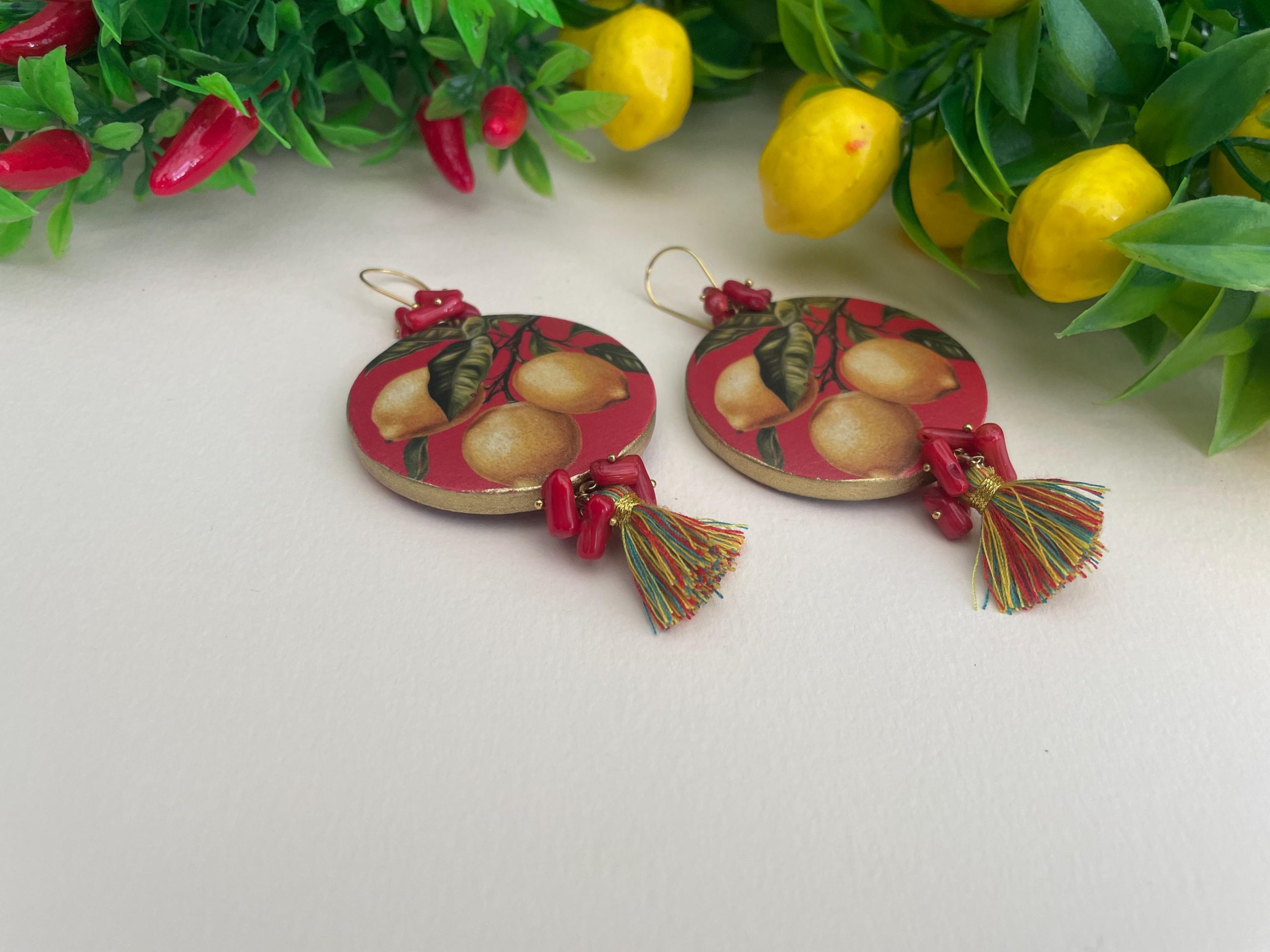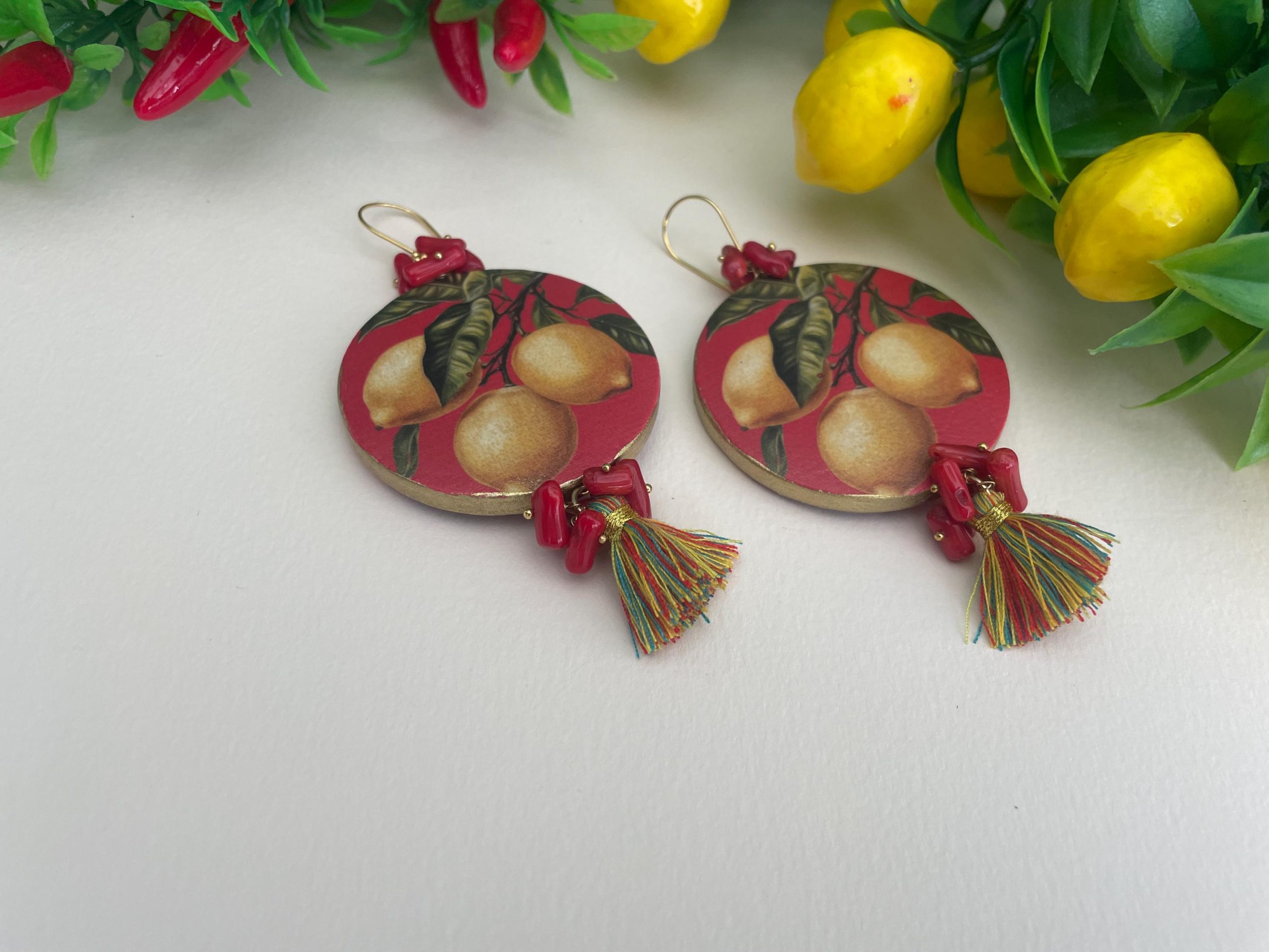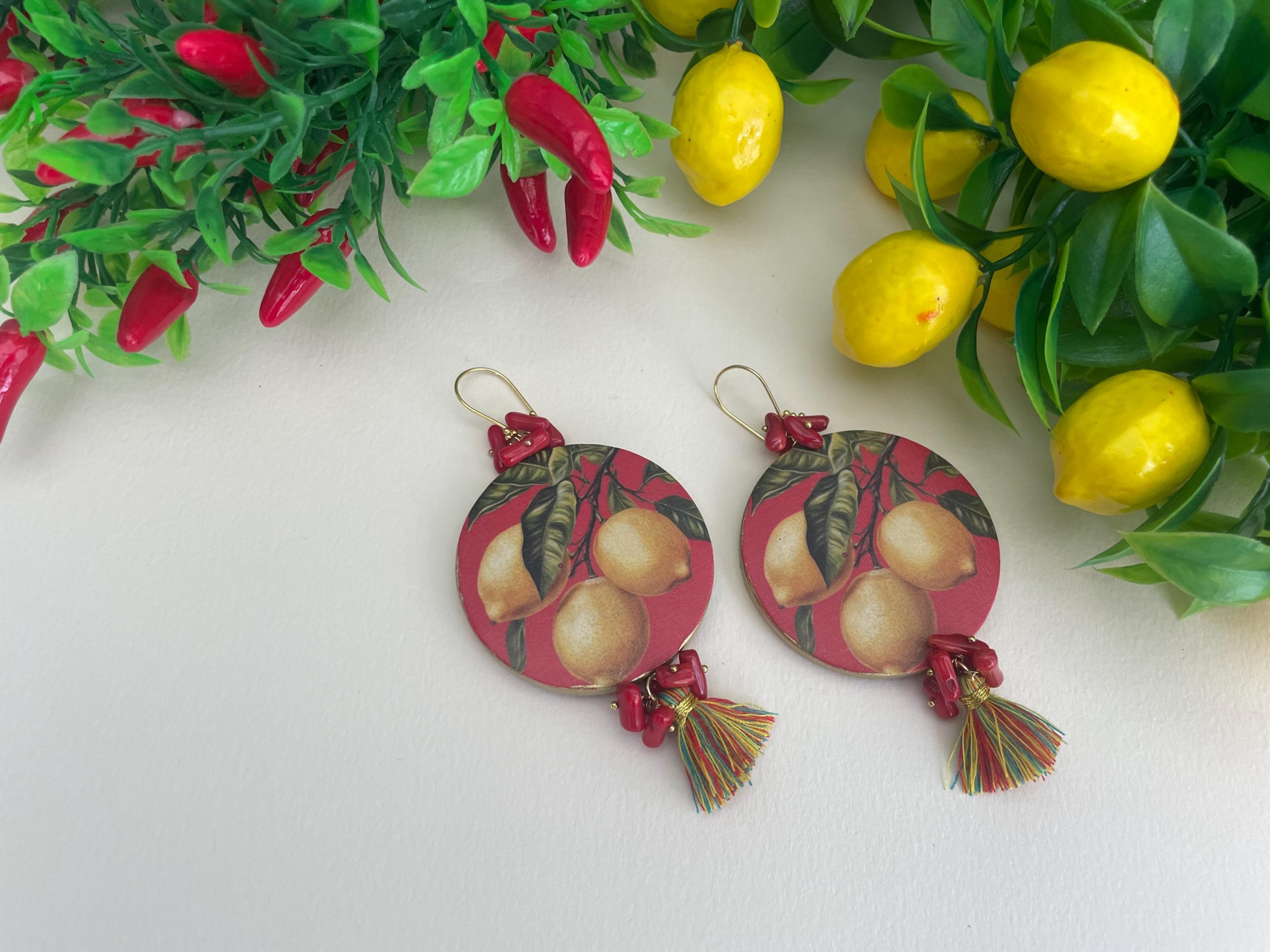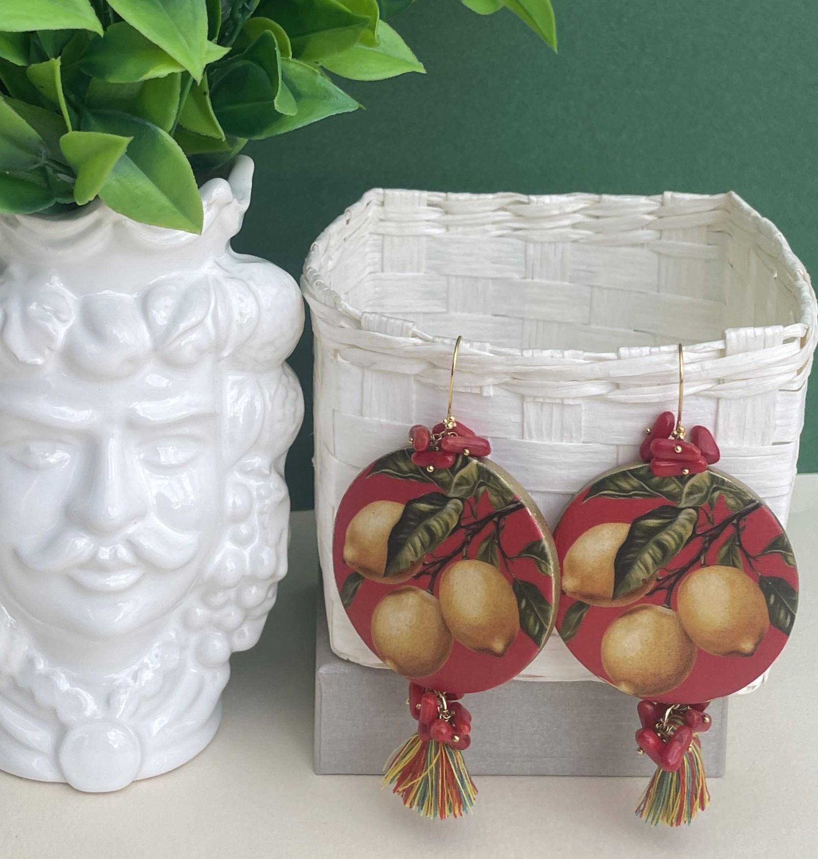 Un Medaglione di legno stampato in superficie sui due lati raffigurante su un lato un grappolo di limoni su fondo rosso e sull’altro una texture geometrico-floreale sui toni del rosso, giallo e blu.