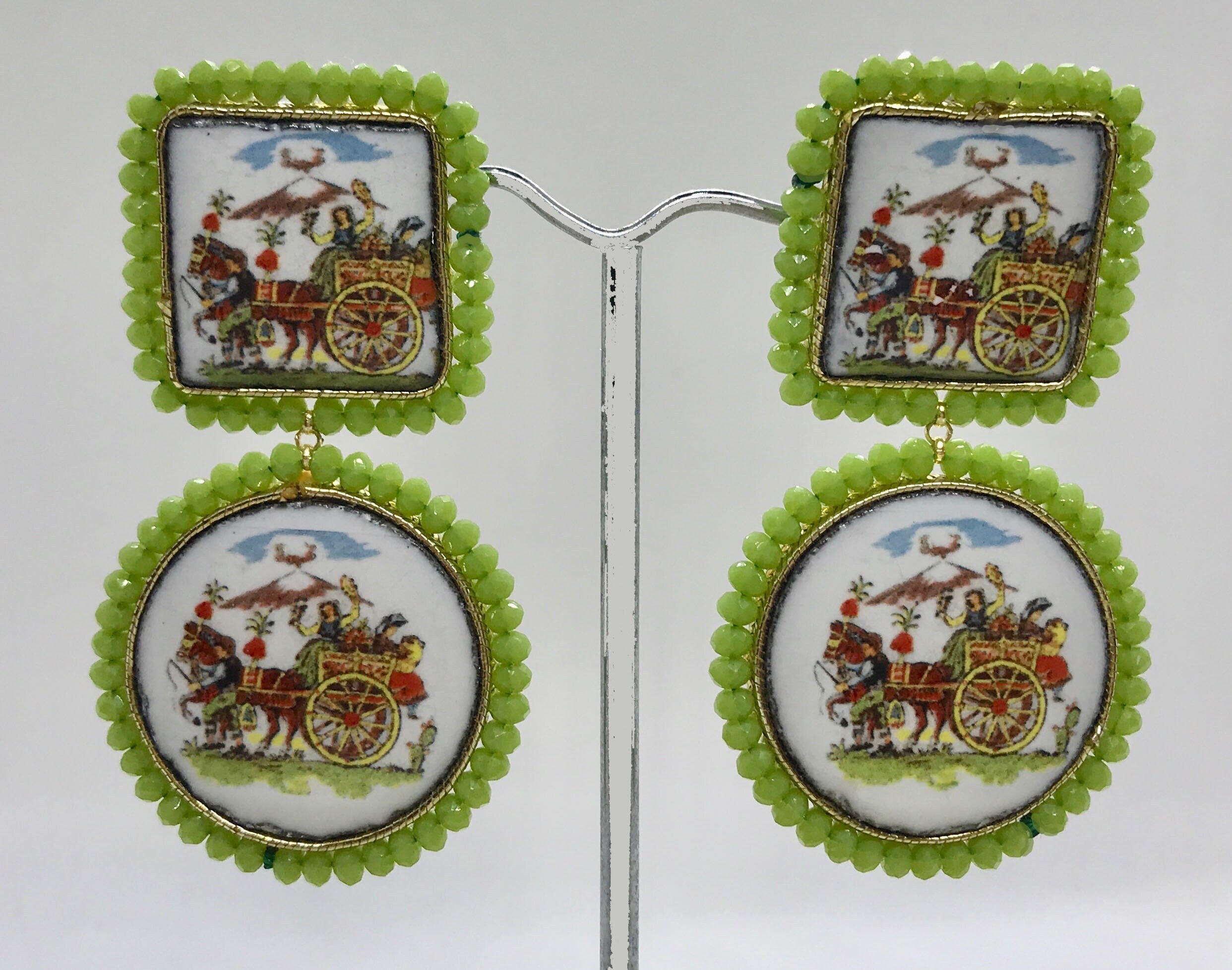 Realizzati con due mattonelle di ceramica di Caltagirone, una tonda e una quadrata stampate in superficie e raffiguranti i tipici carretti siciliani.