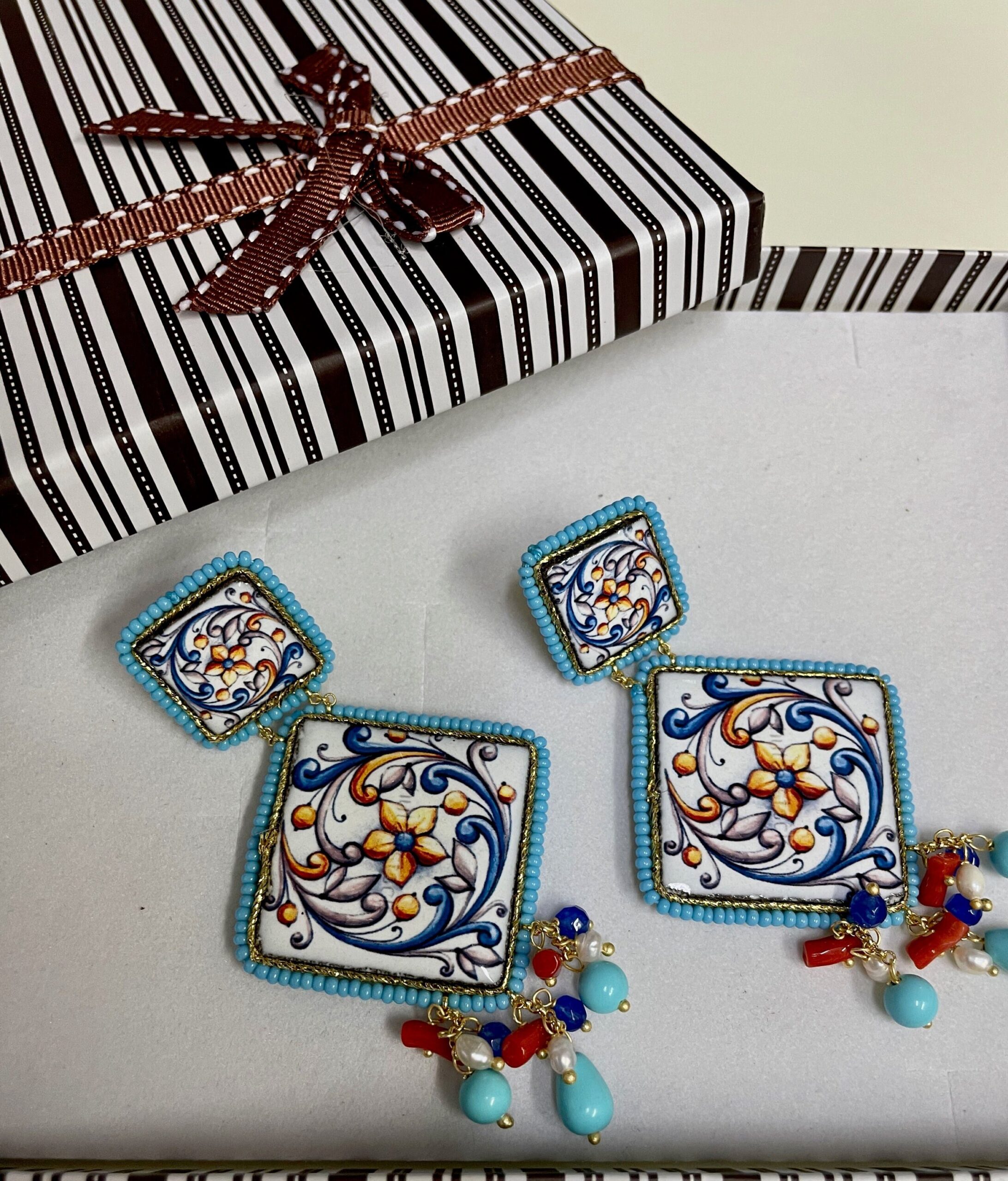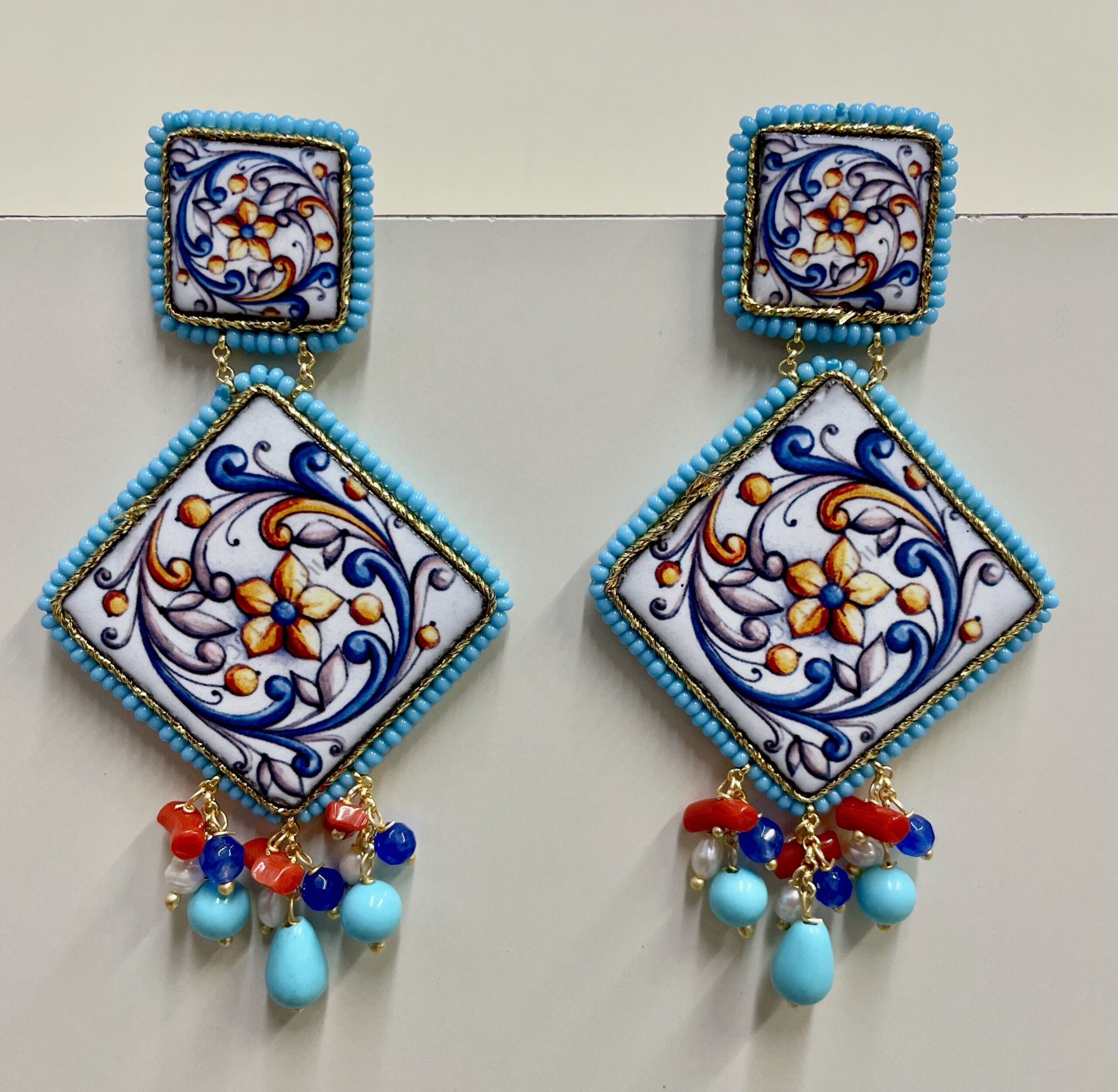 Orecchini siciliani con mattonelle di ceramica di Caltagirone e varie perle colorate