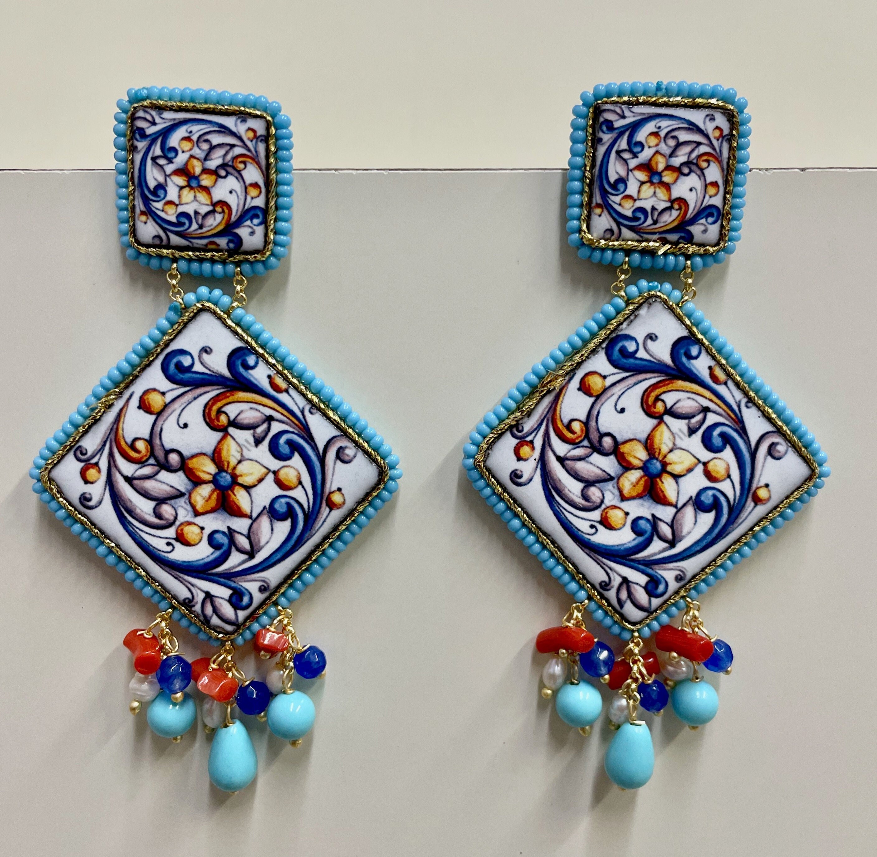 Composti da due mattonelle di ceramica di Caltagirone, una a rombo e una quadrata, stampate in superficie e raffiguranti decori tipici siciliani.