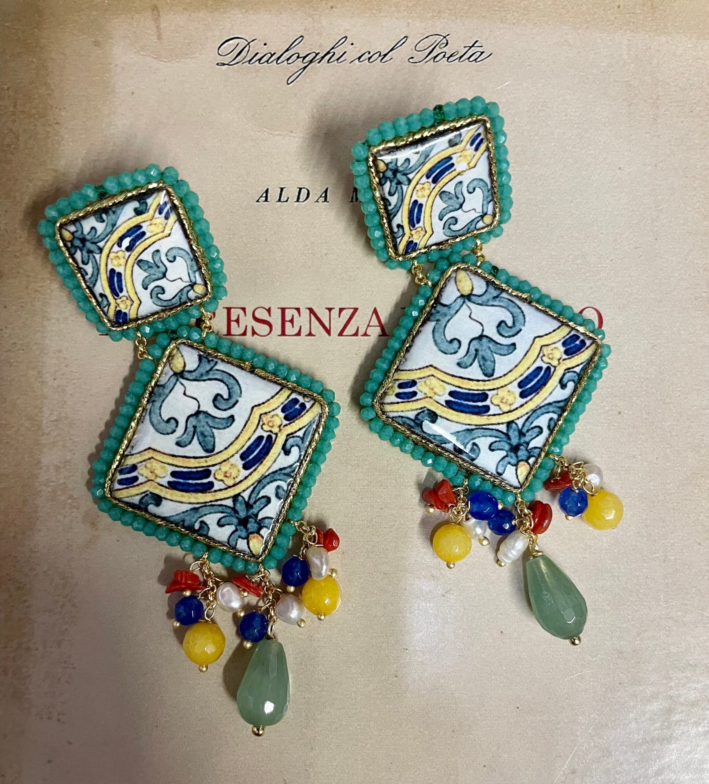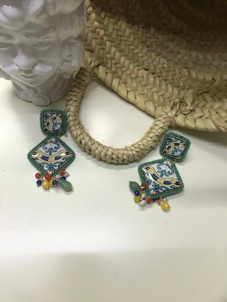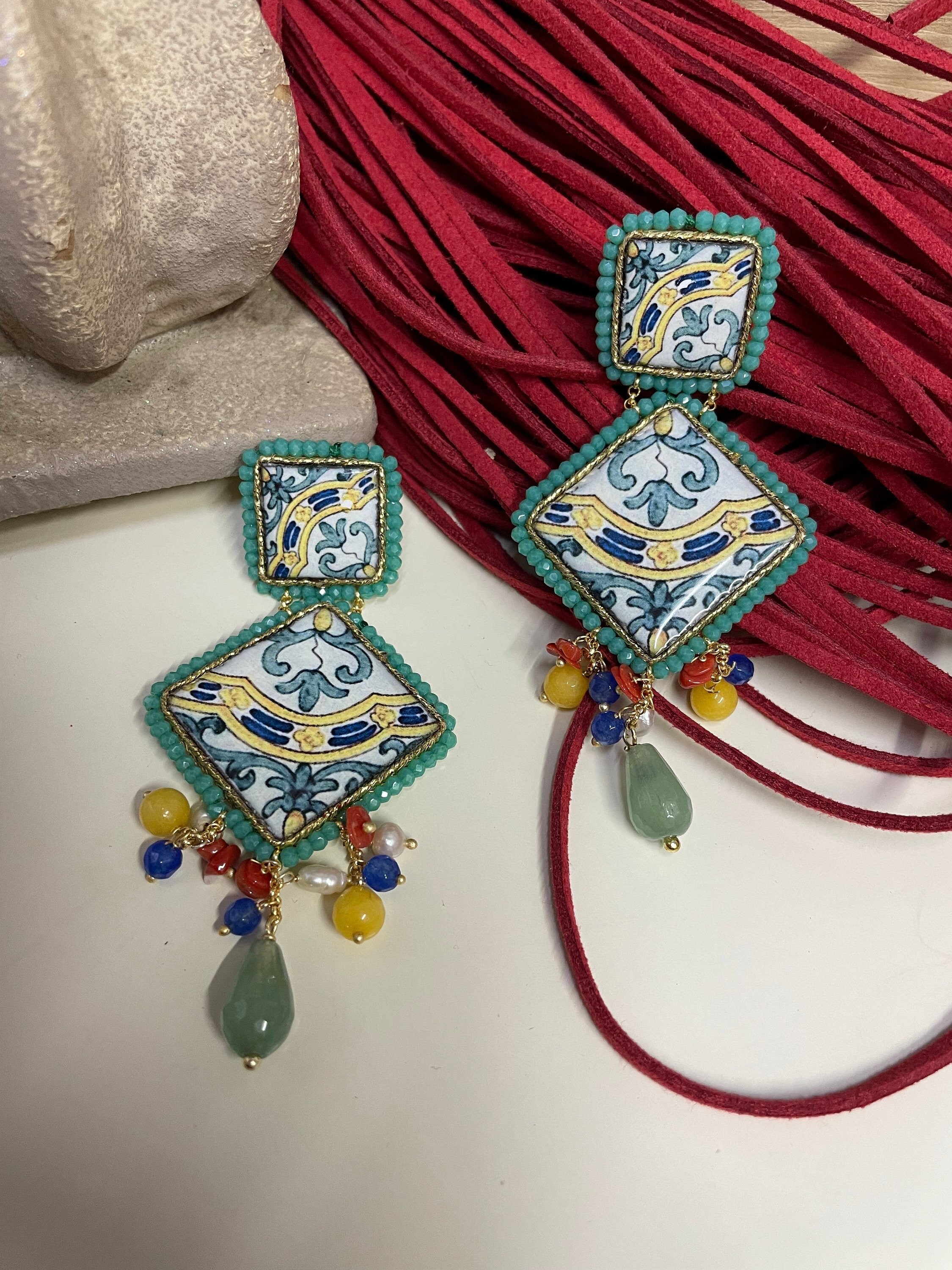 Bellissimi orecchini dallo stile siciliano, realizzati con due mattonelle di ceramica di Caltagirone, una a rombo e una quadrata.
