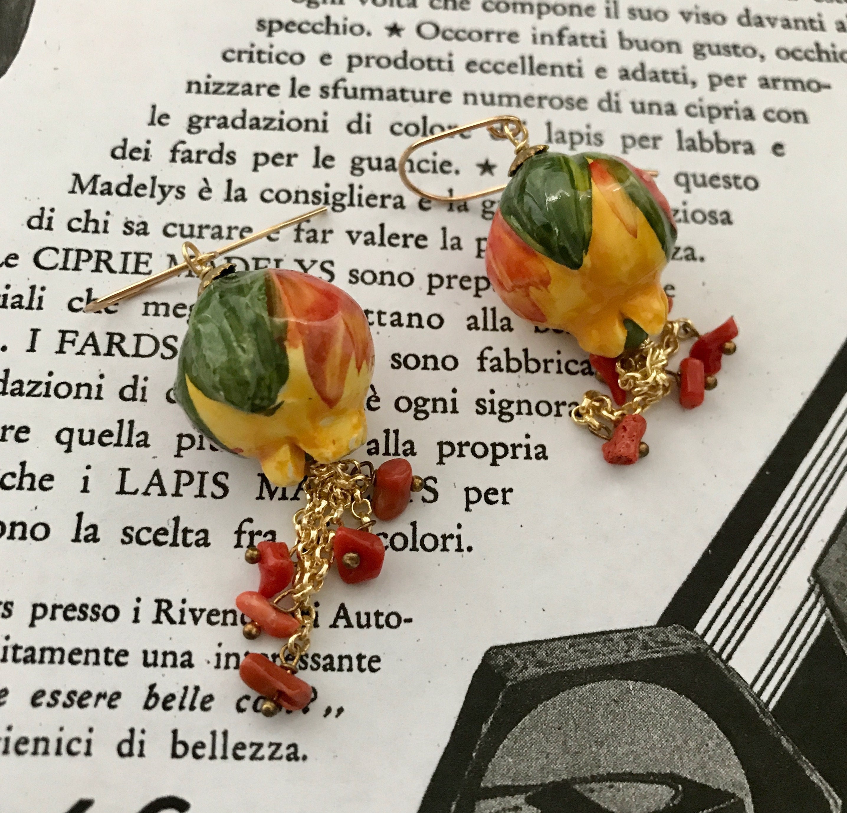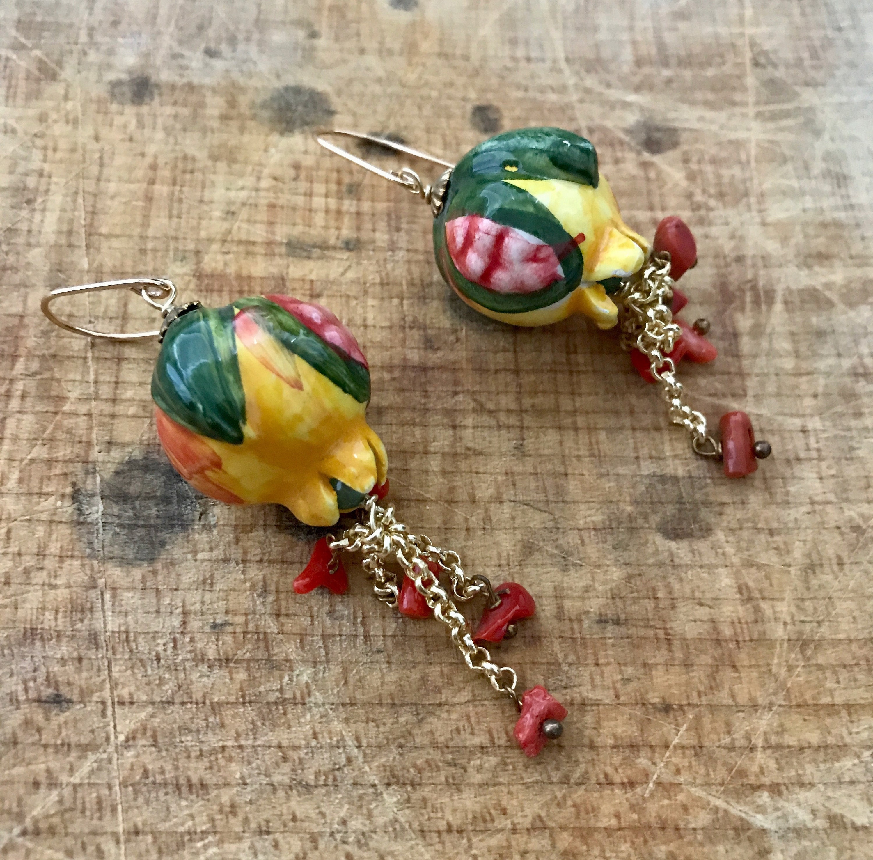 Orecchini siciliani con melograni in ceramica di caltagirone dipinta a mano e chips di corallo
