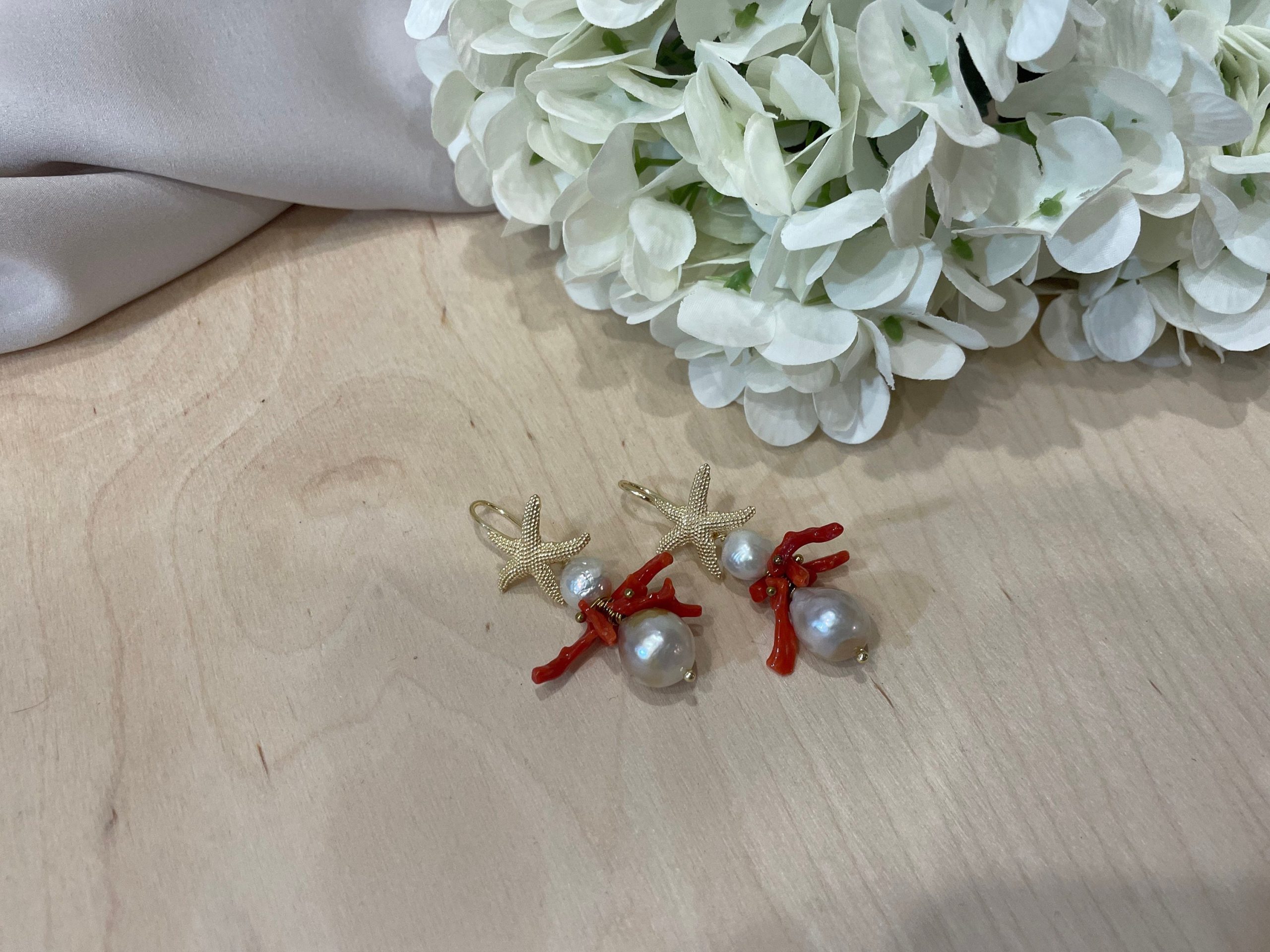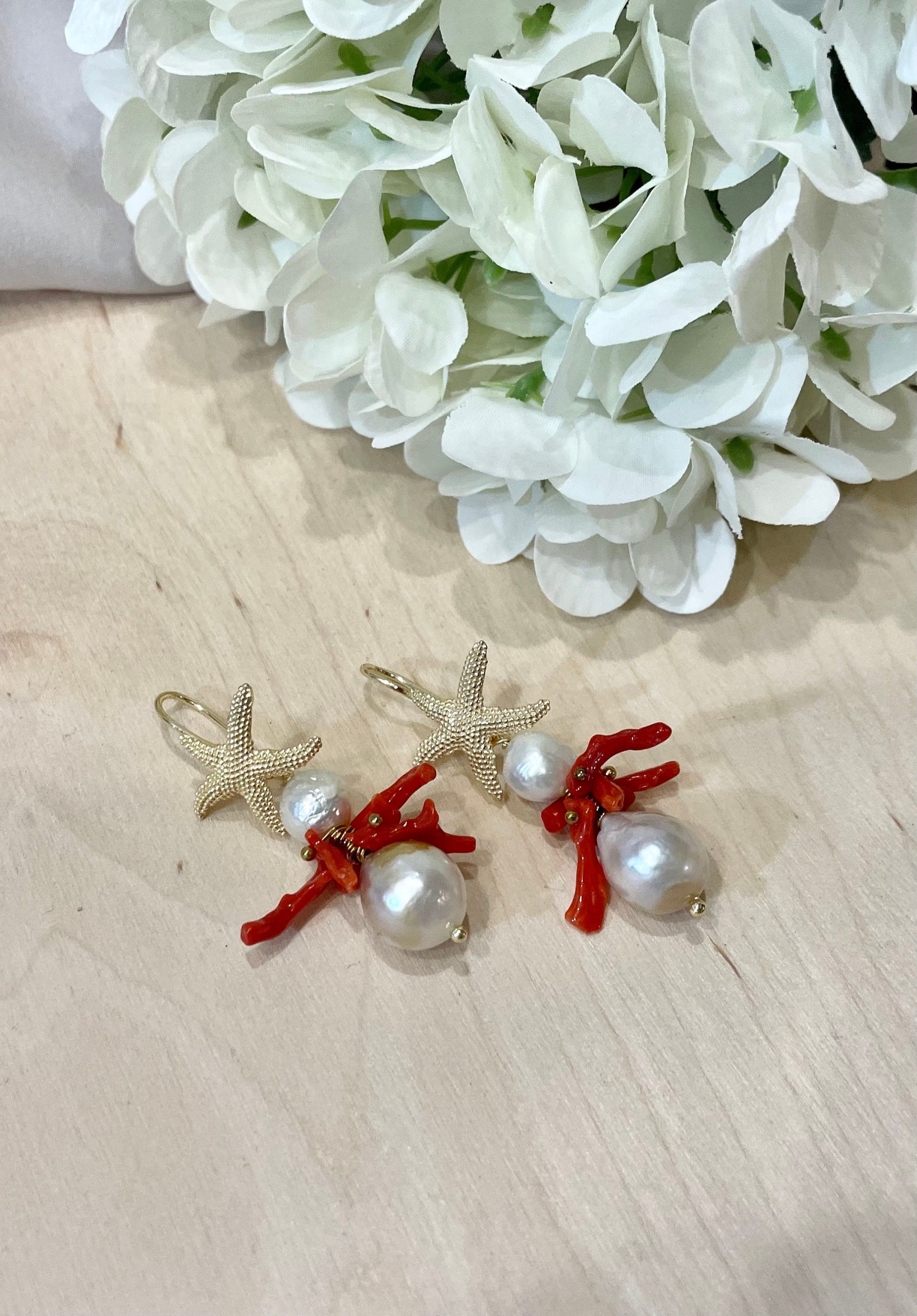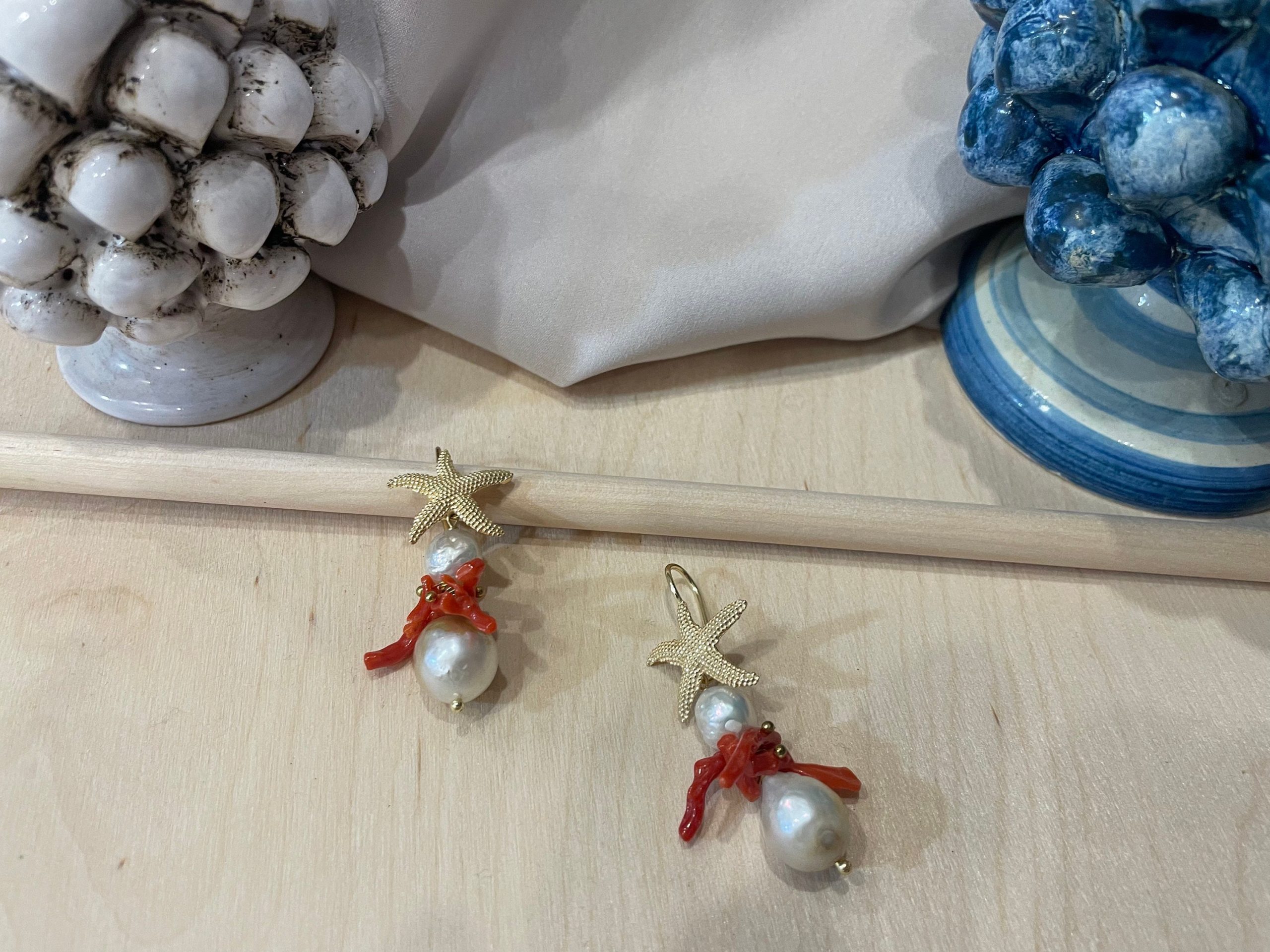 Pendenti due grosse perle barocche (mm 7 e mm 15) e un grappolo di rami di corallo rosso autentico del Mediterraneo.