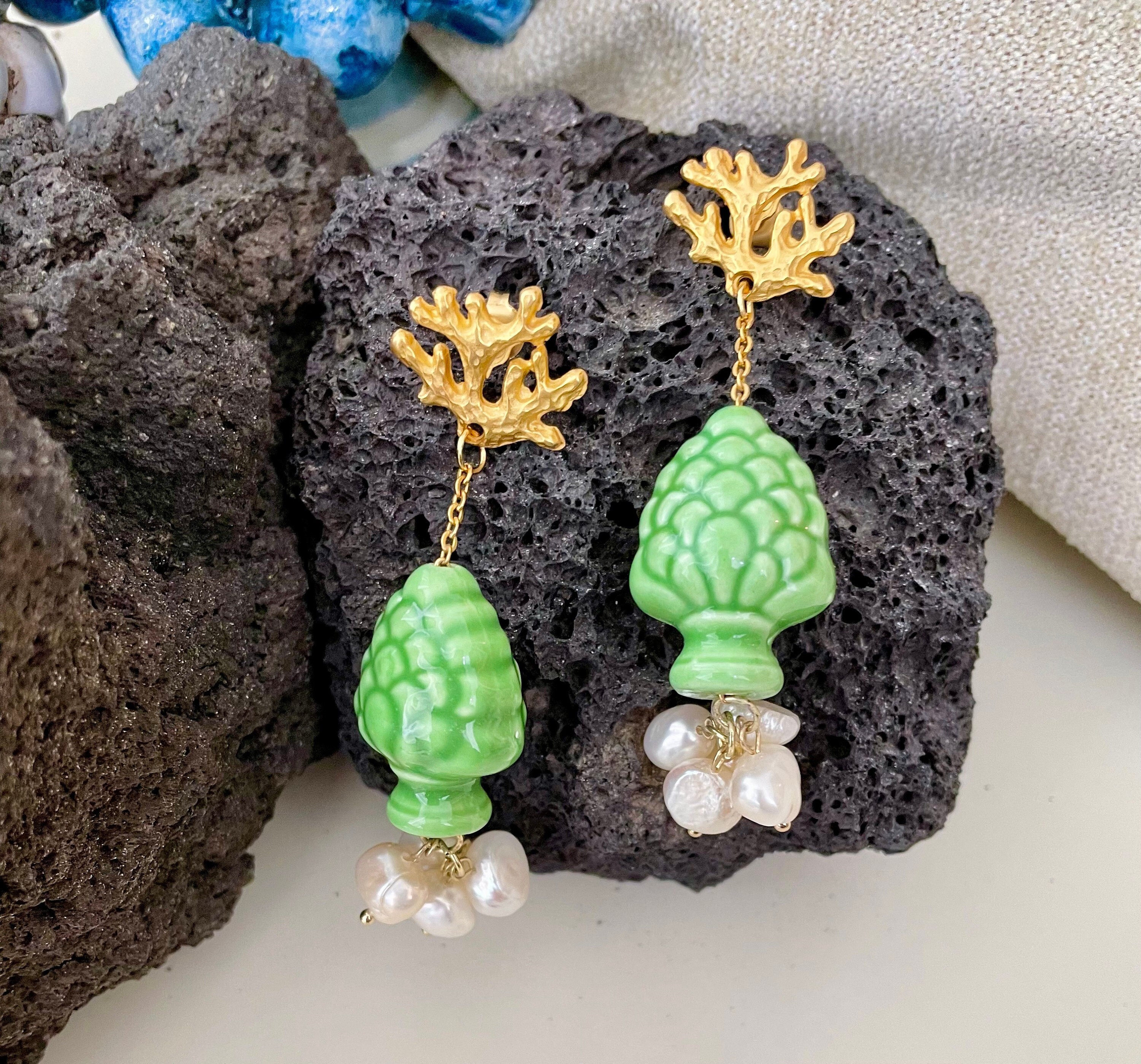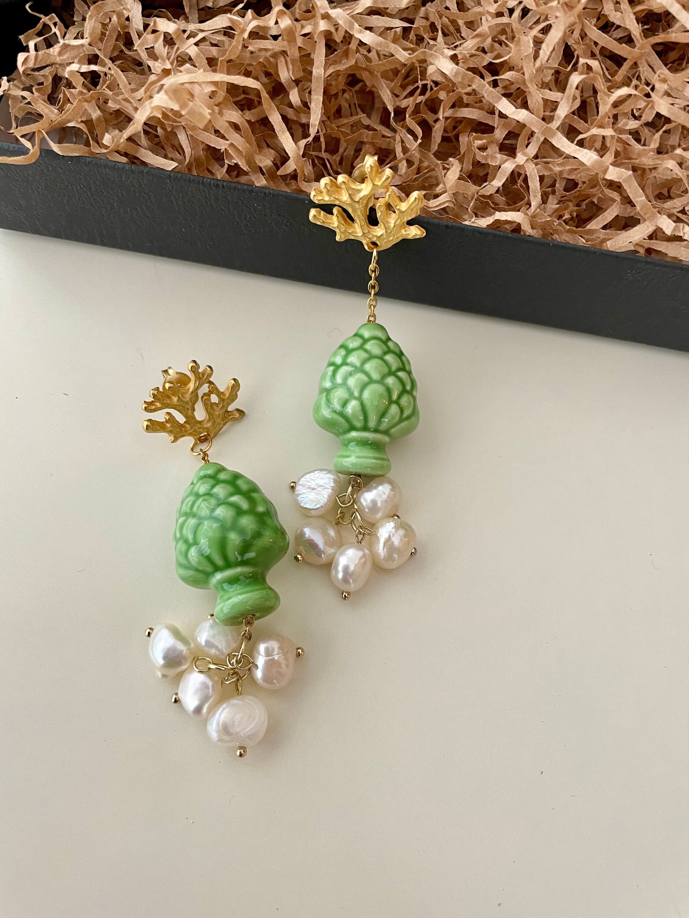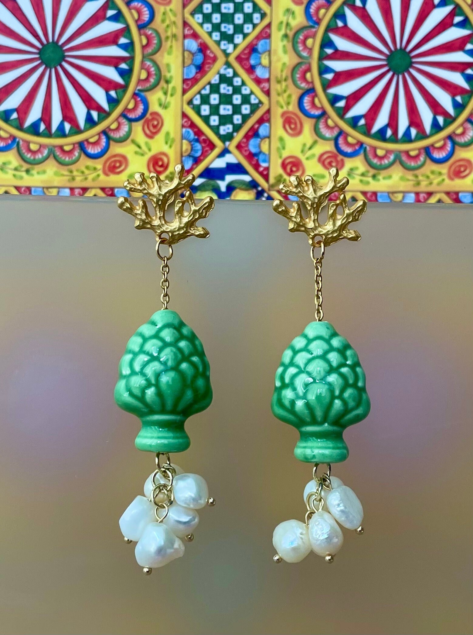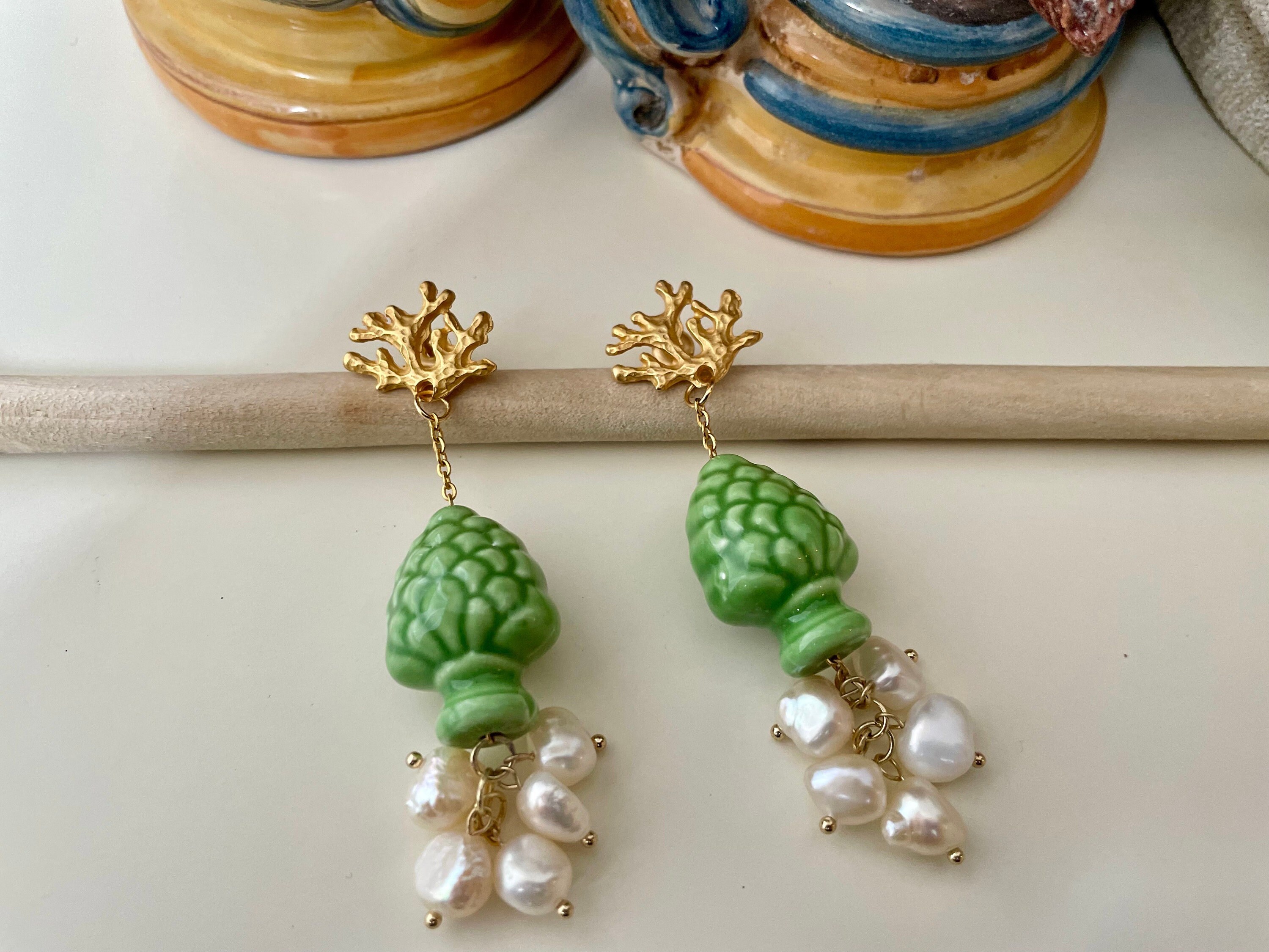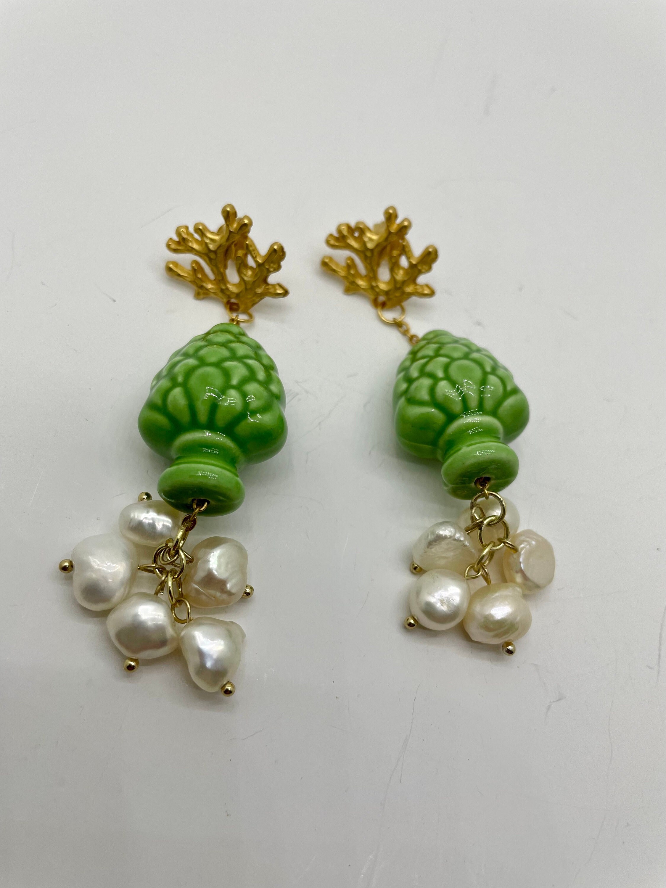 Realizzati con perno in zama raffigurante rami di corallo e pendente la tipica Pigna siciliana in ceramica di Caltagirone di colore verde e grappolo di perle di fiume.