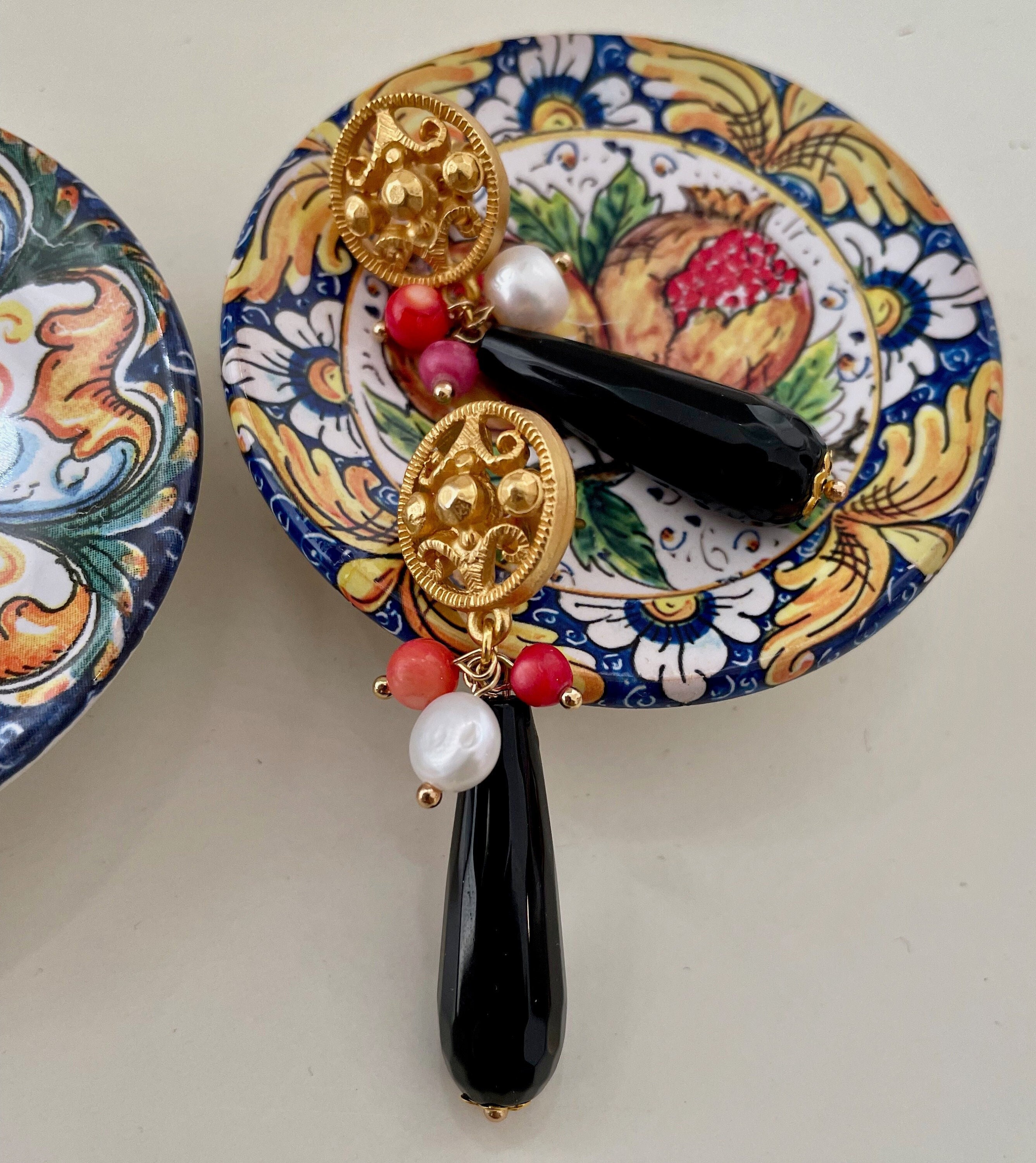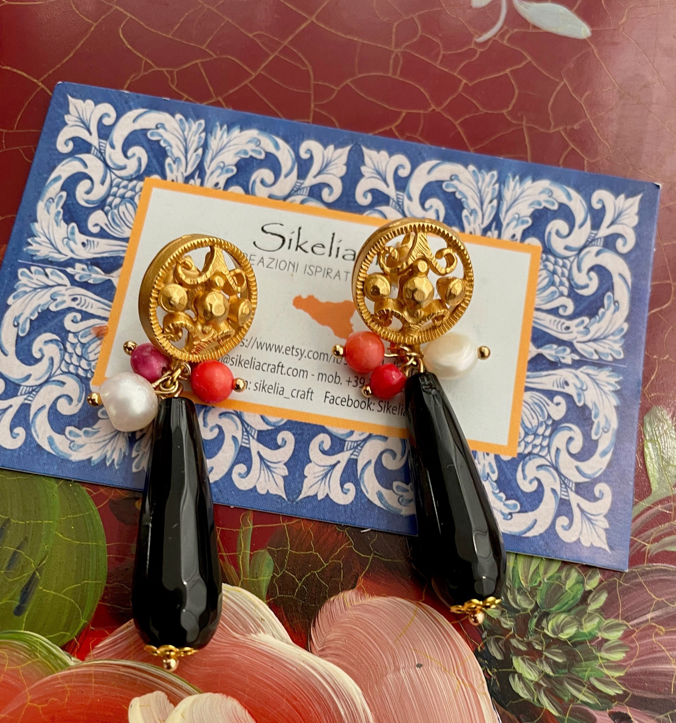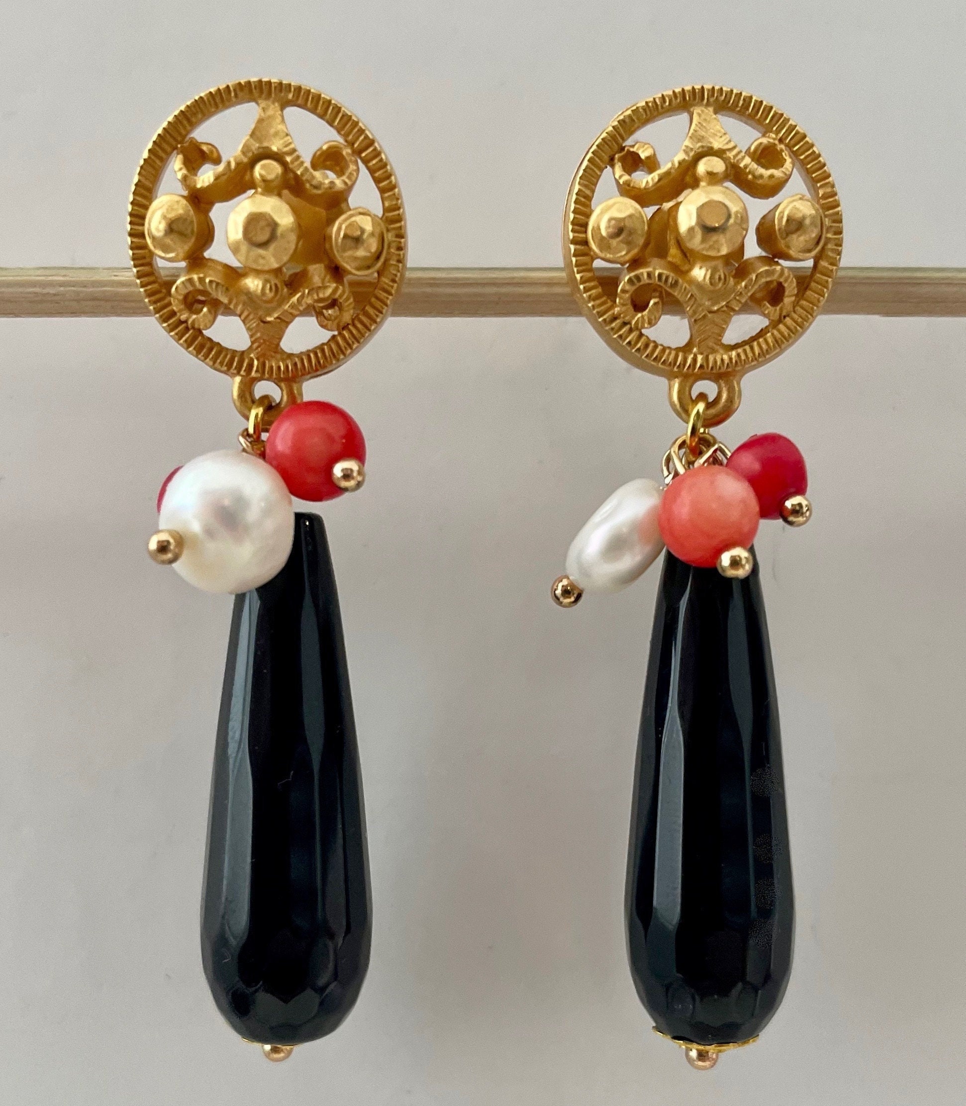 Realizzati con perni in zama tondi dallo stile bizantino, perla a goccia in onice, perline di corallo e perle di fiume.