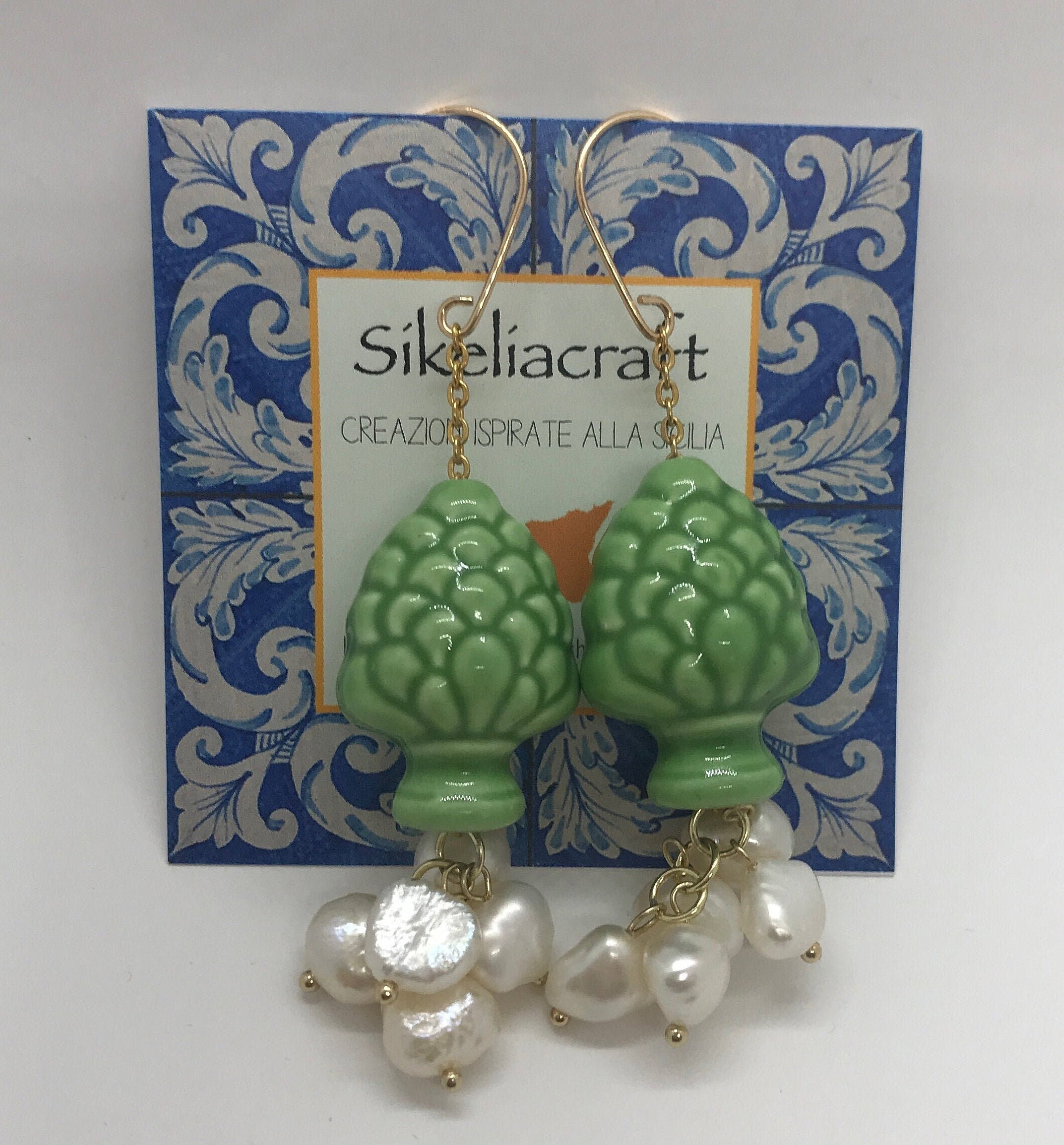 Composti da tipica pigna verde in ceramica di Caltagirone e grappolo di perle di fiume pendenti.