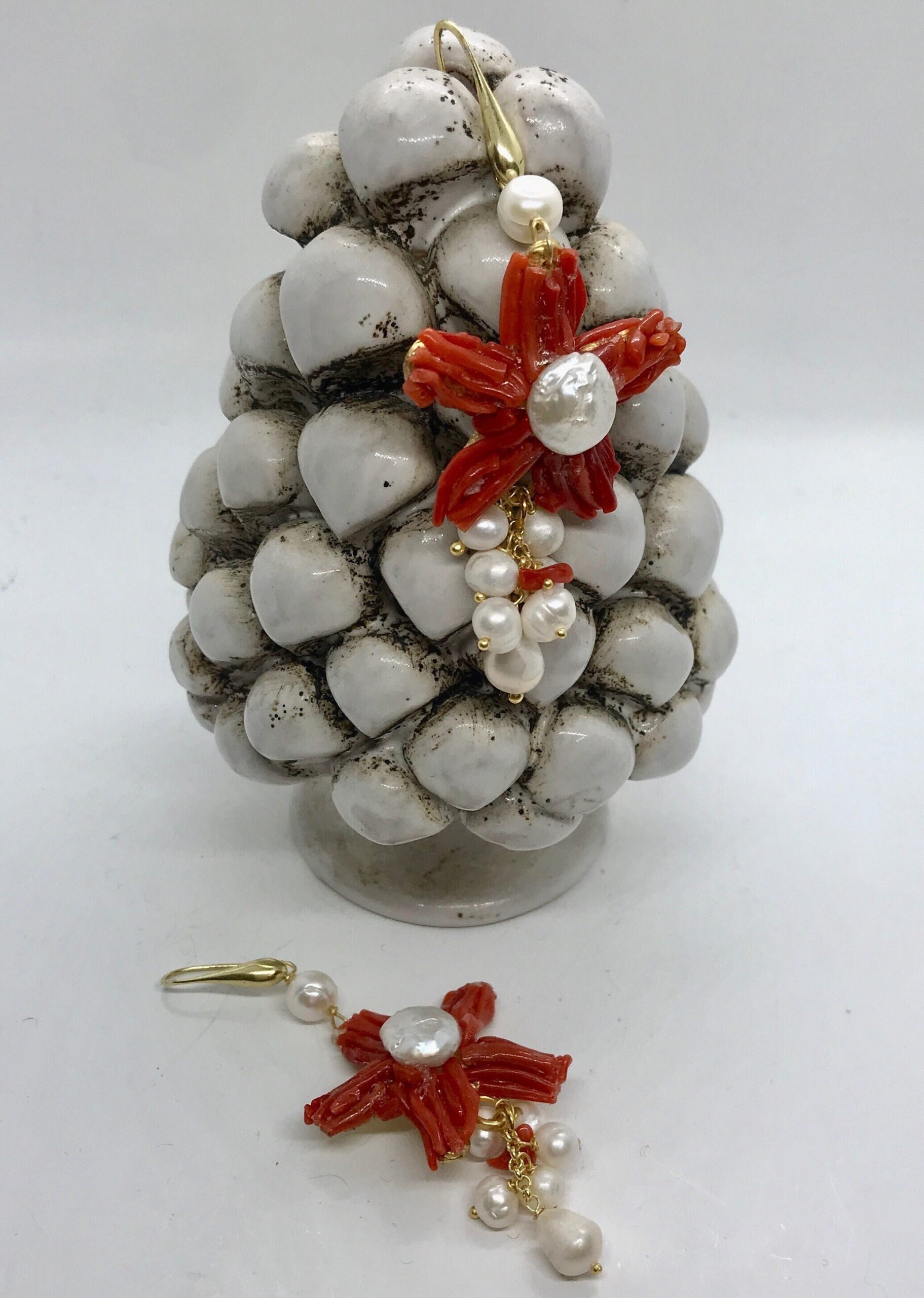Realizzati con monachella in ottone e pendente Stella in ottone rivestita di rametti di corallo e perla barocca al centro.