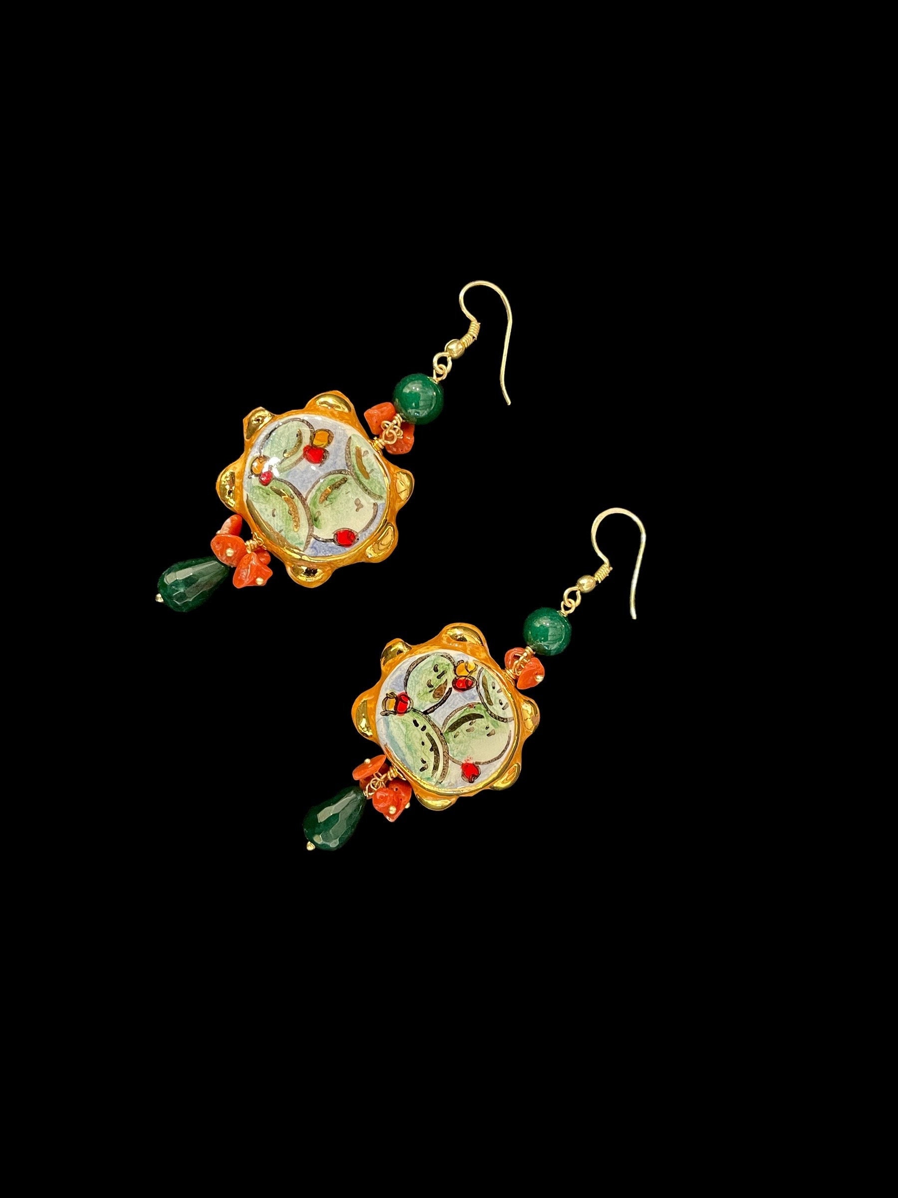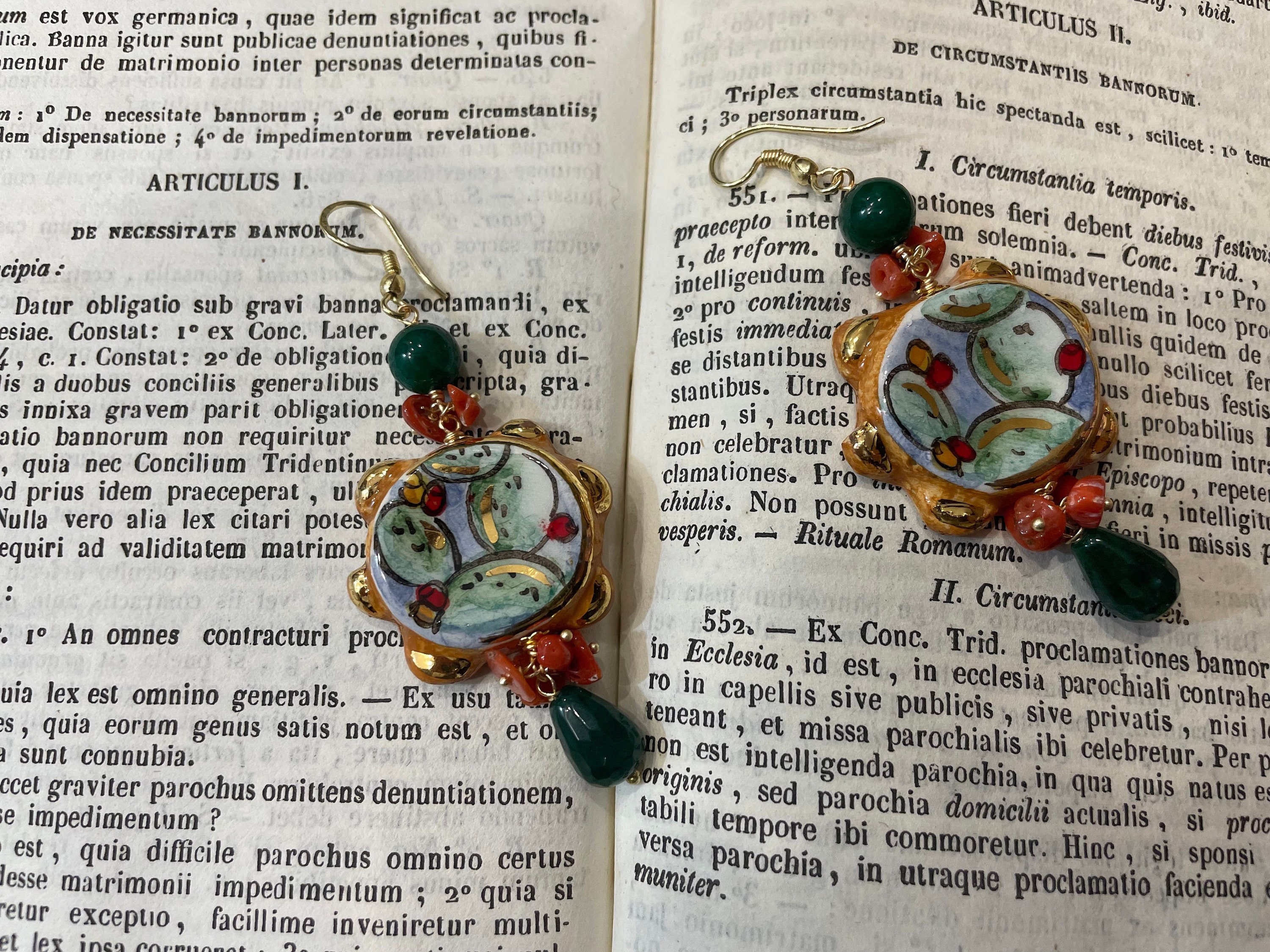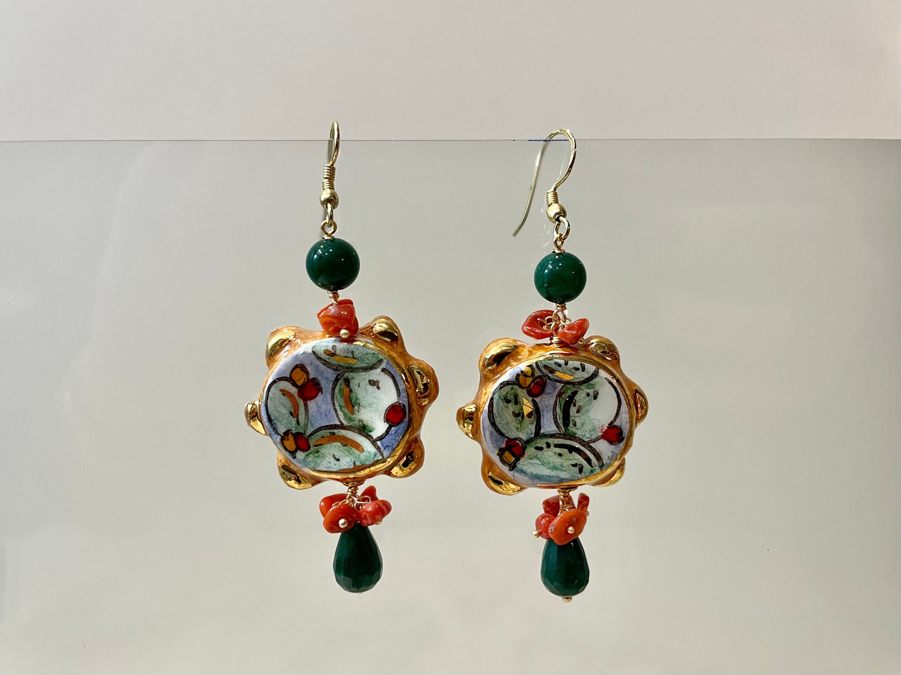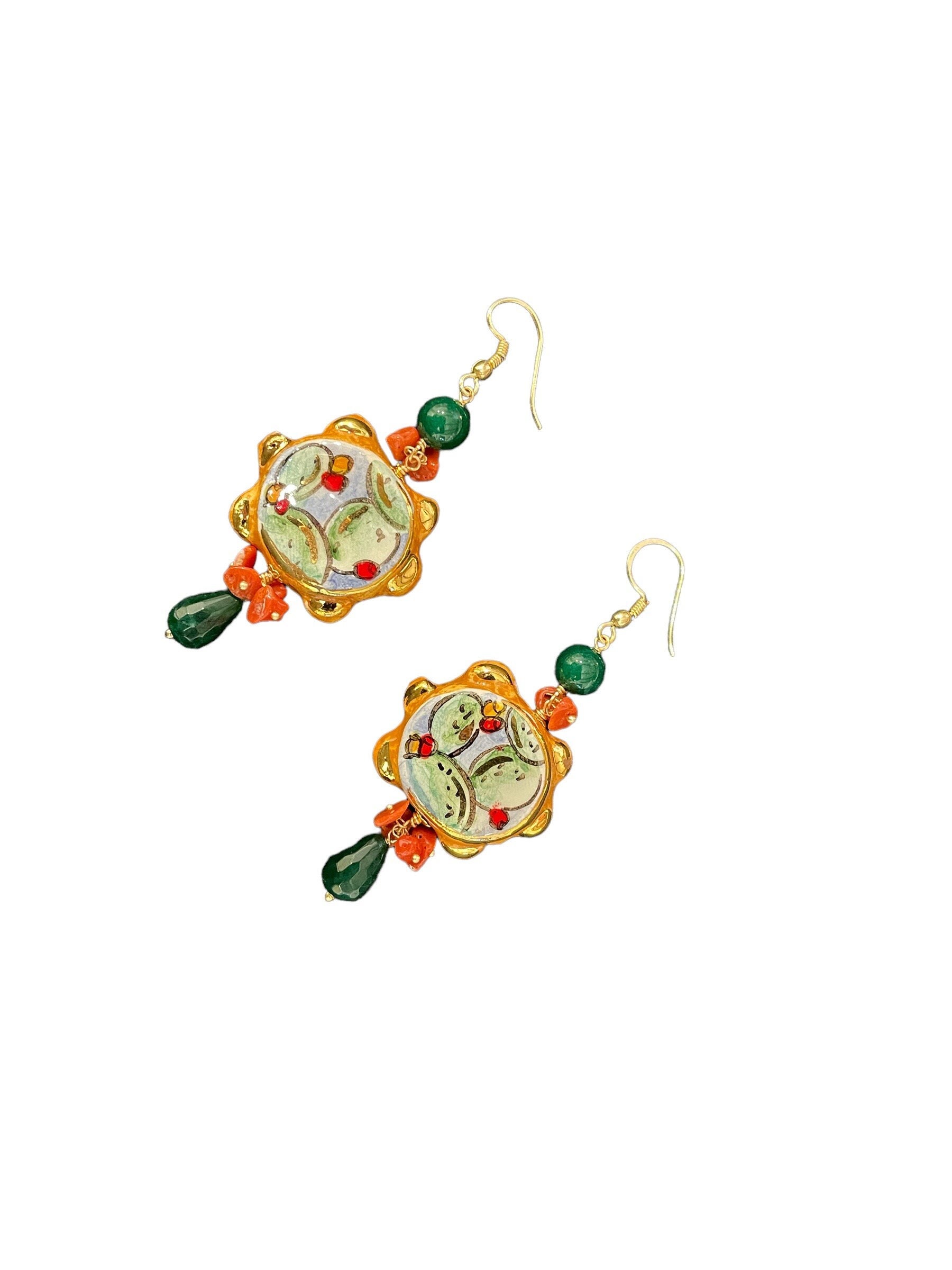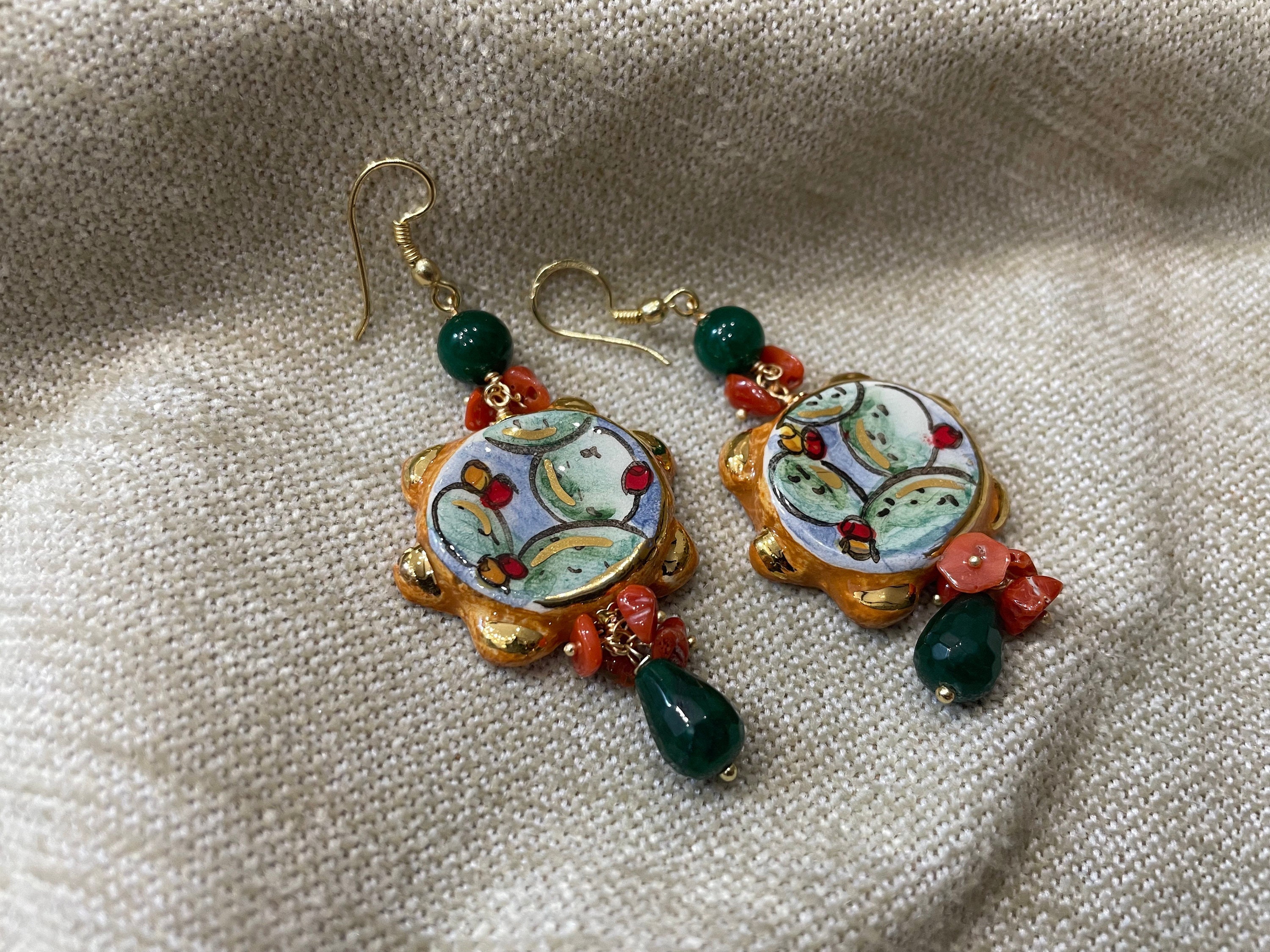 Caratteristici orecchini siciliani con il tipico Tamburello, realizzato in ceramica di Caltagirone dipinta a mano, e raffigurante Fichi d’India.
