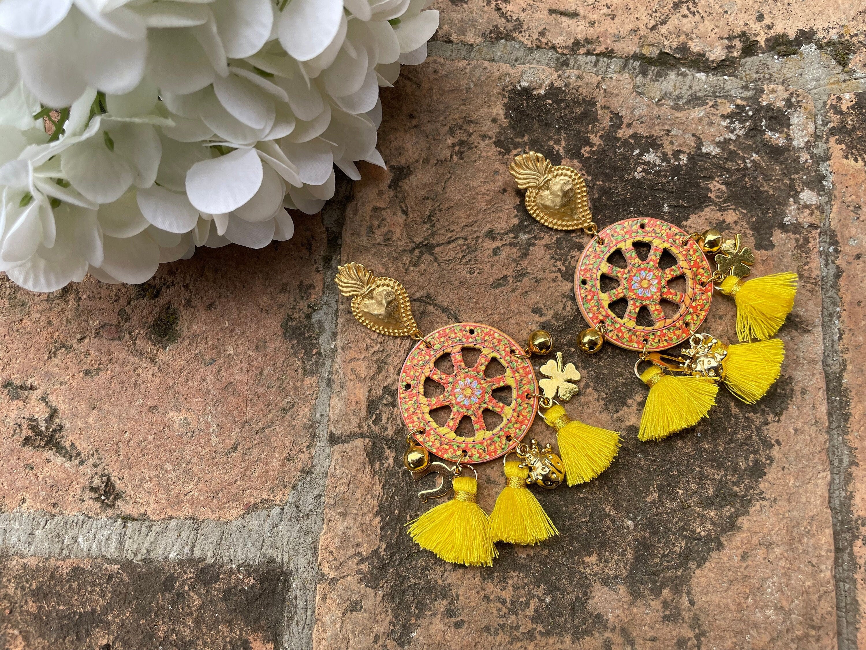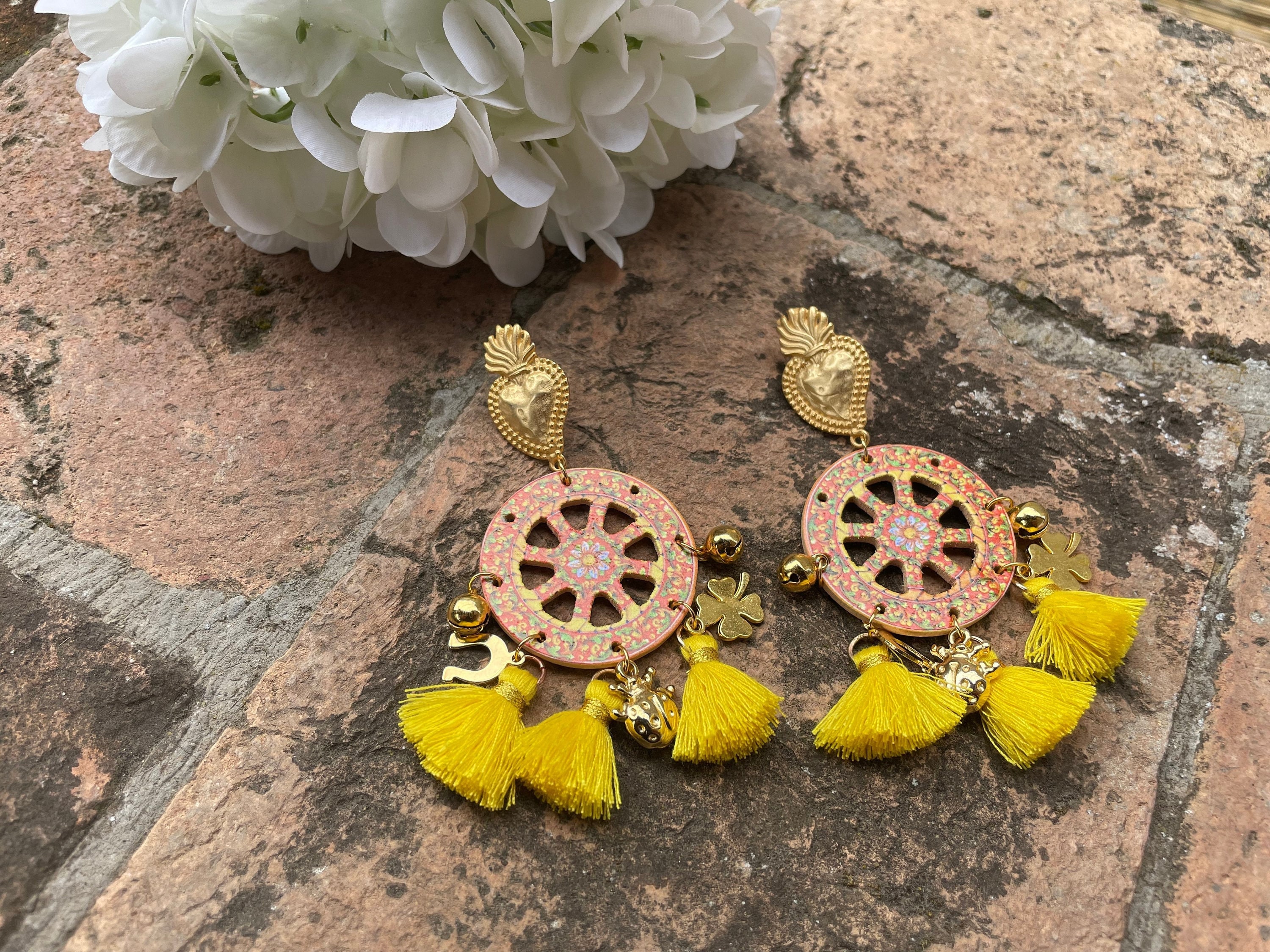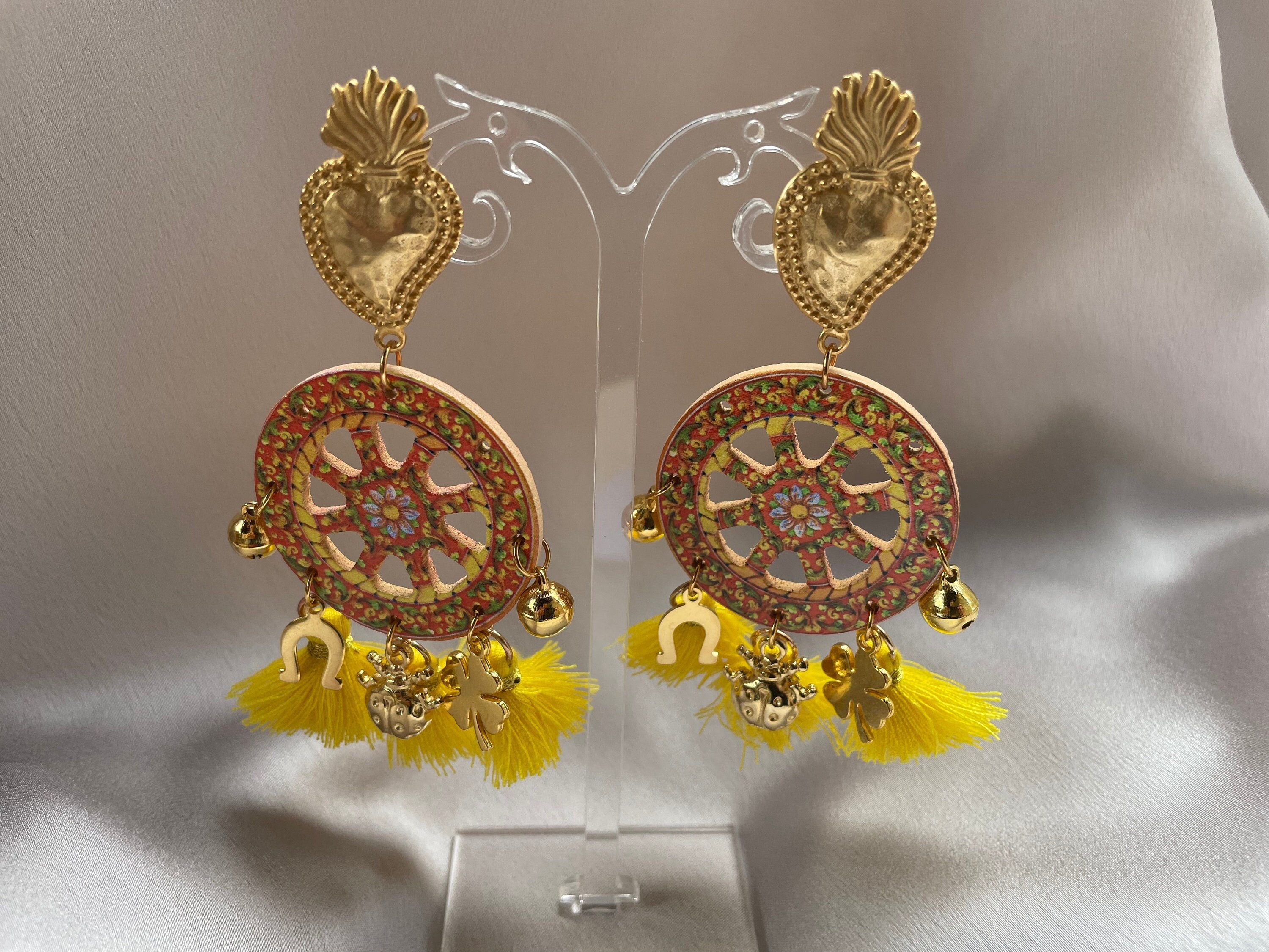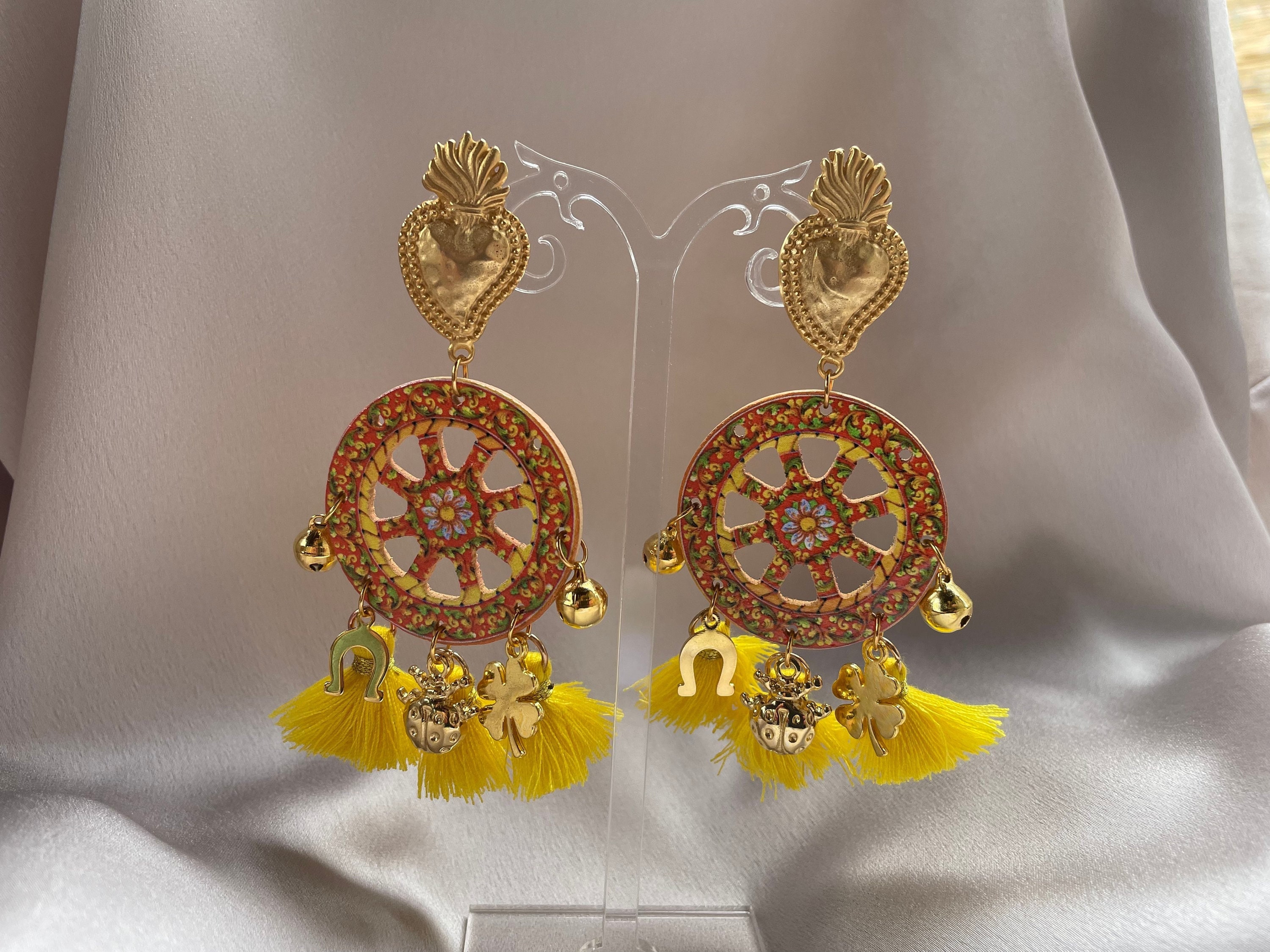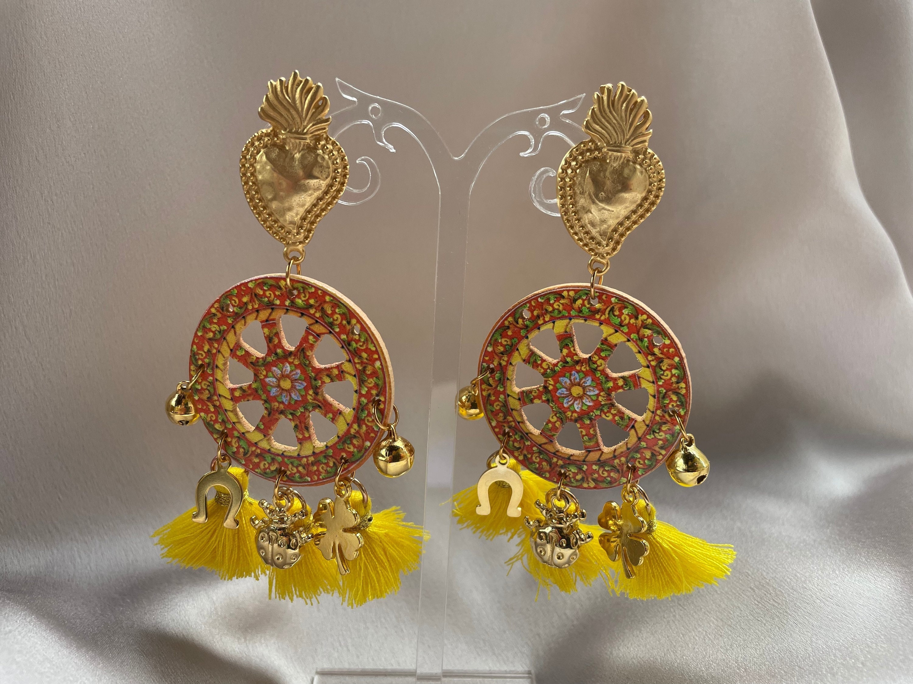 Orecchini siciliani della fortuna dallo stile bohemienne realizzati con perno in ottone Cuore sacro e Ruota di carretto in legno colorata e decorata riccamente.