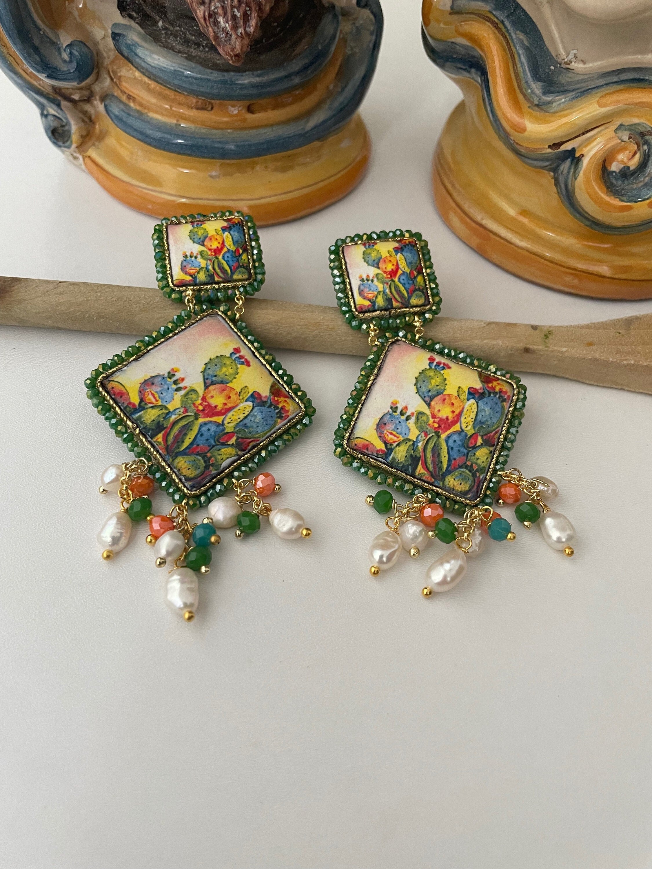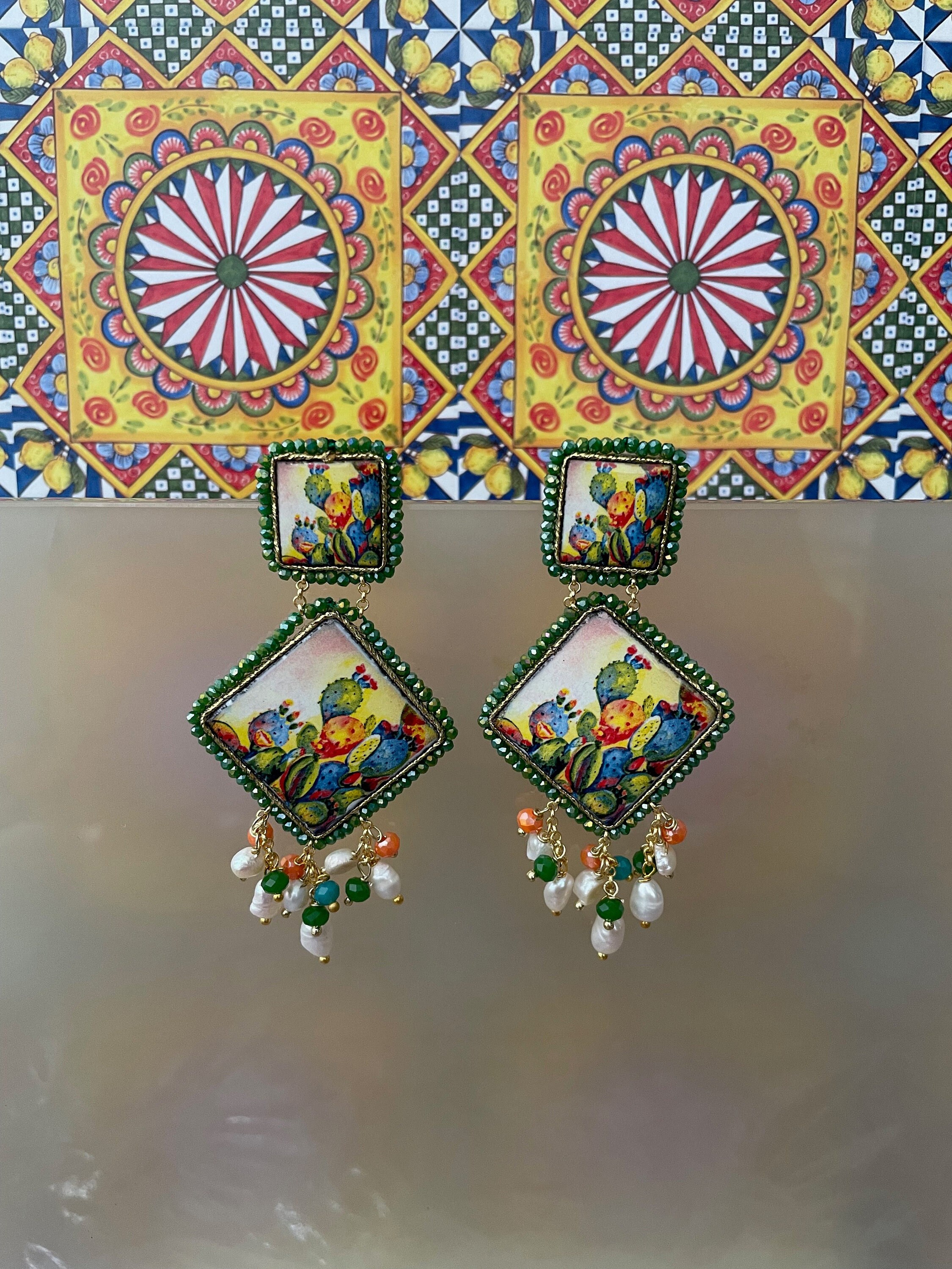 Le mattonelle, stampate in superficie, raffigurano Fichi d’India, simbolo siciliano, e sono incorniciate da un filo di microcristalli verdi.