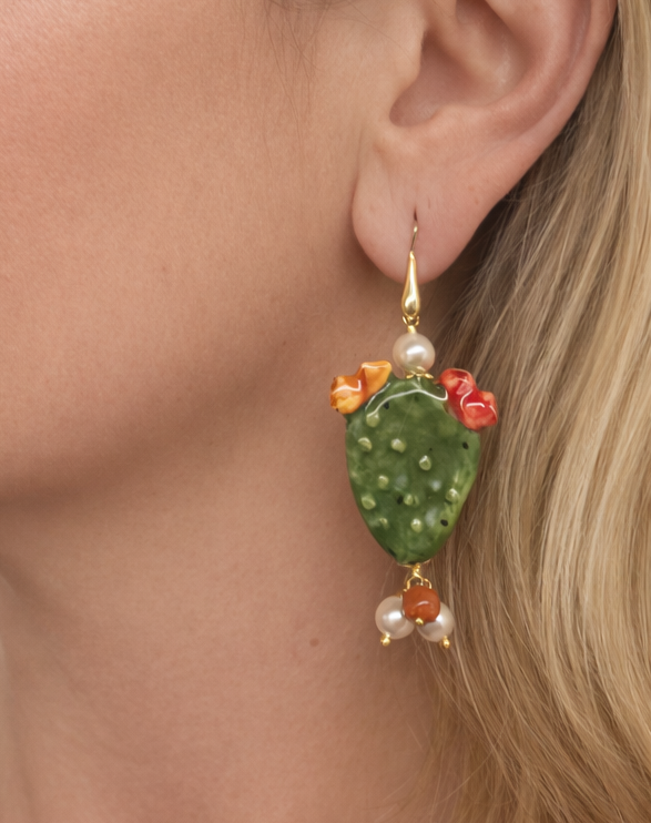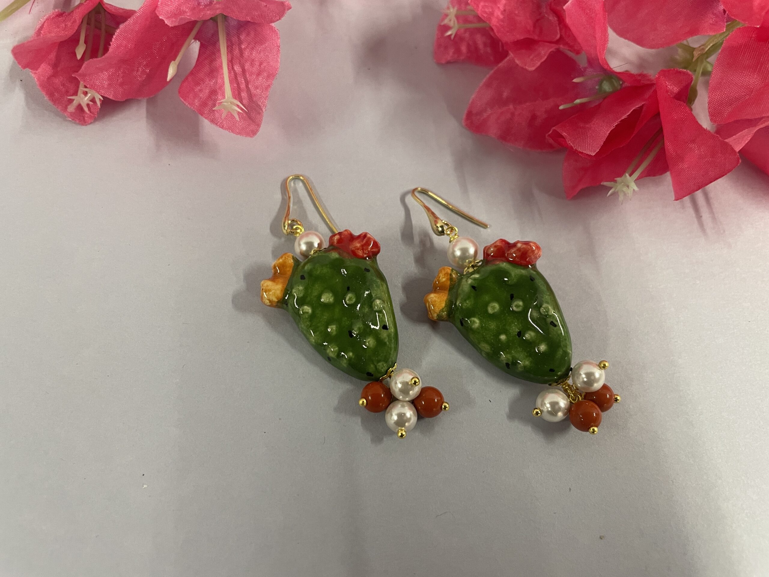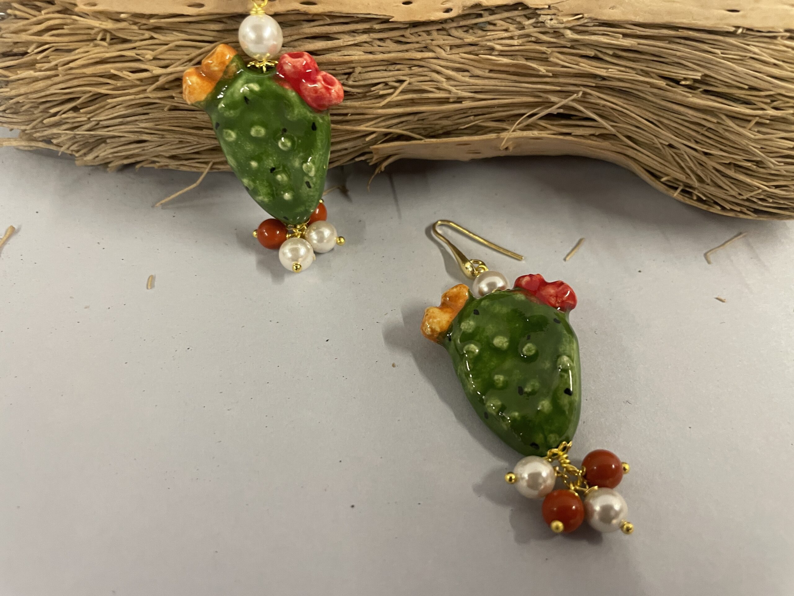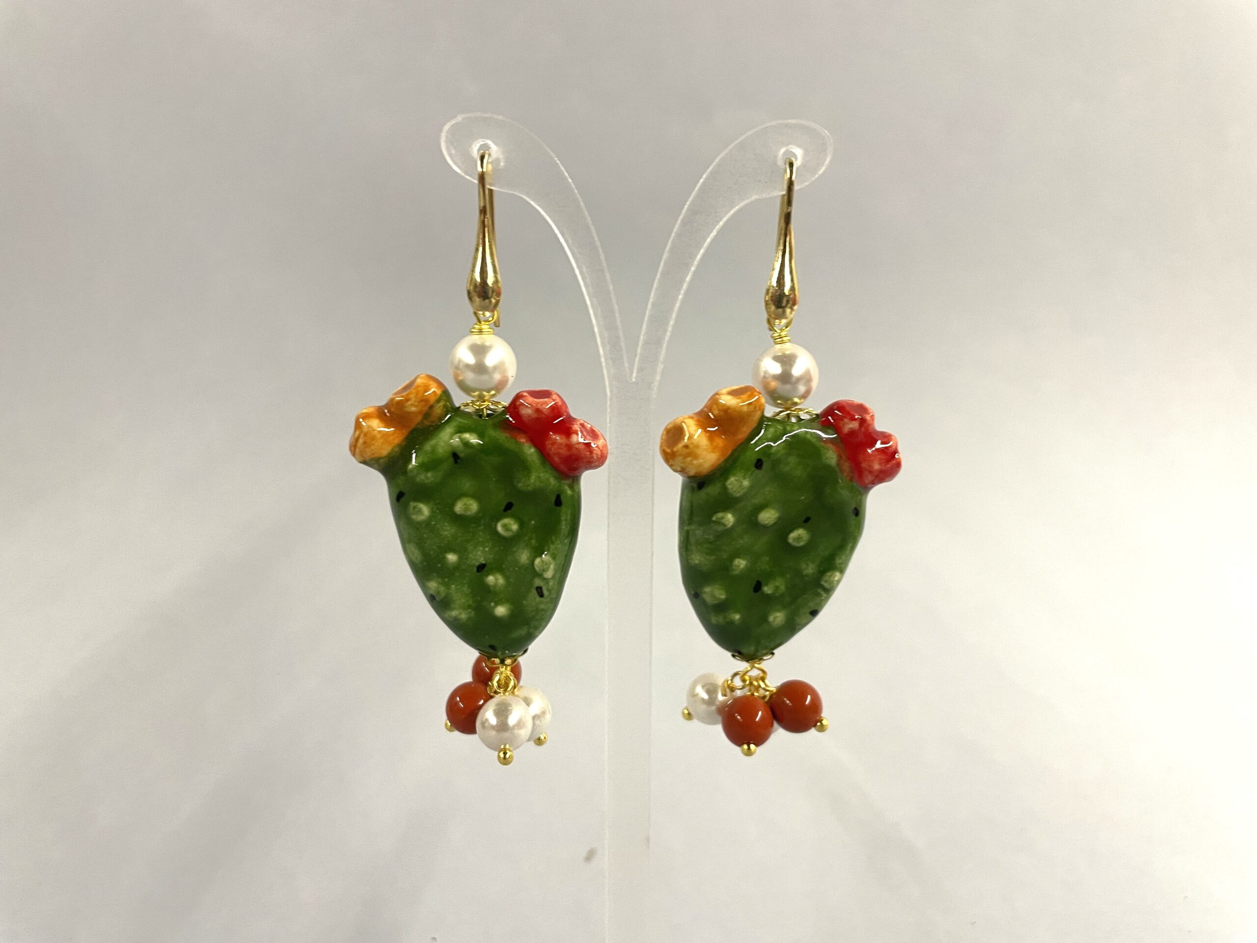Orecchini siciliani fico d’India ceramica Caltagirone – Orecchini artigianali con perle e corallo