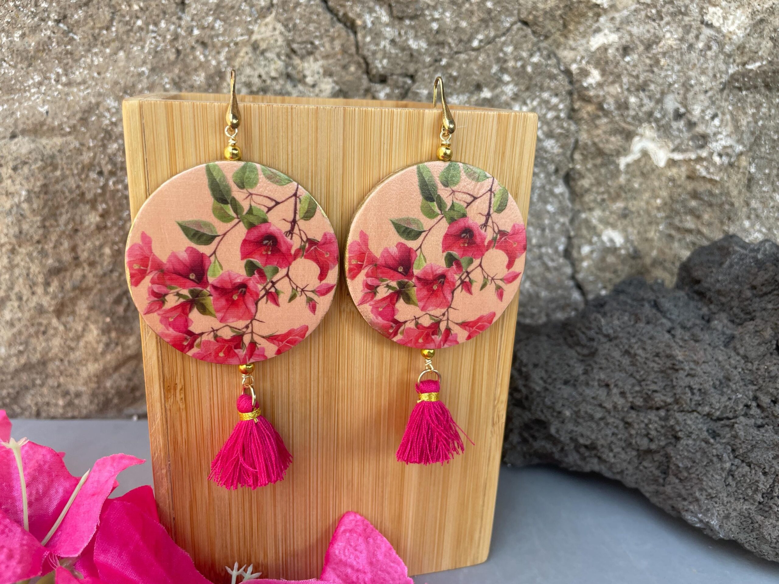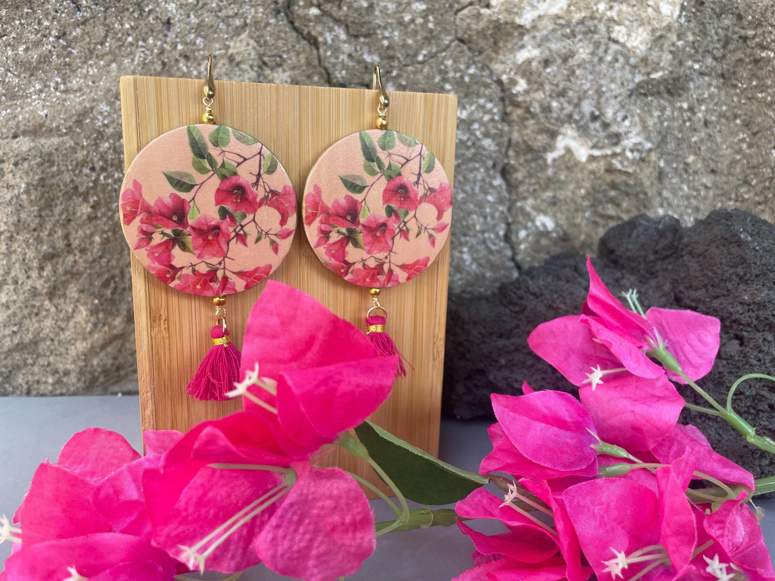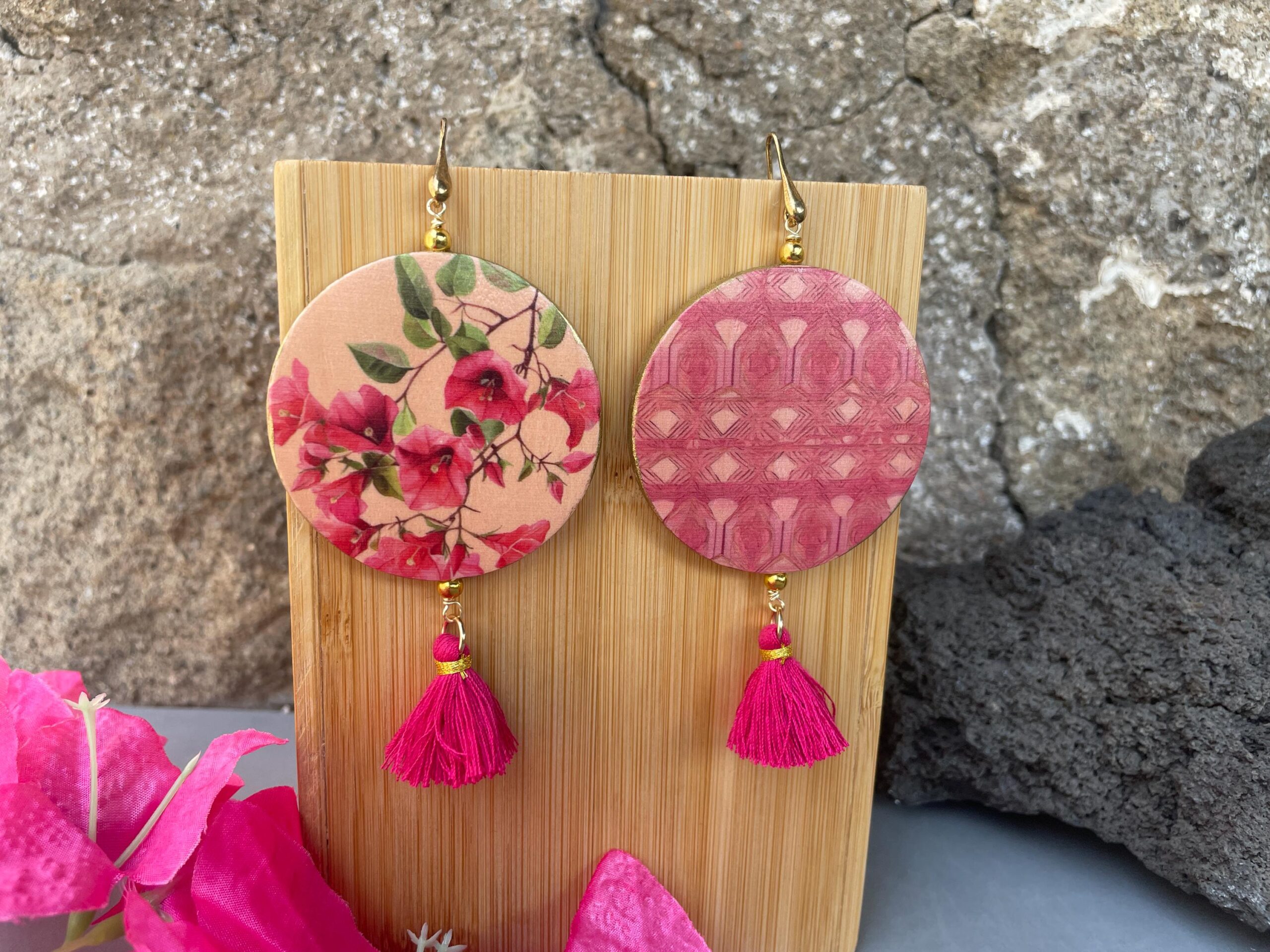 Un Medaglione di legno stampato in superficie sui due lati raffigurante su un lato una Bouganvillea rosa e sull’altro una texture geometrica sui toni del rosa.