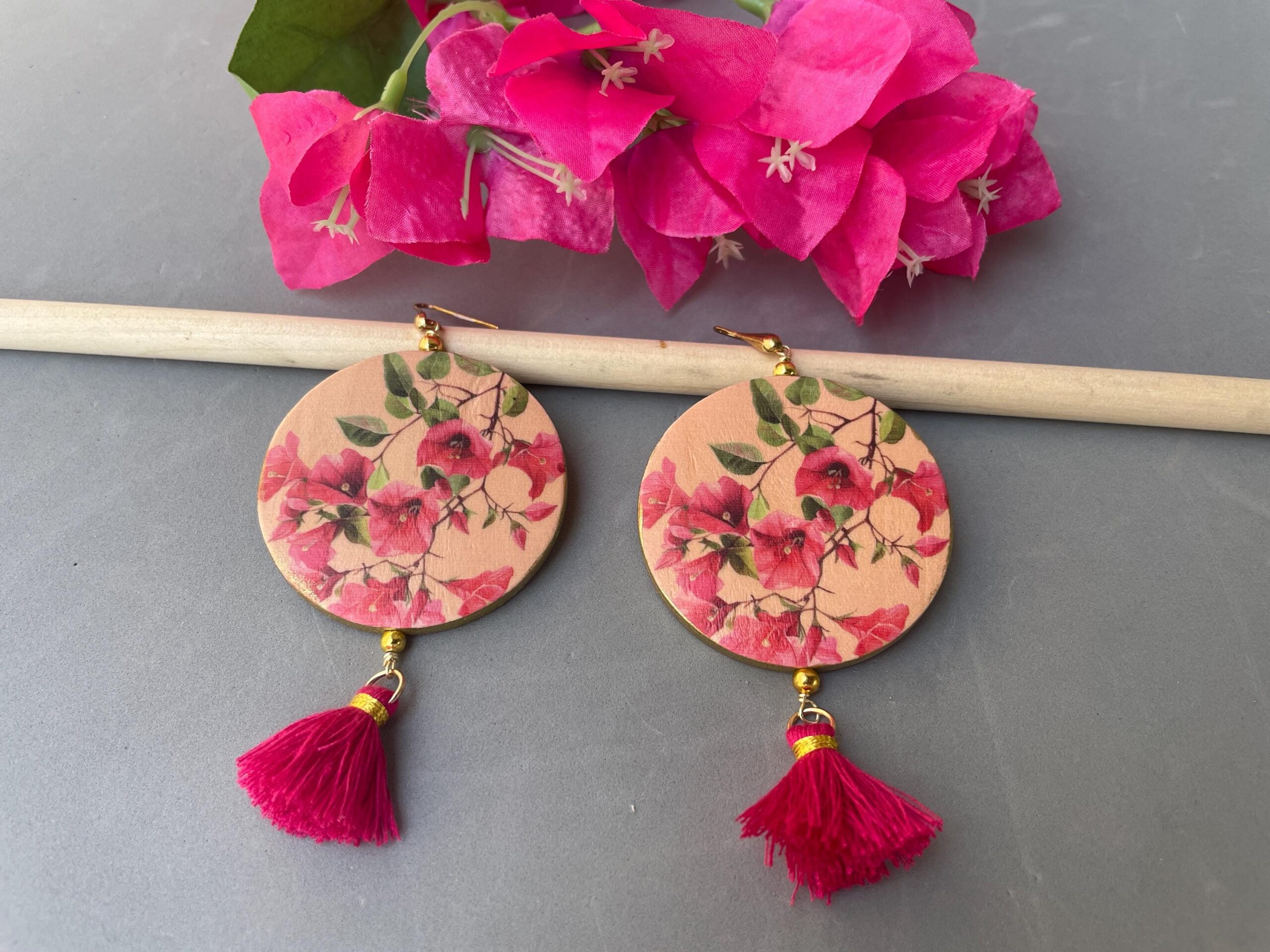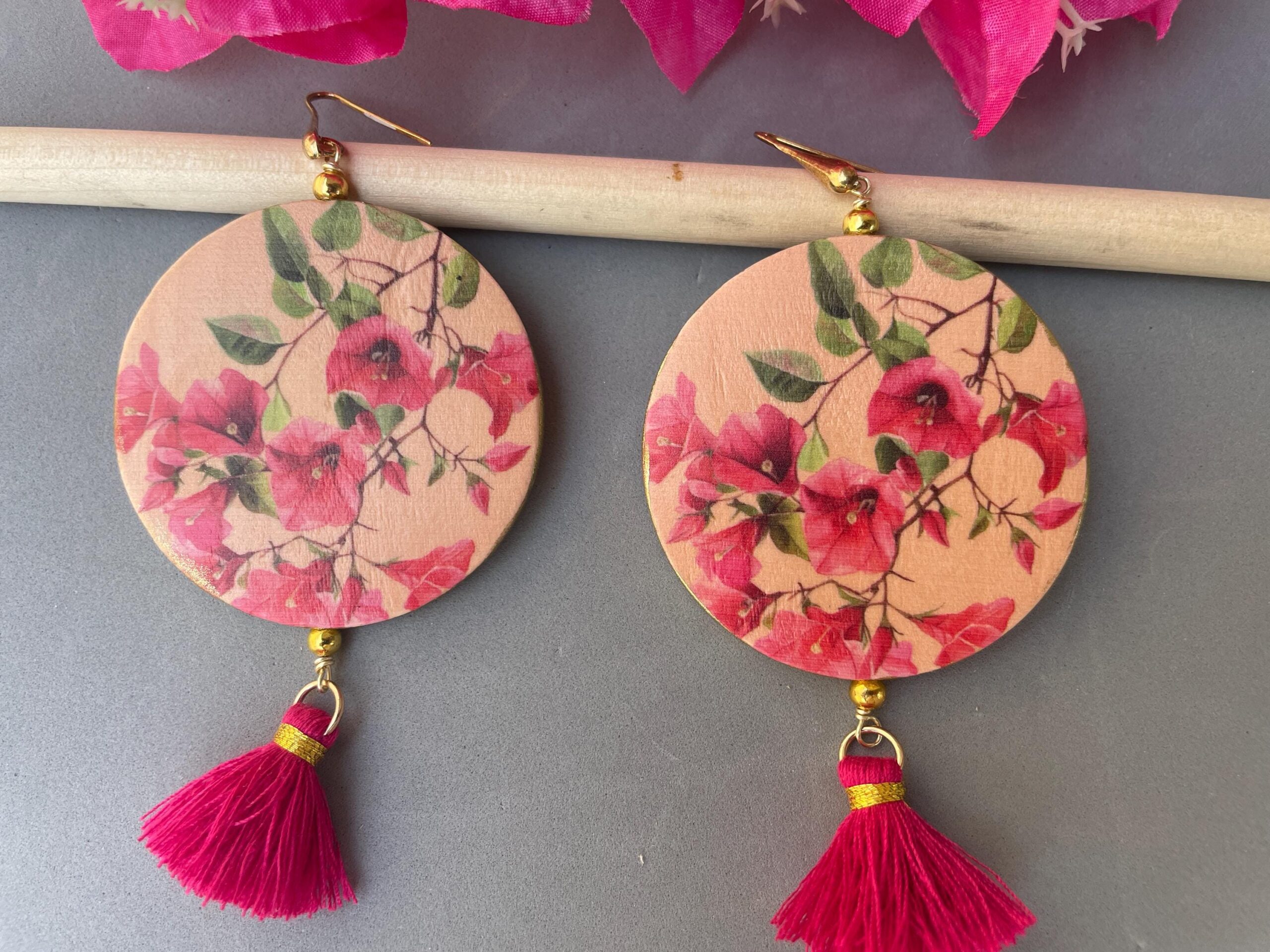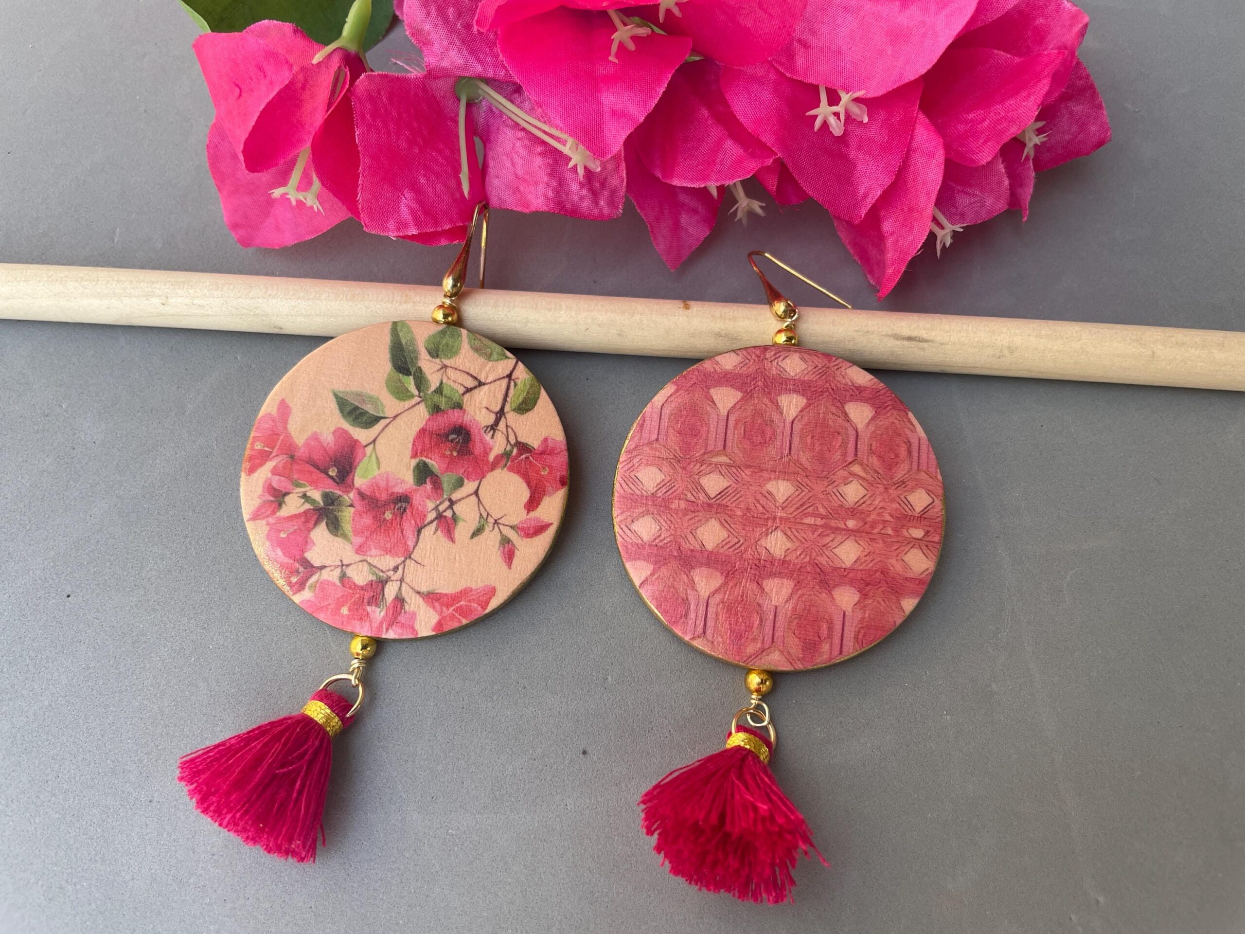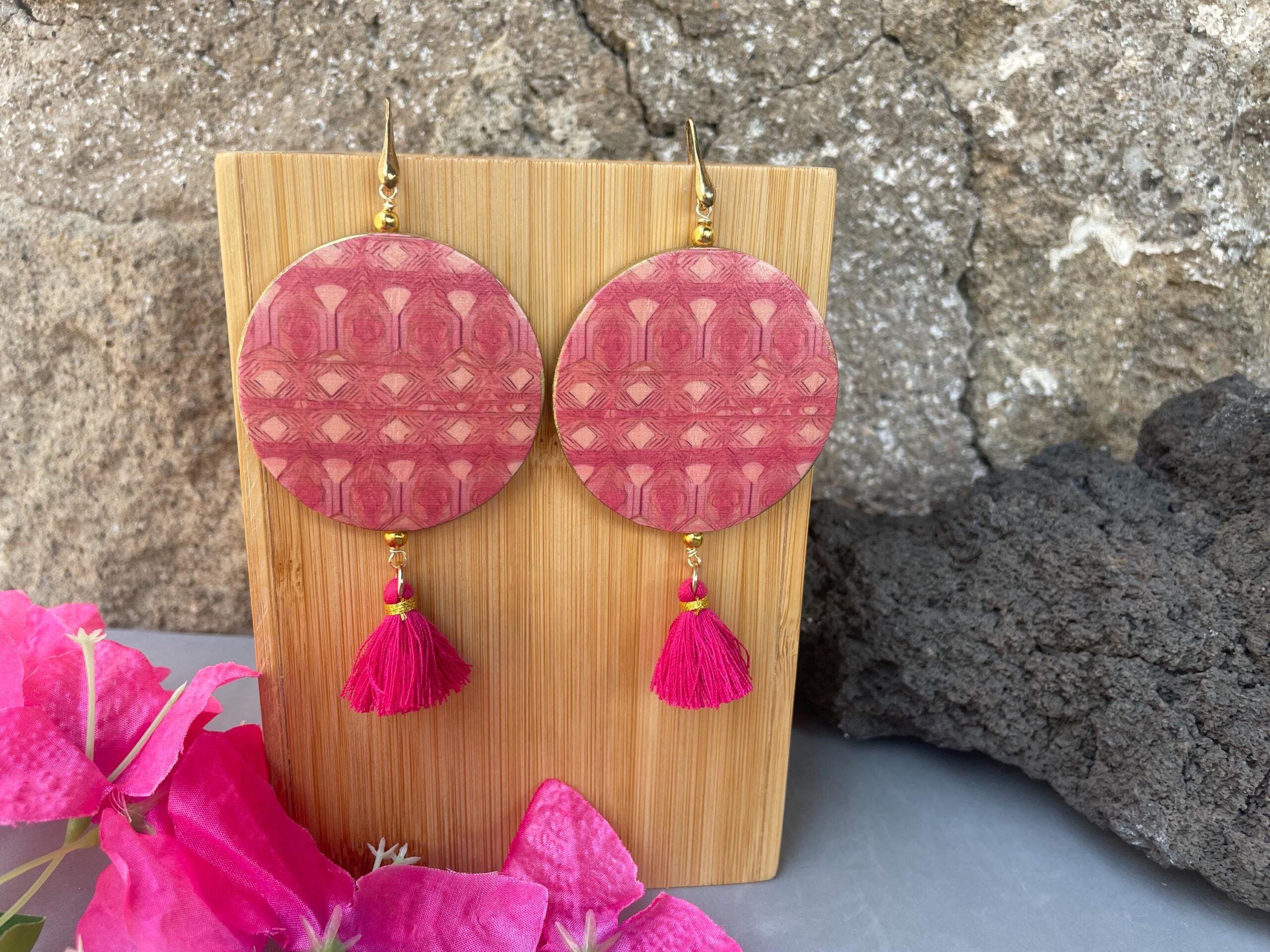 Un Medaglione di legno stampato in superficie sui due lati raffigurante su un lato una Bouganvillea rosa e sull’altro una texture geometrica sui toni del rosa.
