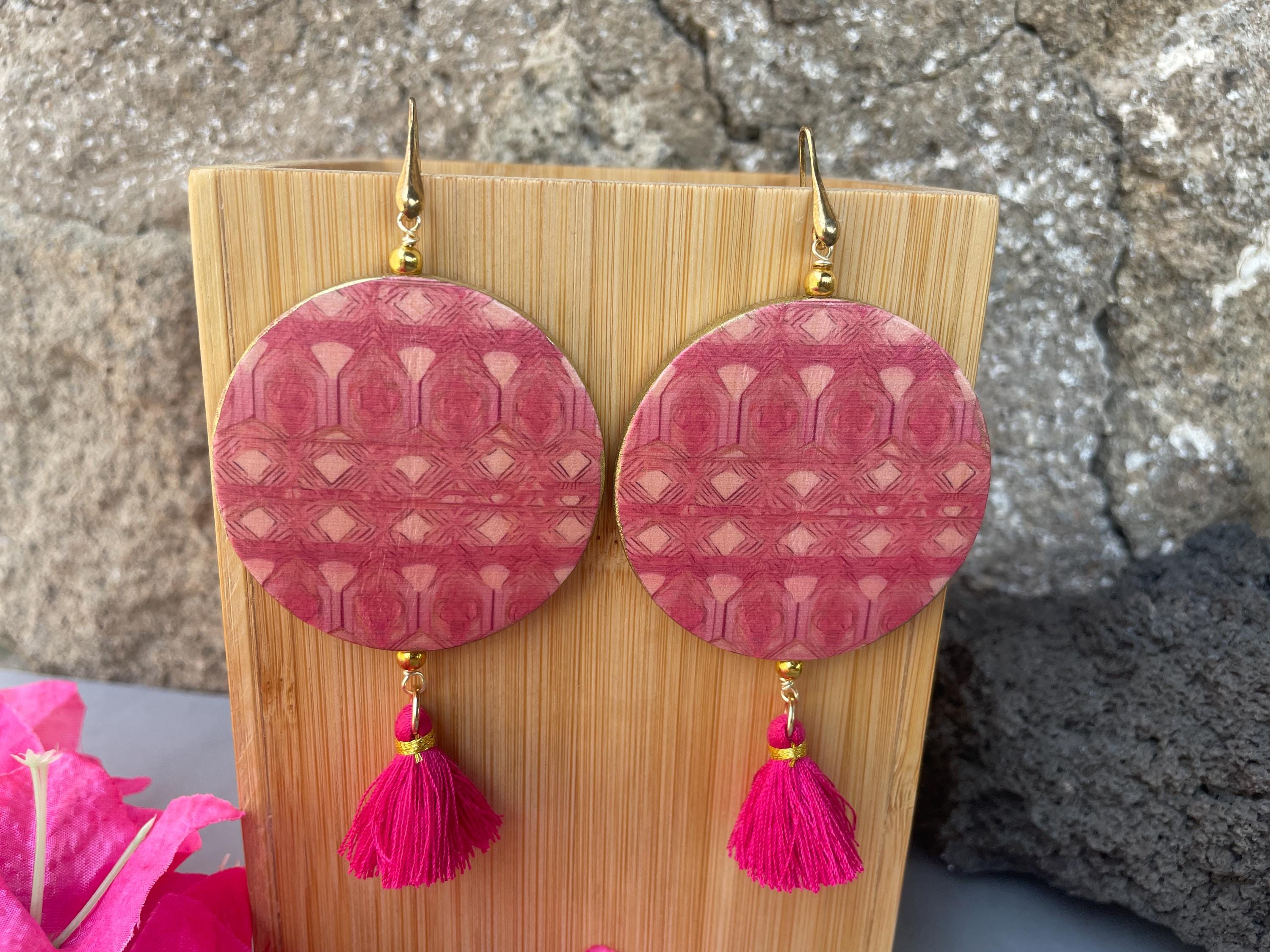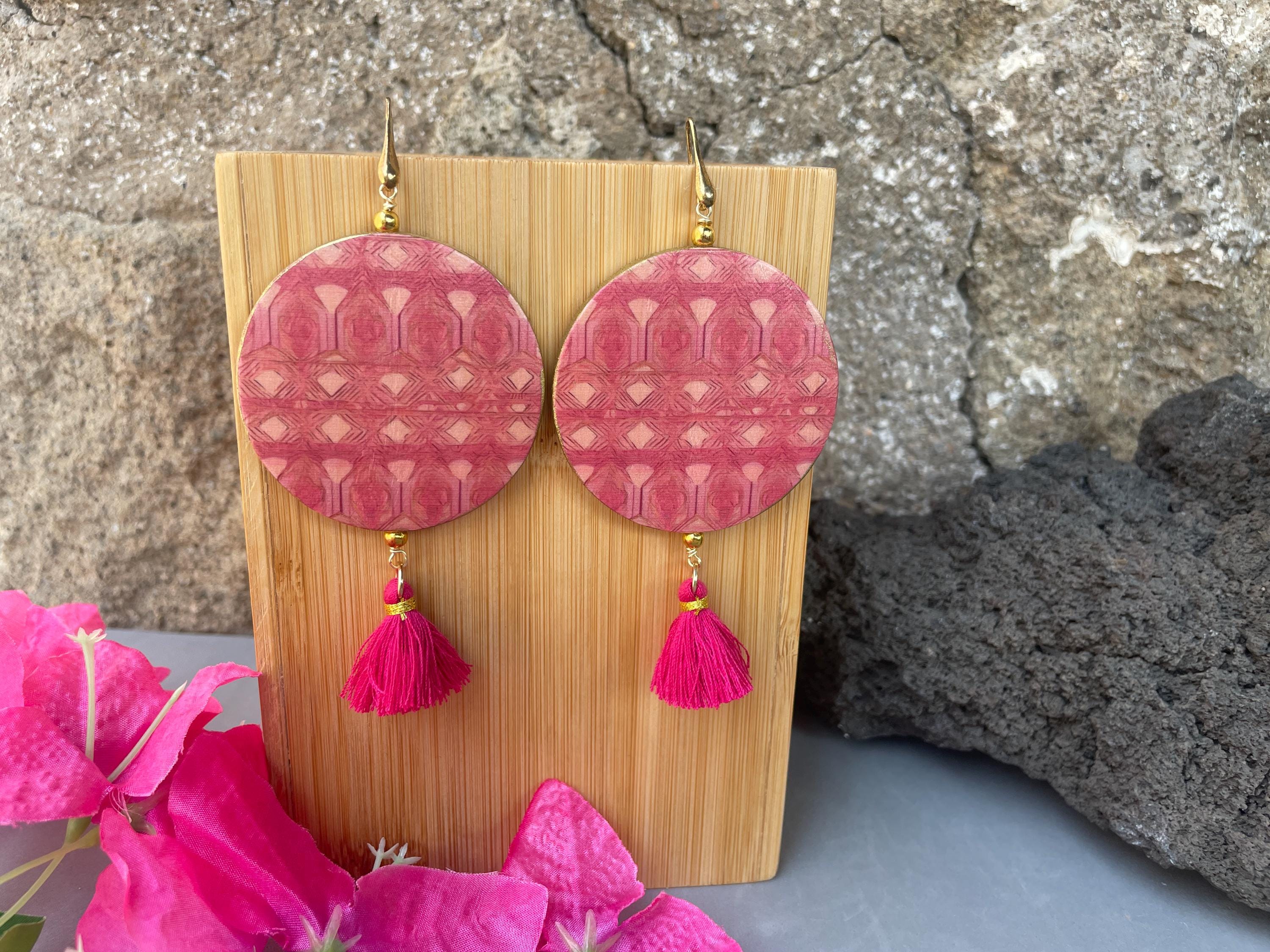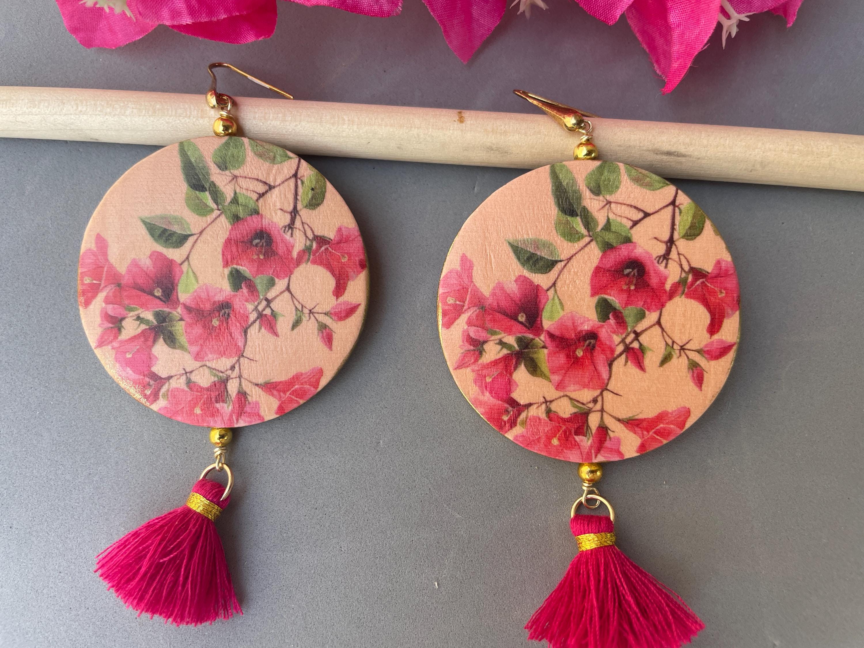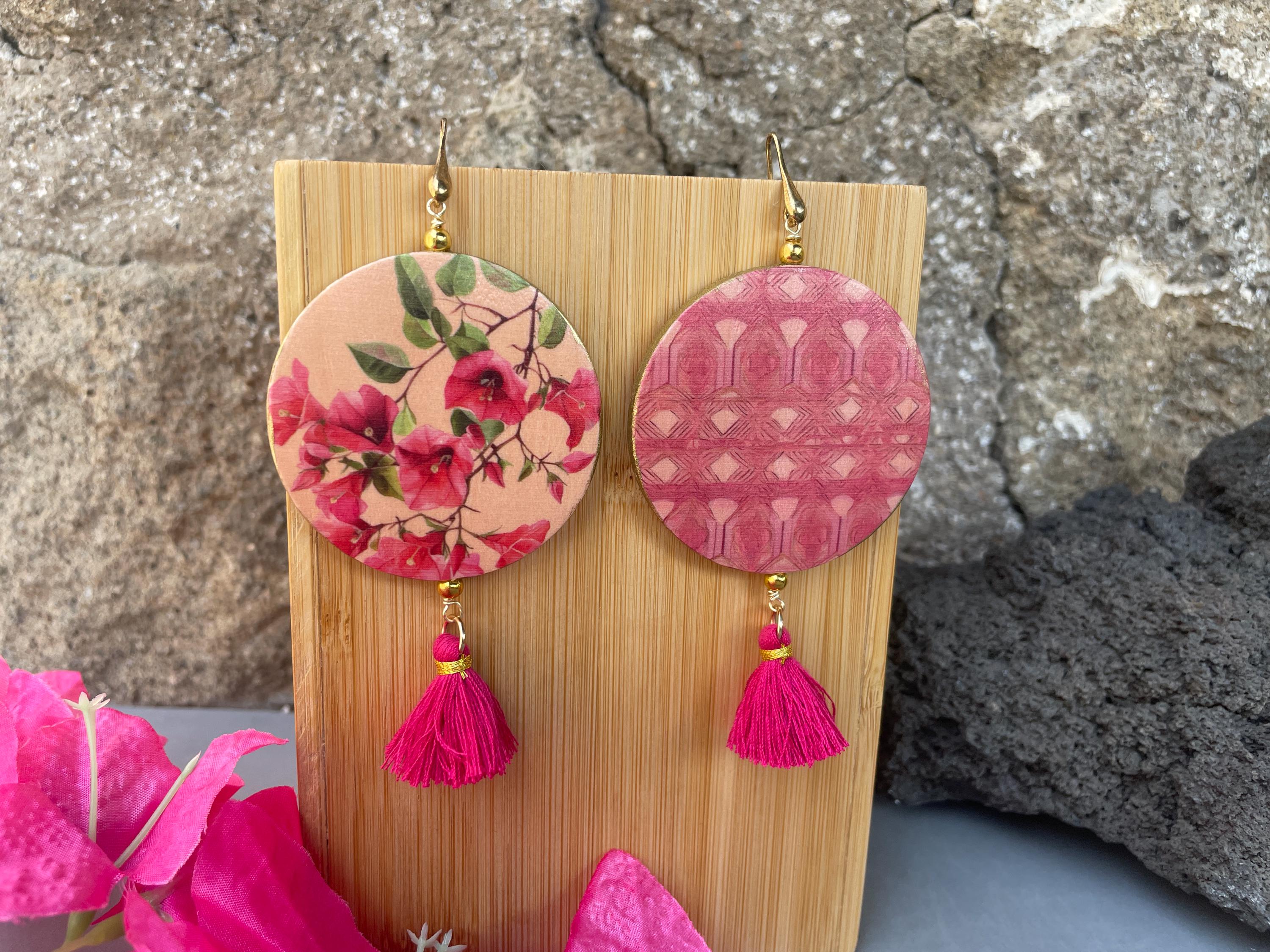 Orecchini siciliani della Collezione “Fiori di Sicilia” con gancio argento 925, raffiguranti Bouganvillea su fondo rosa, double-face.
