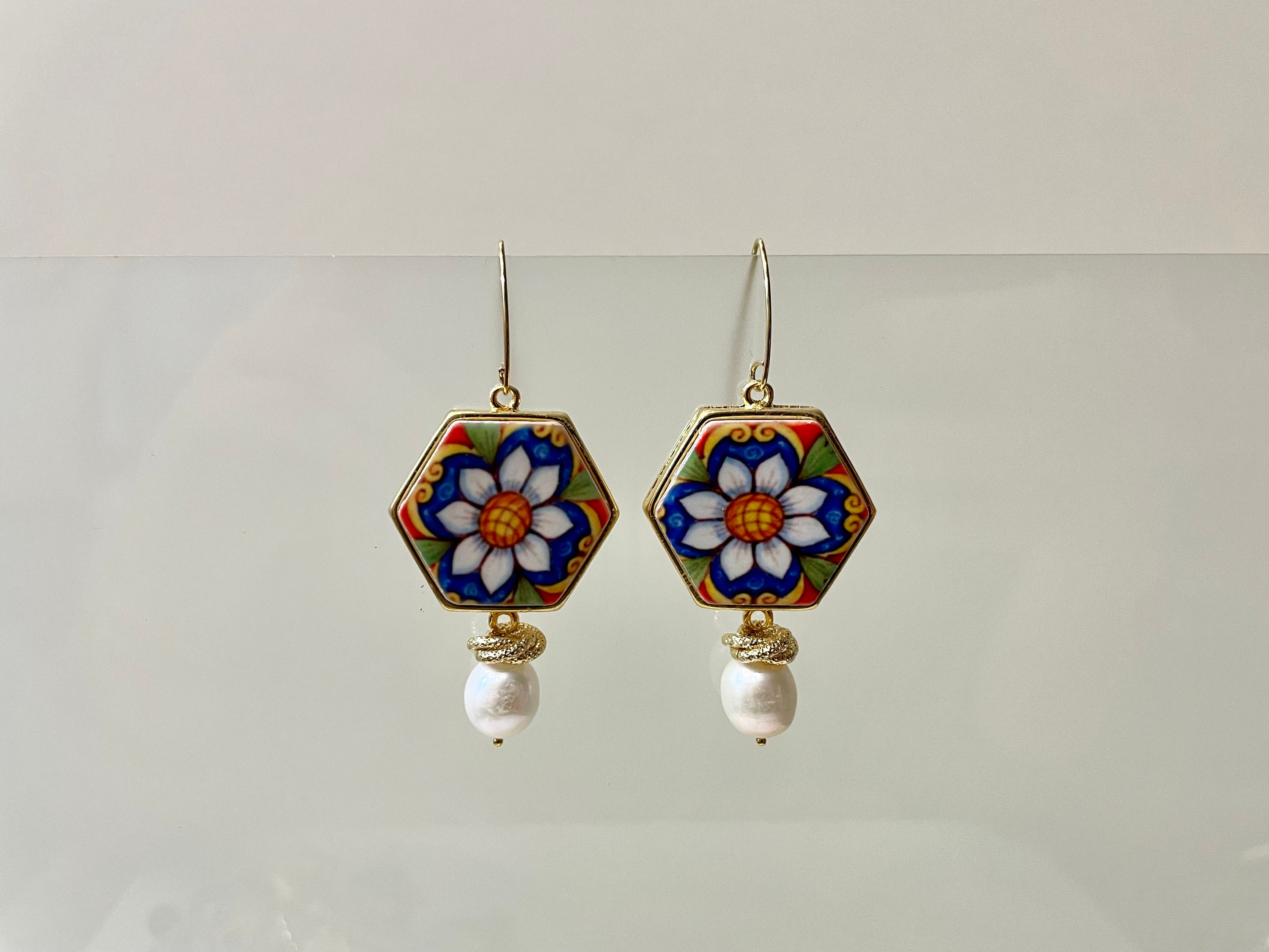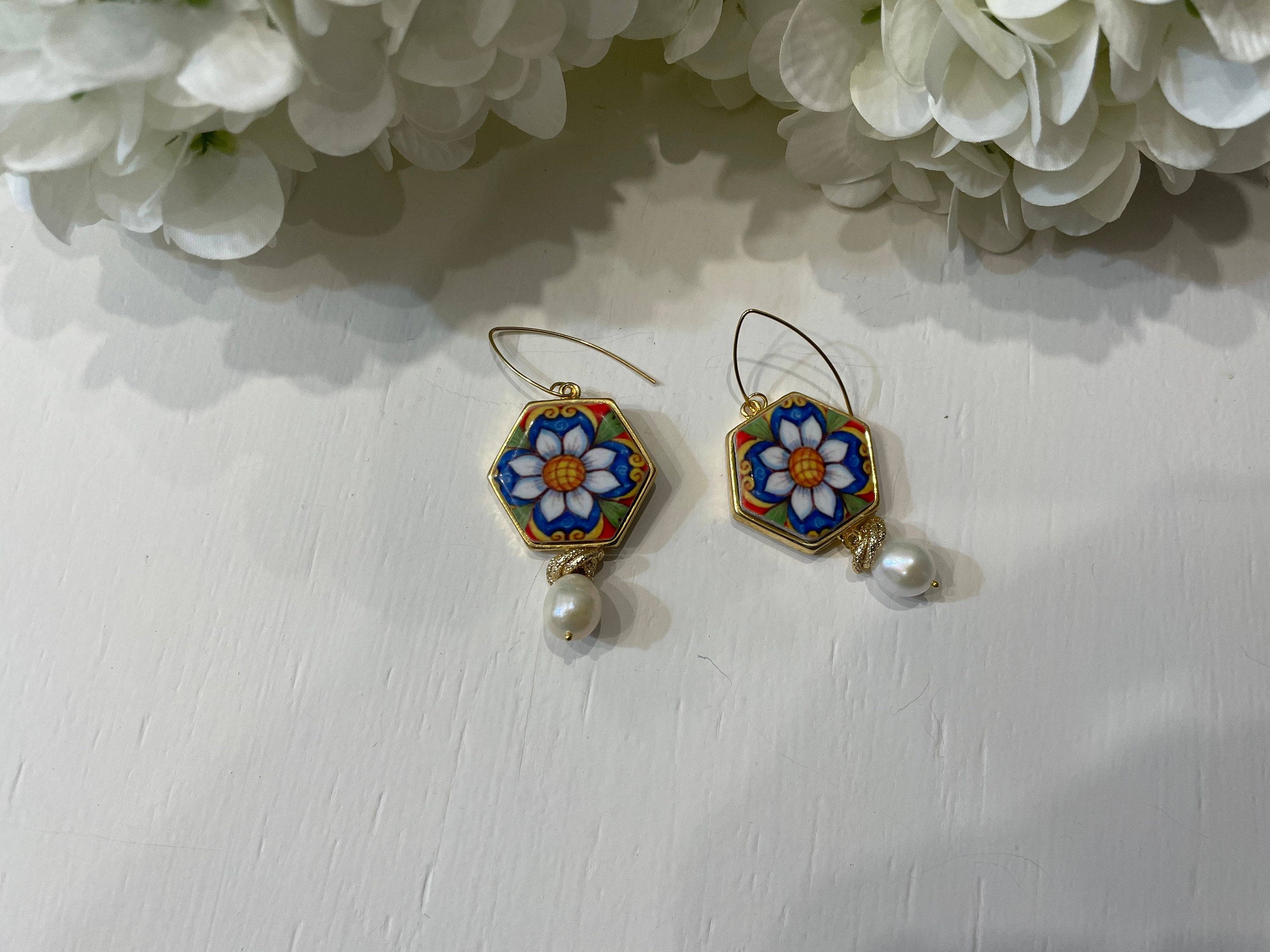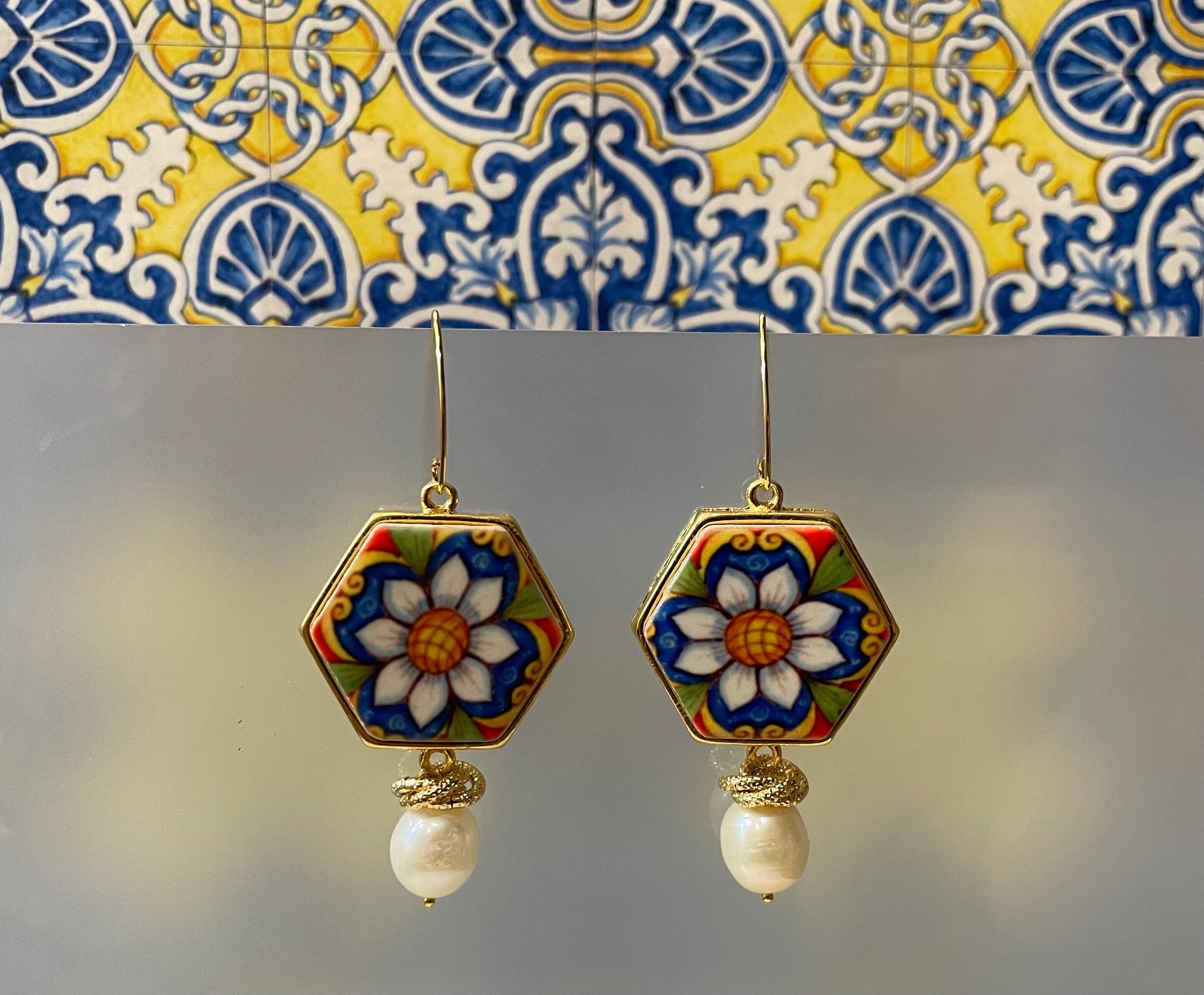Delicati orecchini siciliani fatti a mano, con gancio ovale in Ottone e Mattonella esagonale in Ceramica di Caltagirone.