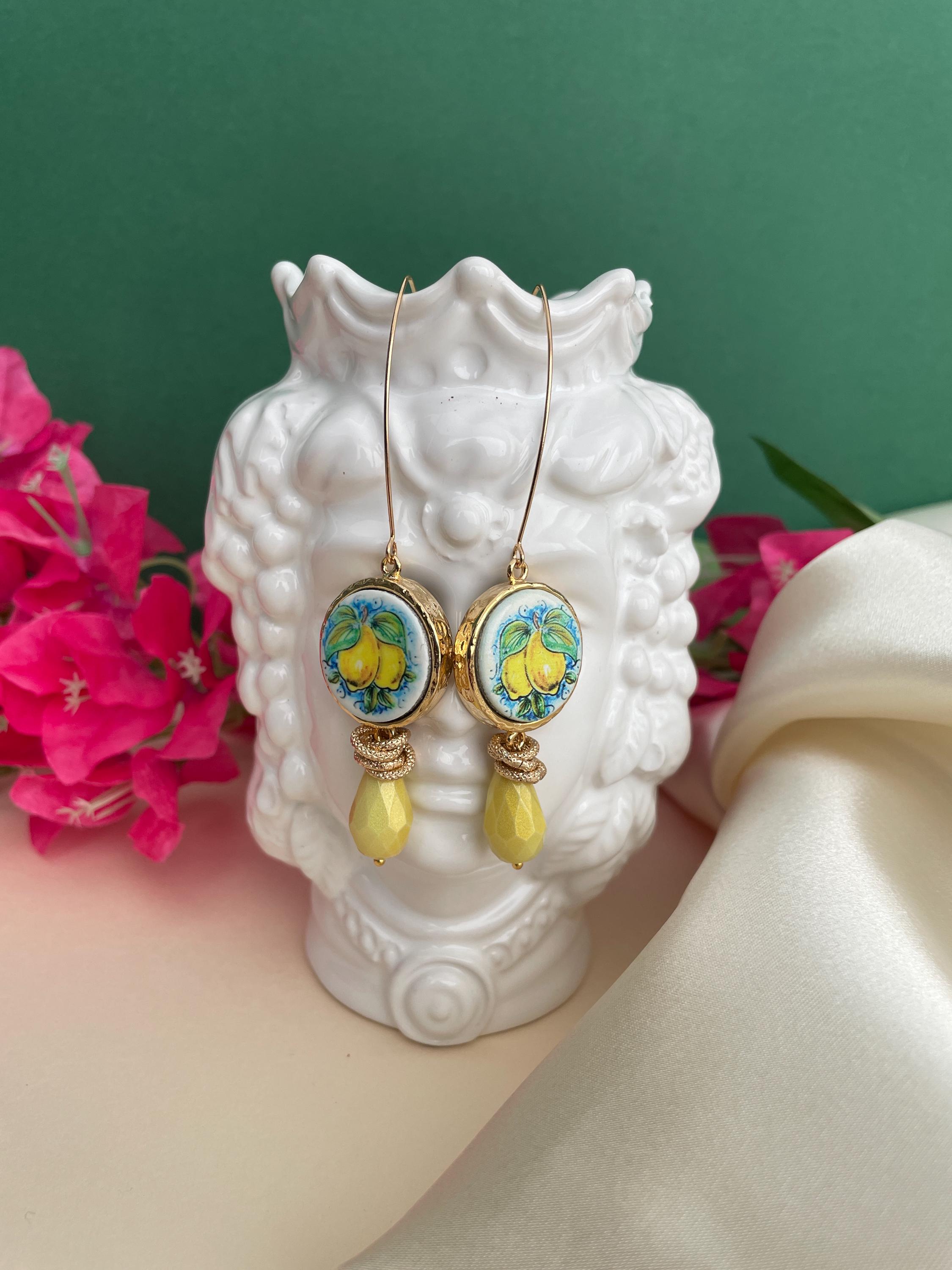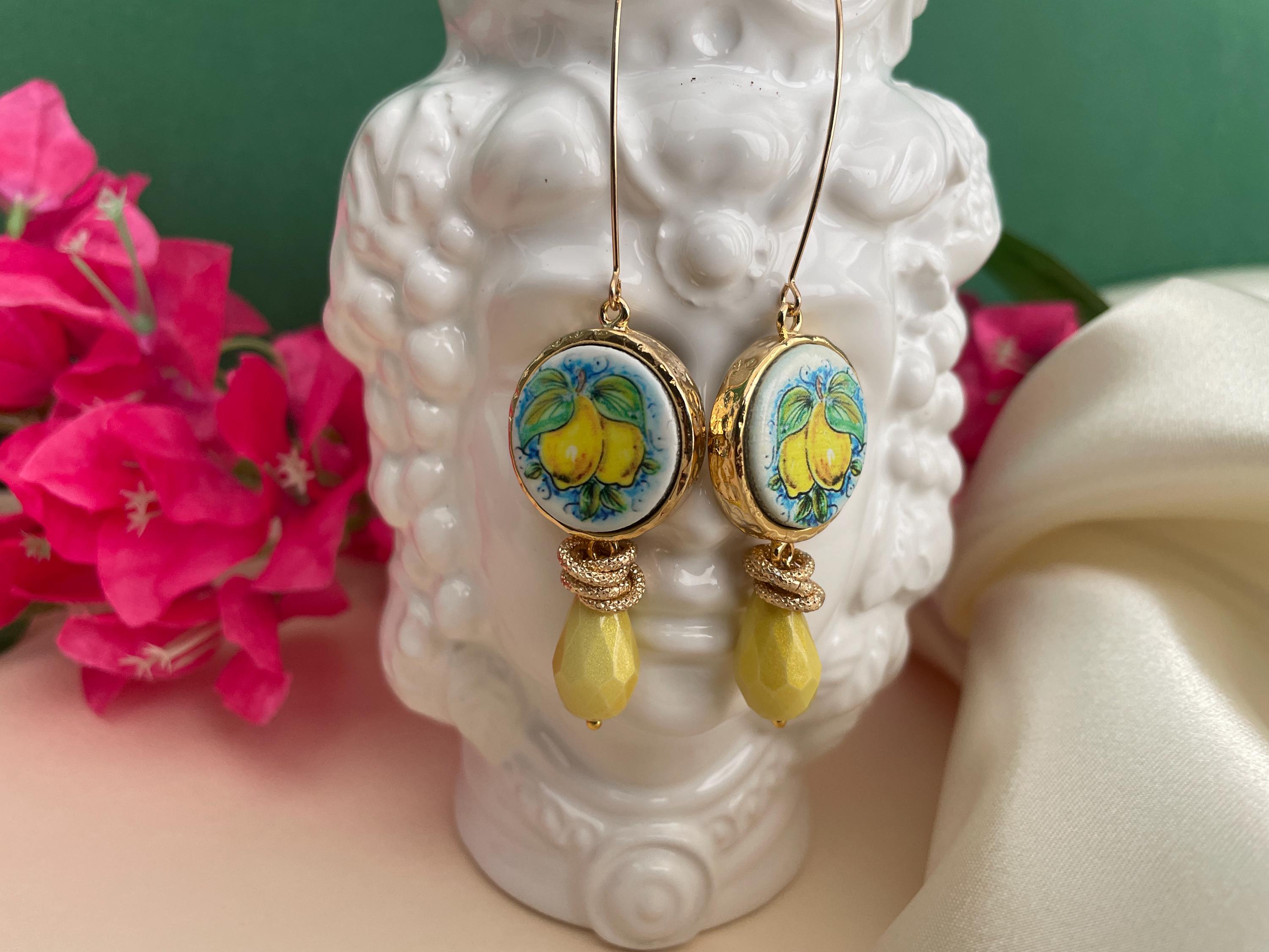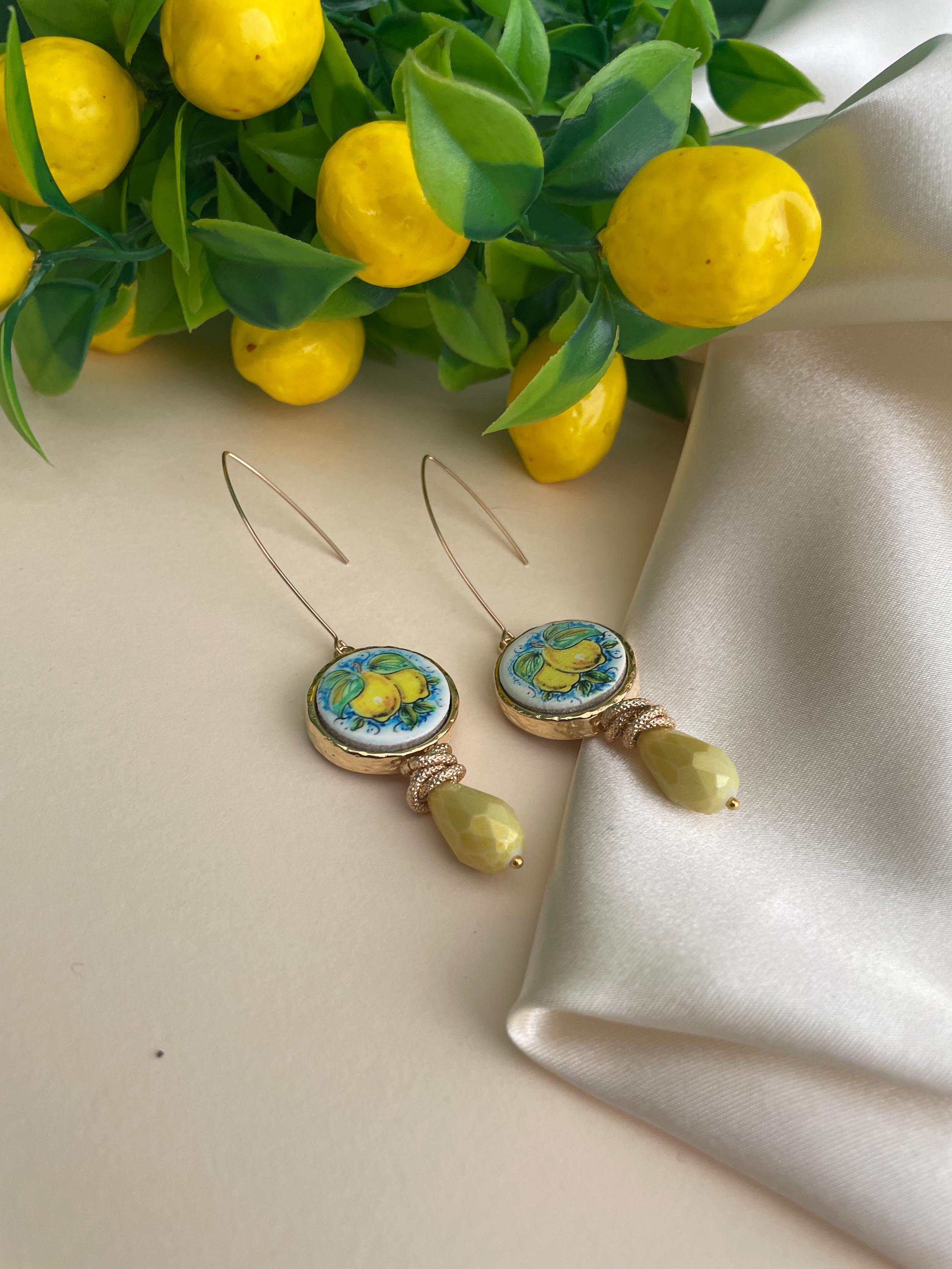 Orecchini siciliani realizzati con gancio ovale in Ottone e Mattonelle rotonda in Ceramica di Caltagirone che raffigura Limoni siciliani.