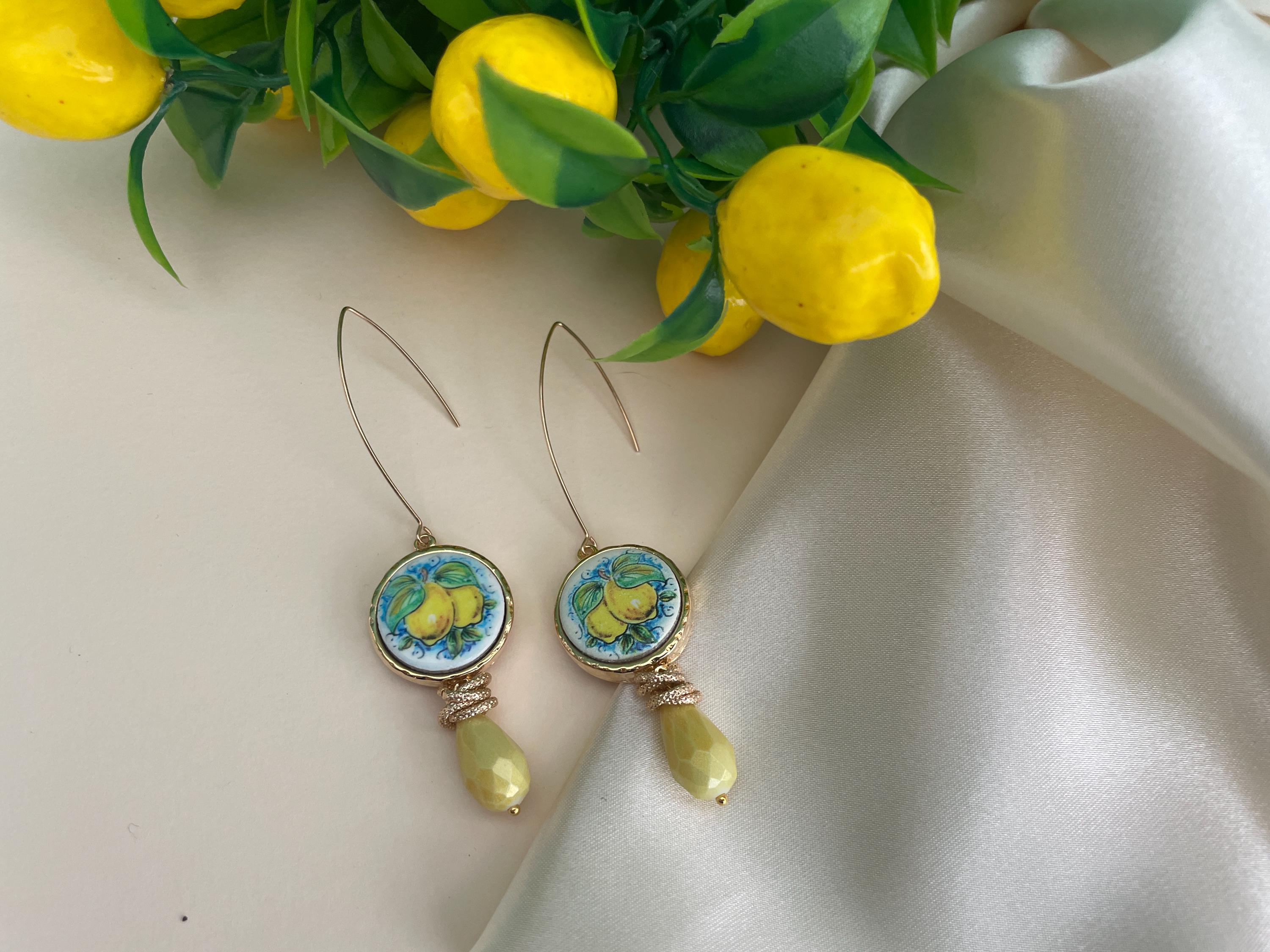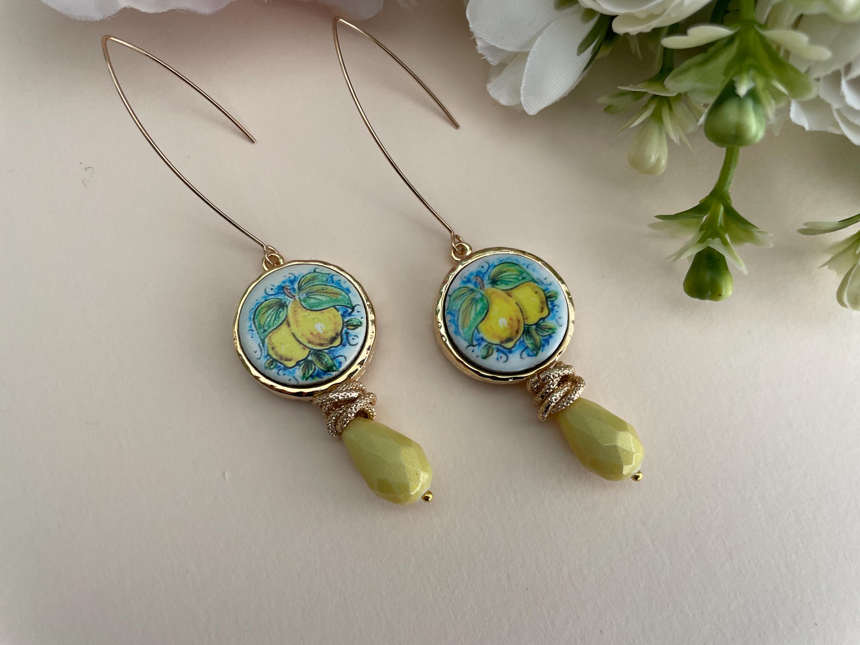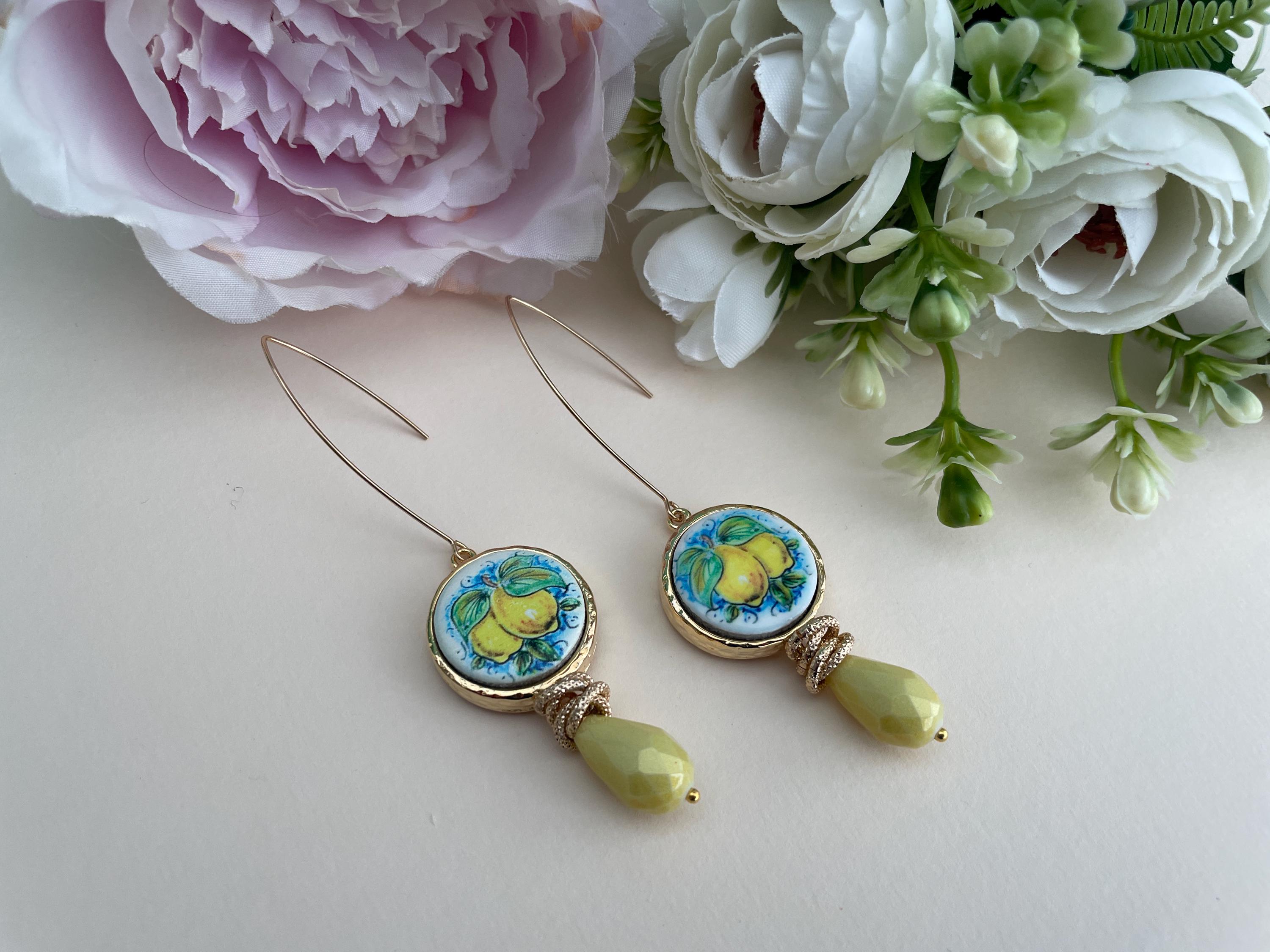 Orecchini siciliani realizzati con gancio ovale in Ottone e Mattonelle rotonda in Ceramica di Caltagirone che raffigura Limoni siciliani.