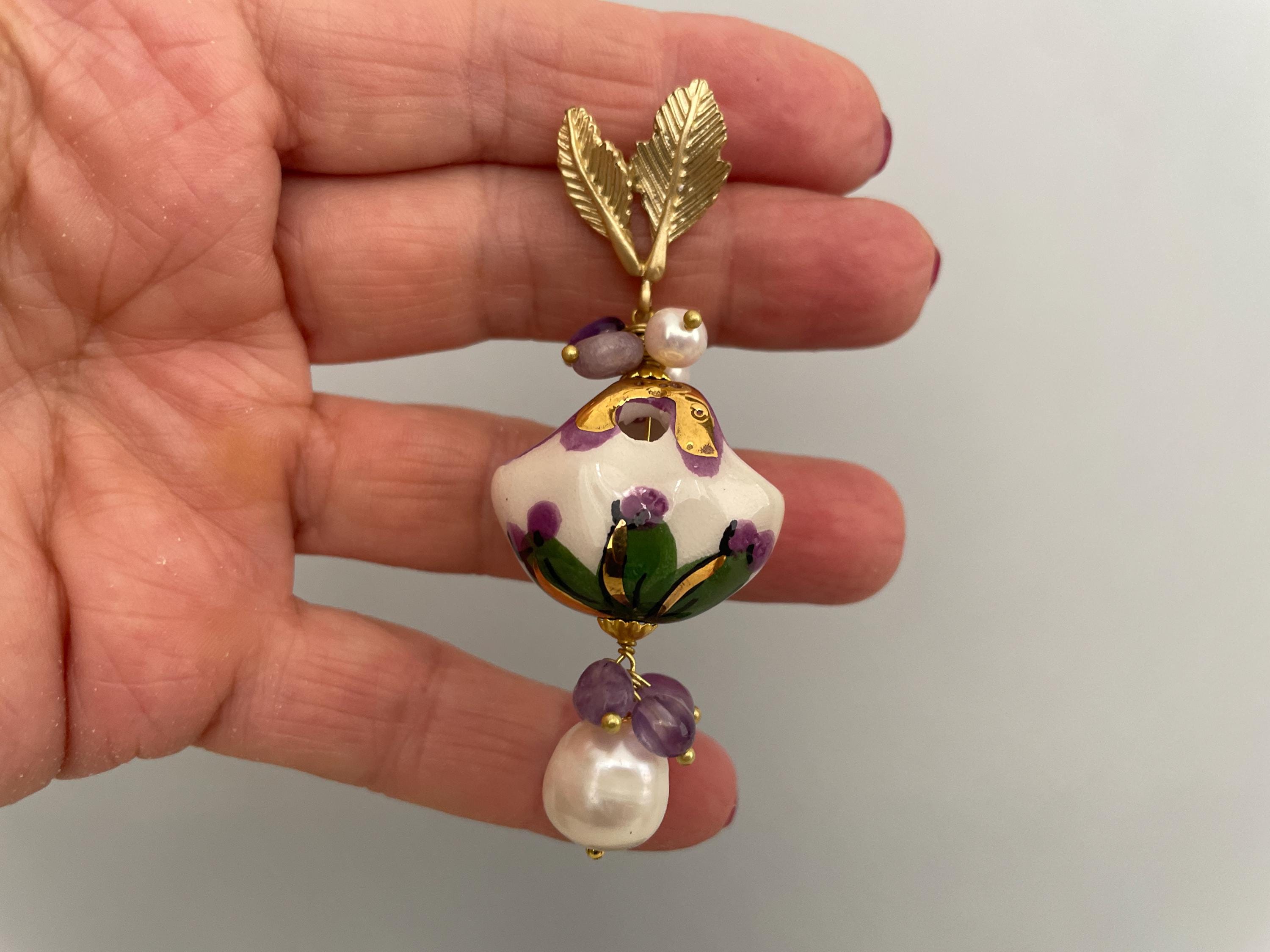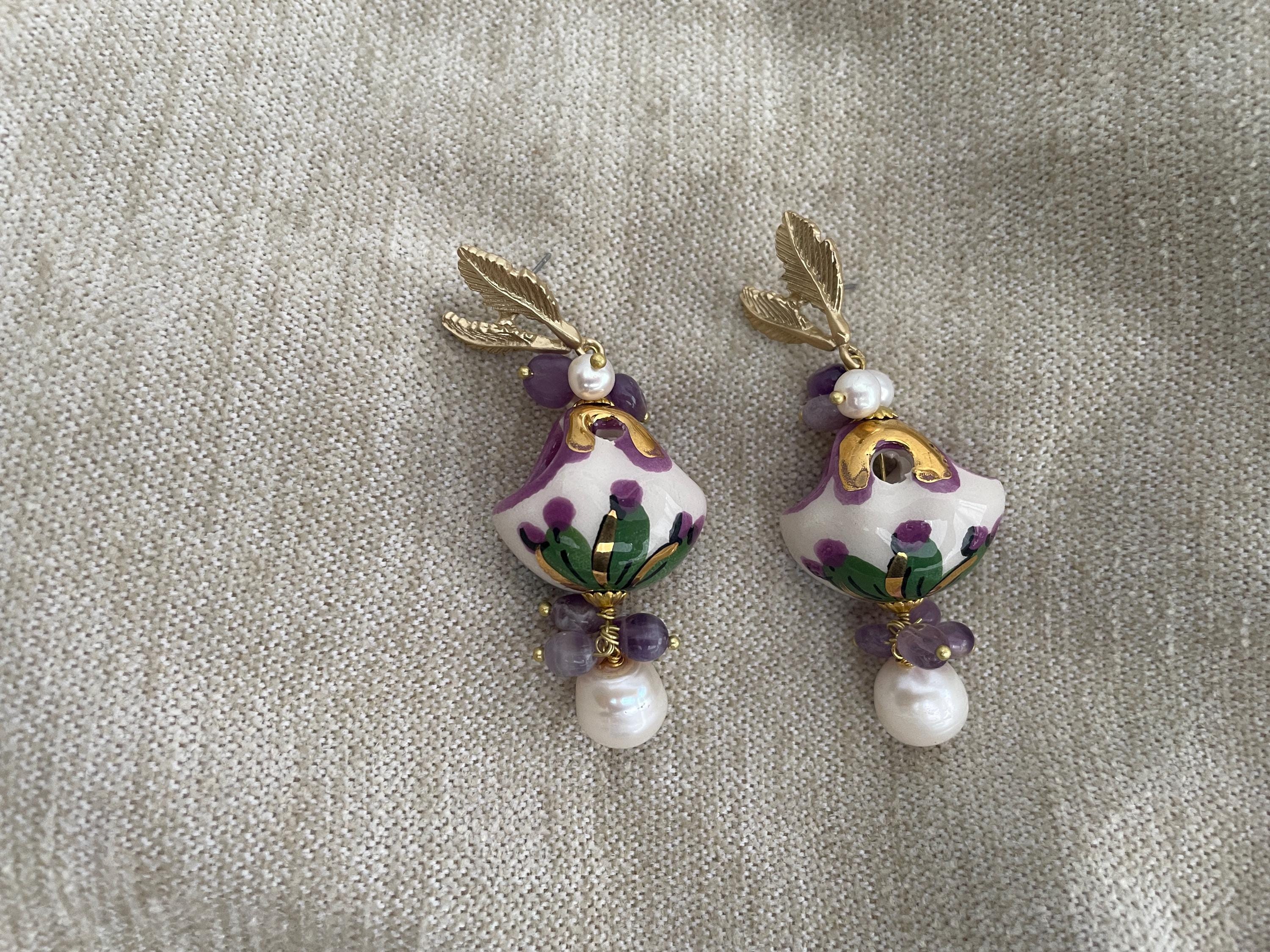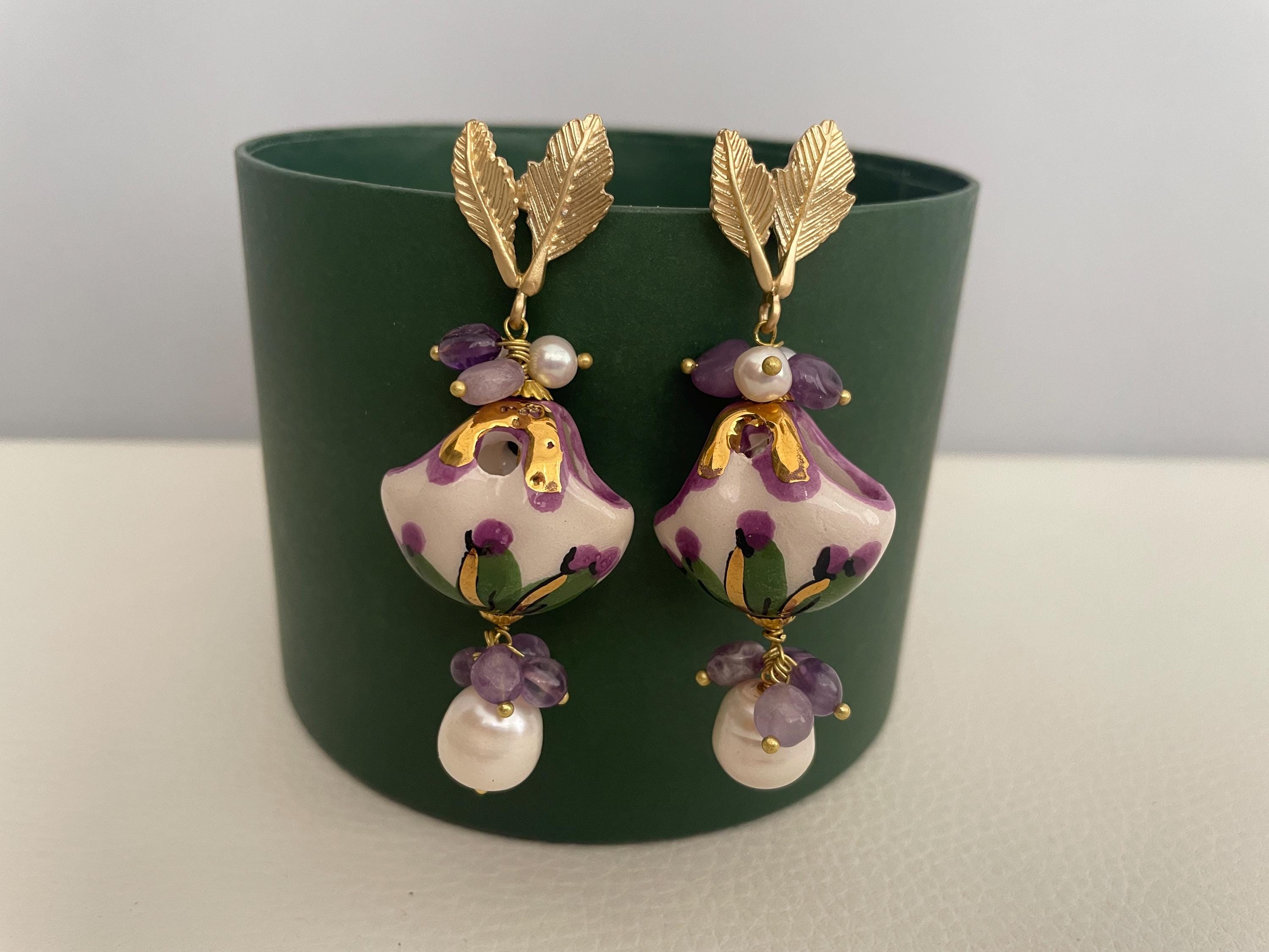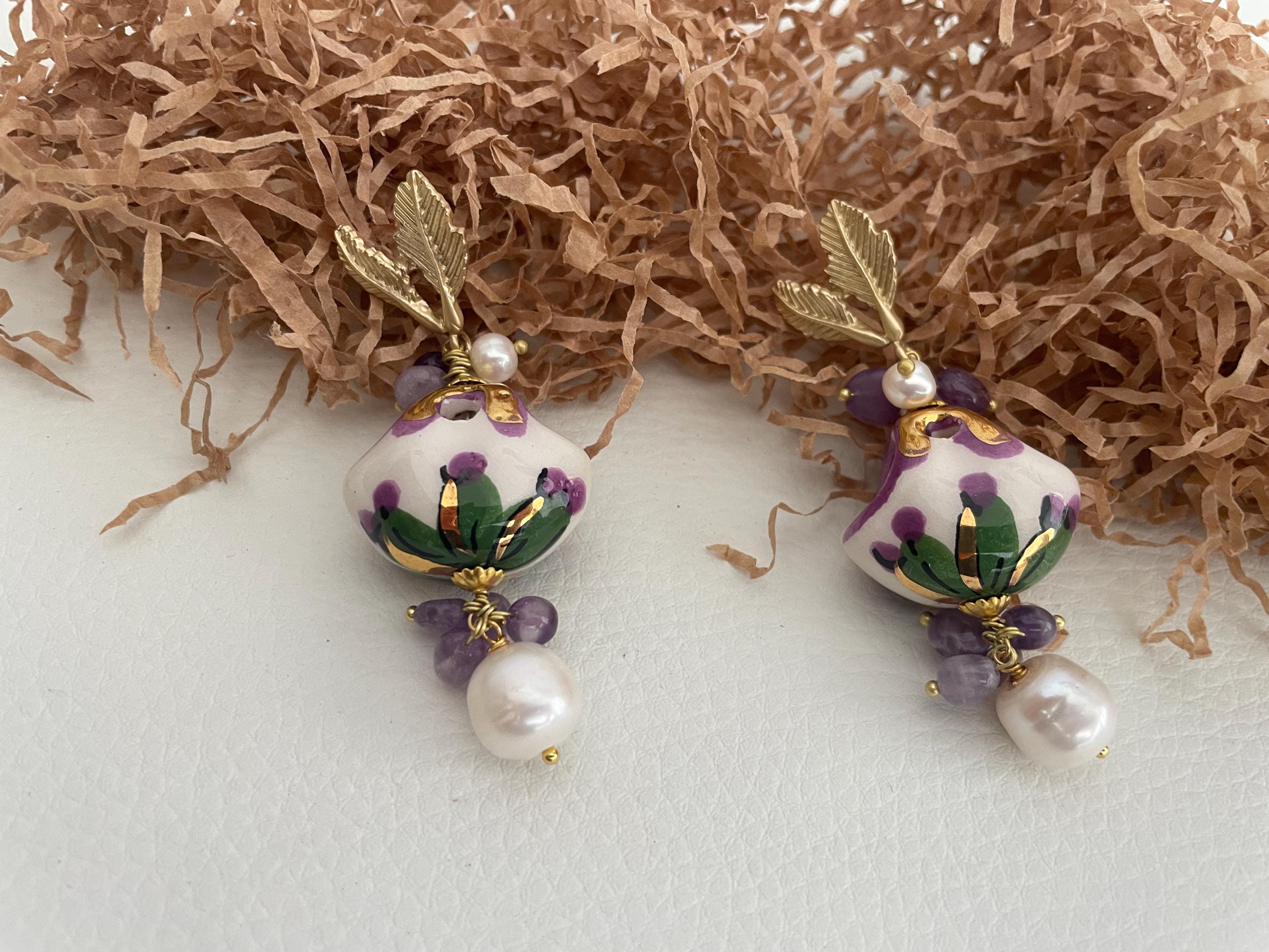 Una borsetta tipica siciliana in ceramica di Caltagirone dipinta a mano con grappoli di sassi di Ametista e perle di fiume e, pendente, una bella perla barocca.