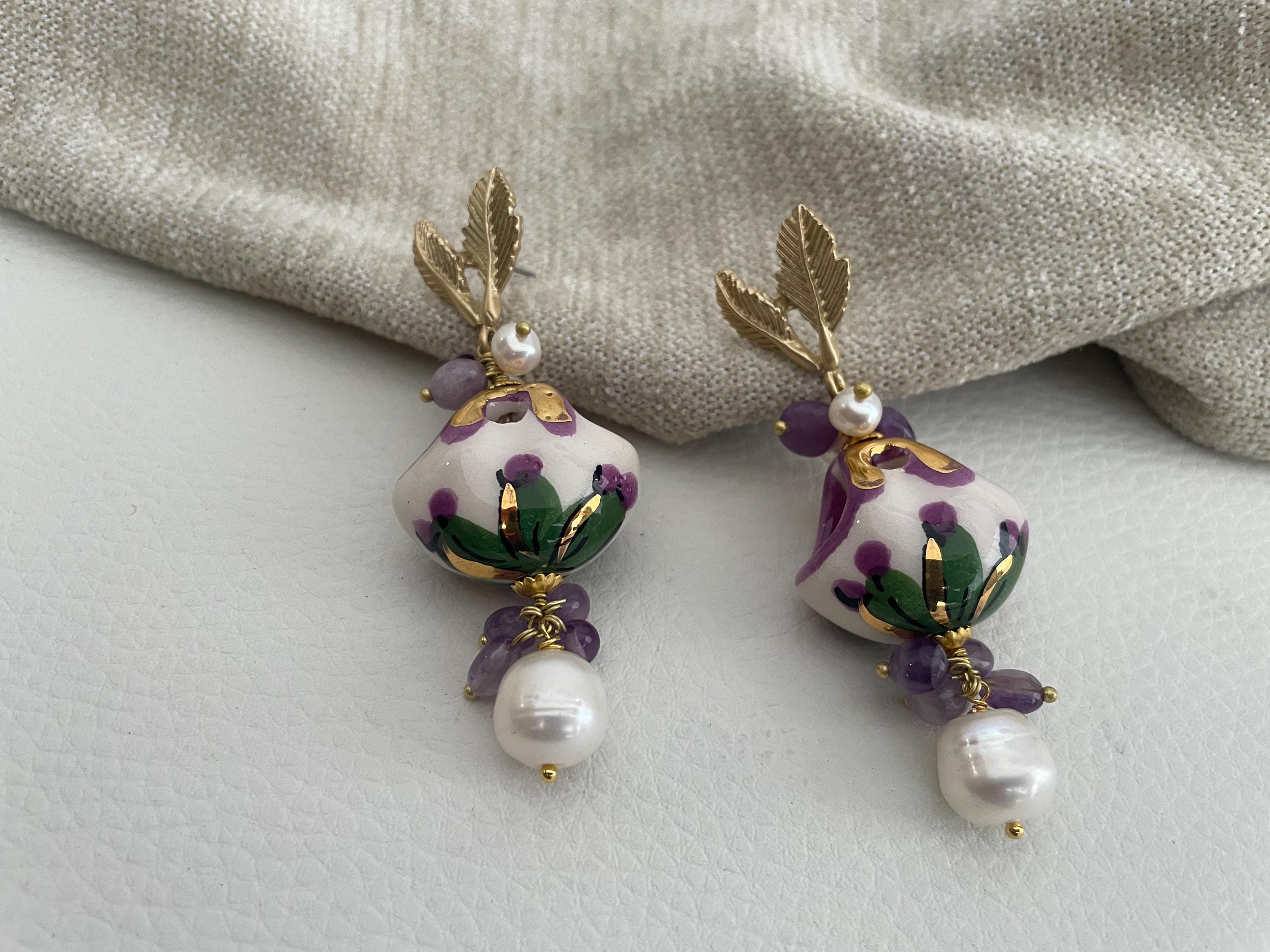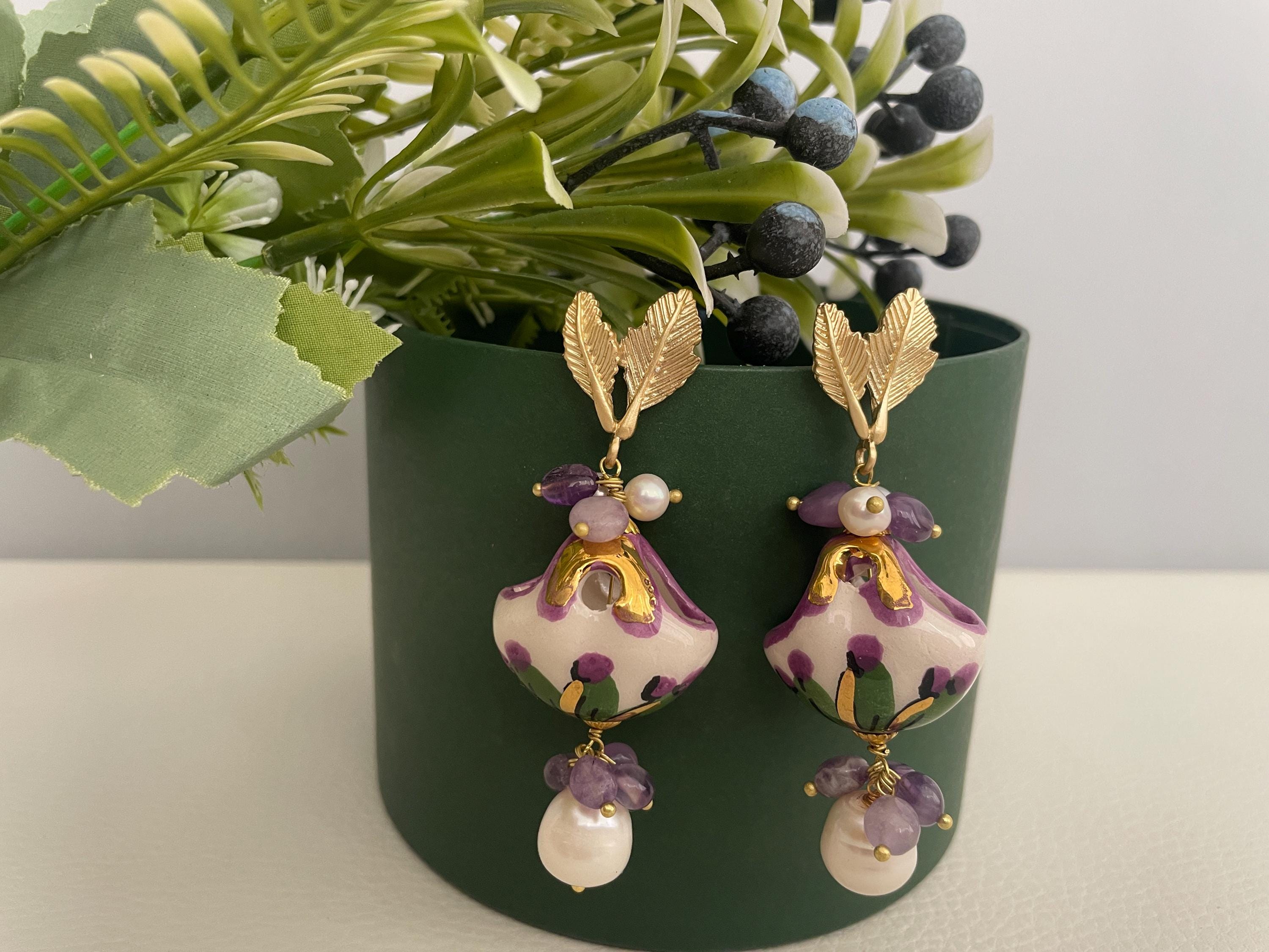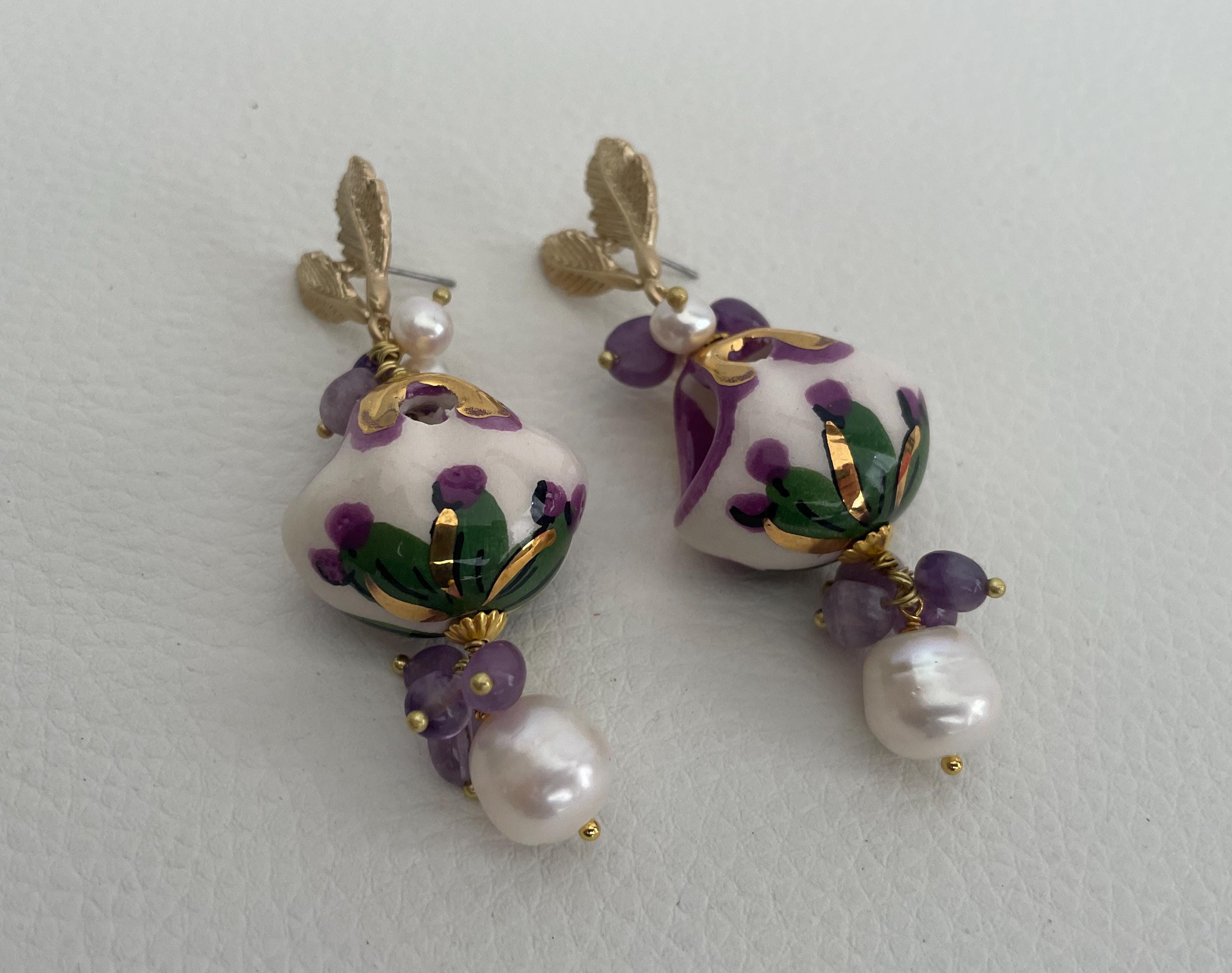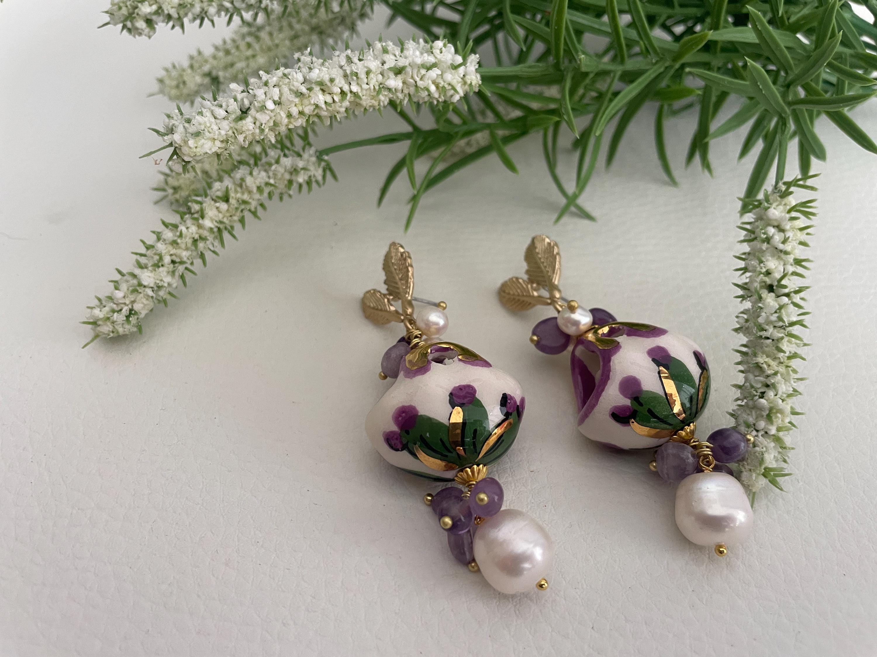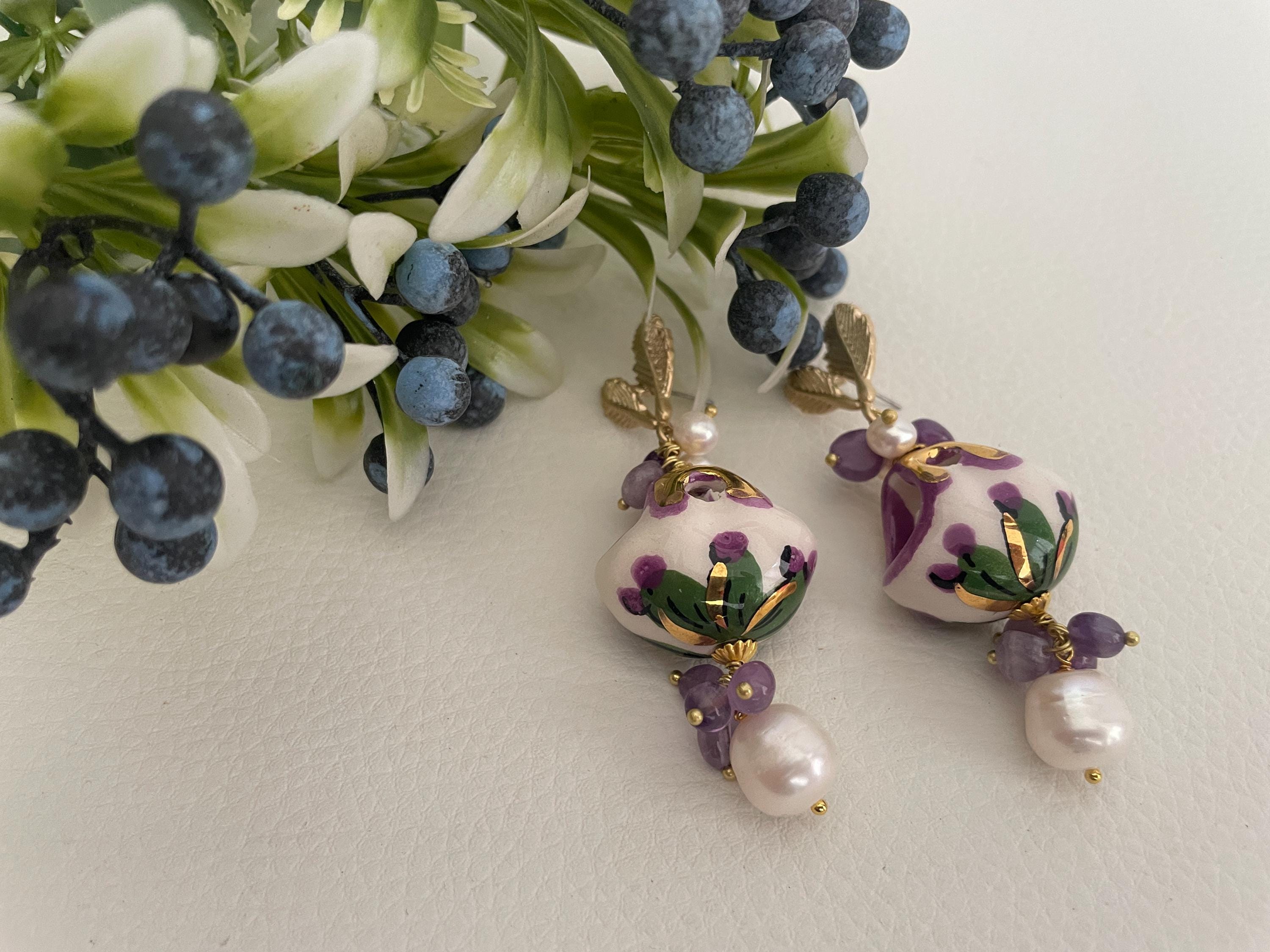 Una borsetta tipica siciliana in ceramica di Caltagirone dipinta a mano con grappoli di sassi di Ametista e perle di fiume e, pendente, una bella perla barocca.