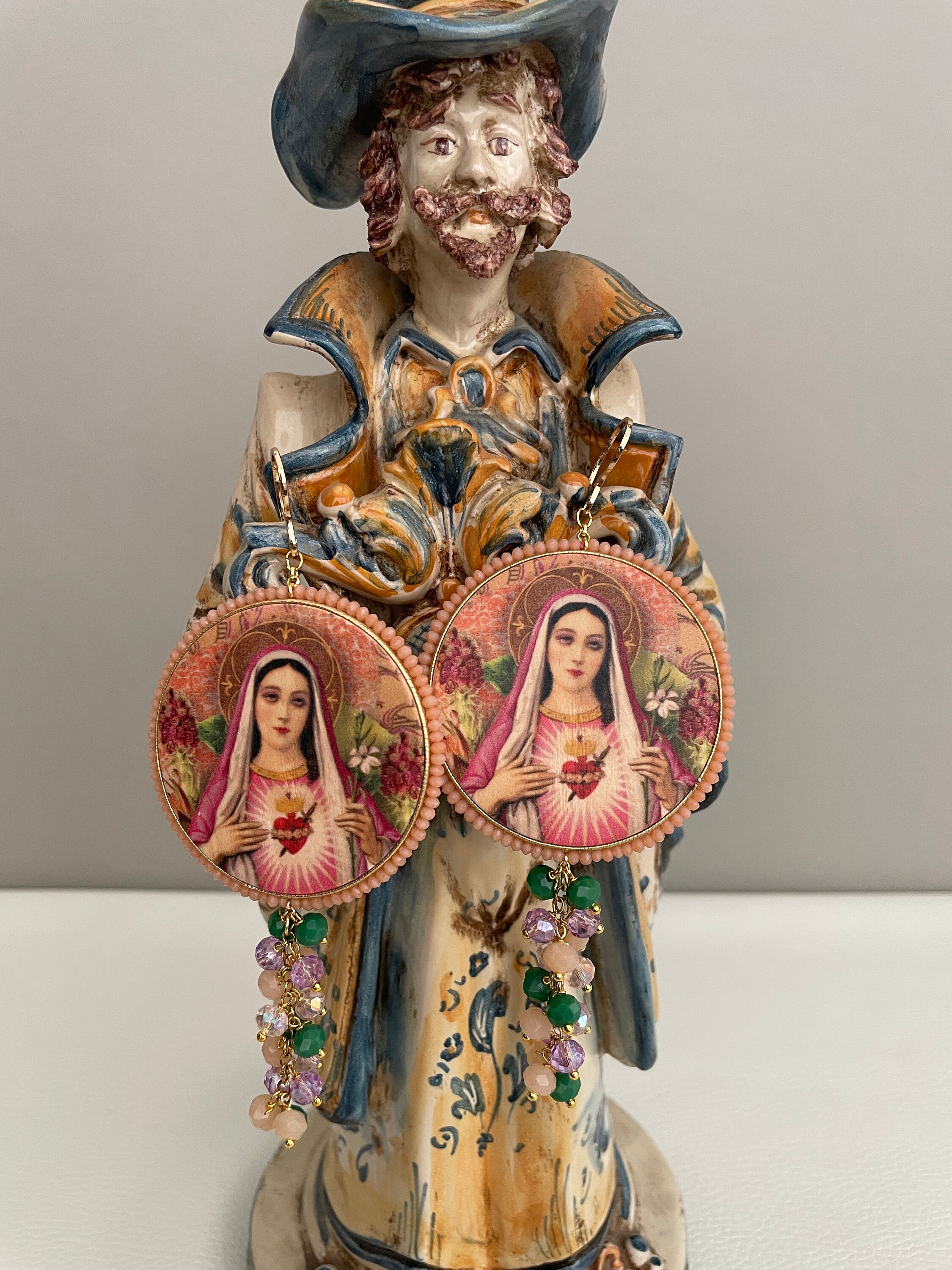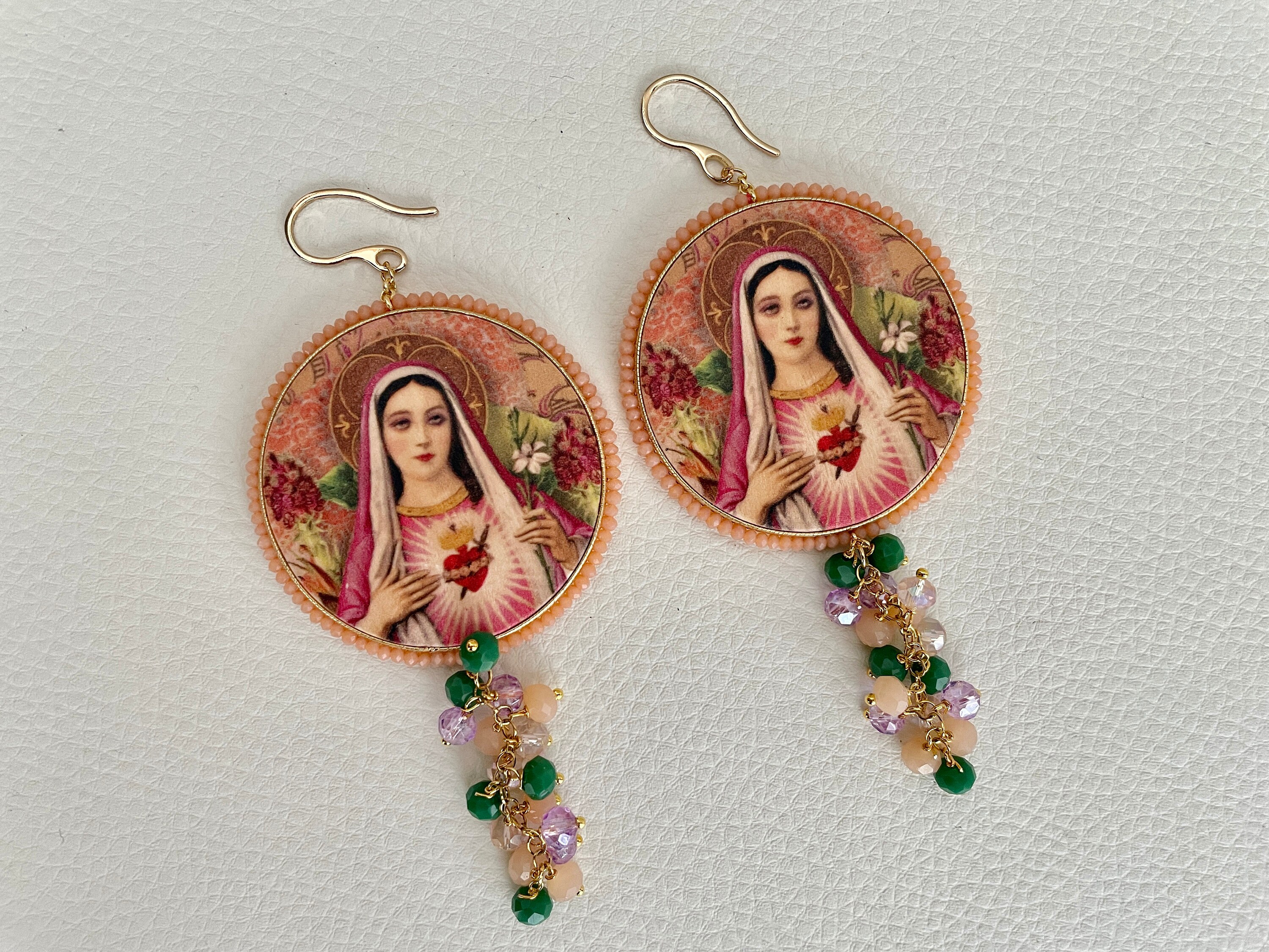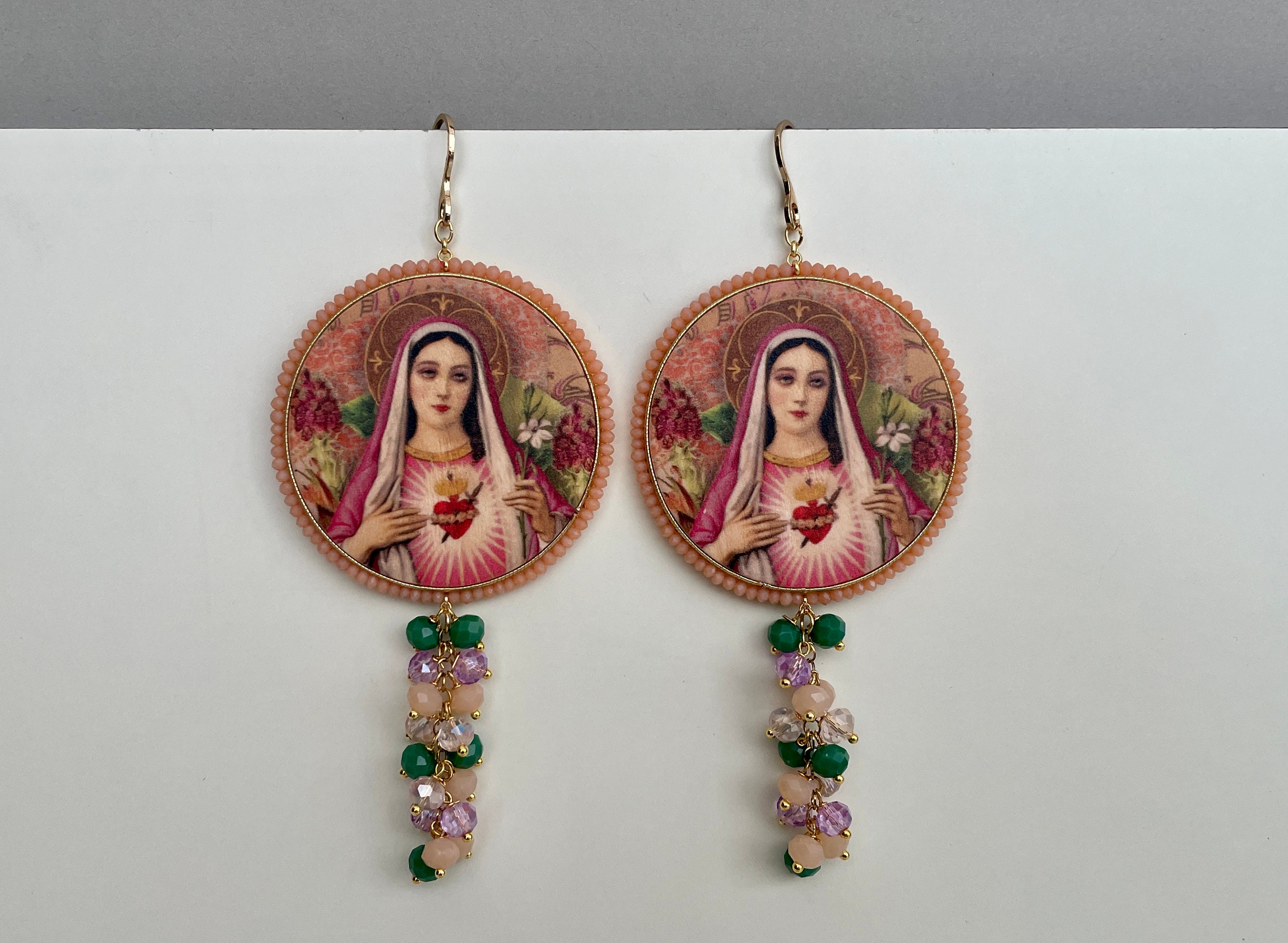 Orecchini icone POP, orecchini legno, orecchini vistosi e leggeri, Madonna del Cuore Sacro, orecchini grappolo, orecchini maxi, arte sacra.