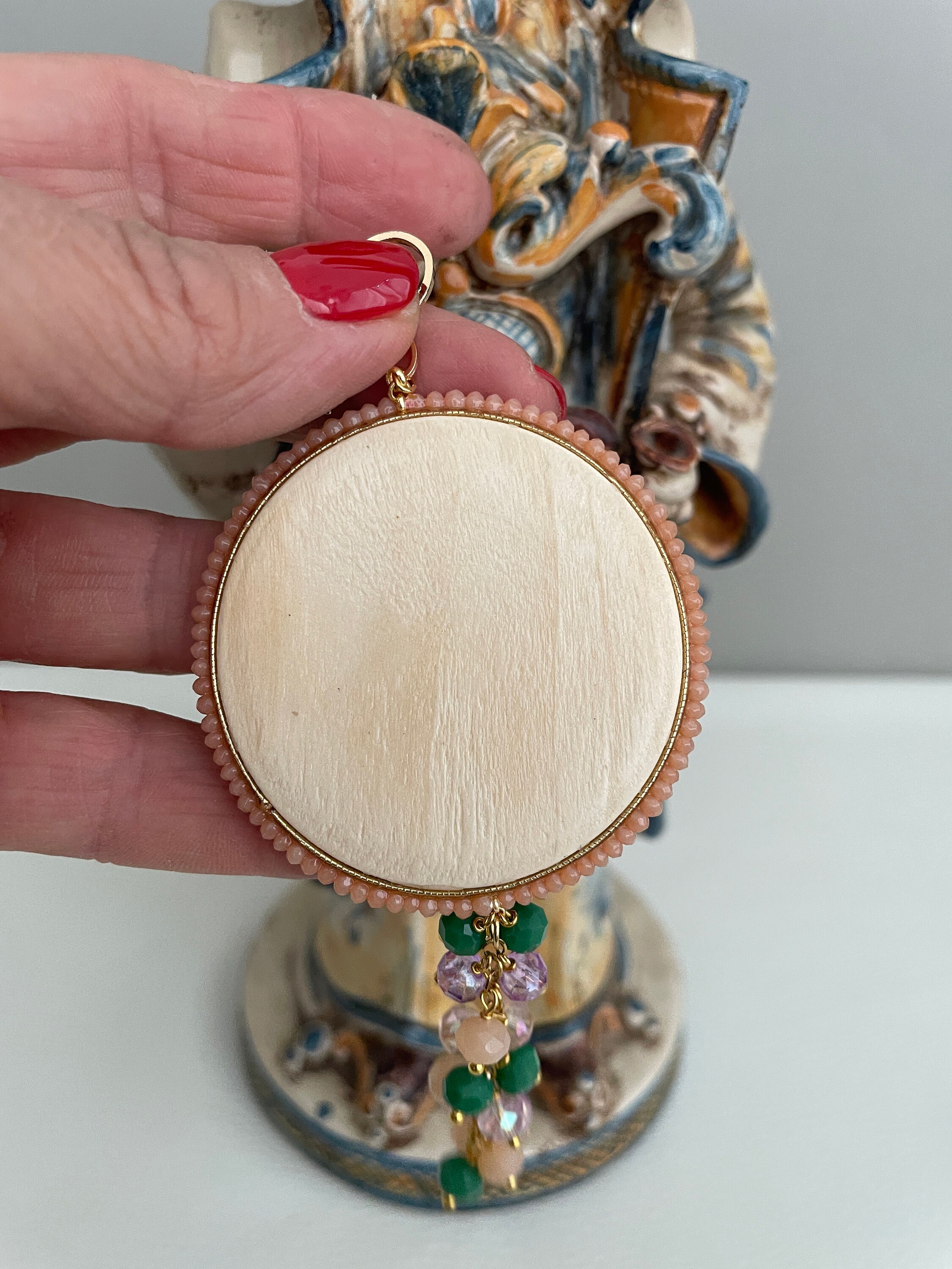 Medaglione di legno leggerissimo incorniciato da un filo di microcristalli chiari. Un lungo grappolo di cristalli assortiti pende dalla medaglia.