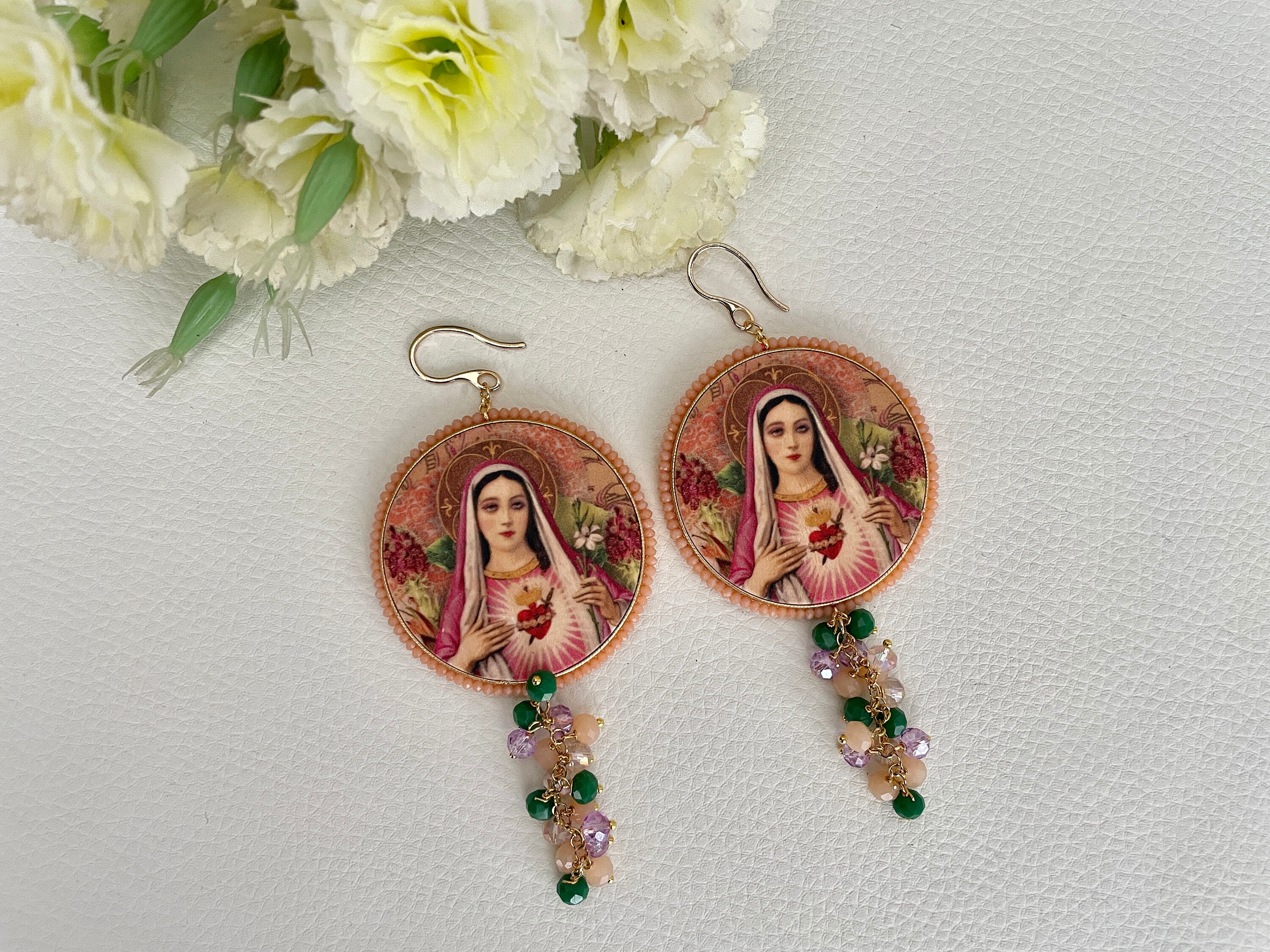 Orecchini sacri contemporanei raffiguranti in stile POP la Madonna del Cuore Sacro, icona religiosa oggetto di devozione nella religione cattolica.