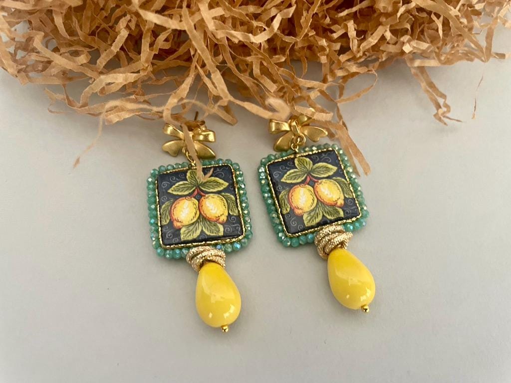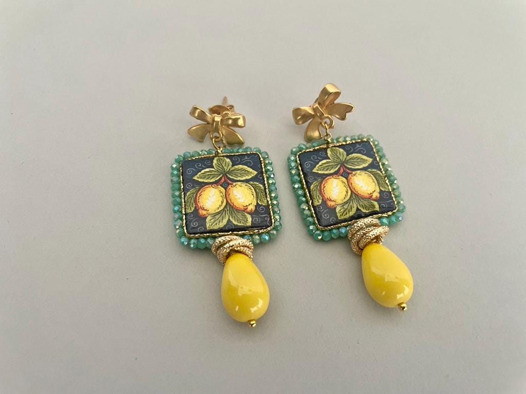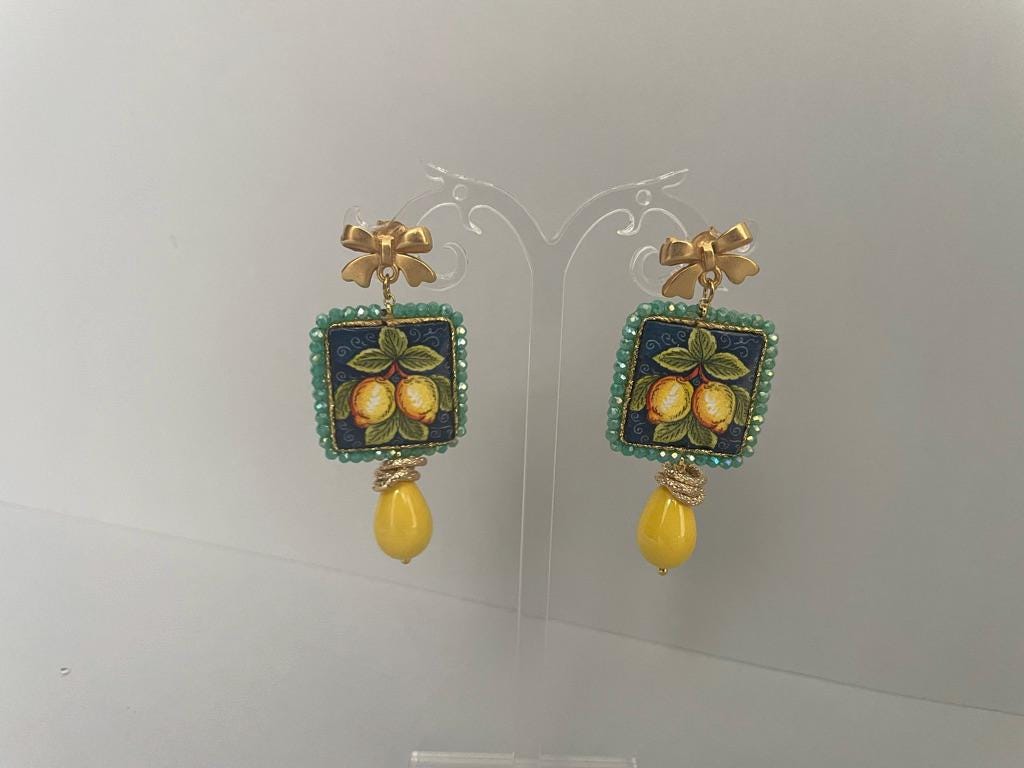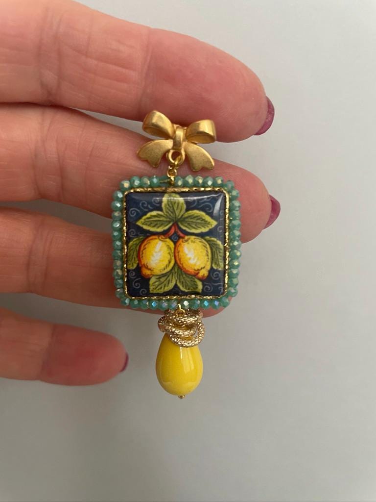 – mattonella di Ceramica di Caltagirone, su base lavica, stampata in superficie con limoni e incorniciata da filo di microcristalli;