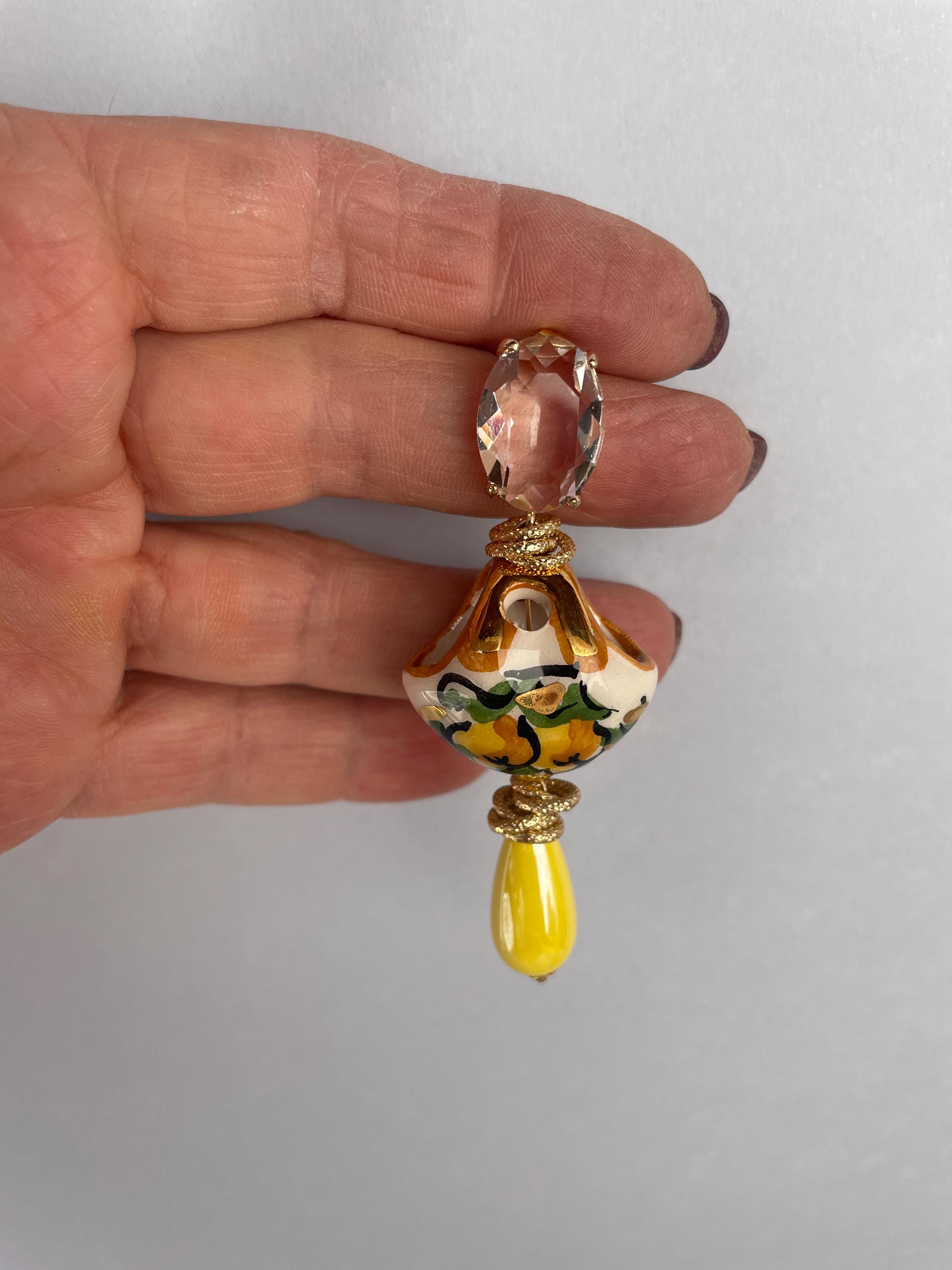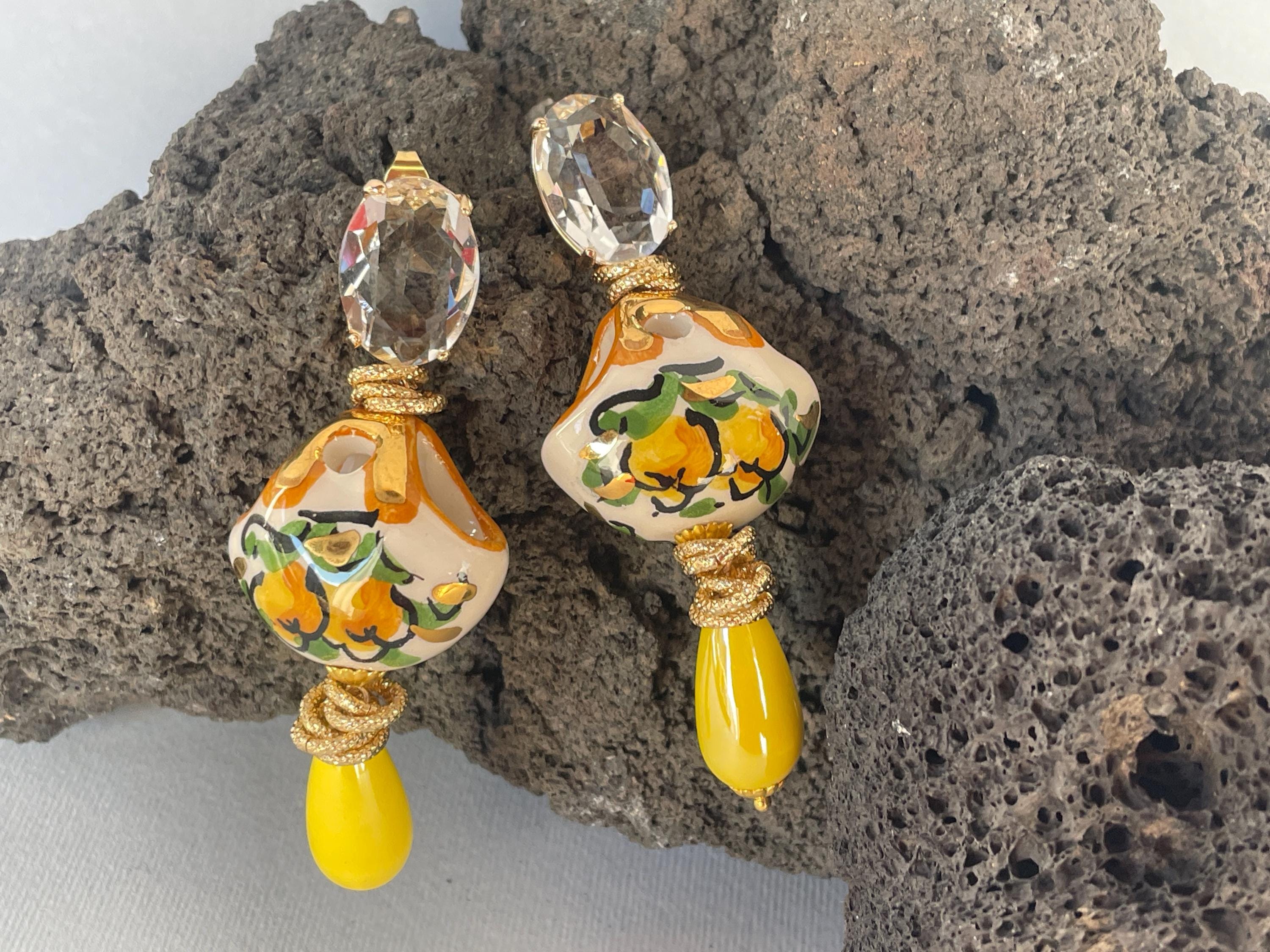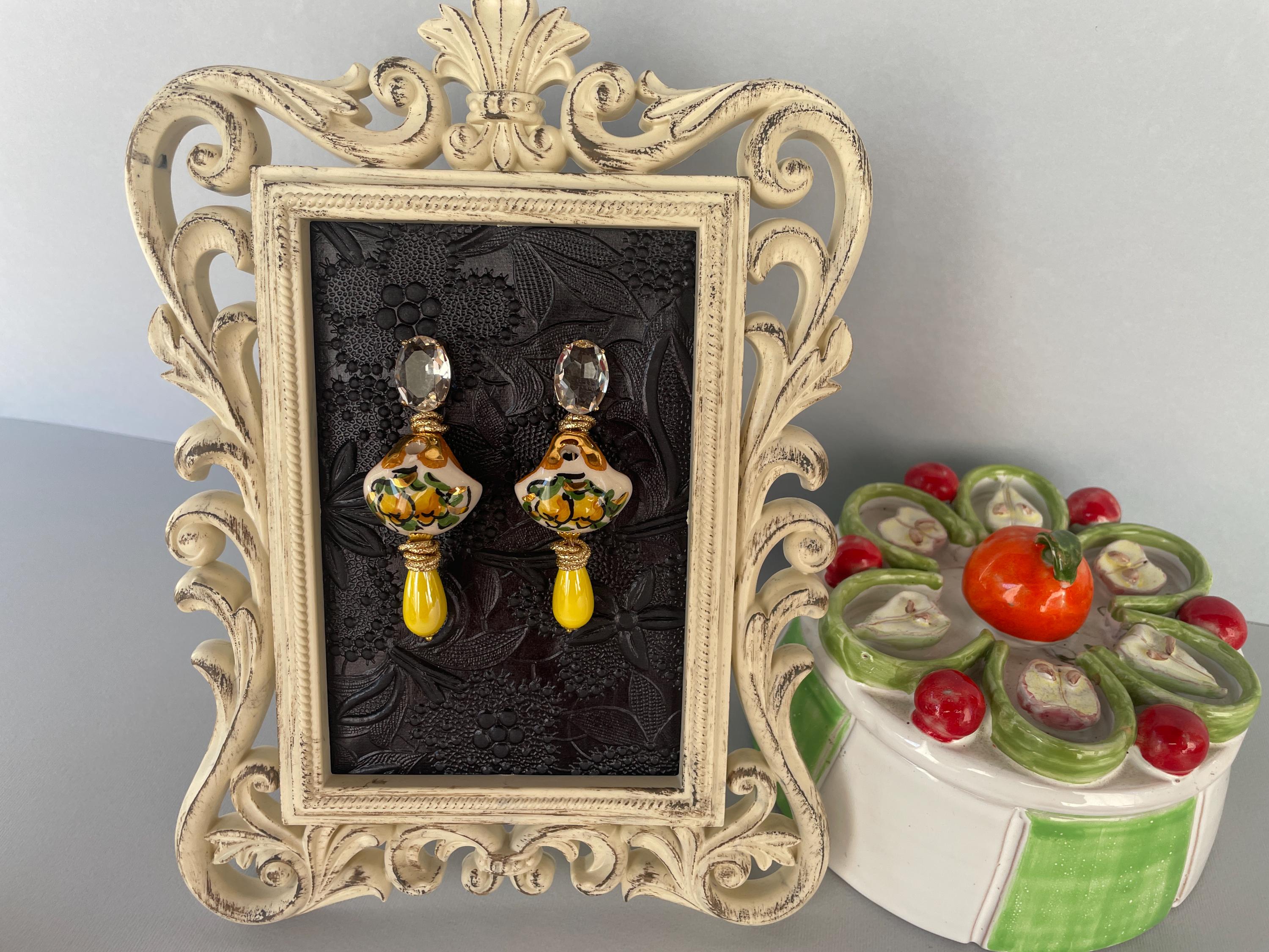 Realizzati con Cristalli ovali incolore montati su castone di ottone a perno, una splendida borsetta di Caltagirone, tipica della tradizione siciliana e dipinta a mano con Limoni. Una perla a goccia di ceramica gialla completa l’orecchino rendendolo più luminoso.