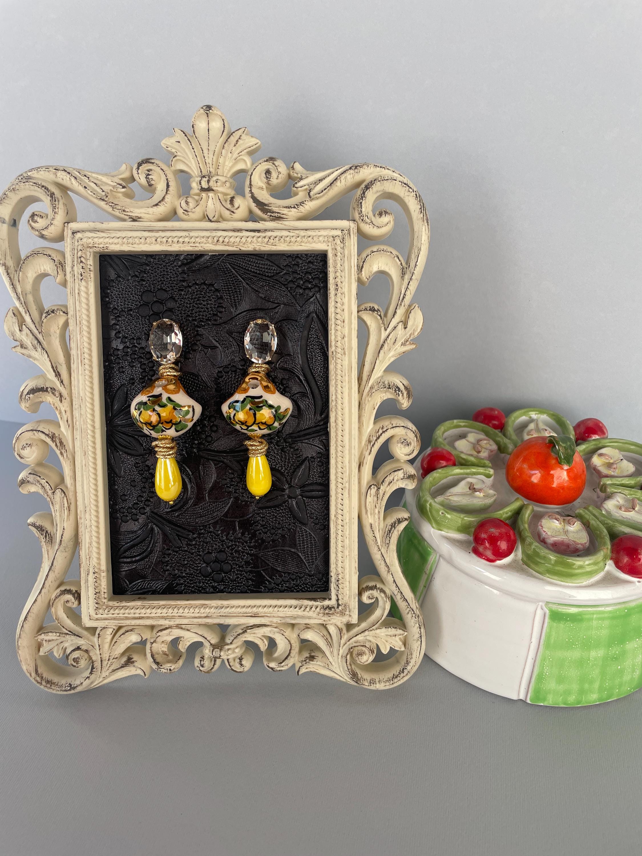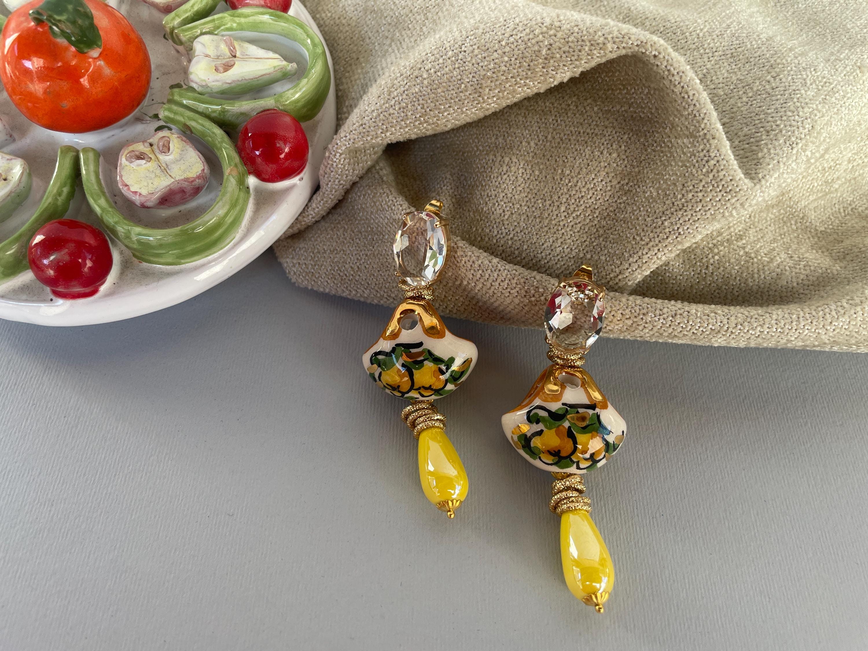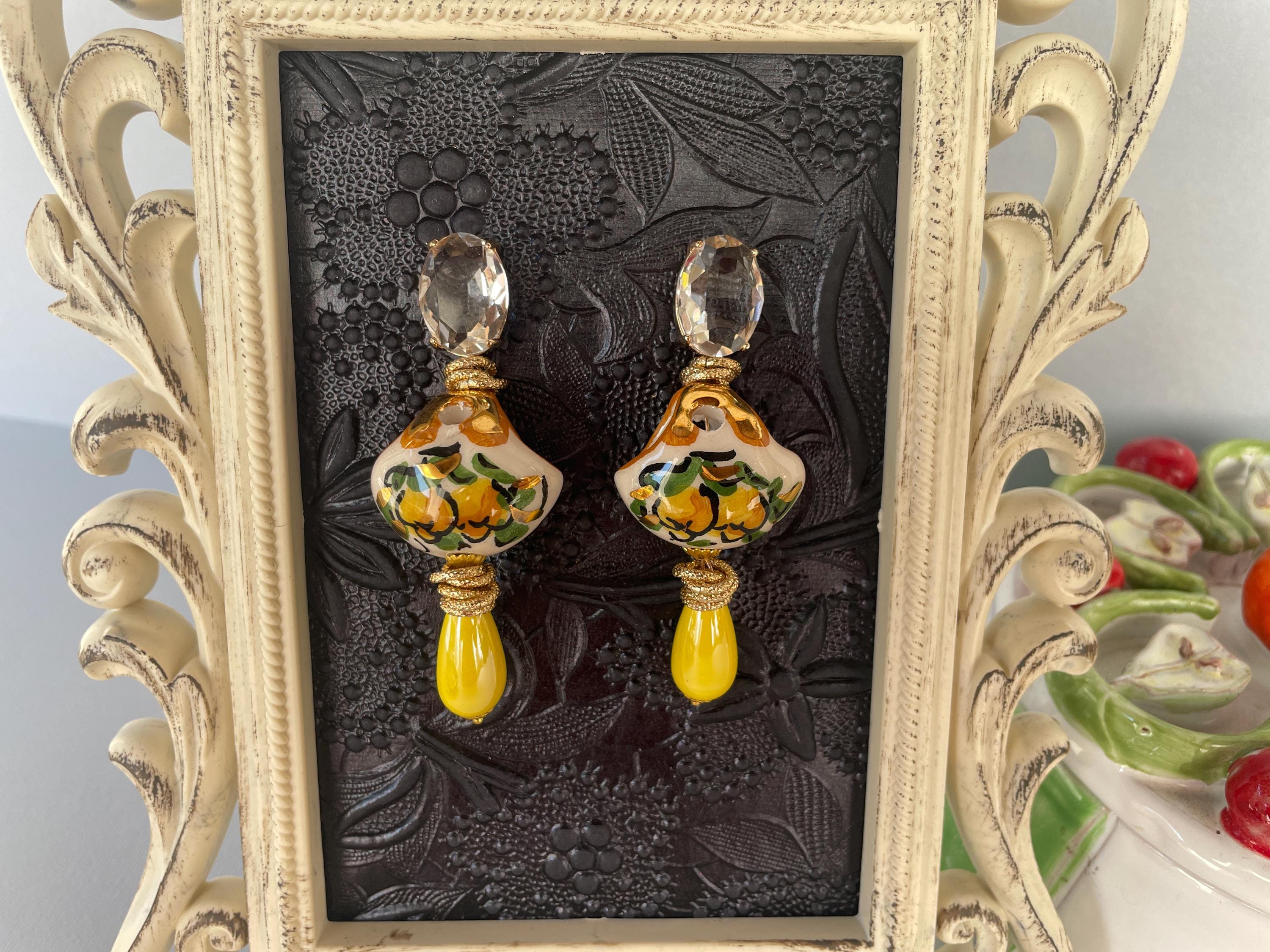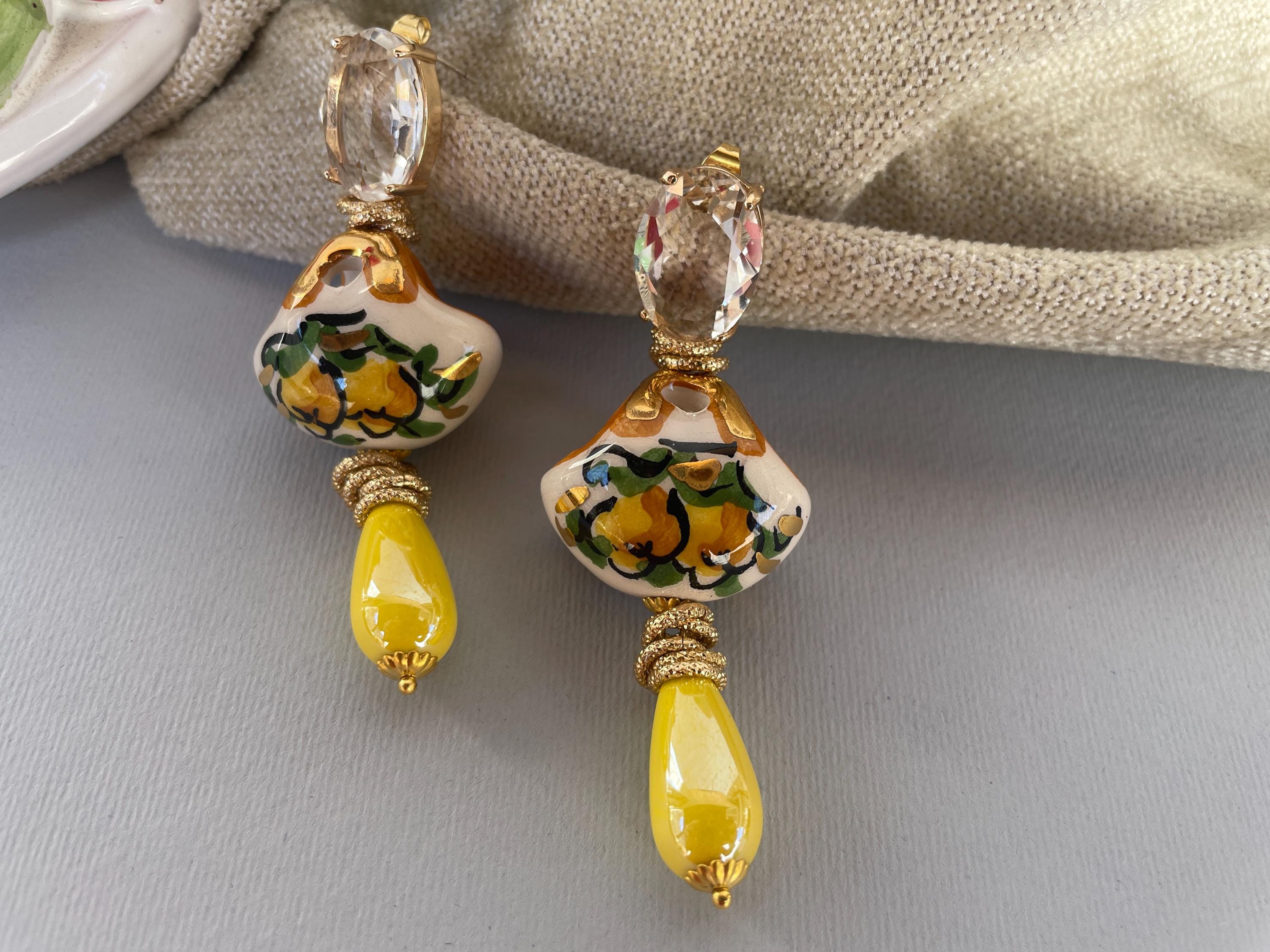 Realizzati con Cristalli ovali incolore montati su castone di ottone a perno, una splendida borsetta di Caltagirone, tipica della tradizione siciliana e dipinta a mano con Limoni. Una perla a goccia di ceramica gialla completa l’orecchino rendendolo più luminoso.