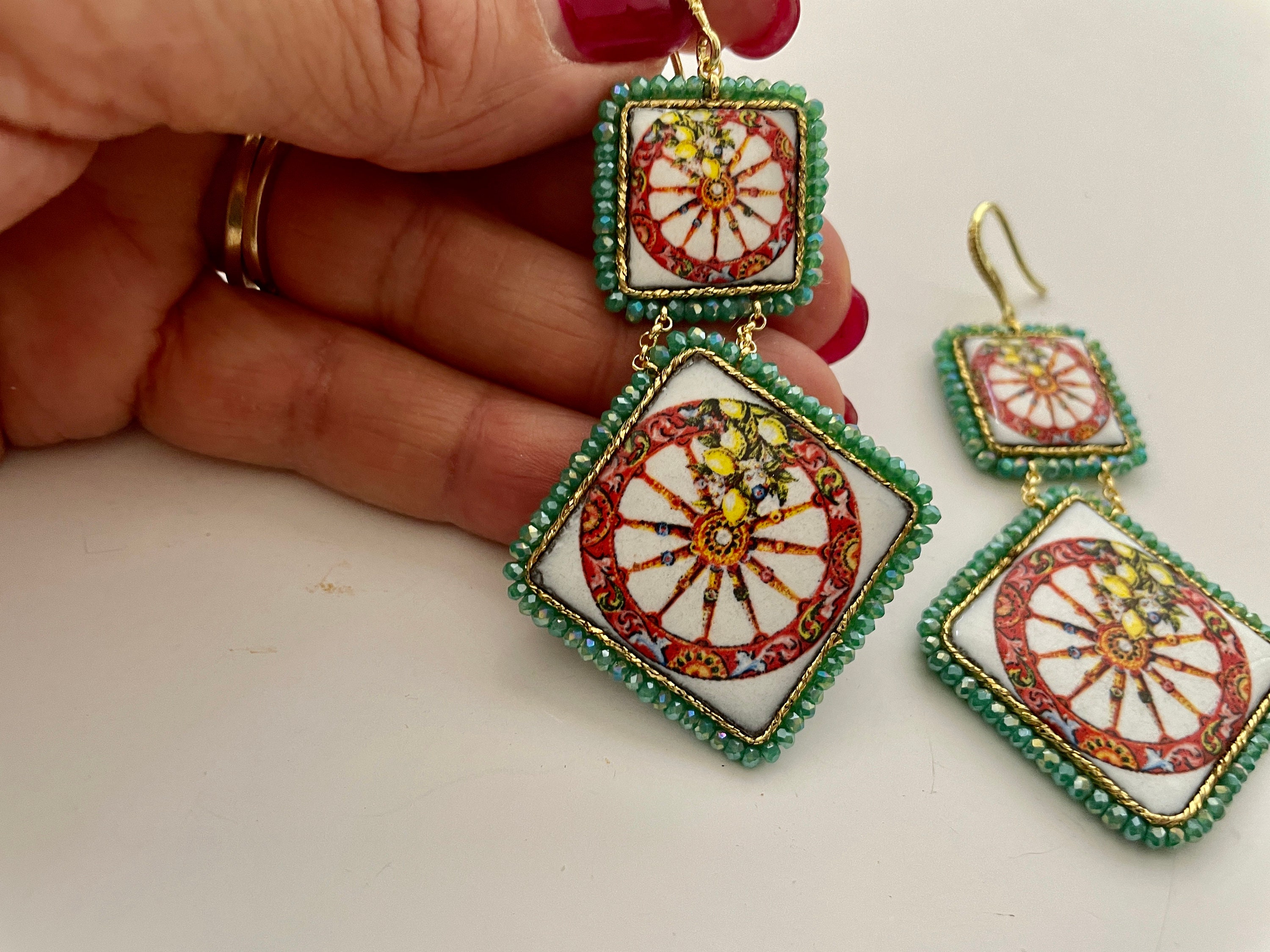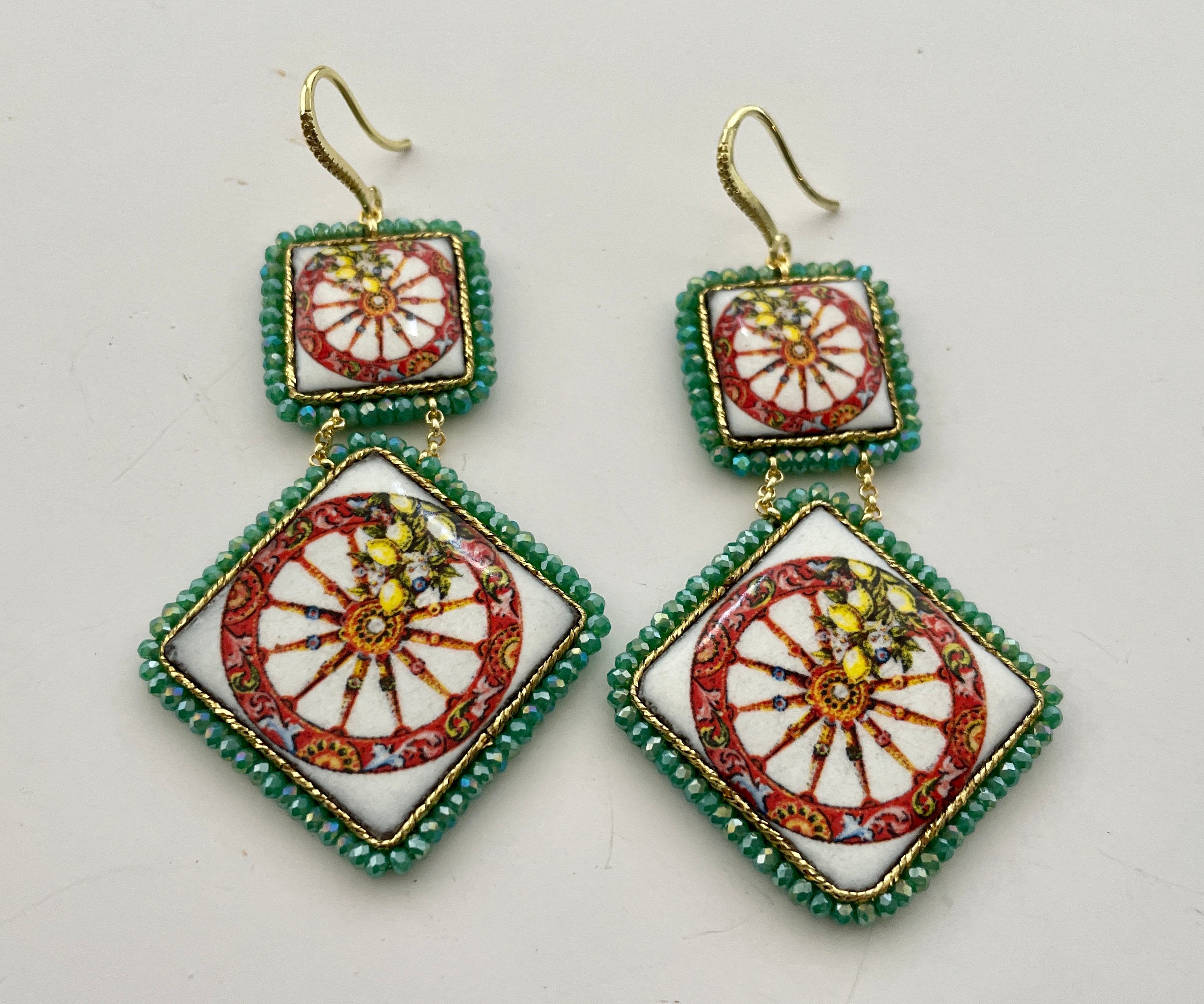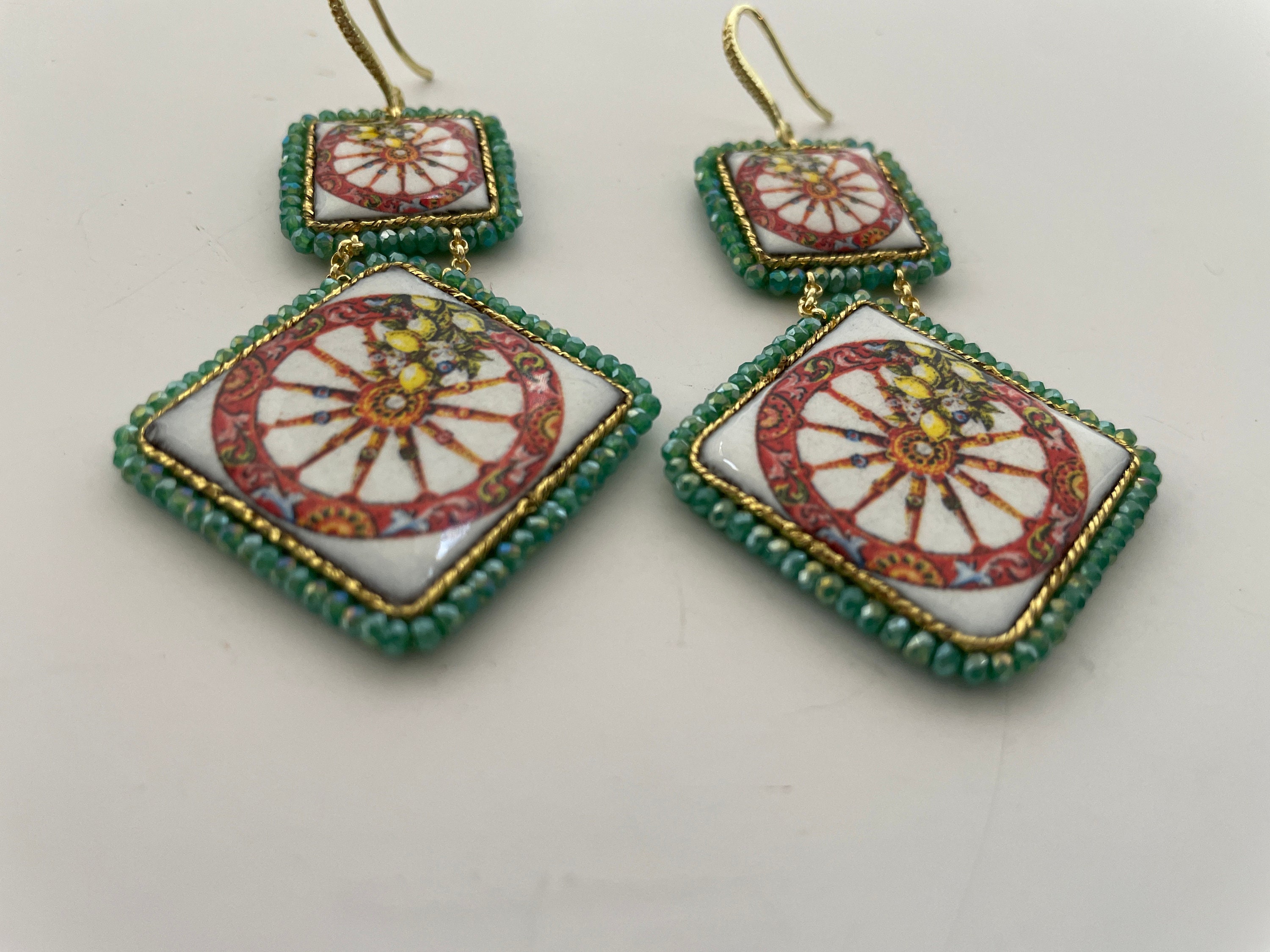 Orecchini siciliani pendenti realizzati con due mattonelle di ceramica di Caltagirone, stampate in superficie, su base lavica, e raffiguranti le tipiche Ruote del carretto siciliano.