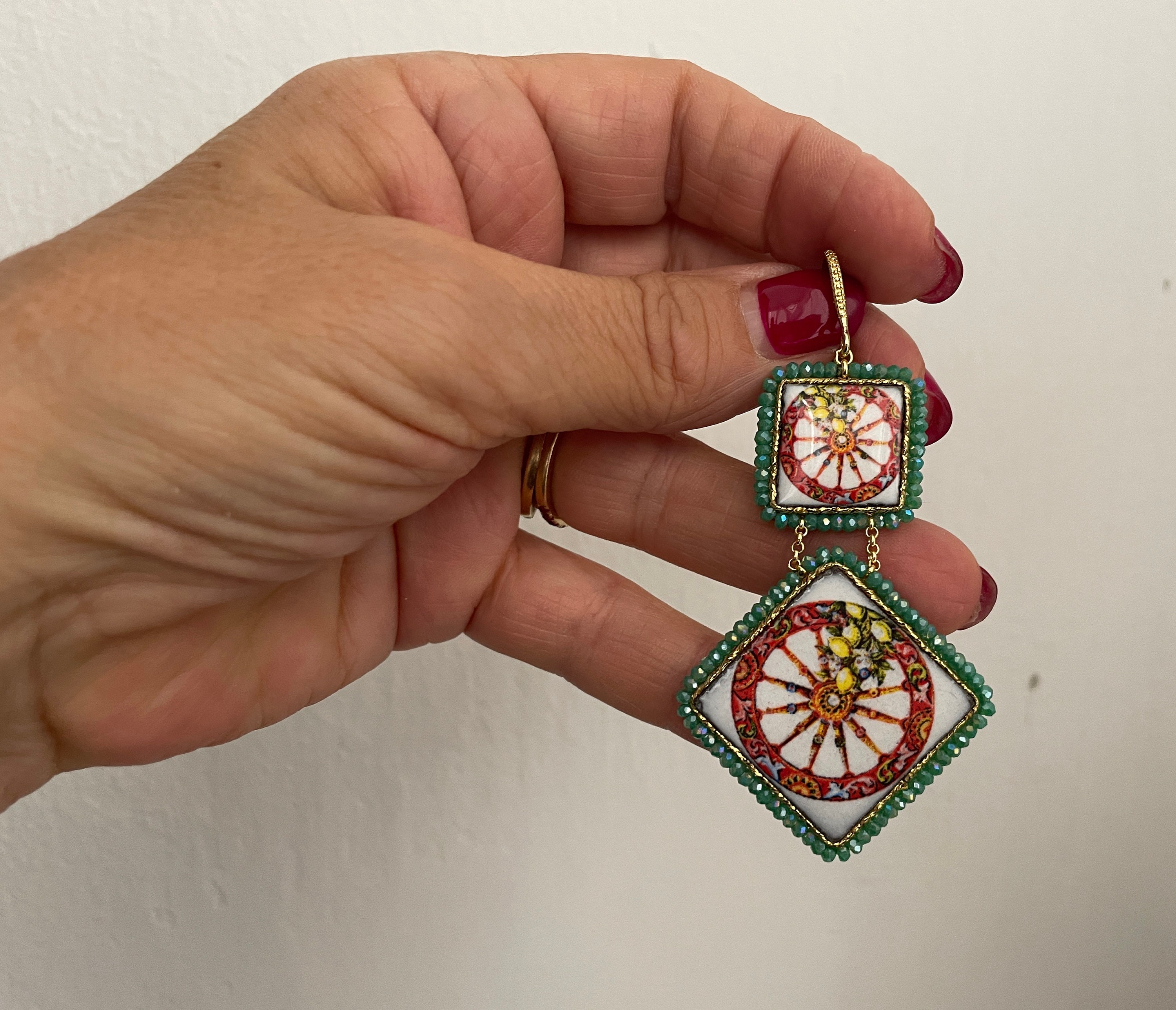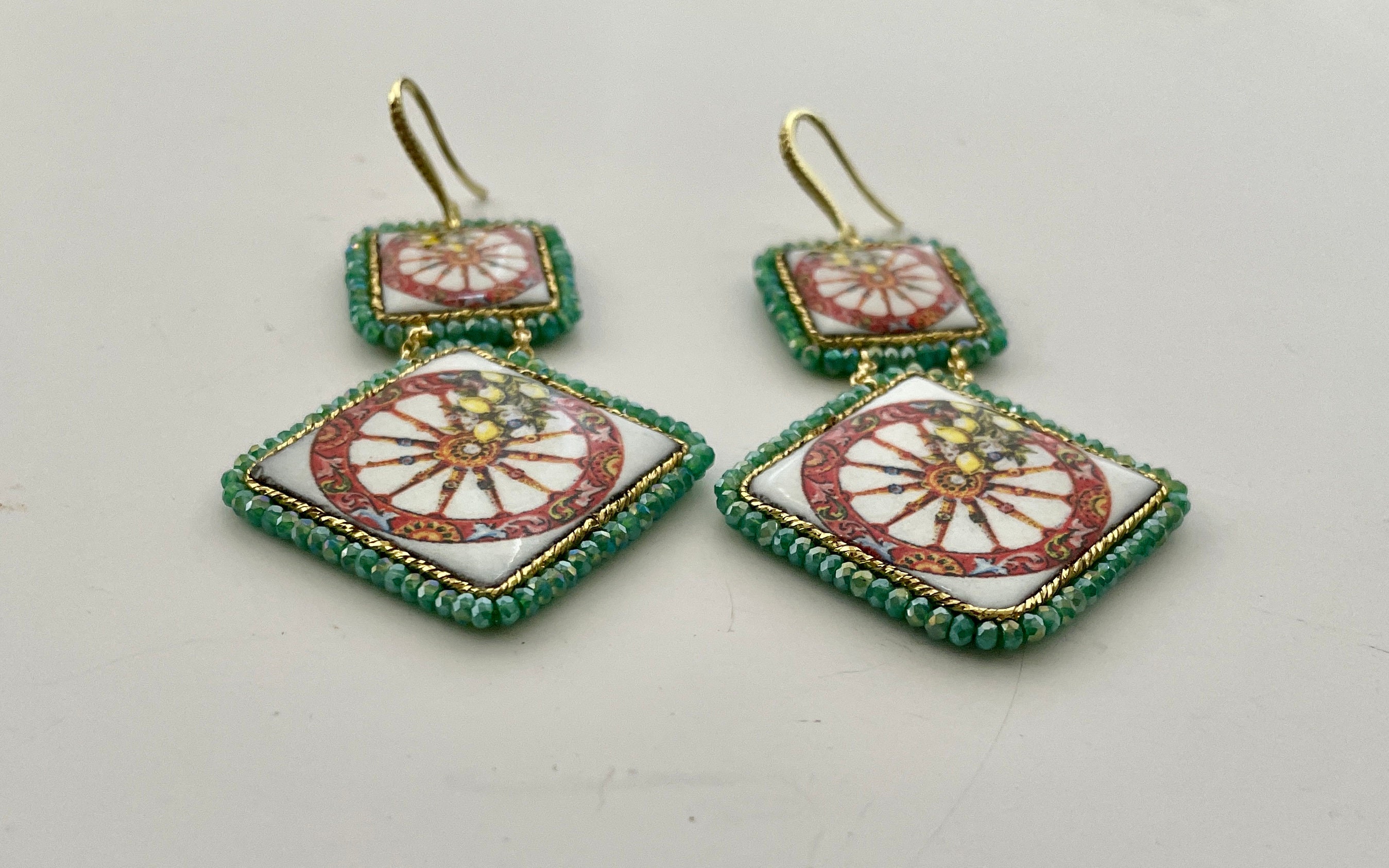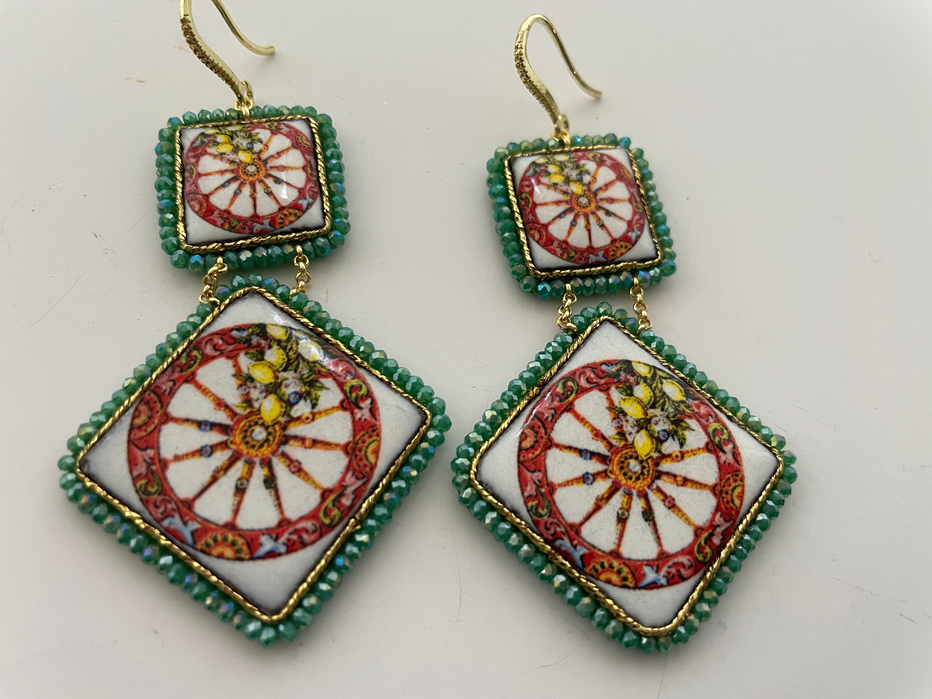 Orecchini siciliani pendenti realizzati con due mattonelle di ceramica di Caltagirone, stampate in superficie, su base lavica, e raffiguranti le tipiche Ruote del carretto siciliano.