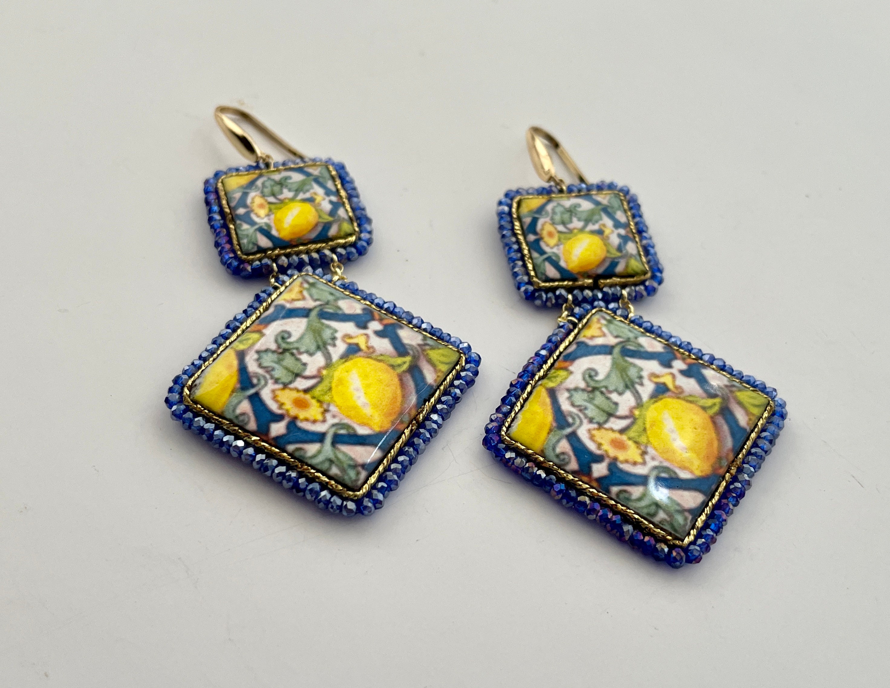 Orecchini siciliani pendenti realizzati con due mattonelle di ceramica di Caltagirone, stampate in superficie, su base lavica, con motivi tipici della maiolica siciliana.