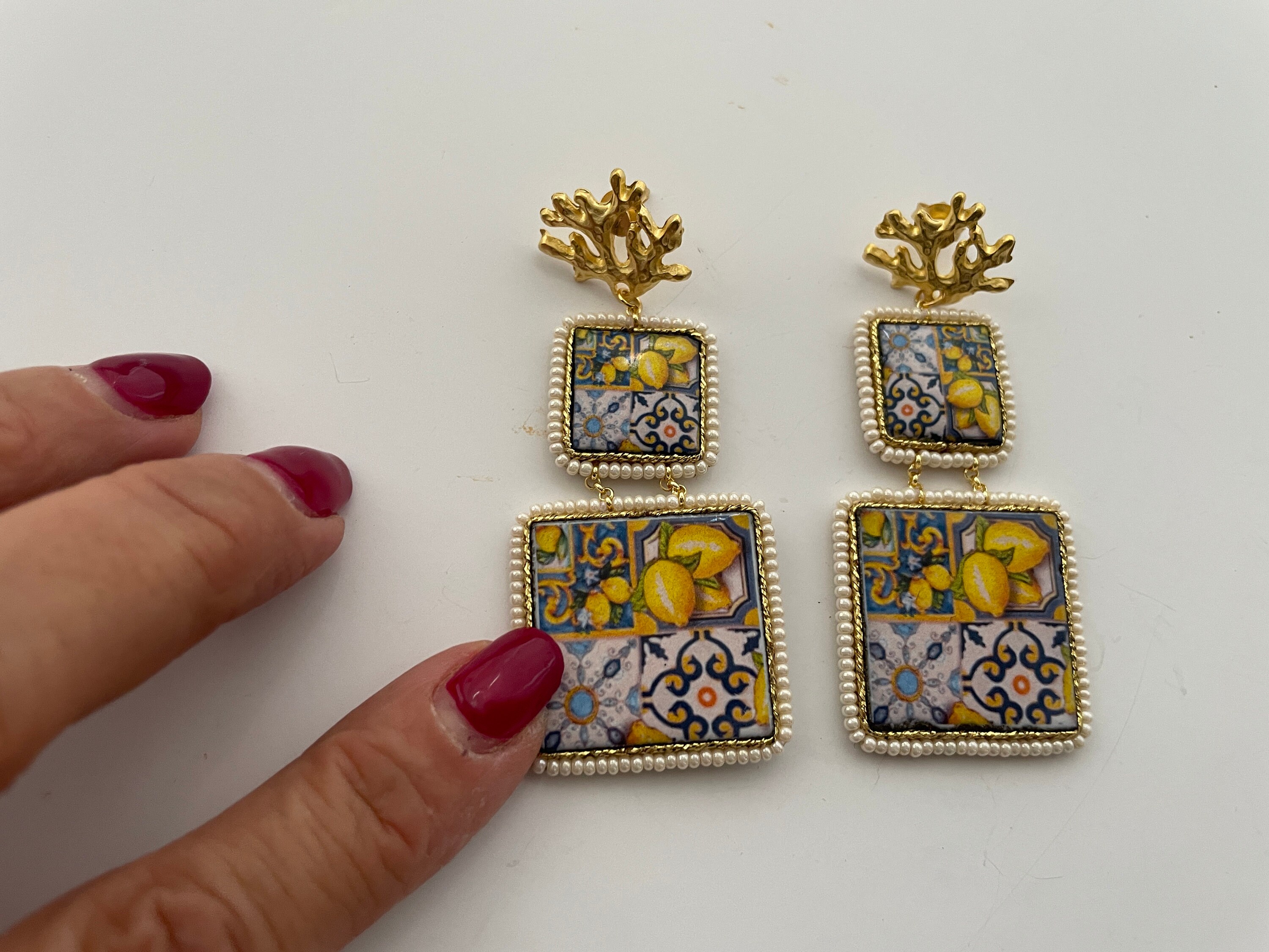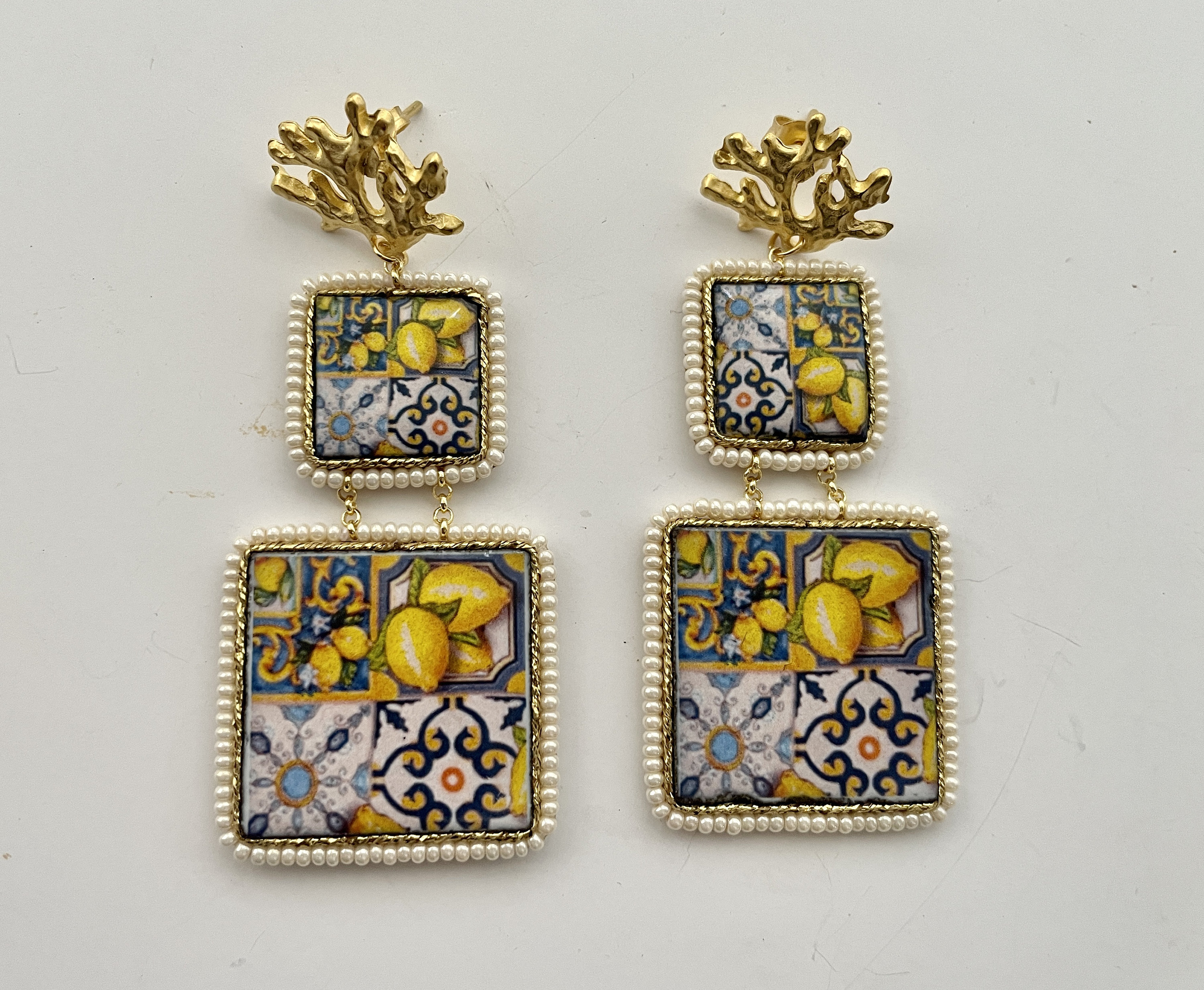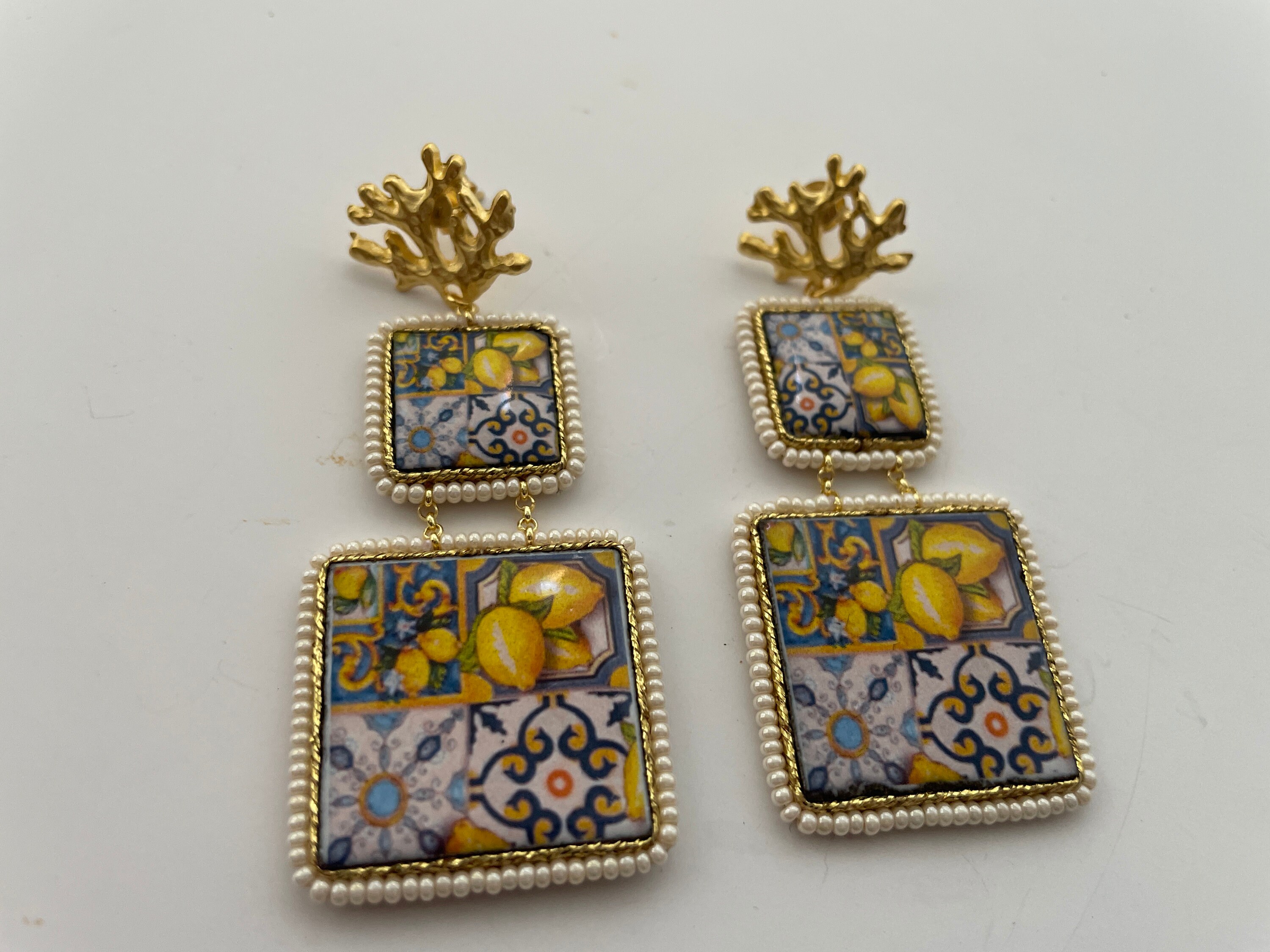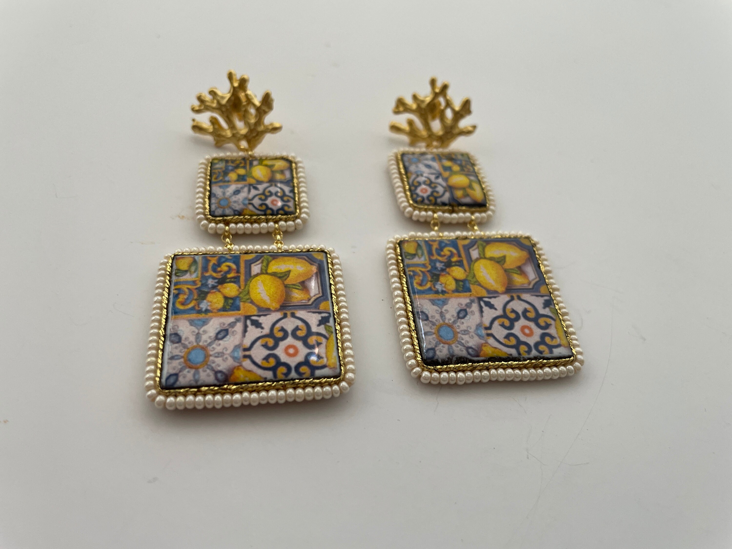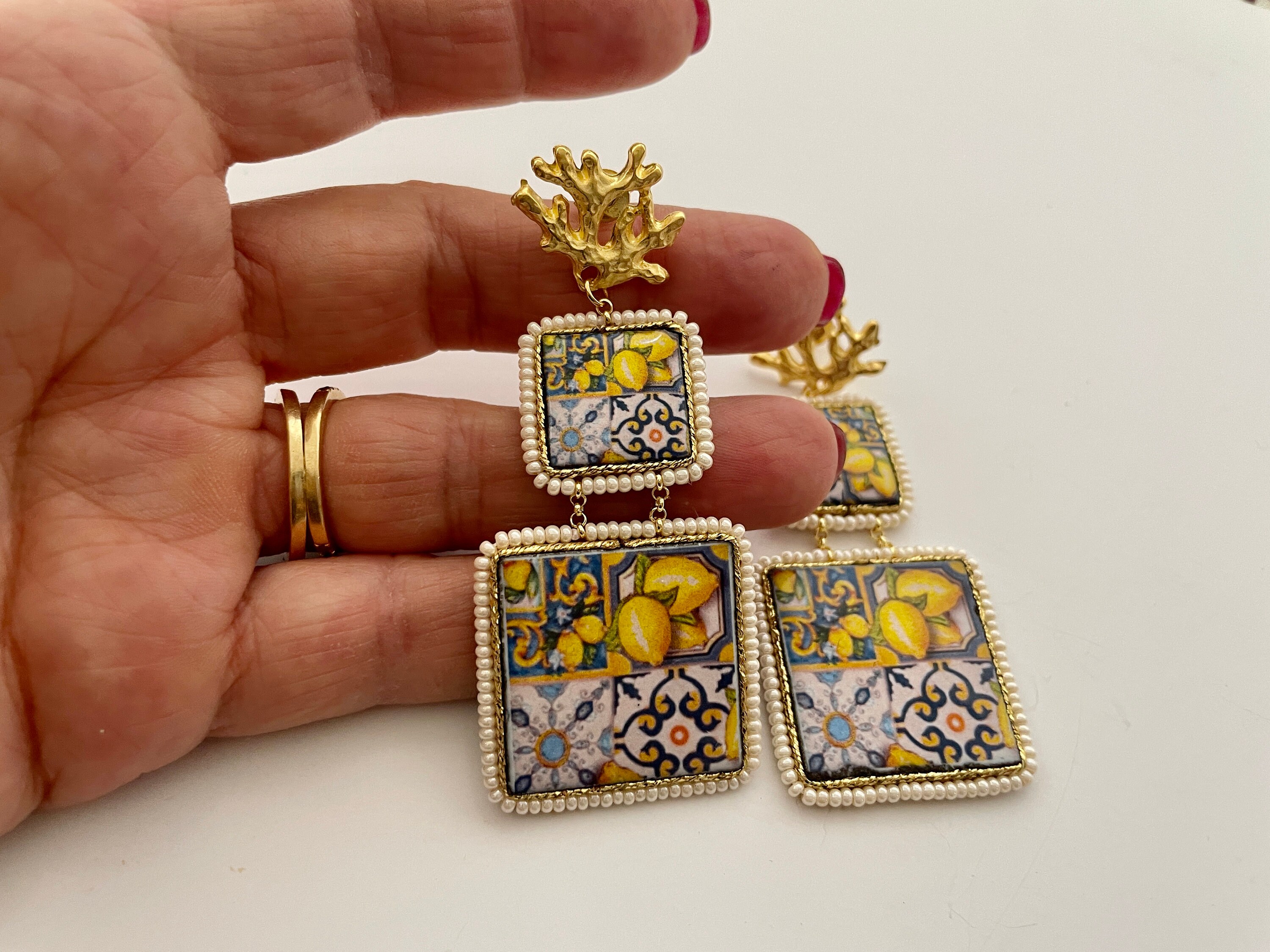 Orecchini siciliani pendenti composti da doppia mattonella di ceramica di Caltagirone, stampata in superficie, su base lavica, con motivi tipici della maiolica siciliana.
