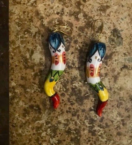 Orecchini siciliani pendenti con Corno della Fortuna in Ceramica di Caltagirone interamente dipinta a mano con colori vivaci e luminosi.