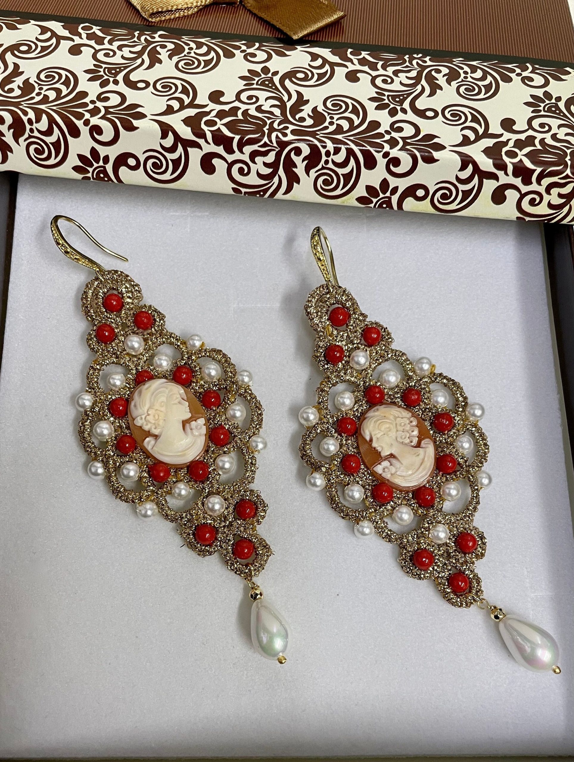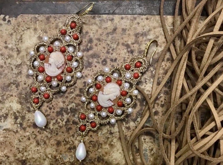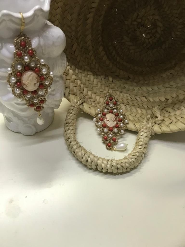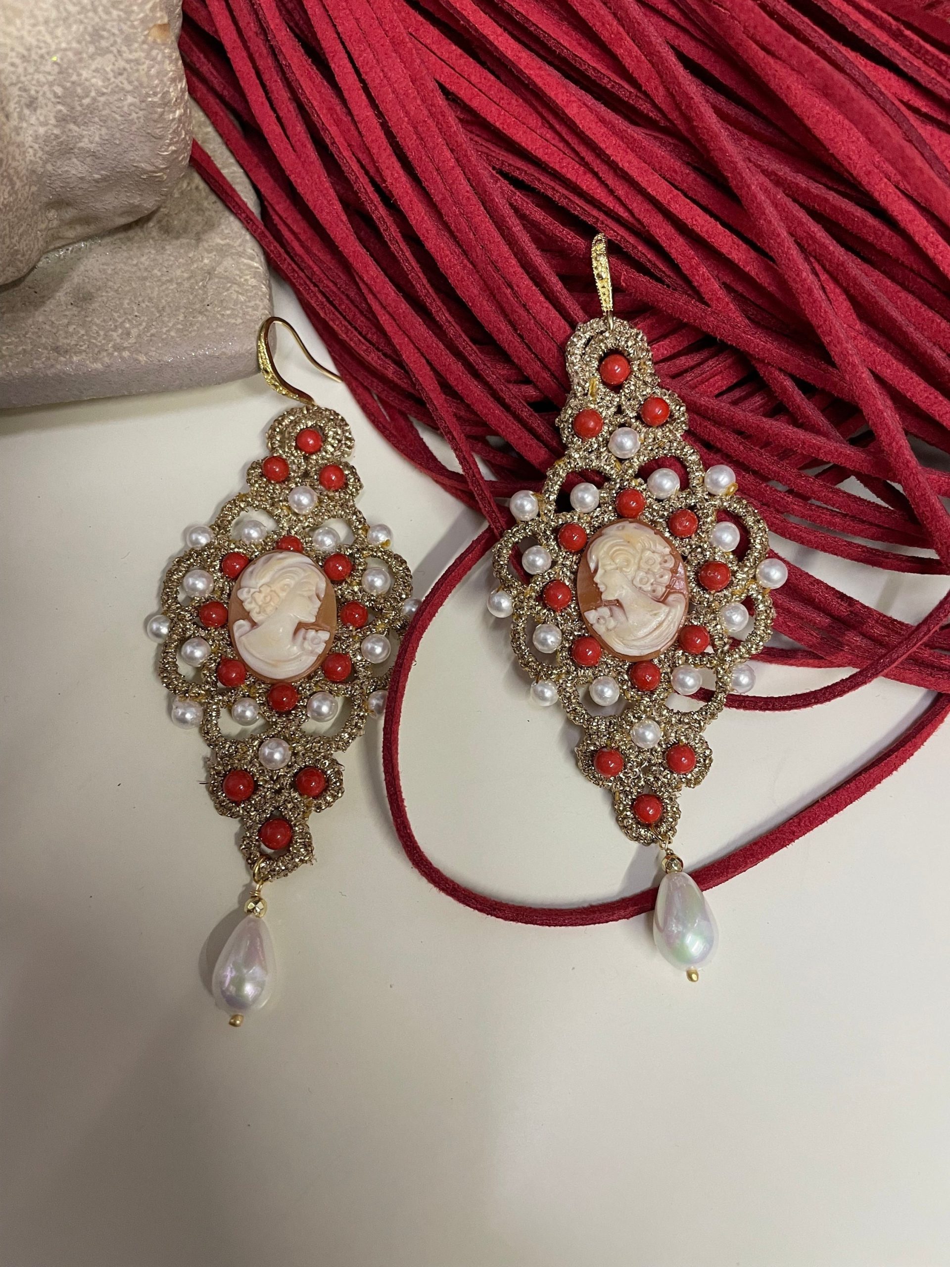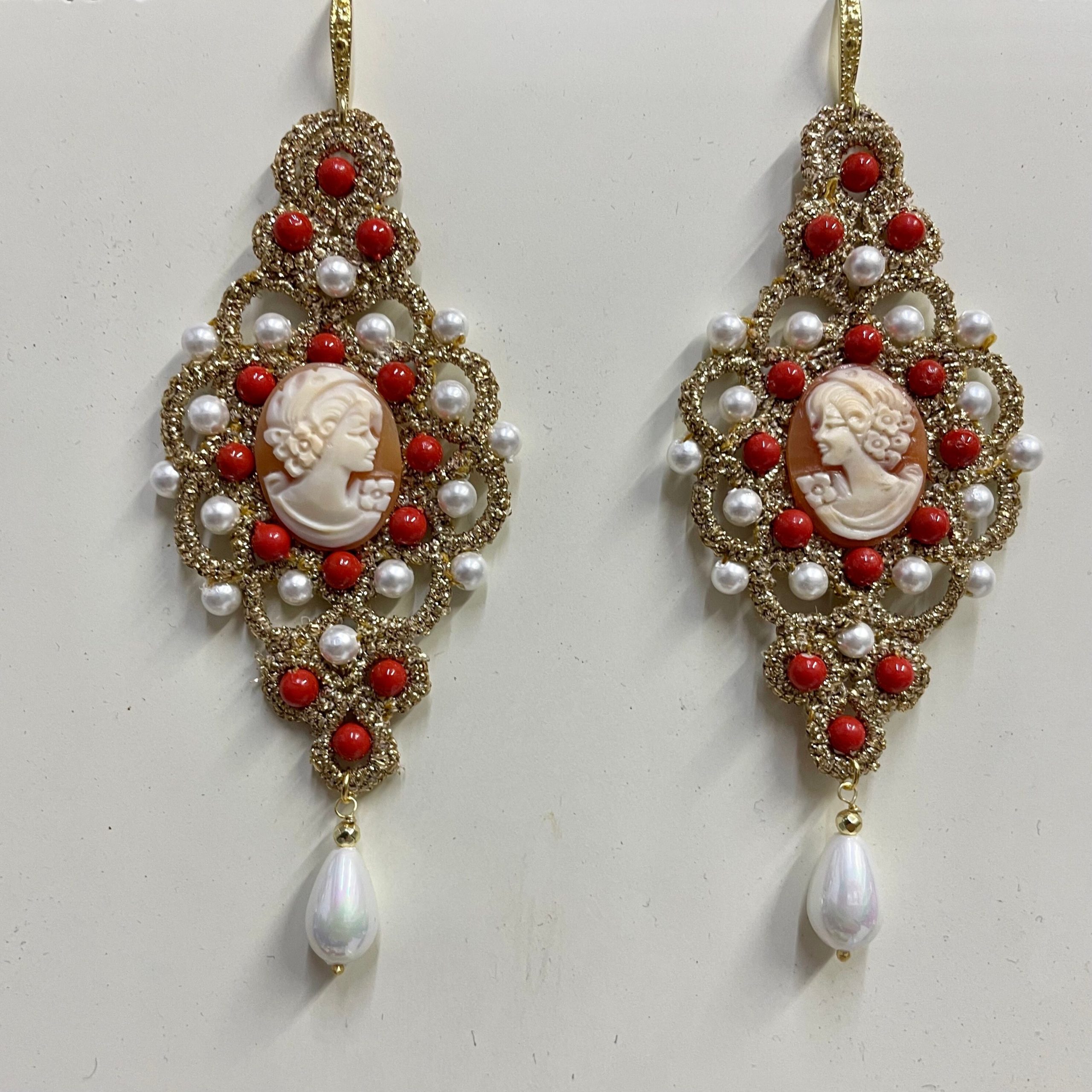 Orecchini tricot con filato oro a forma ovale allungata, grandi orecchini con Cammeo genuino di conchiglia sardonica al centro. Il ricamo è arricchito da perle maiorca di colore rosso e bianco.