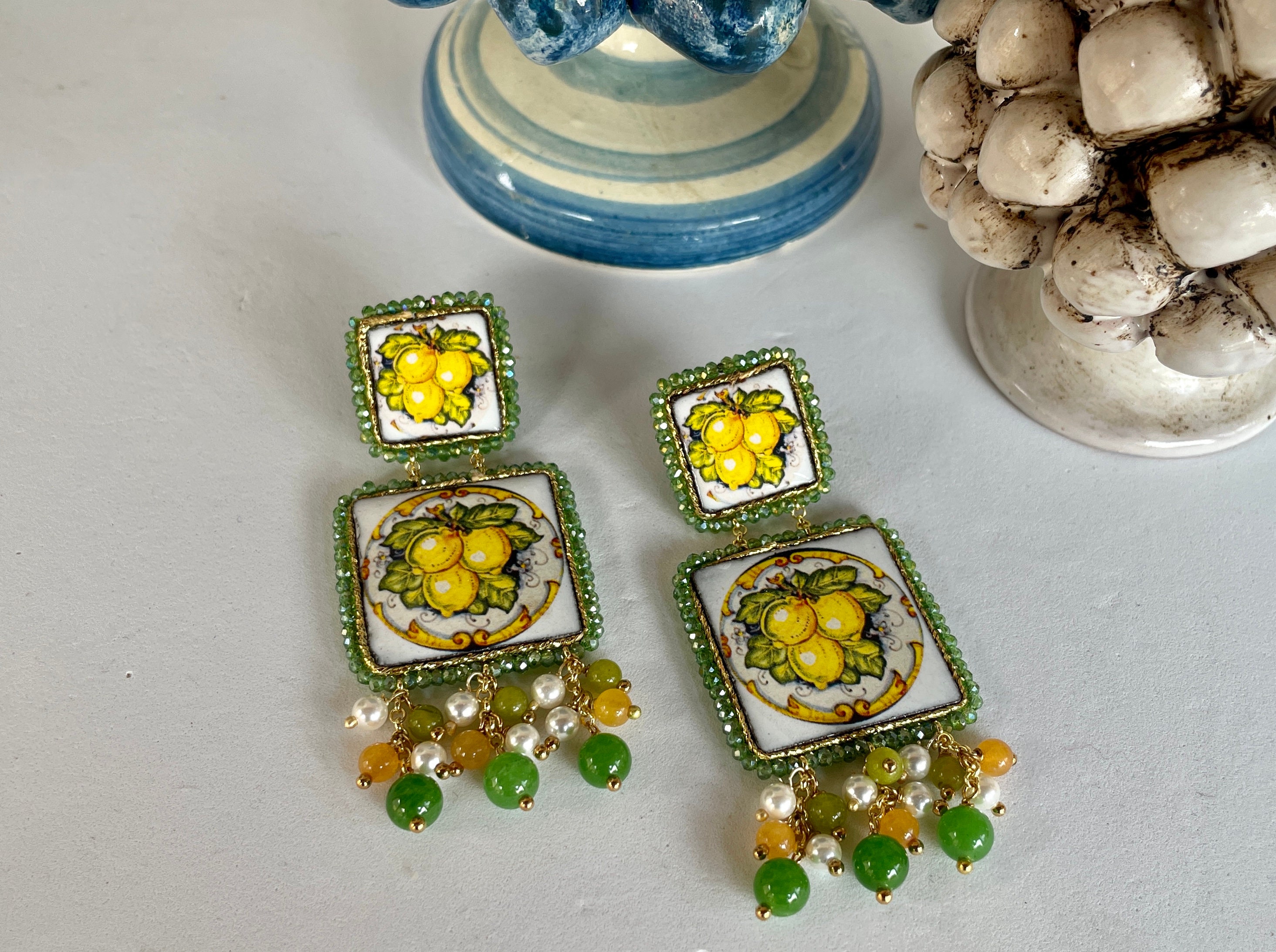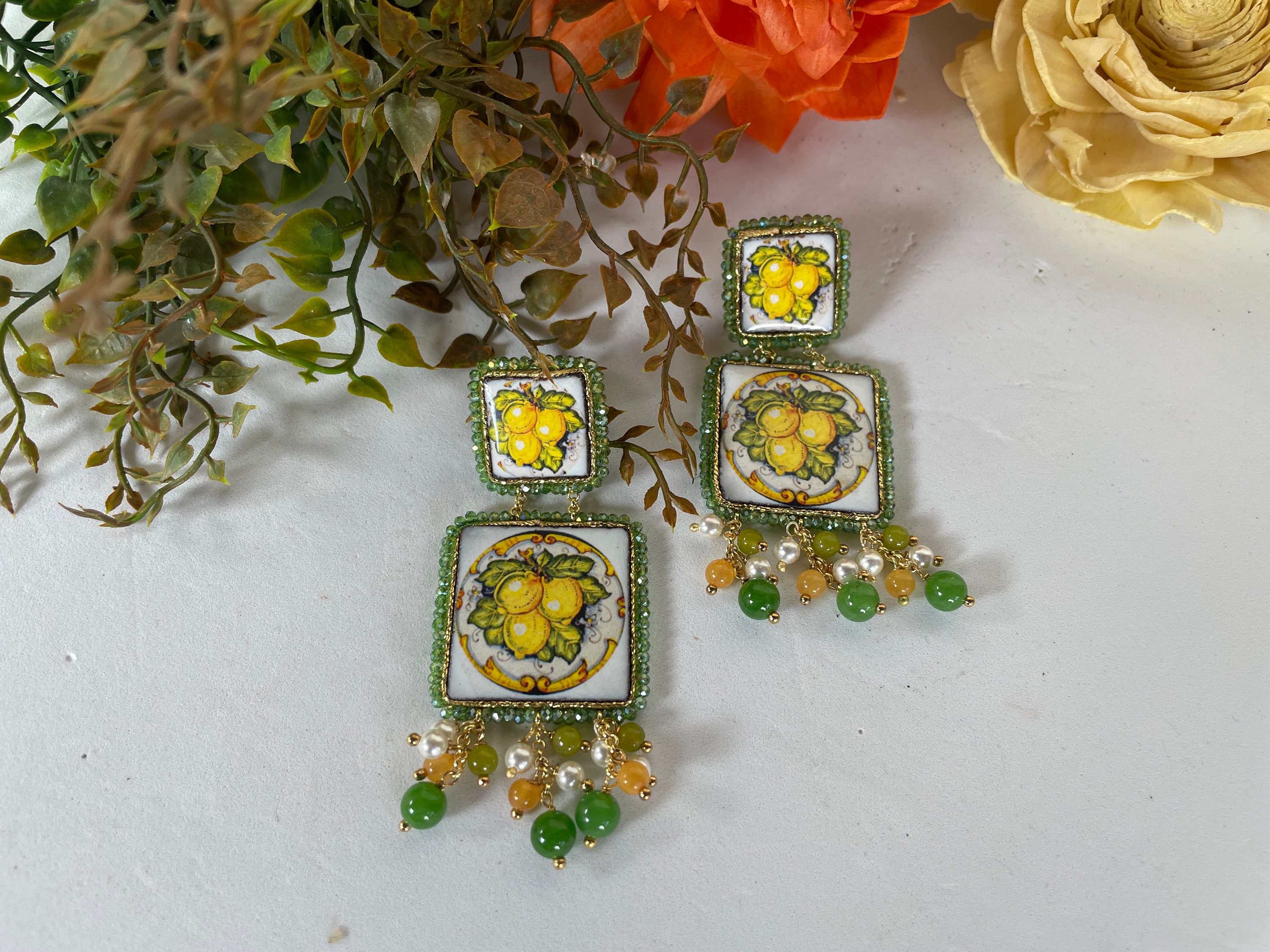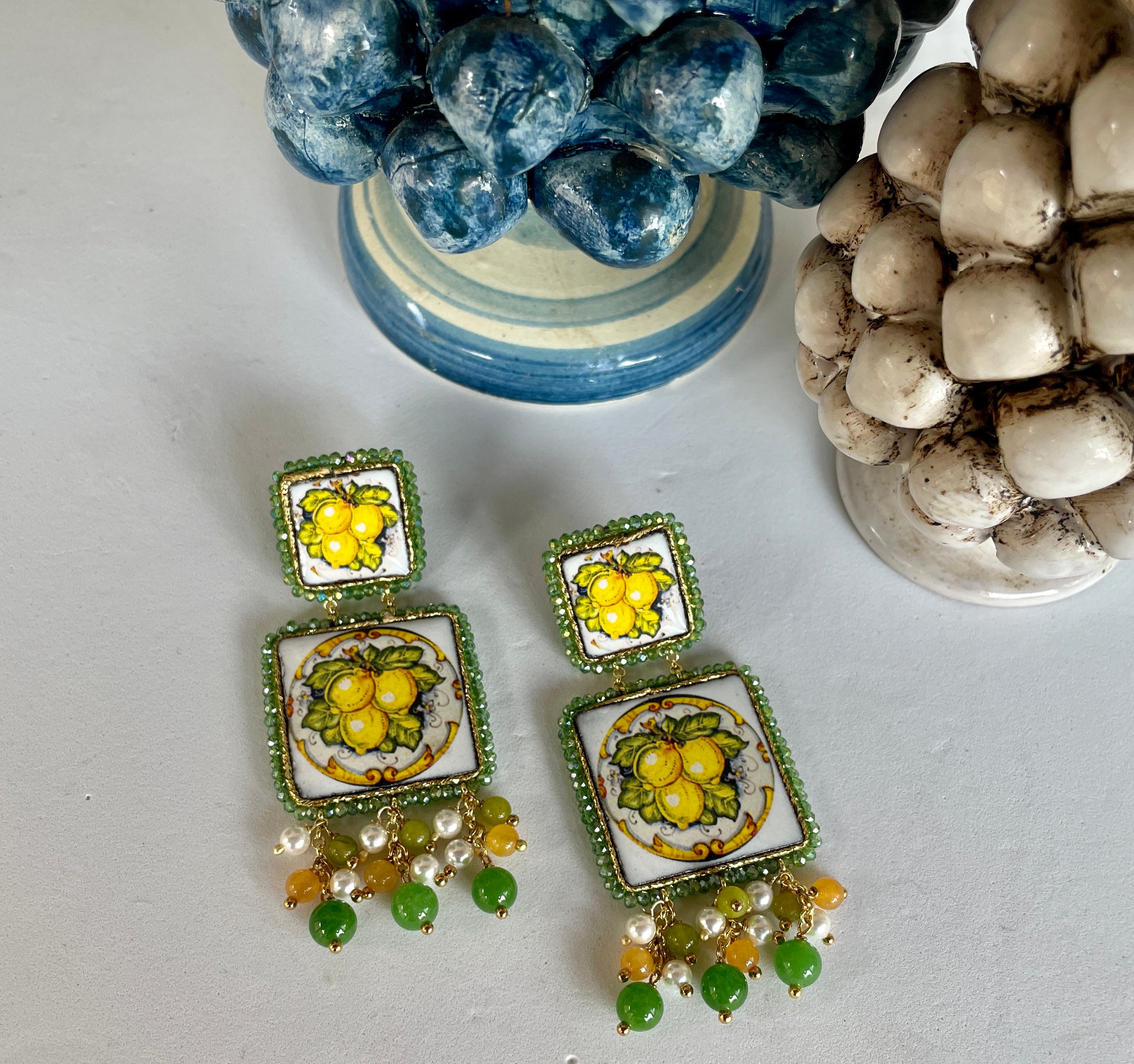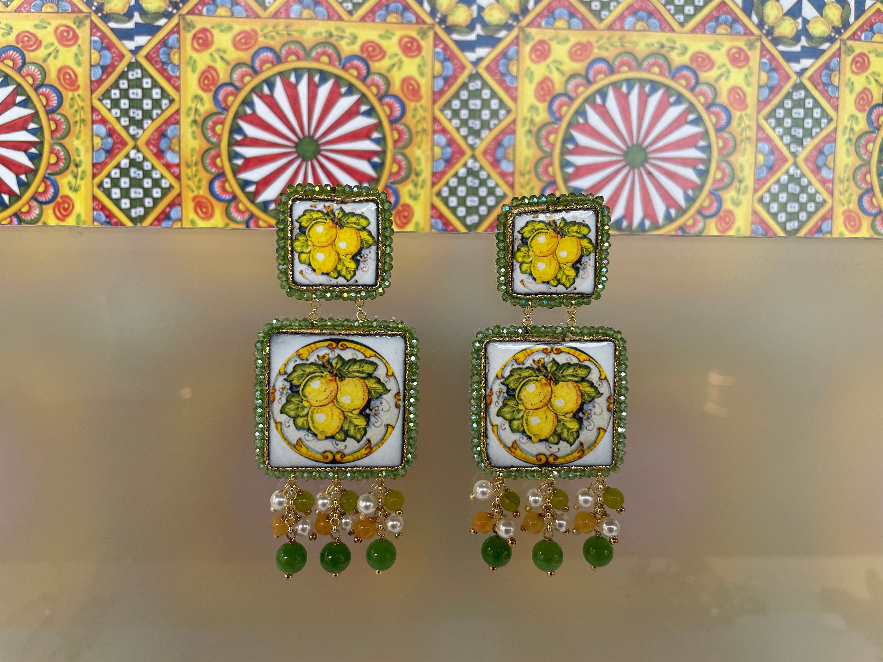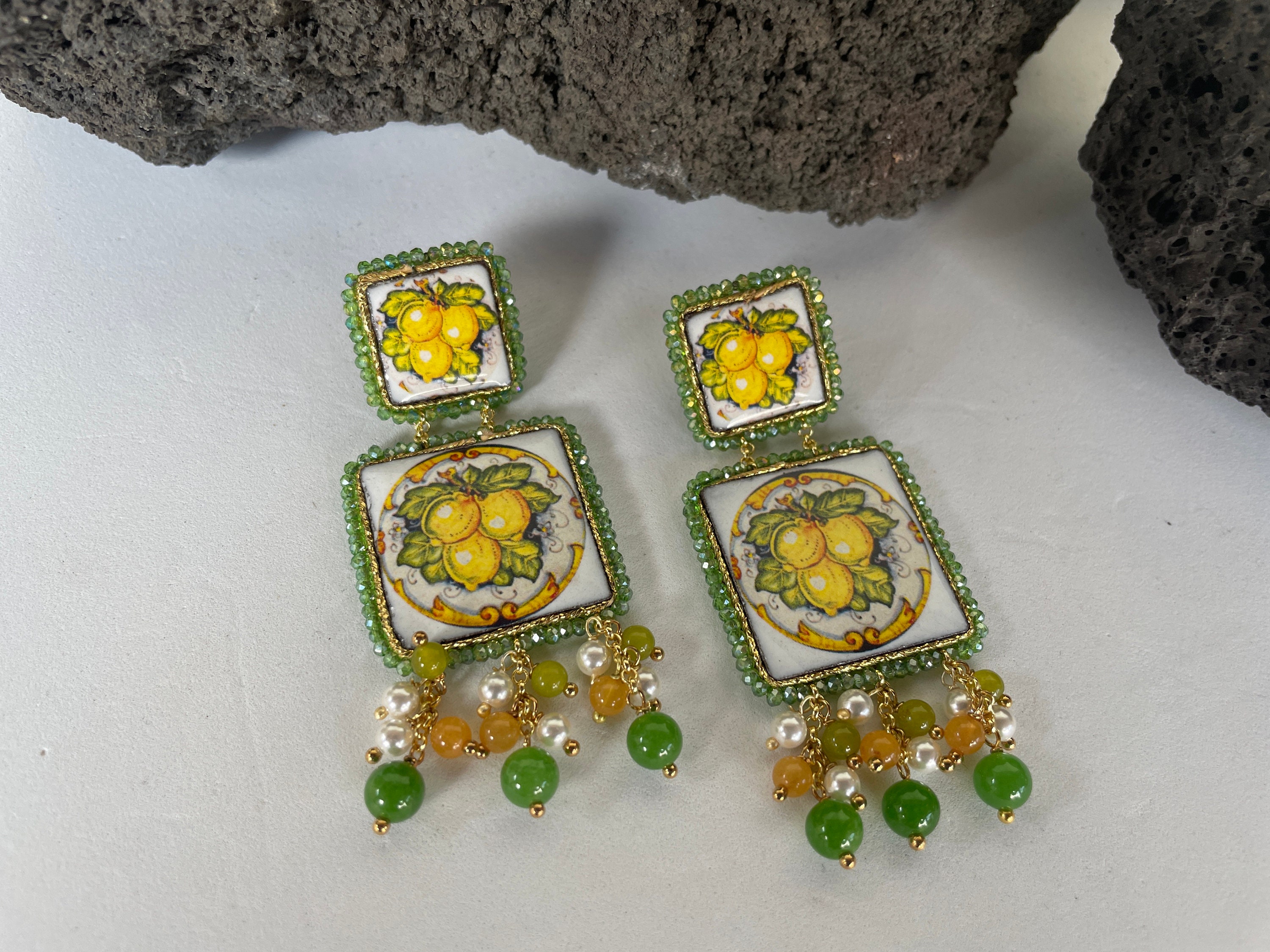 Orecchini siciliani con mattonelle in ceramica di Caltagirone su base lavica!