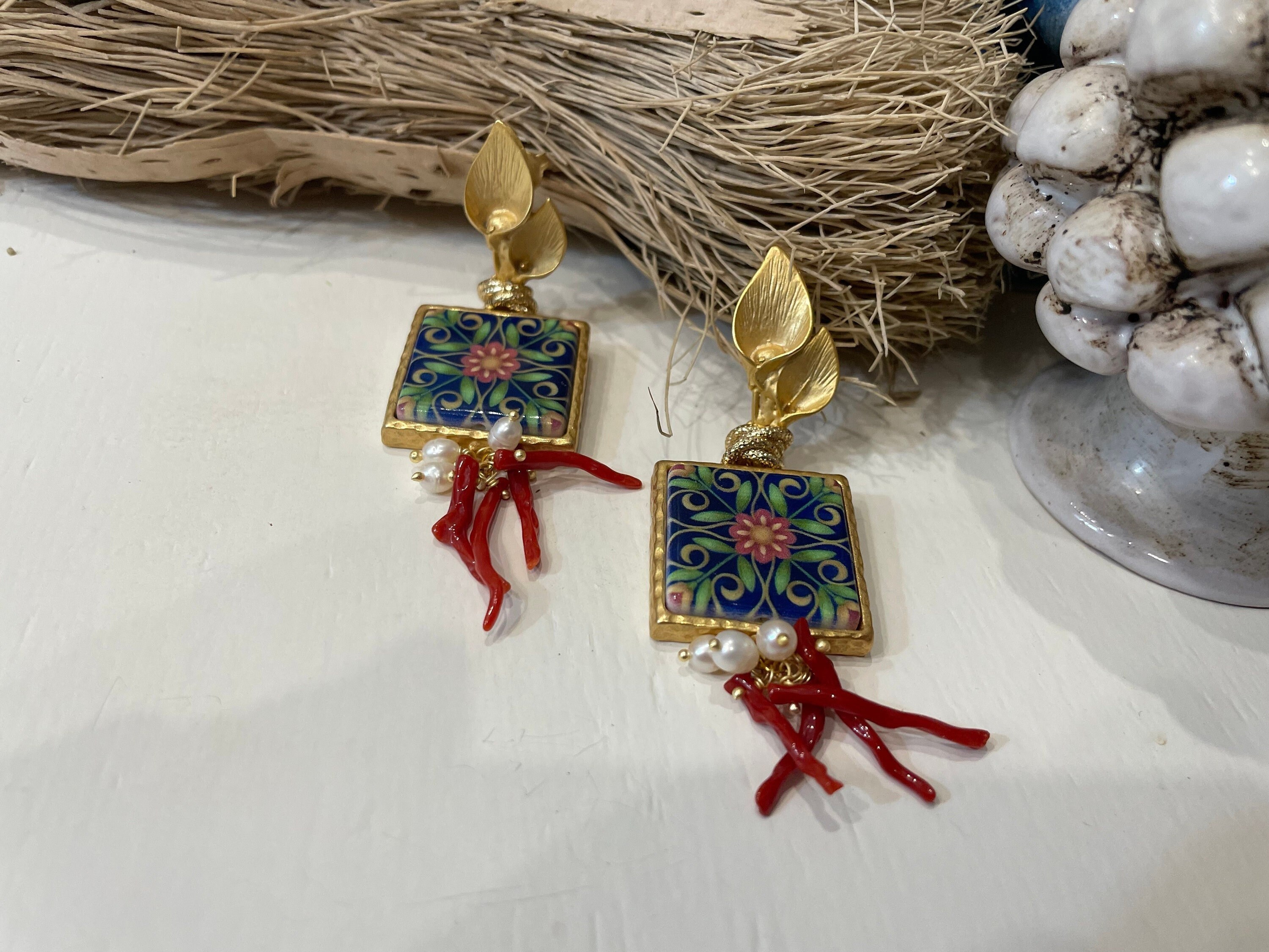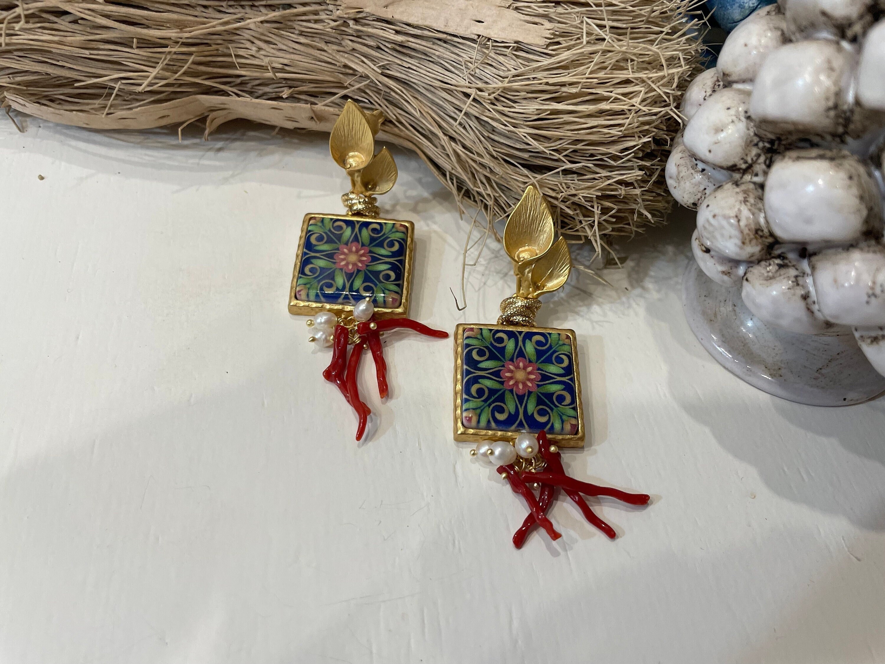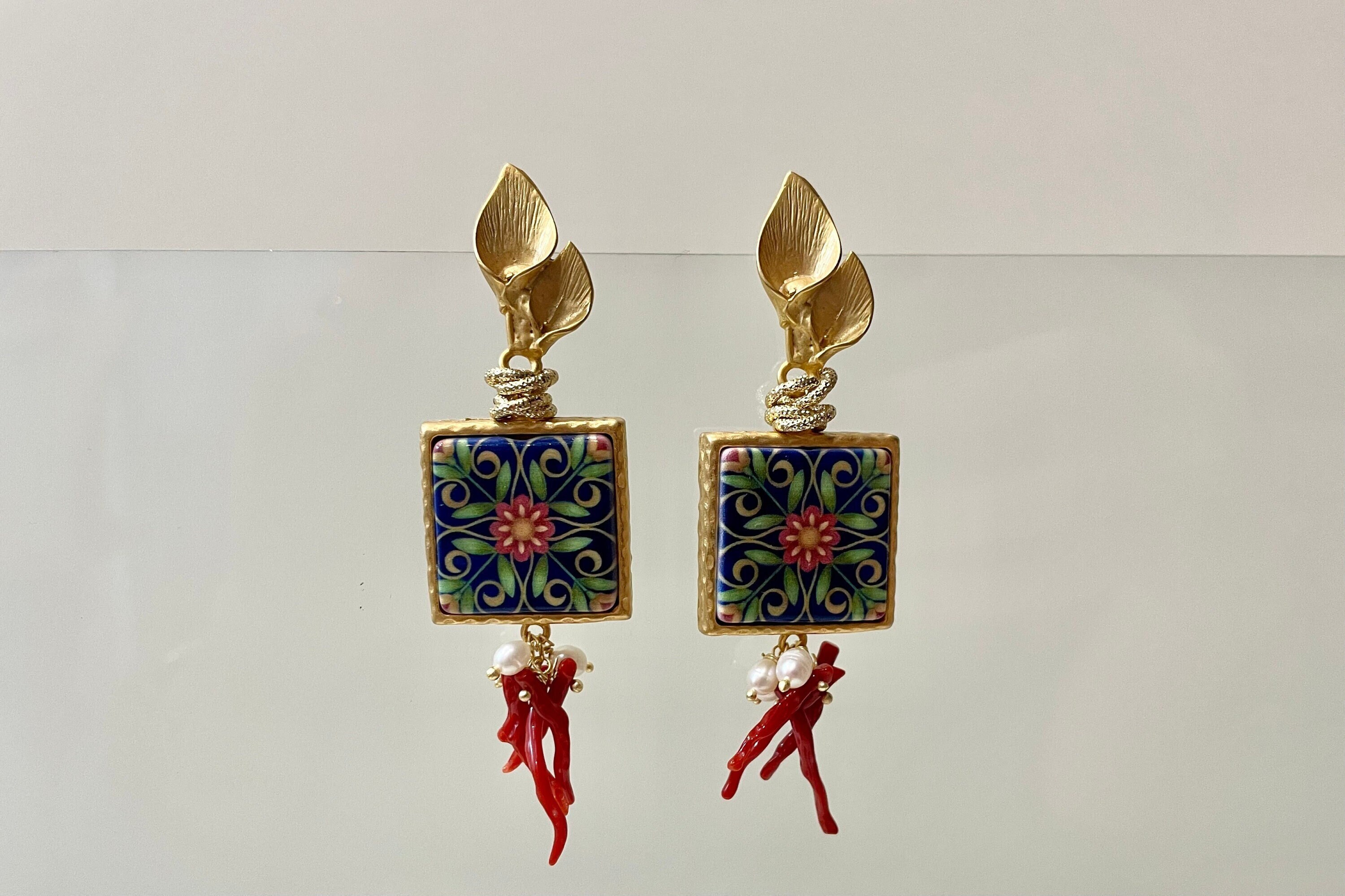 Orecchini siciliani con mattonella di ceramica stampata in superficie con decori floreali tipici della maiolica siciliana. La mattonella è incastonata su una base di ottone di prima qualità placcato oro.