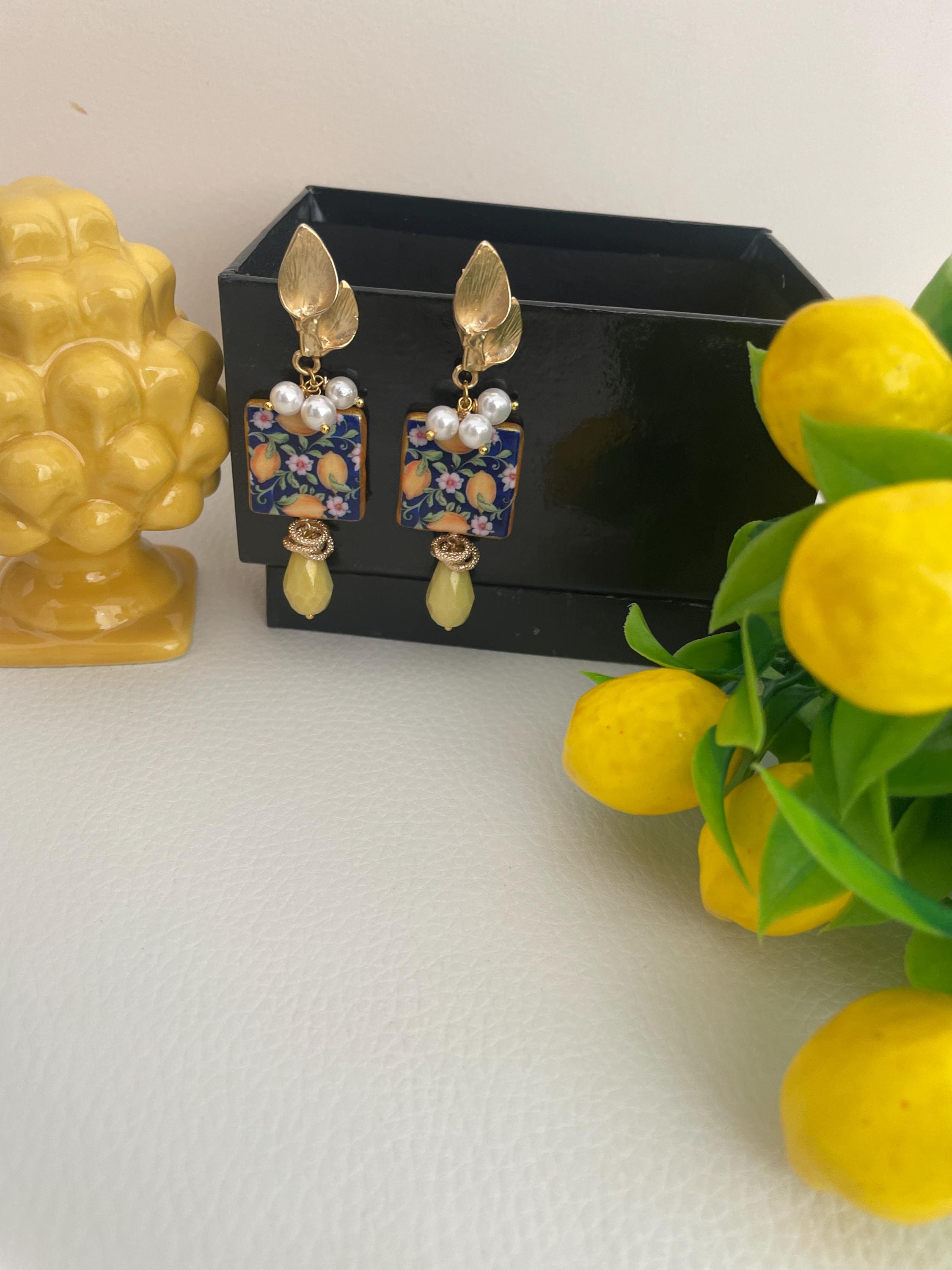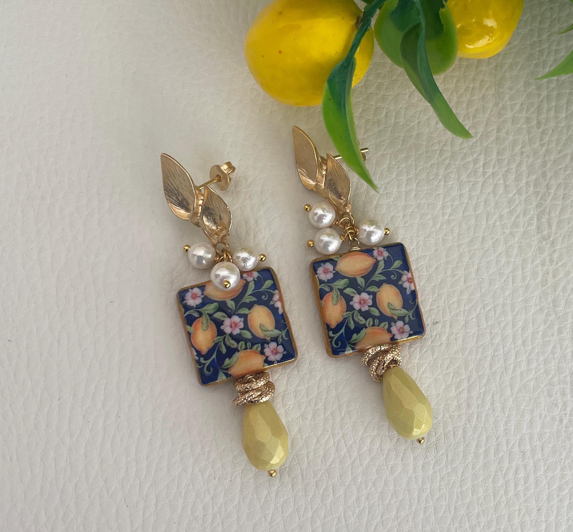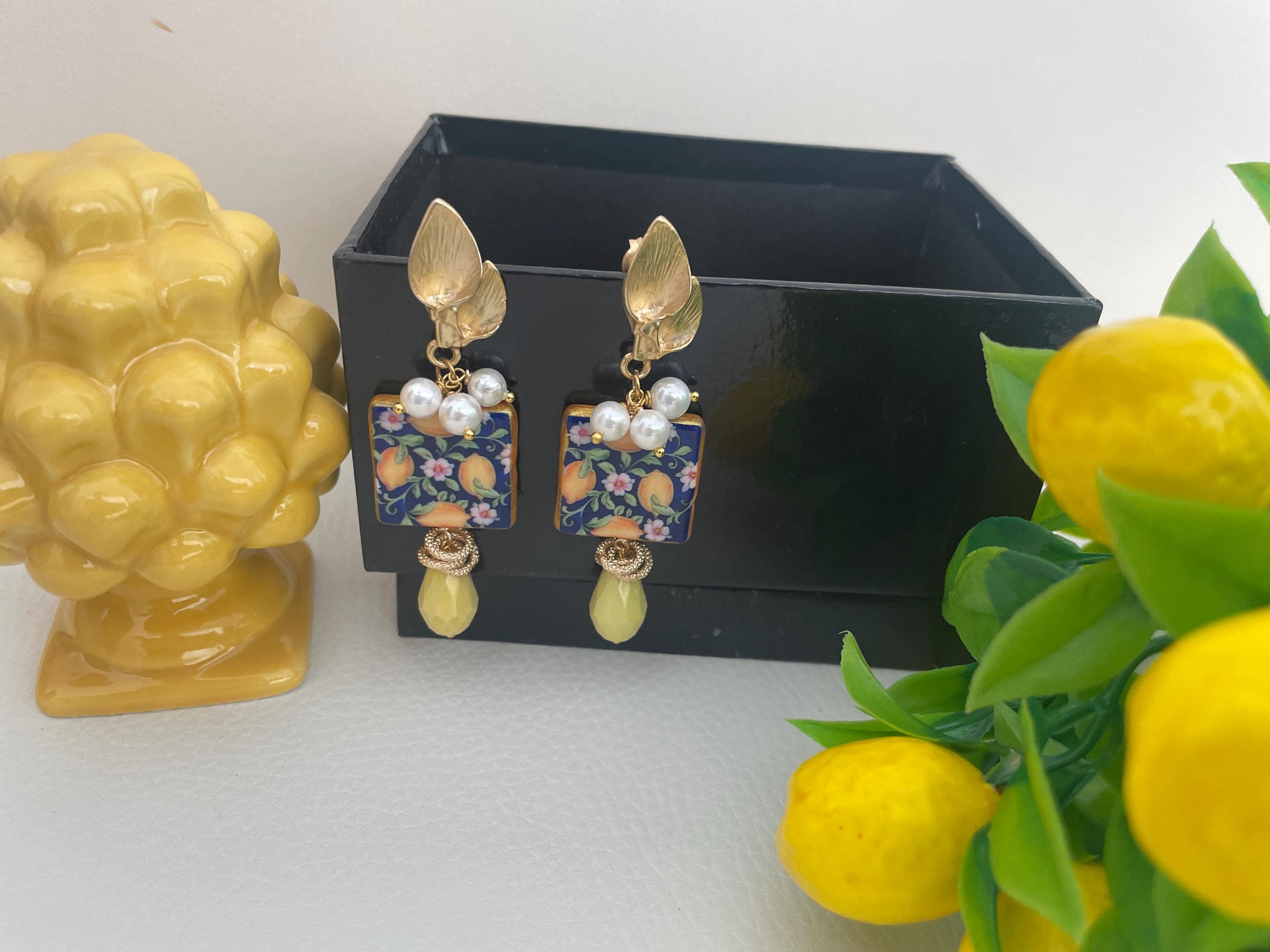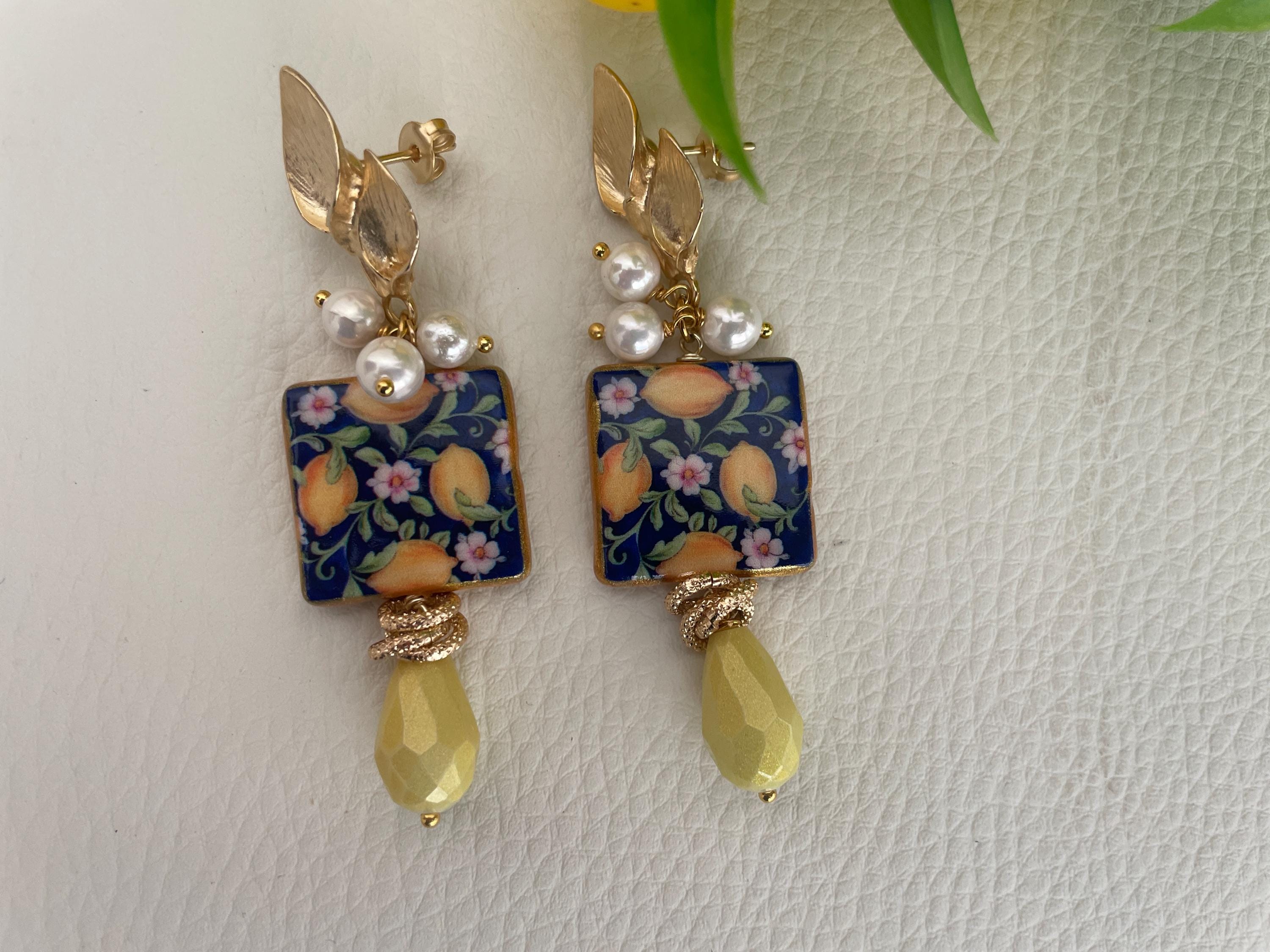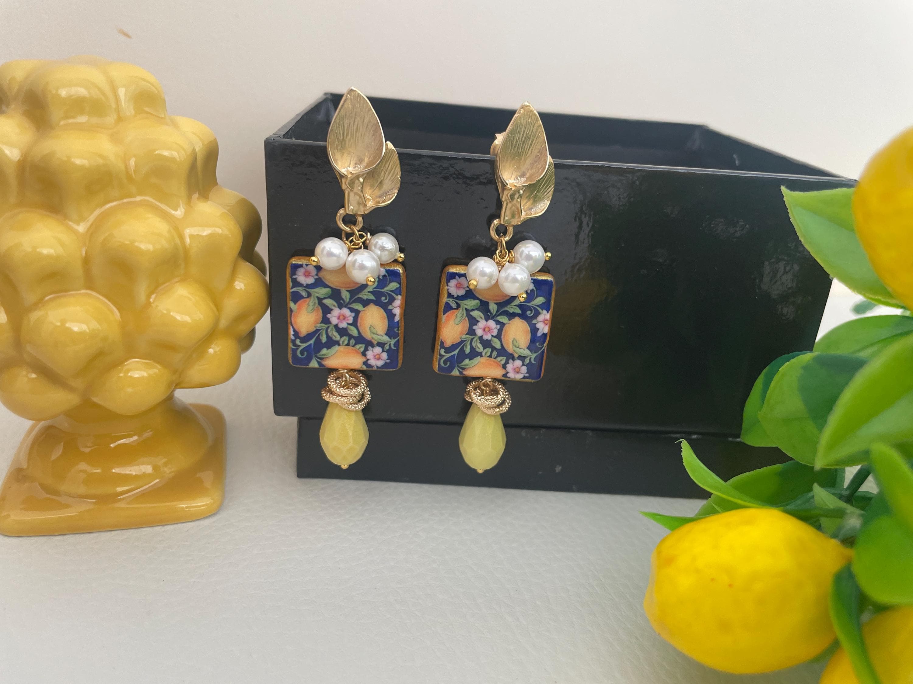 Orecchini pendenti composti da un raffinato perno floreale in zama. Una bella mattonella di ceramica stampata in superficie con Limoni gialli su fondo blu. La mattonella è bordata con smalto oro dato a fuoco.
