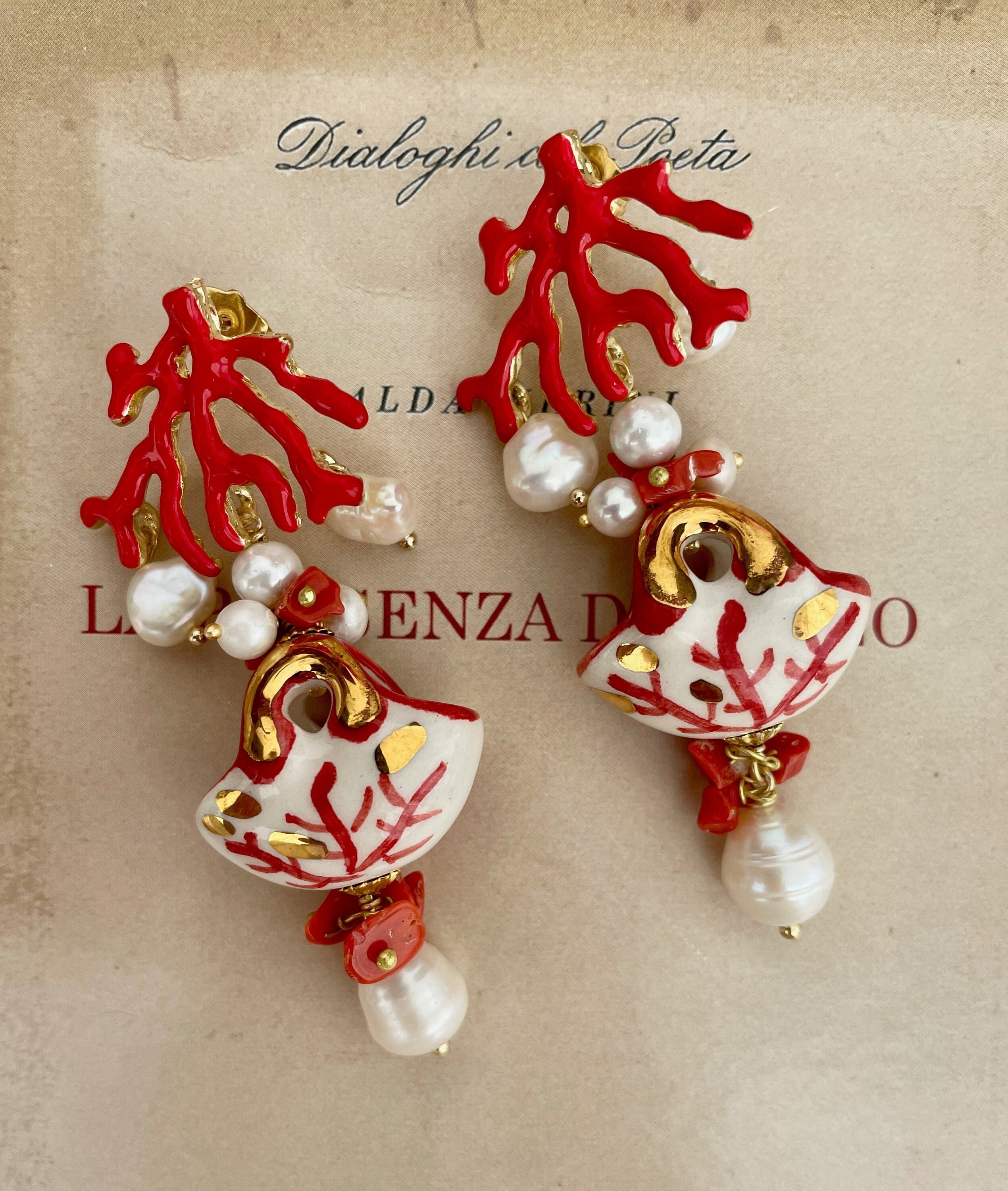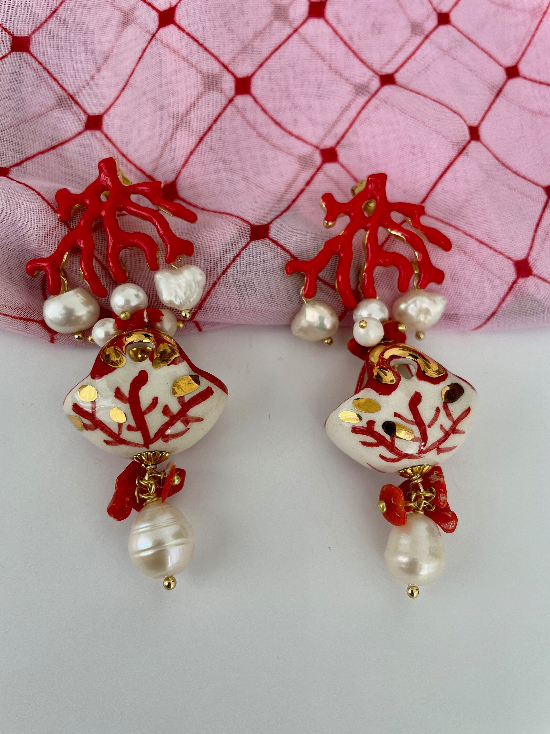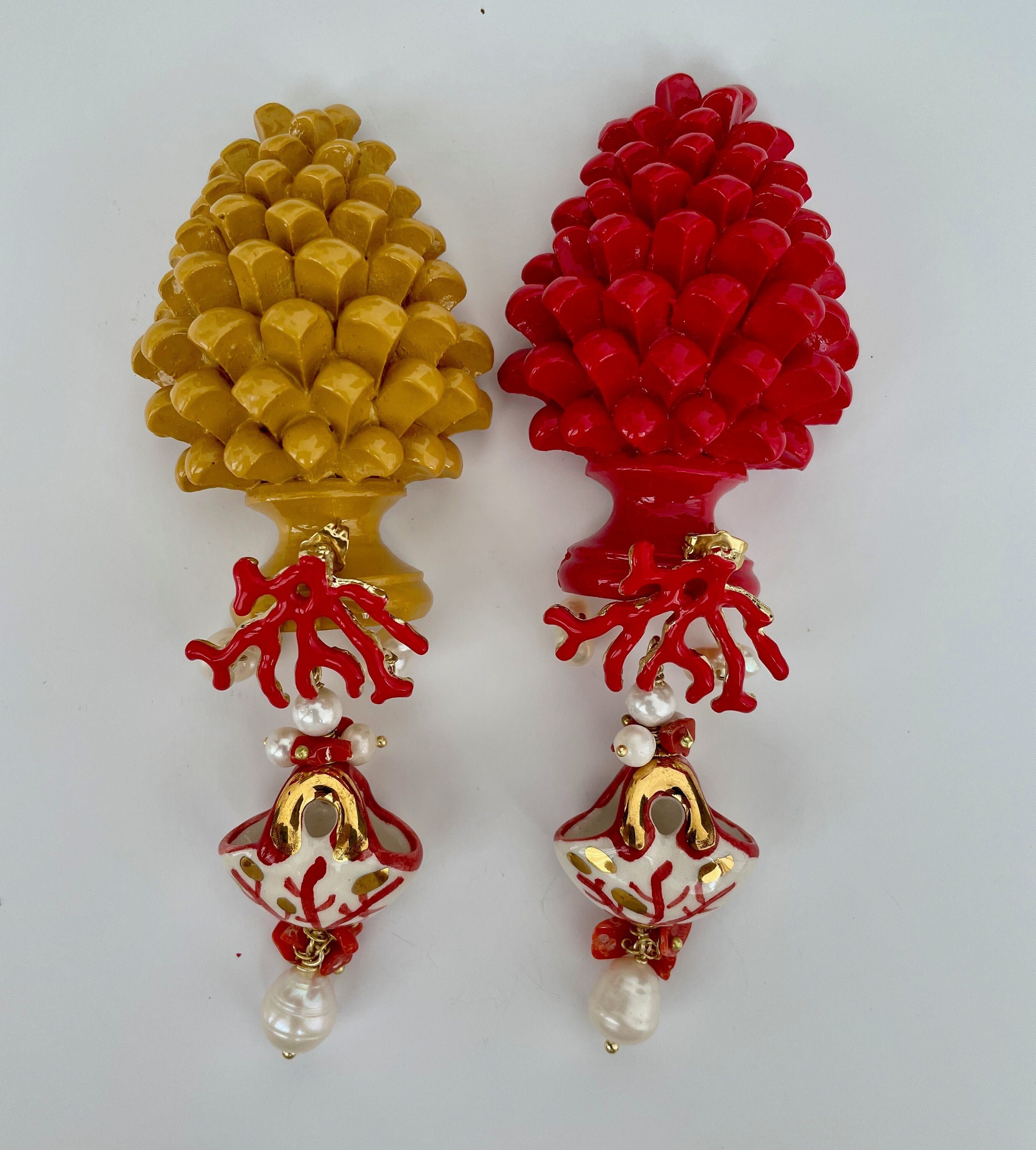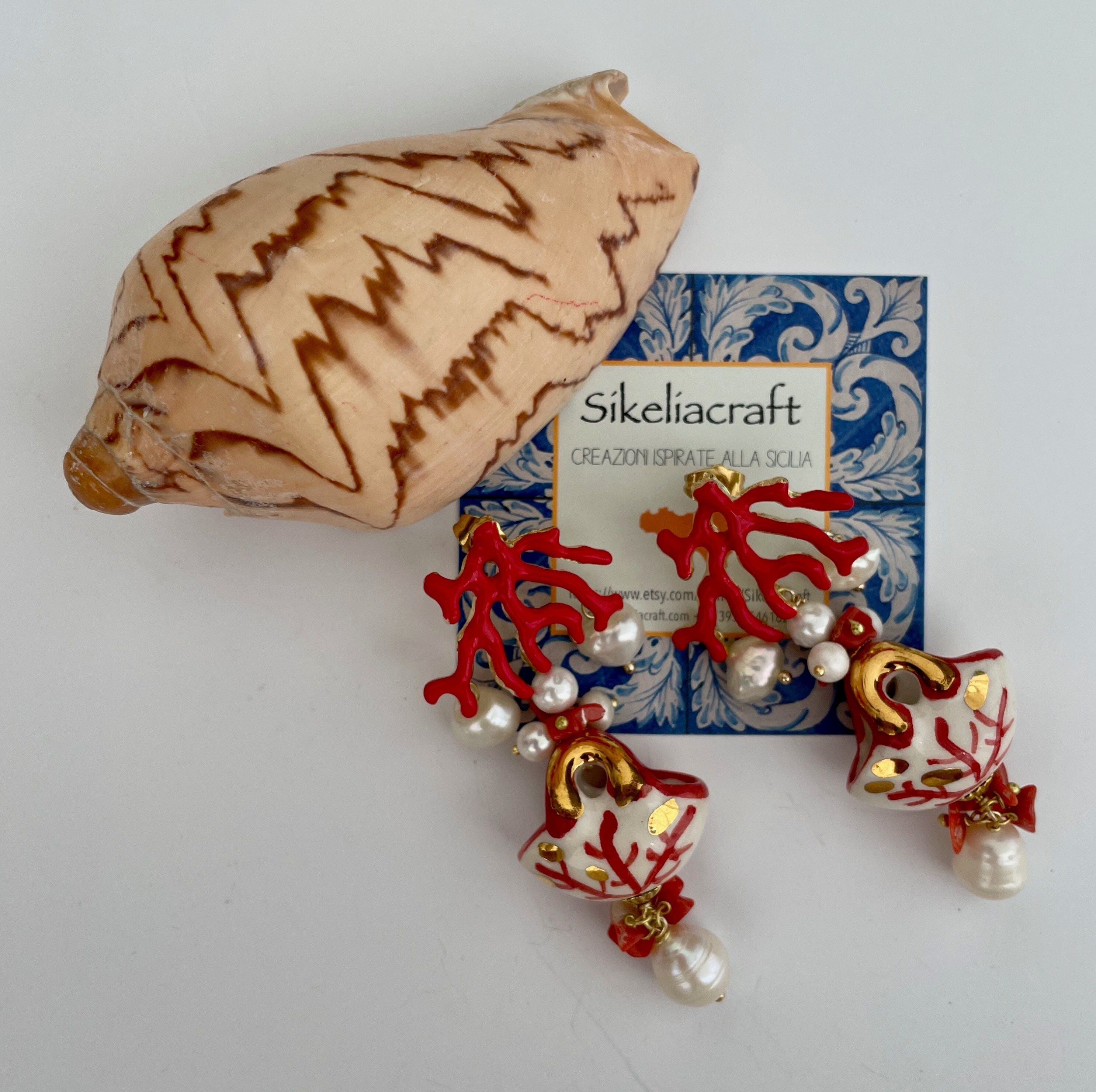 Infatti hanno i perni a forma di rami di corallo smaltati a fuoco su ottone, una splendida borsetta di Caltagirone, dipinta a mano, tipica della tradizione siciliana e vari grappoli pendenti di perle di fiume e chips di corallo.