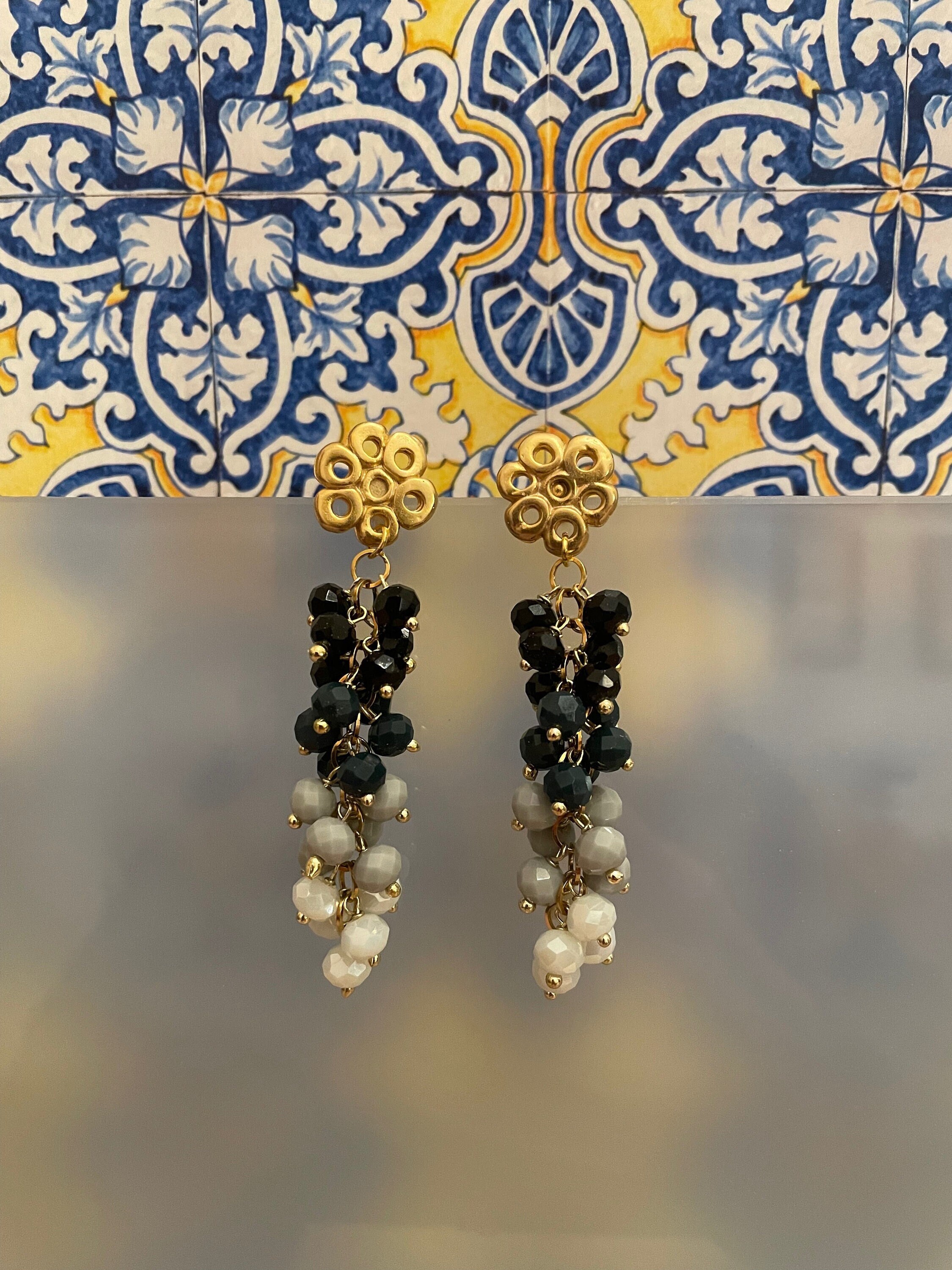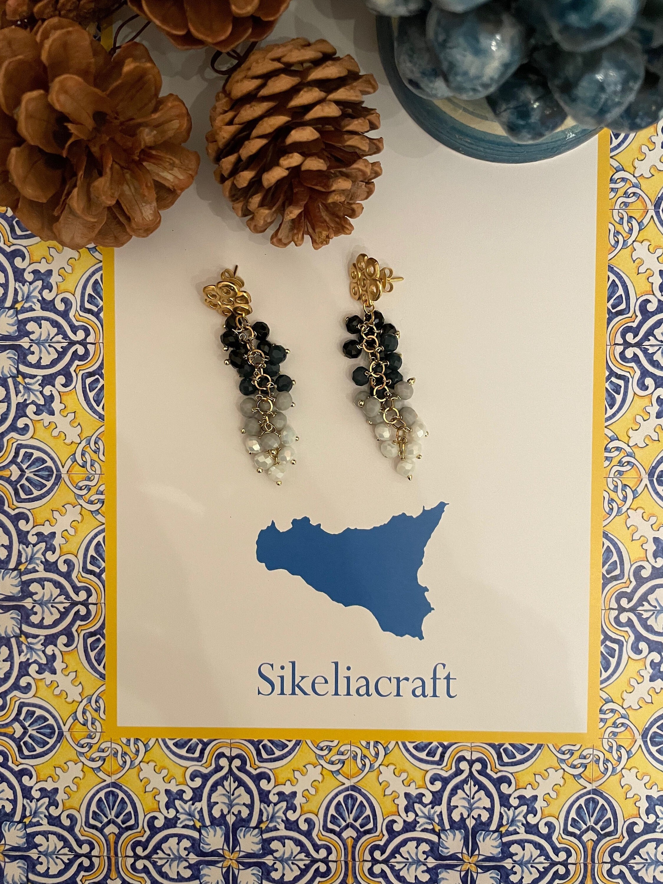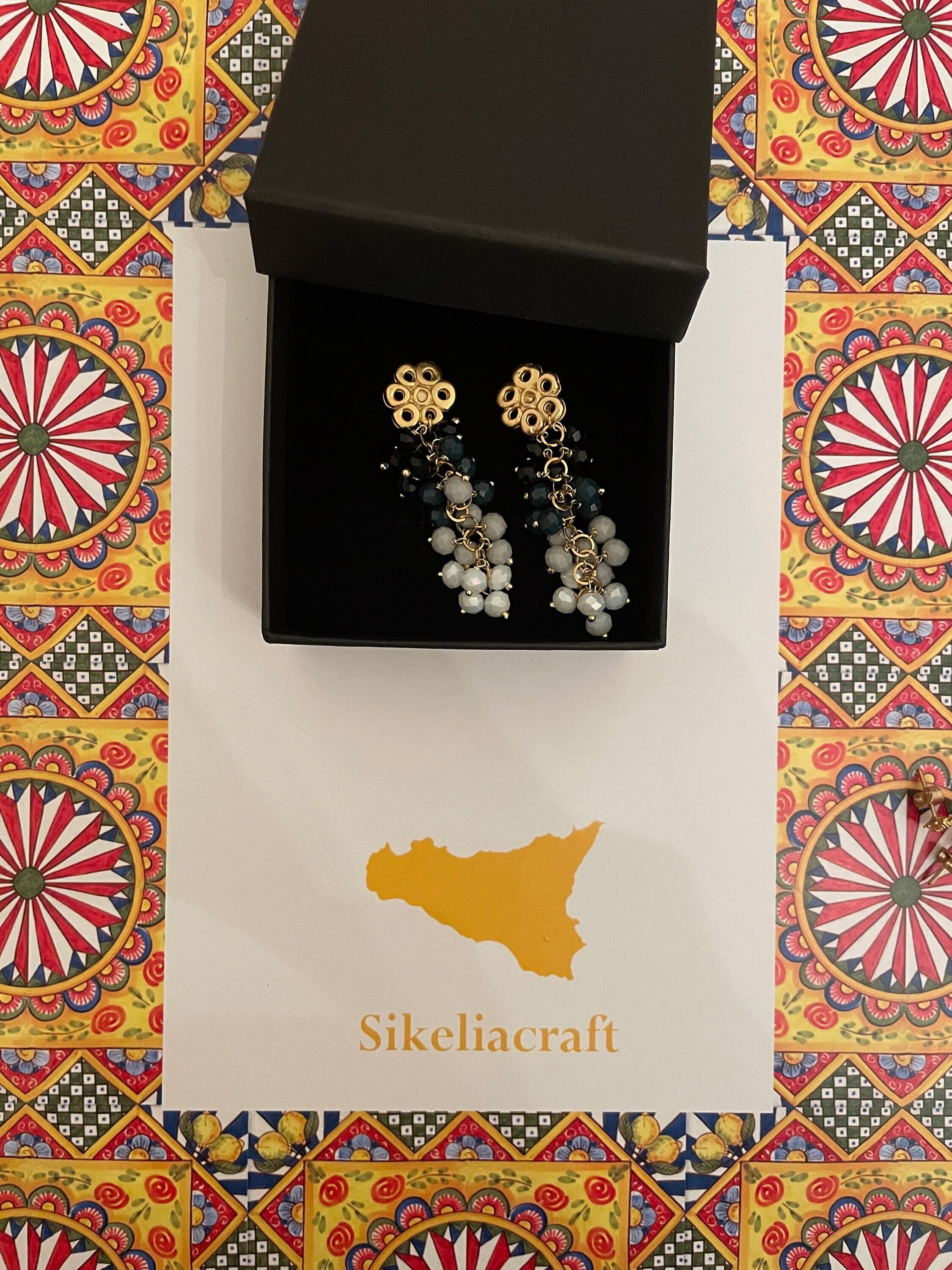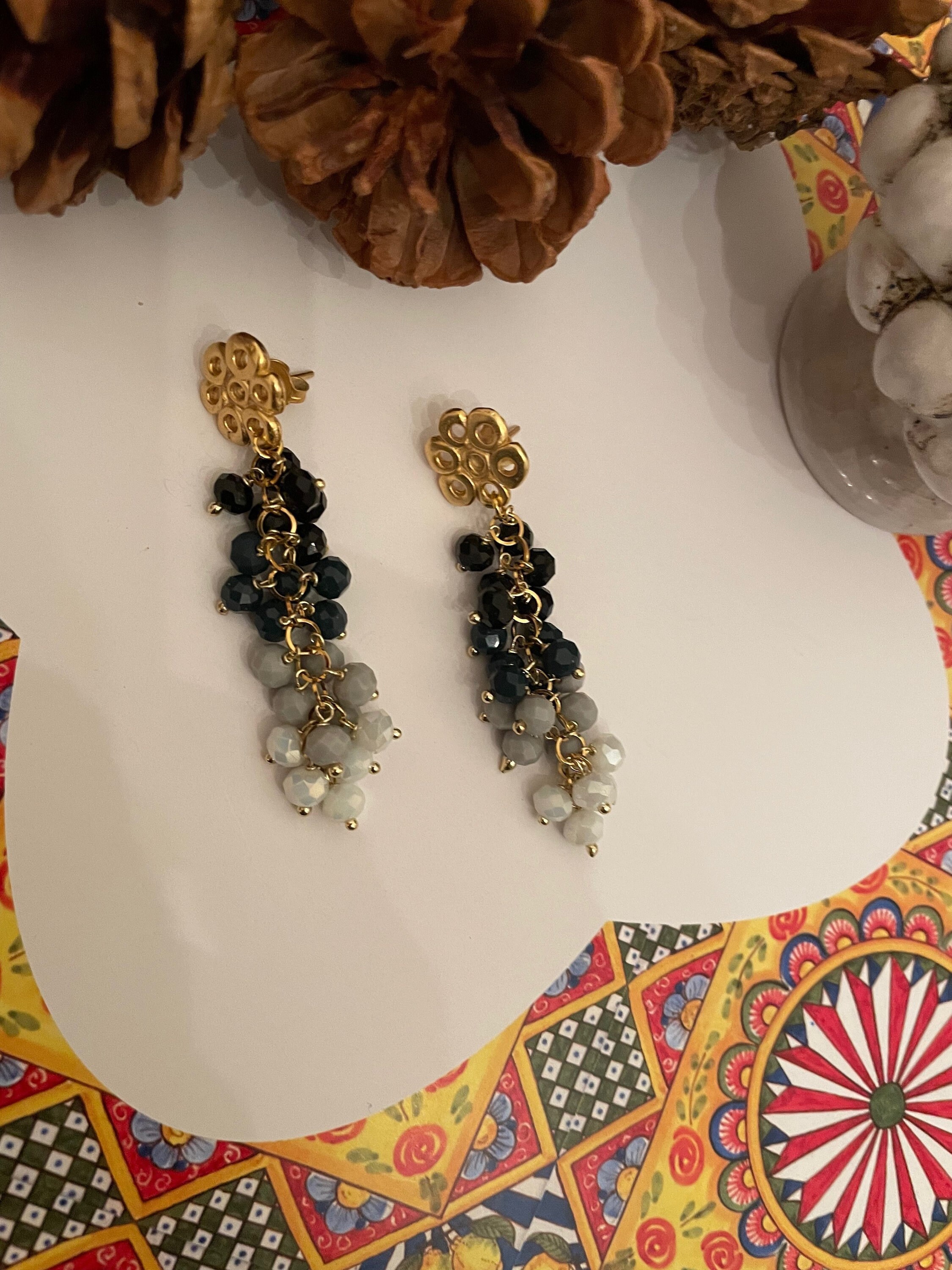 Orecchini siciliani, perno fiore, orecchini pendenti, grappolo di cristalli variazioni grigio, regalo per lei.