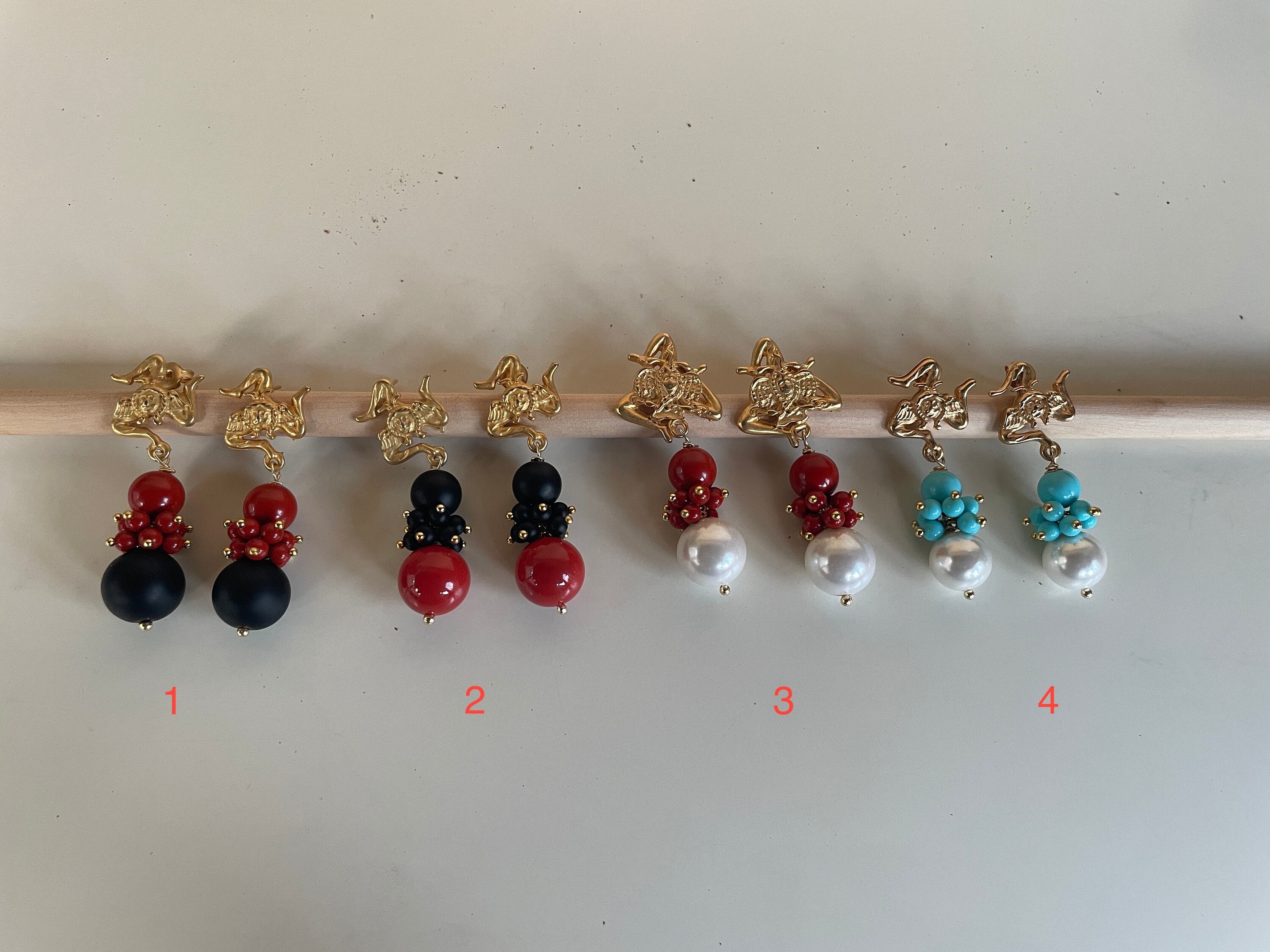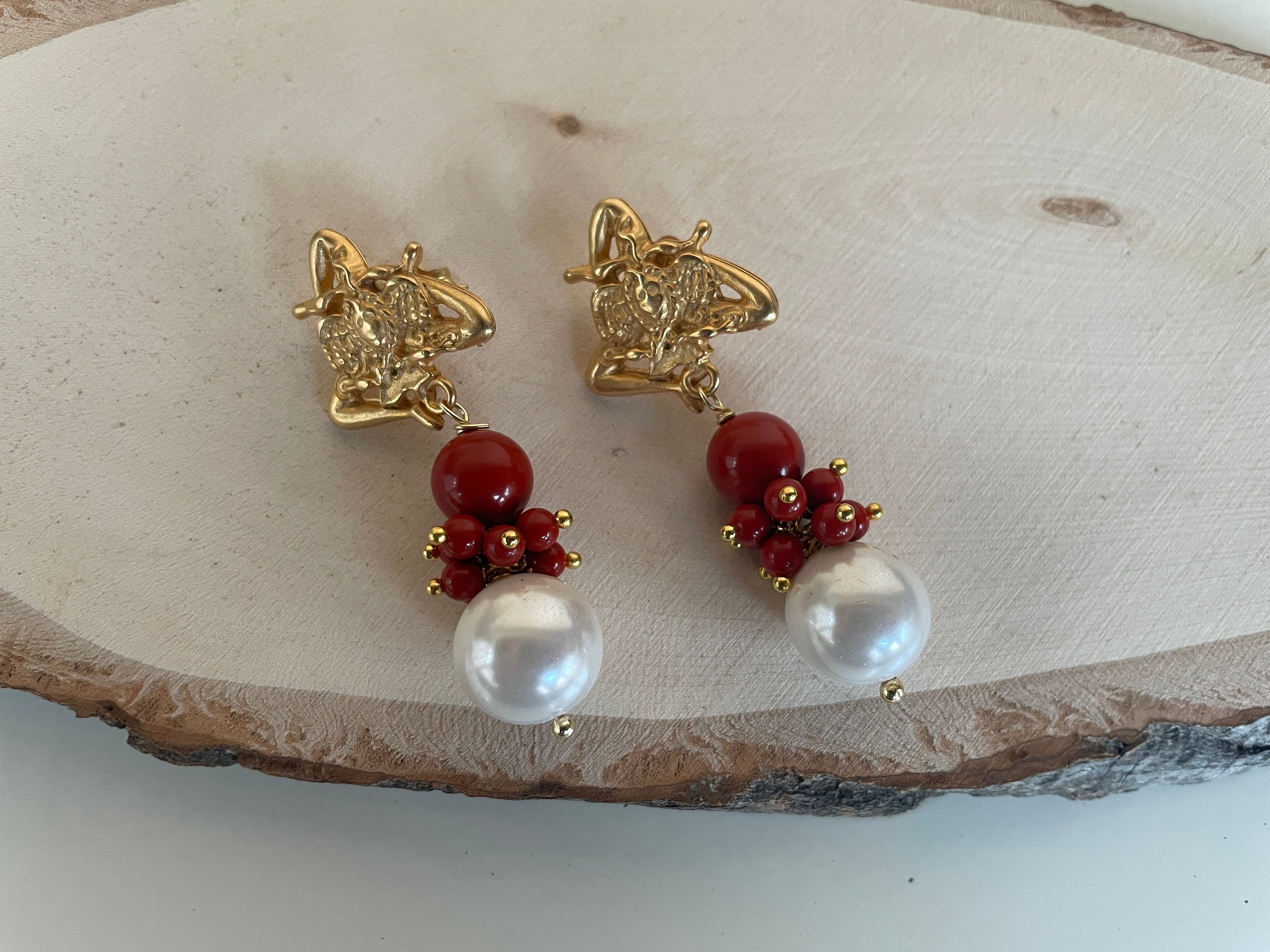 Orecchini siciliani, perno trinacria in zama oro, grappolo perle rosse, grande perla maiorca pendente, orecchini pendenti, regalo ragazza