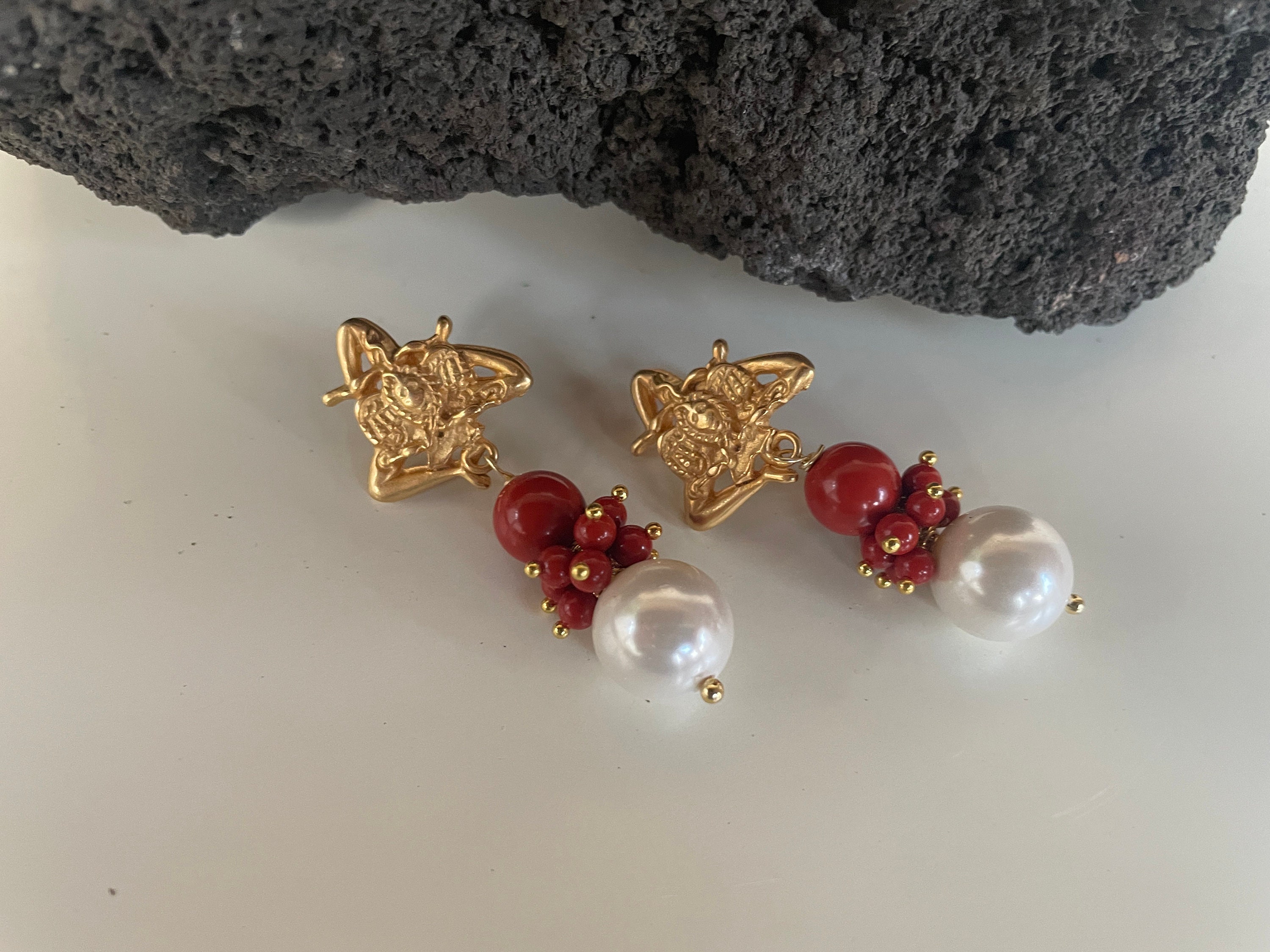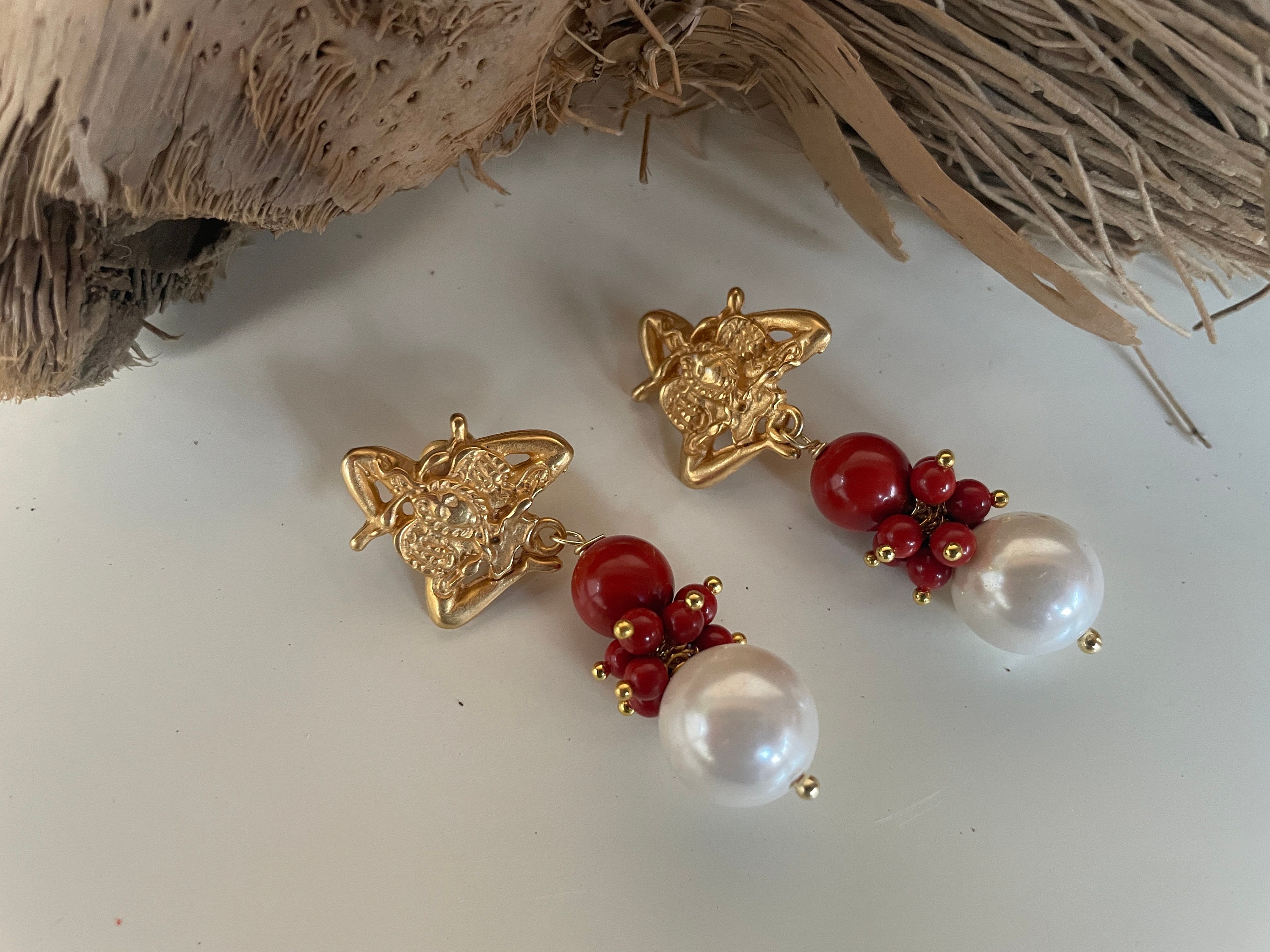 Pendenti perle di corallo bambù rosso e grande perla Maiorca centrale bianca.