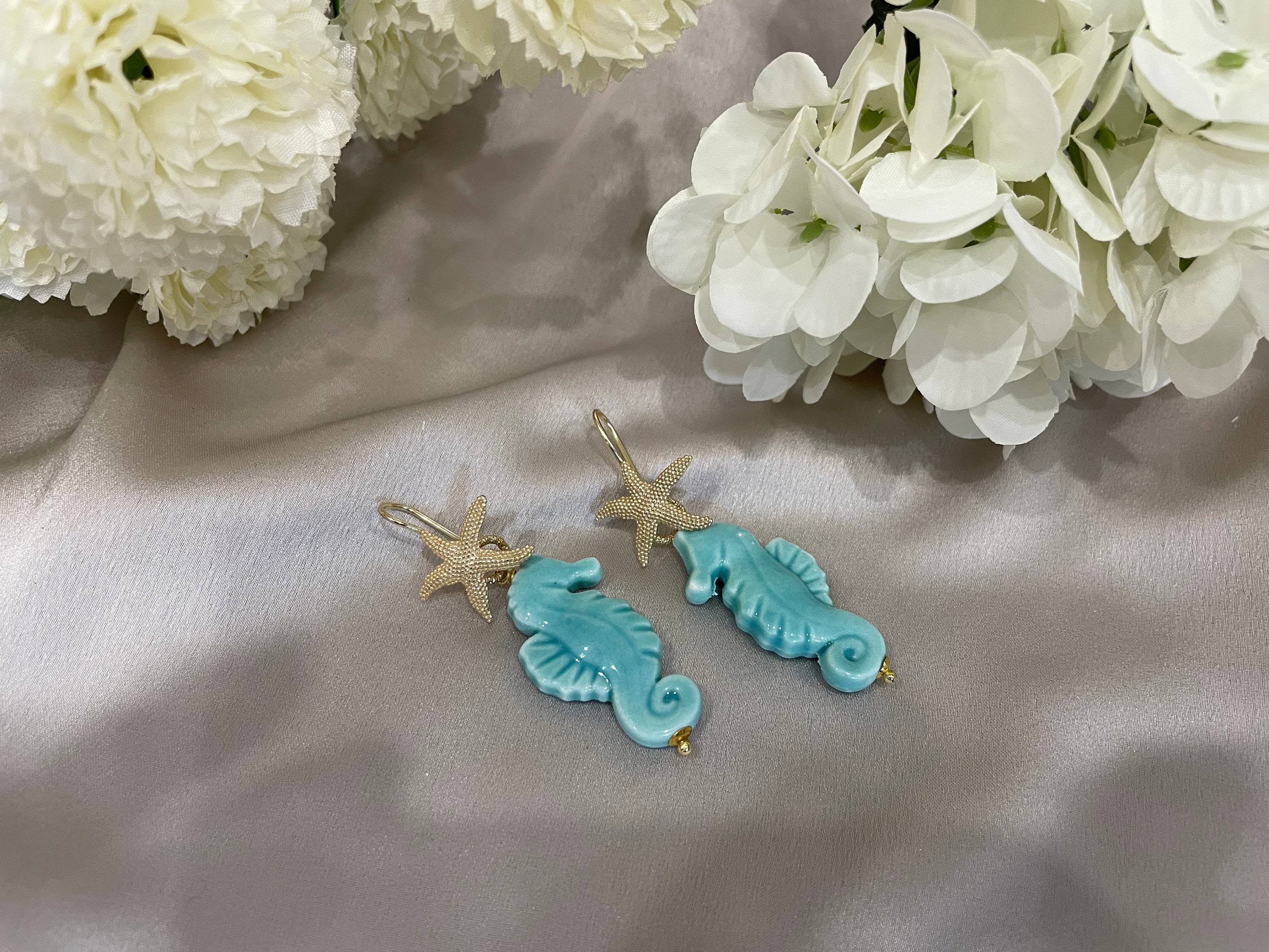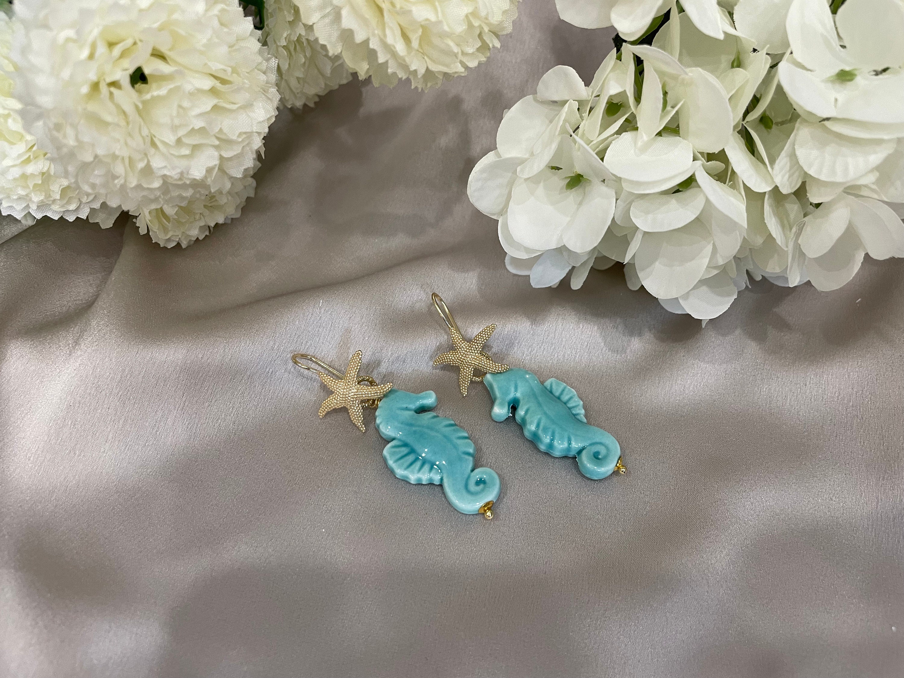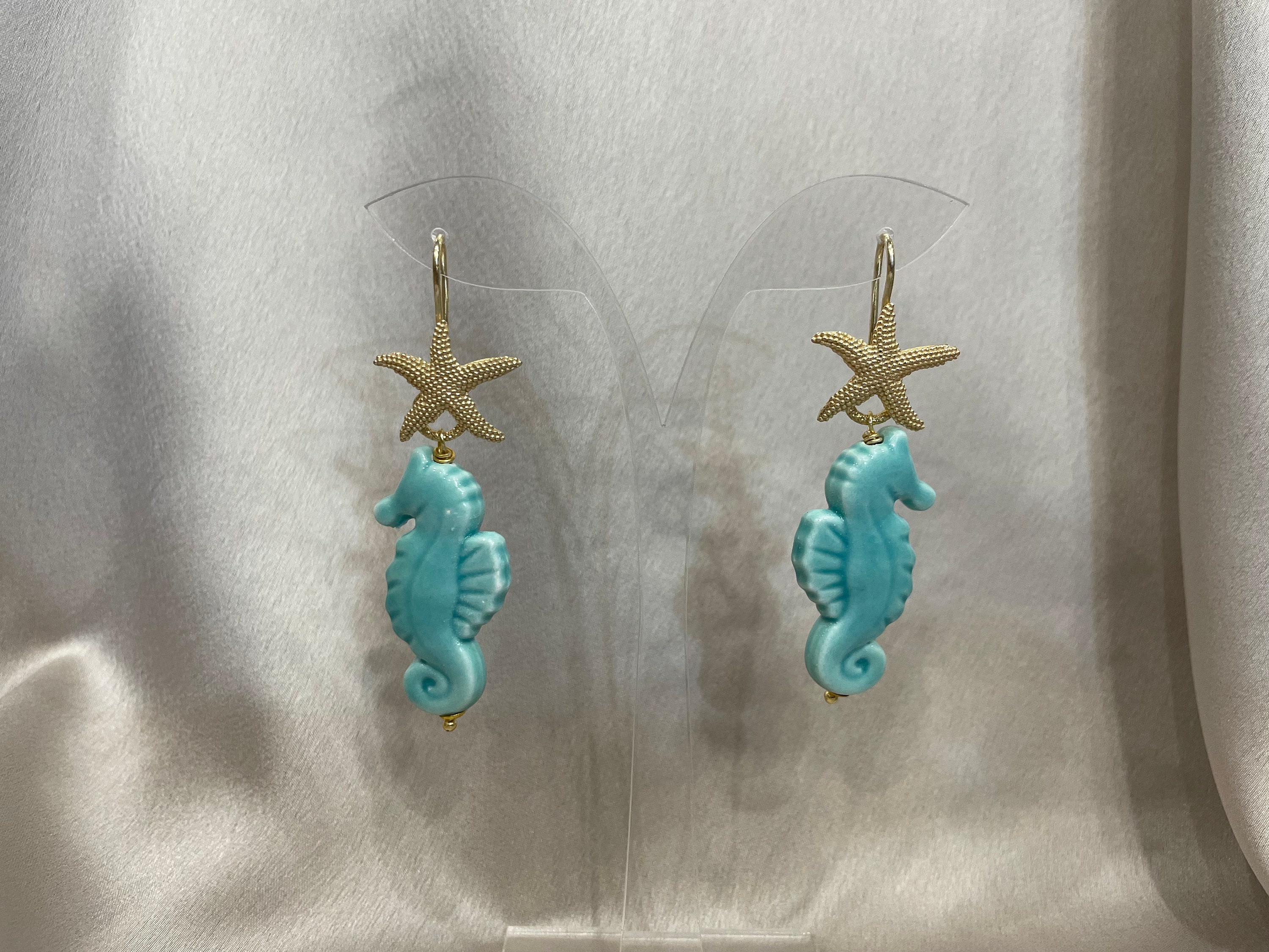 L’elemento pendente è un Cavalluccio marino in Ceramica di Caltagirone dipinto a mano.