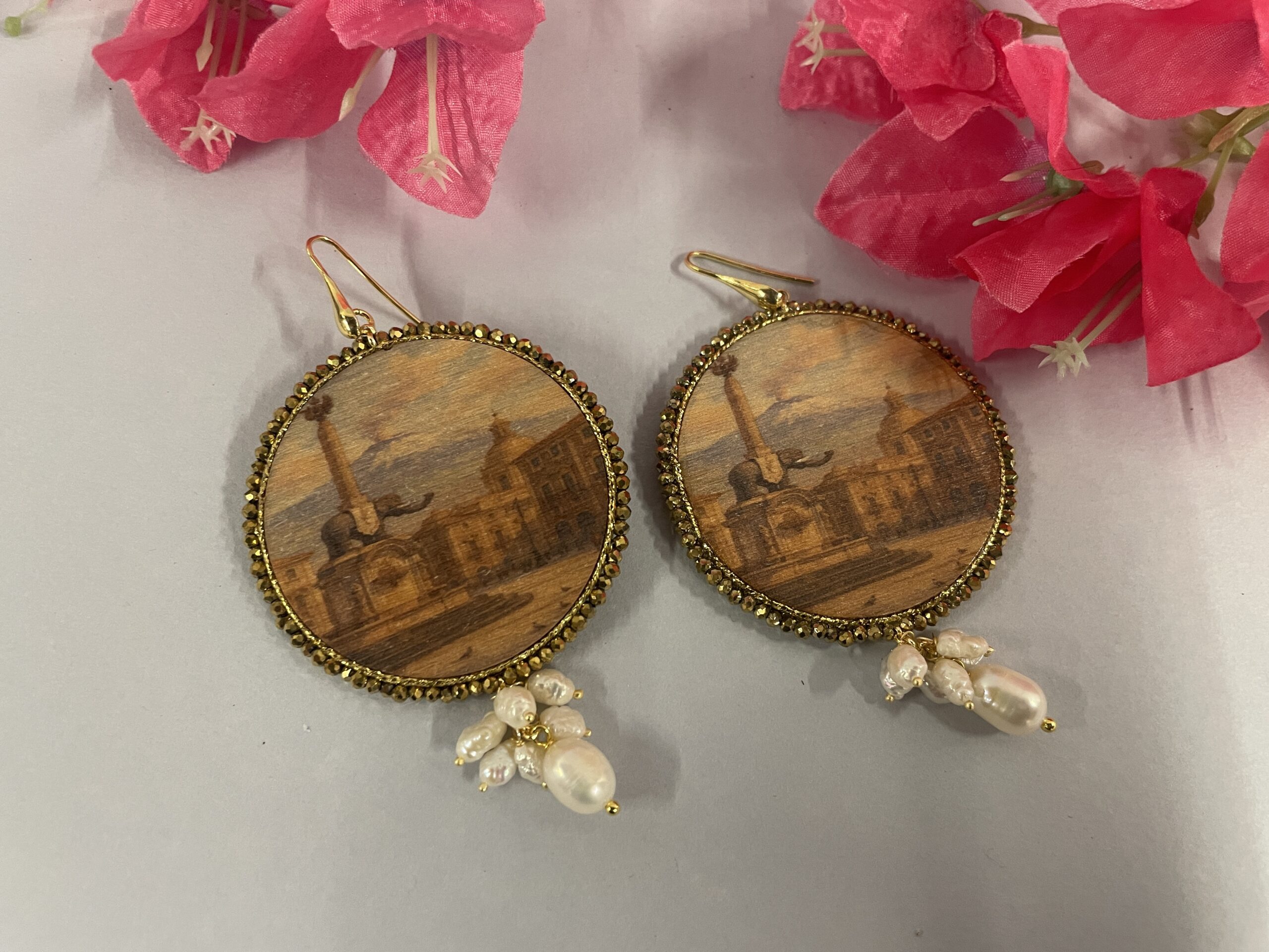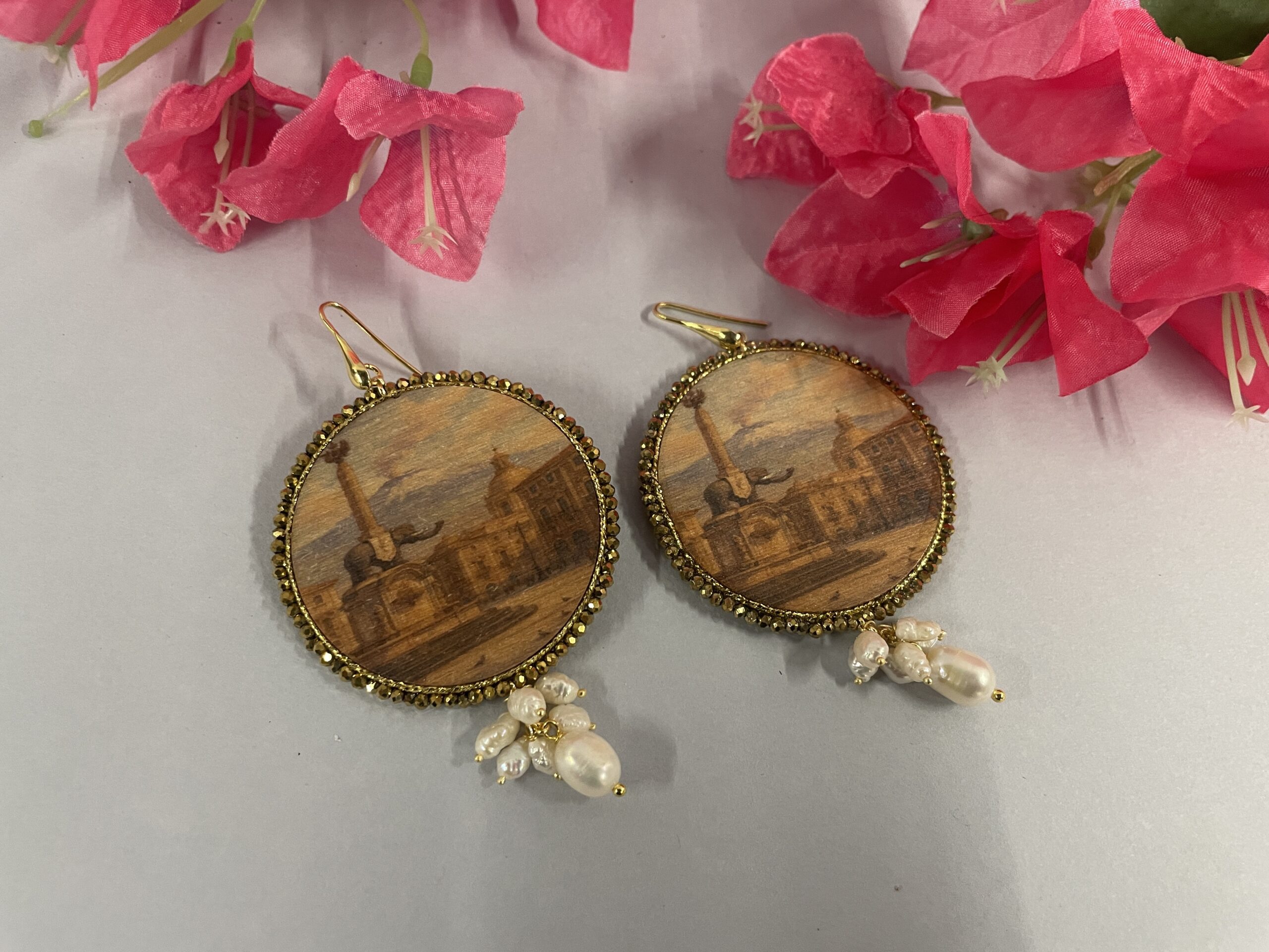 Il paesaggio, realizzato in stile acquarello, è stampato su un leggero medaglione di legno che dona all’immagine l’aspetto di un piccolo dipinto. La stampa double face, identica su entrambi i lati, rende gli orecchini eleganti e curati da ogni angolazione.