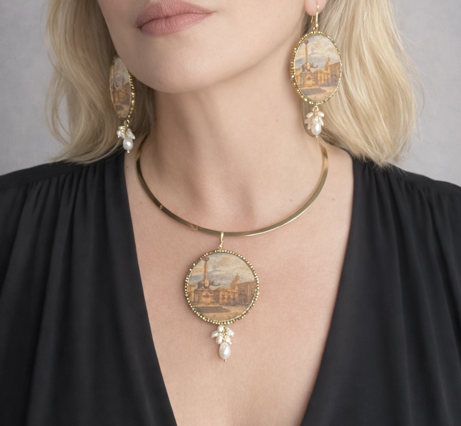 Il medaglione è incorniciato da un raffinato filo di microcristalli che esalta i colori caldi dell’illustrazione. Dalla base pende un delicato grappolo di perle di fiume, che aggiunge luminosità e movimento al gioiello.
