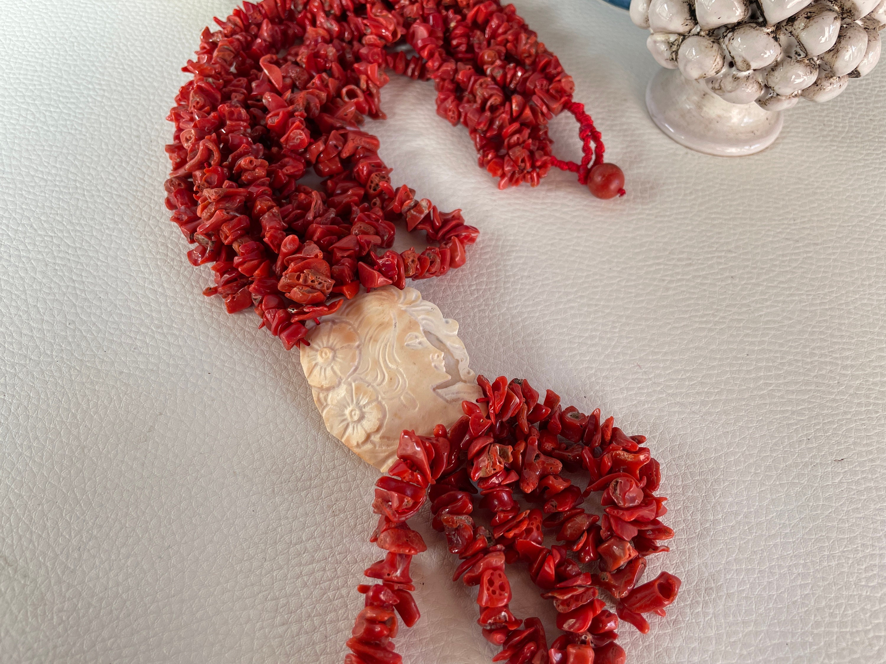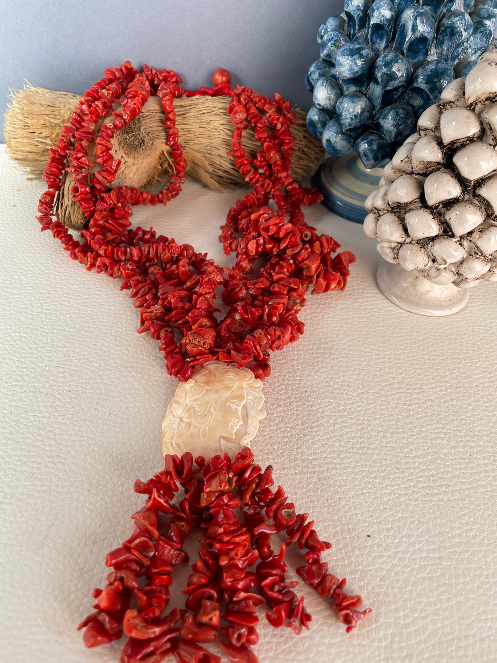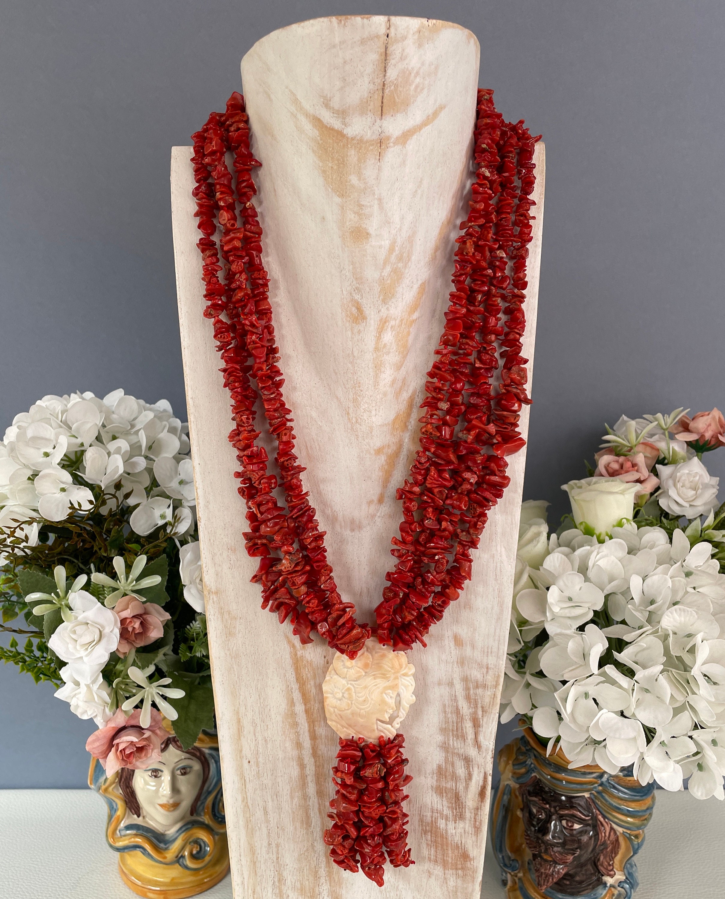 Si tratta di un pezzo unico ottenuto con 4 lunghi fili di grossi pezzi di Corallo genuino rosso. Un bel Cammeo centrale di conchiglia sardonica di Torre del greco da cui pendono grappoli di Corallo del Mediterraneo.