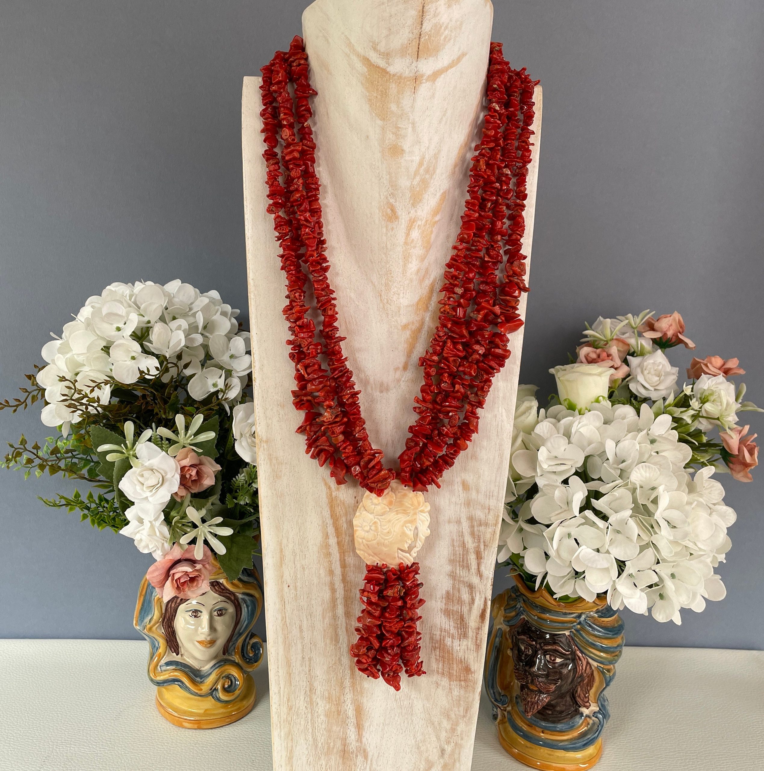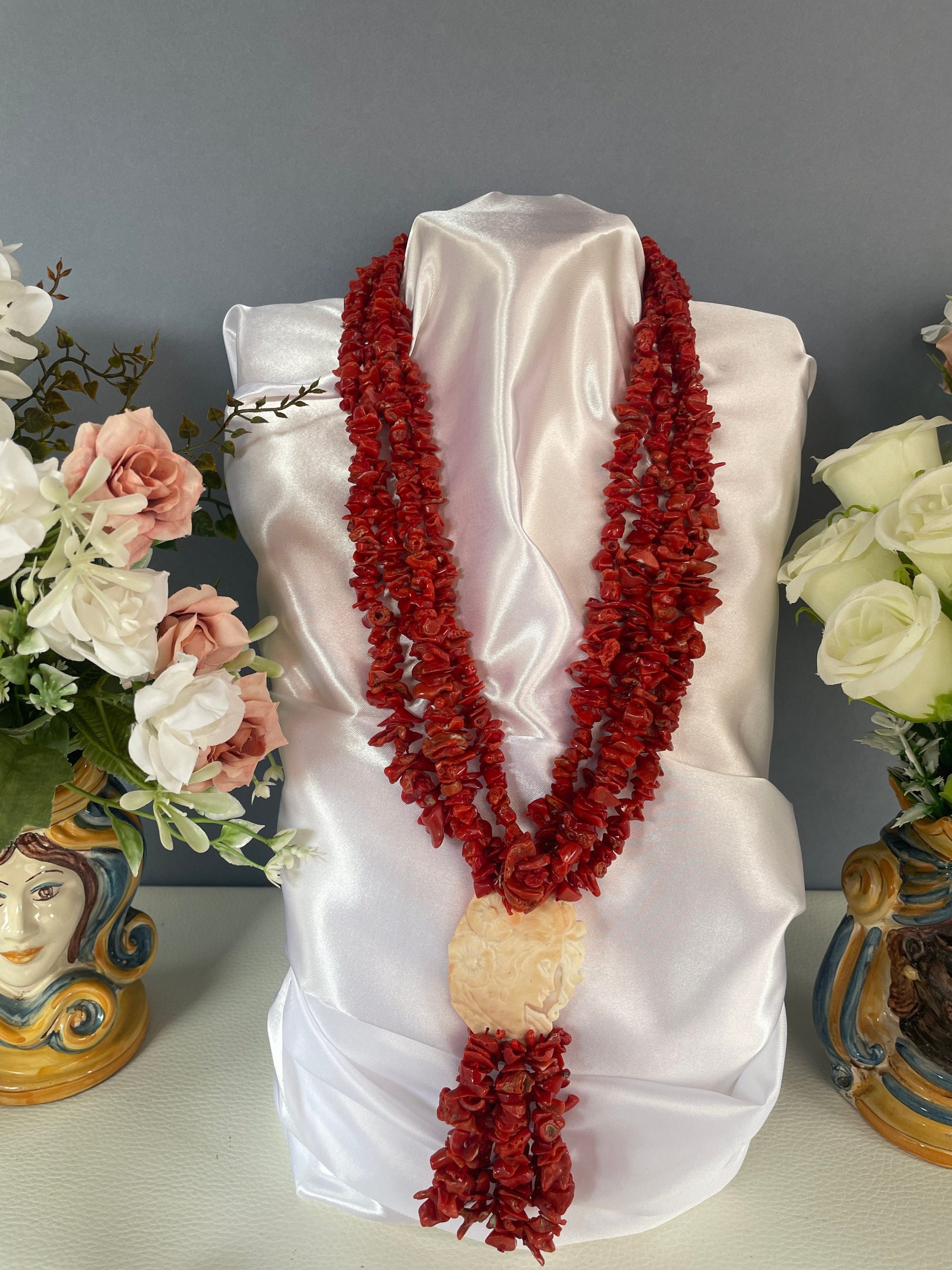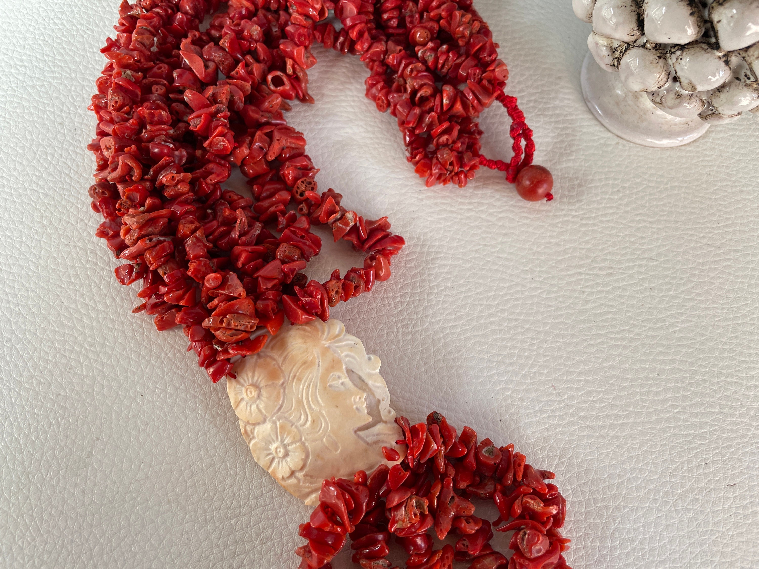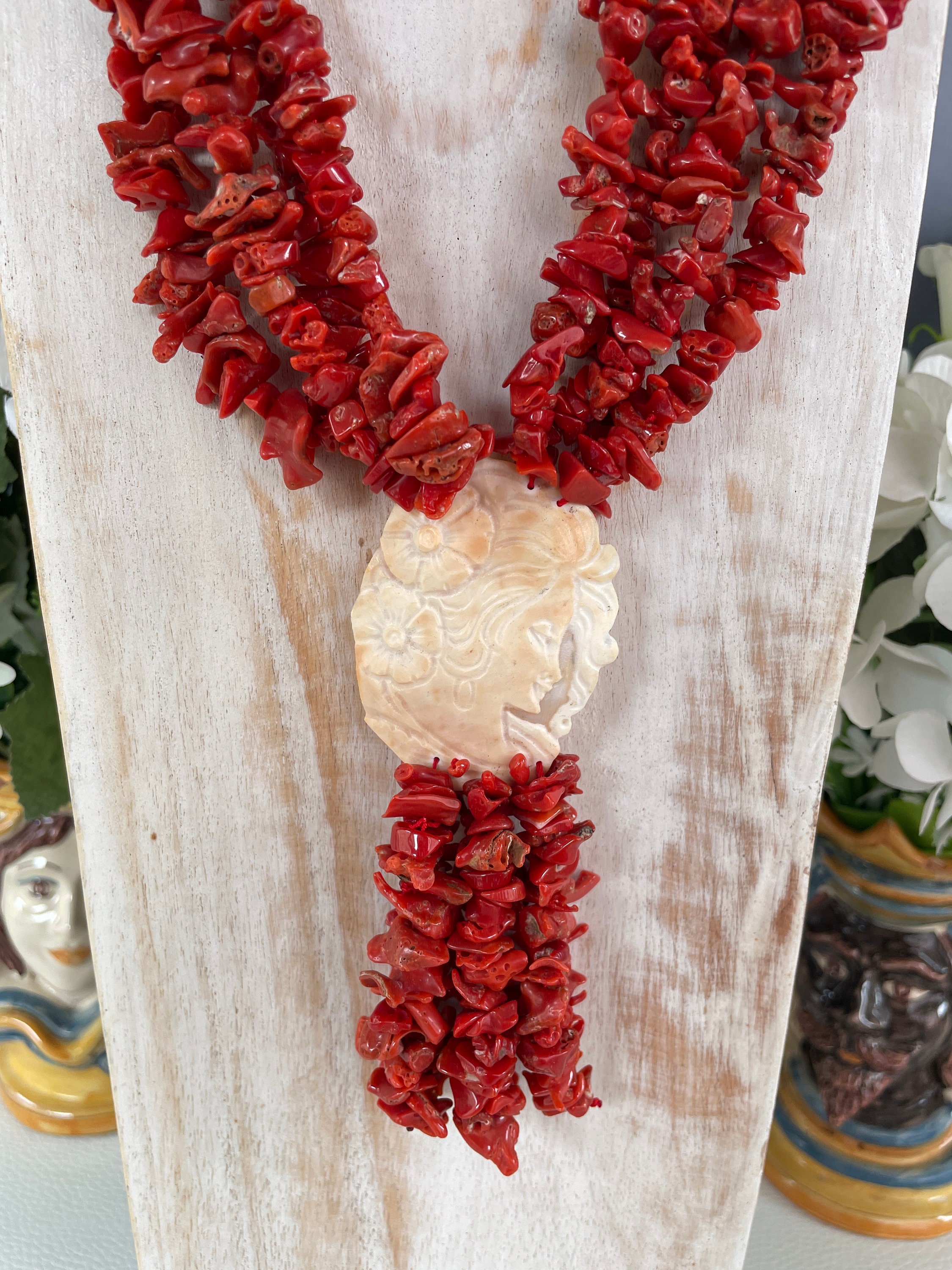 Si tratta di un pezzo unico ottenuto con 4 lunghi fili di grossi pezzi di Corallo genuino rosso. Un bel Cammeo centrale di conchiglia sardonica di Torre del greco da cui pendono grappoli di Corallo del Mediterraneo.