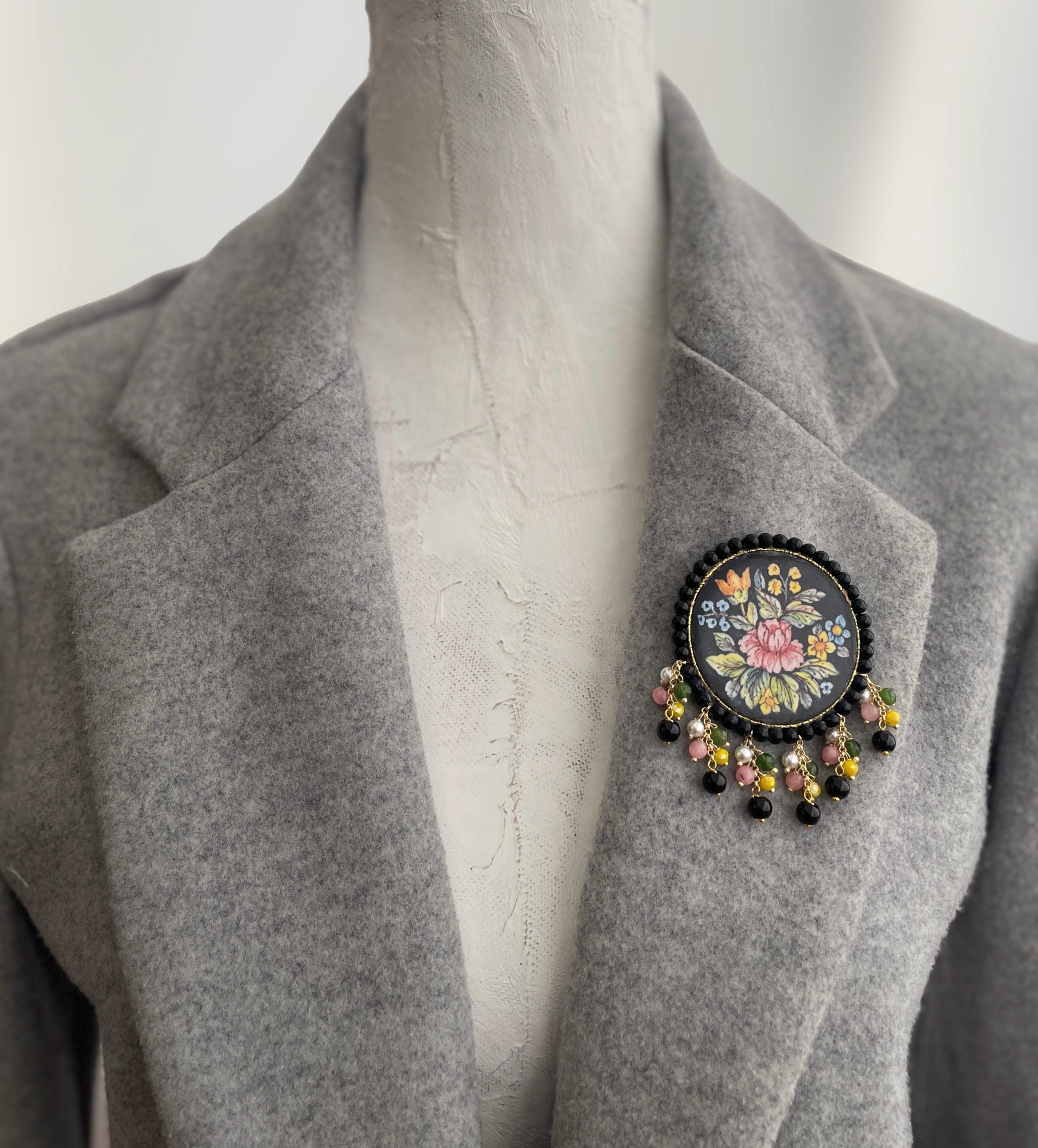 La spilla è completata da sei grappoli di pietre dure di colori assortiti assonanti con i cromatismi dei fiori.
