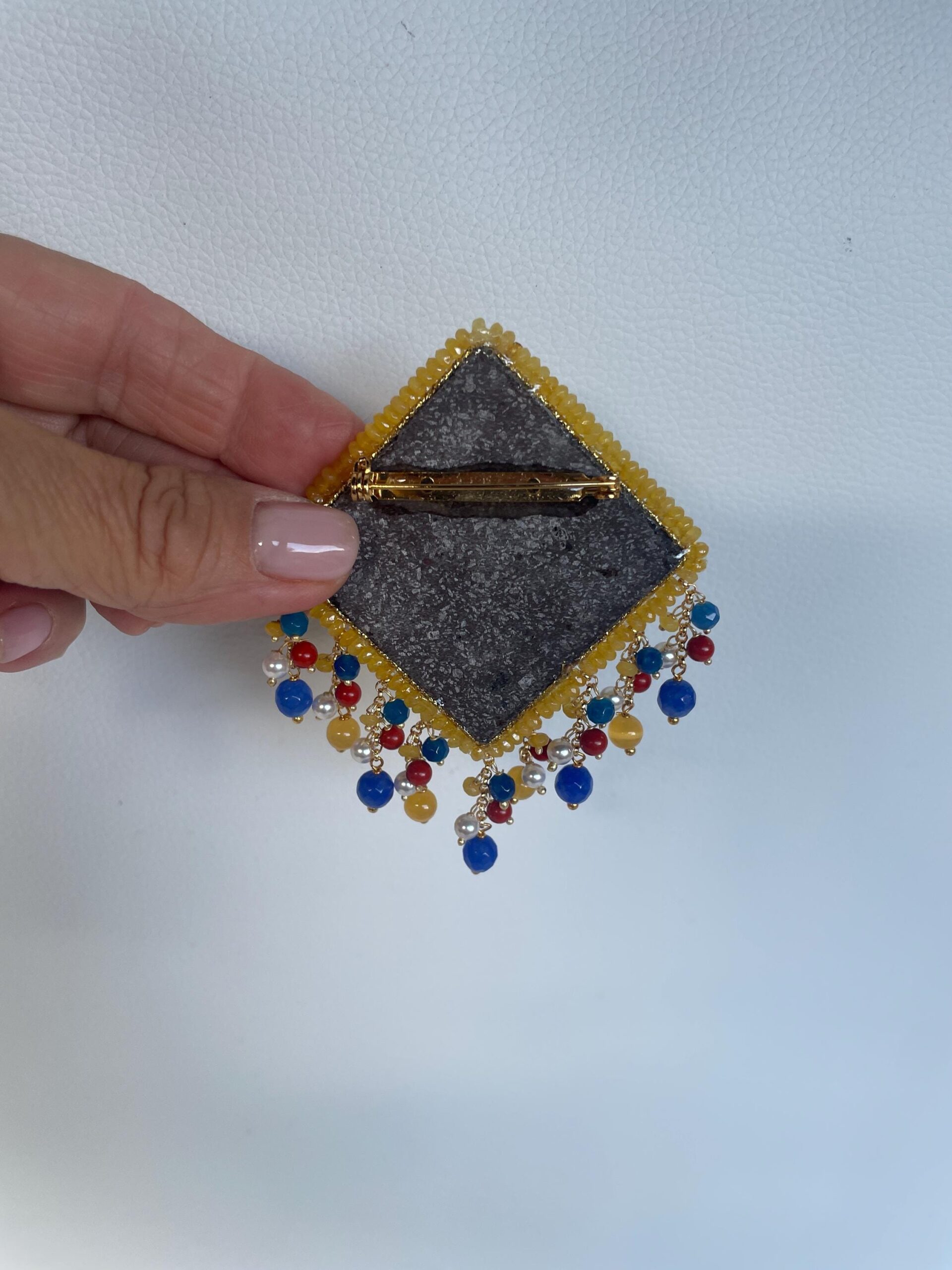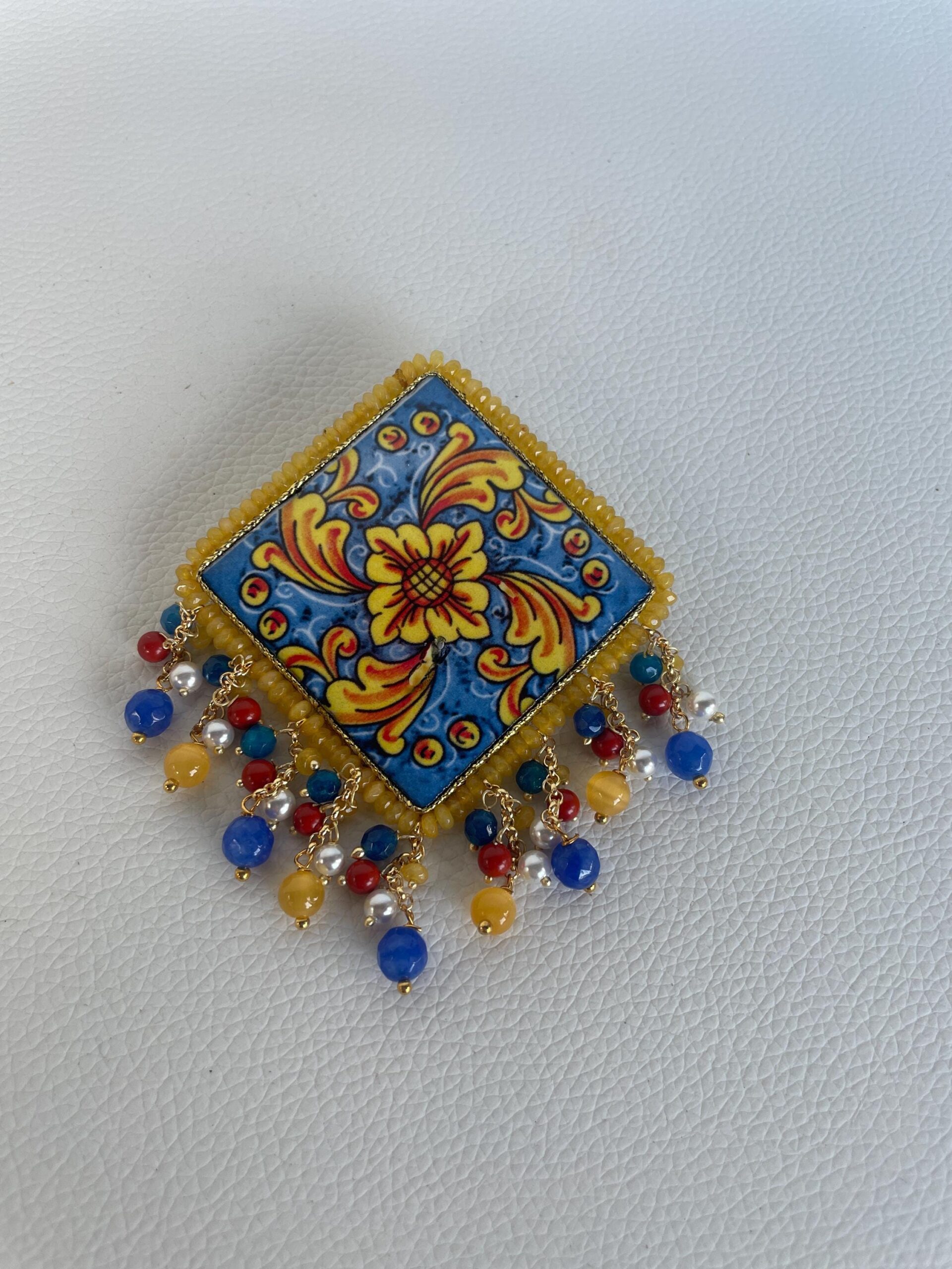 Spilla con maxi mattonella Caltagirone a rombo, decoro geometrico-floreale, grappoli di pietre dure, regalo per lei.