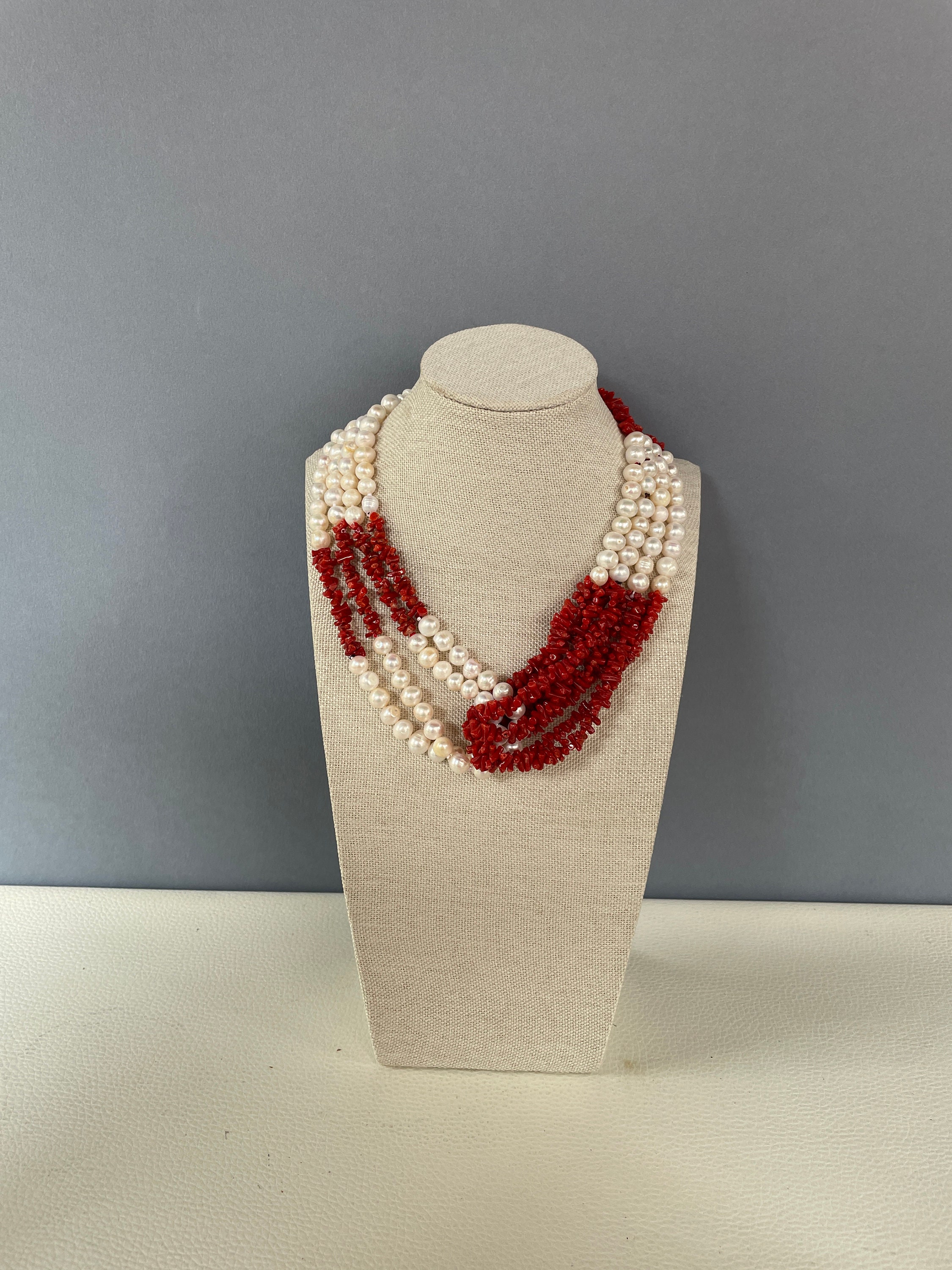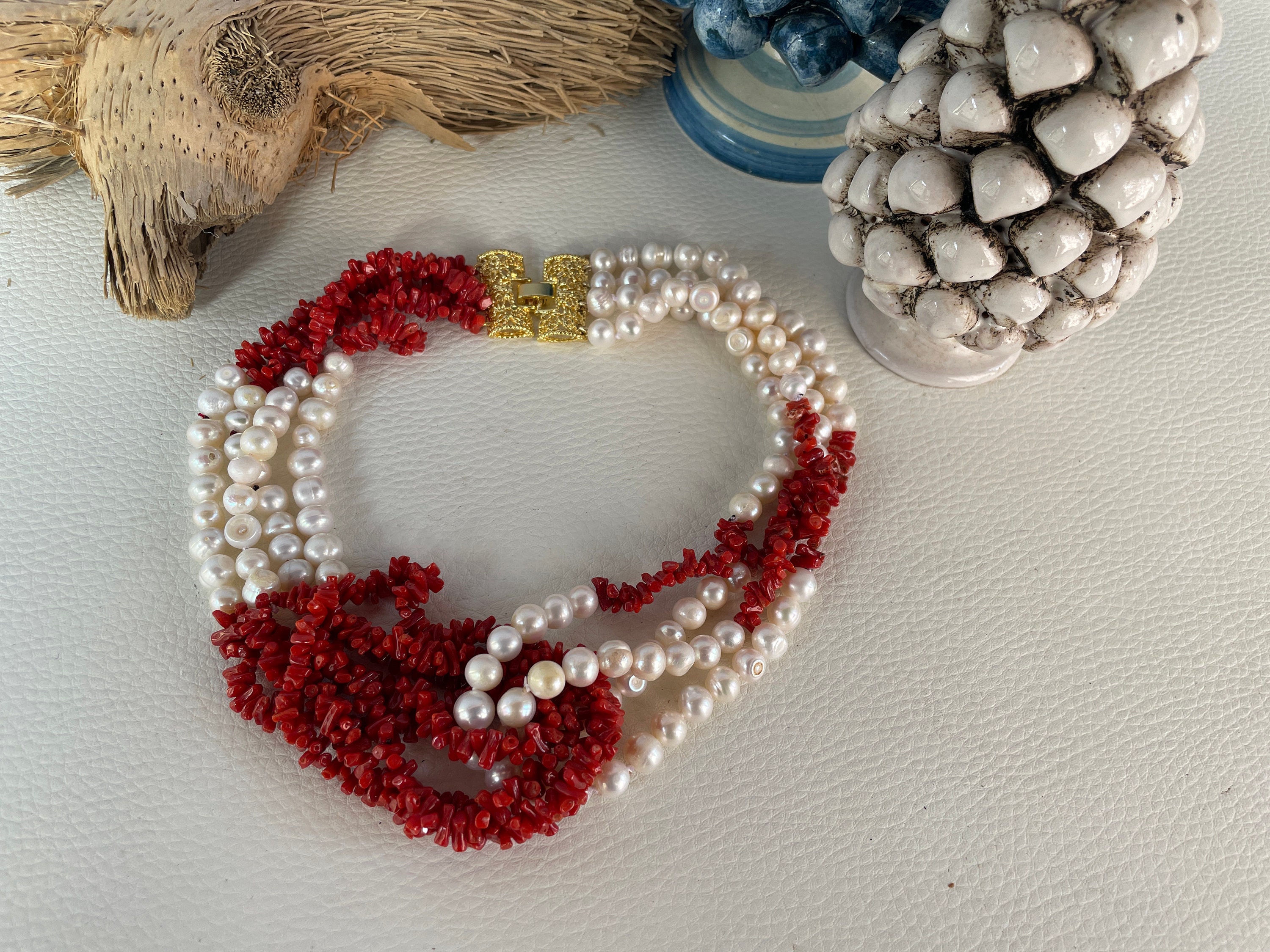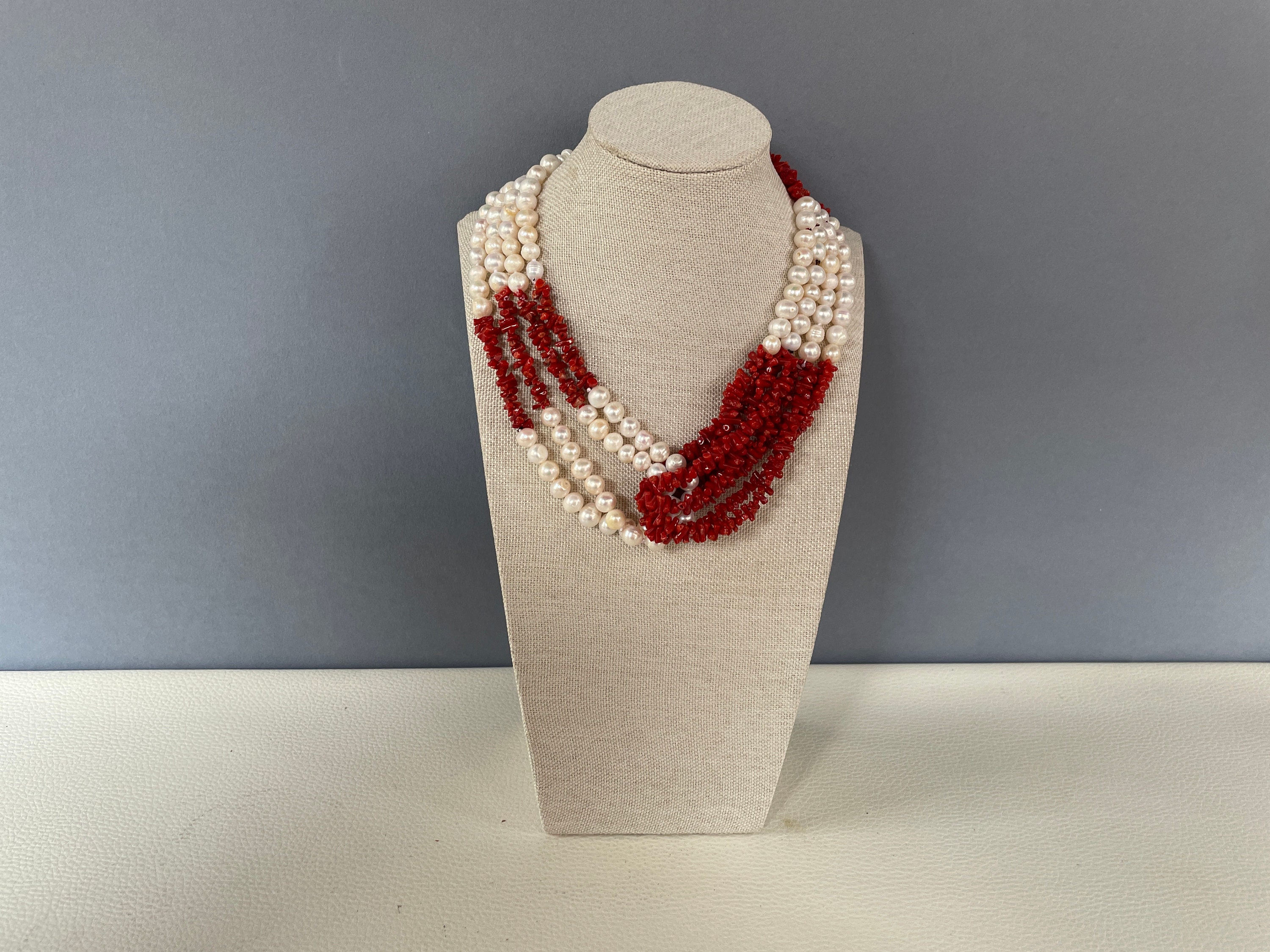 Realizzata con 4 fili di perle di fiume e 4 fili di chips di Corallo autentico del Mediterraneo che si abbracciano centralmente sul fronte.